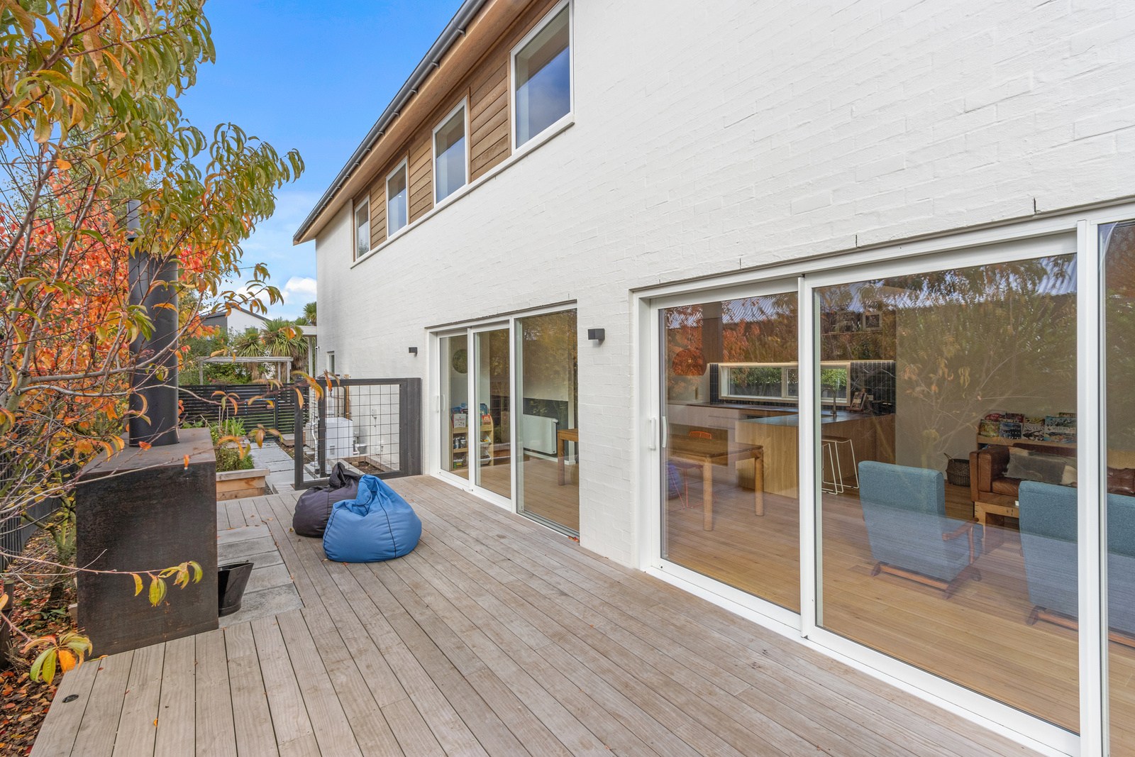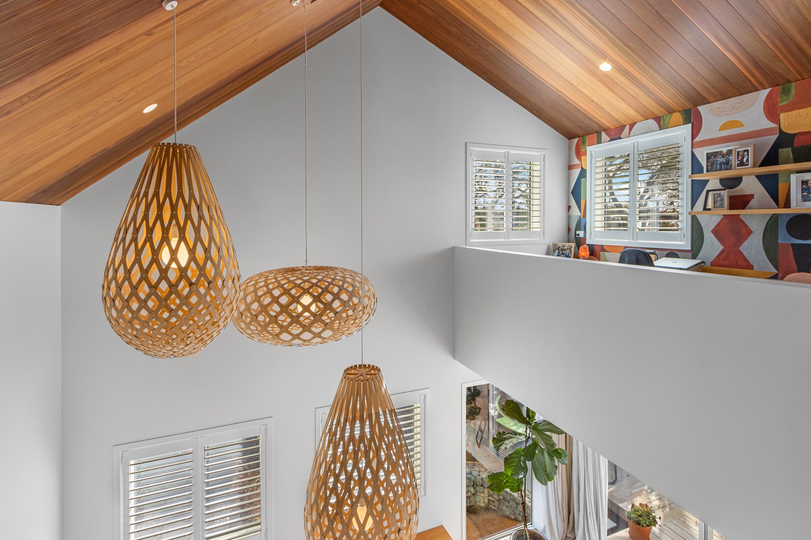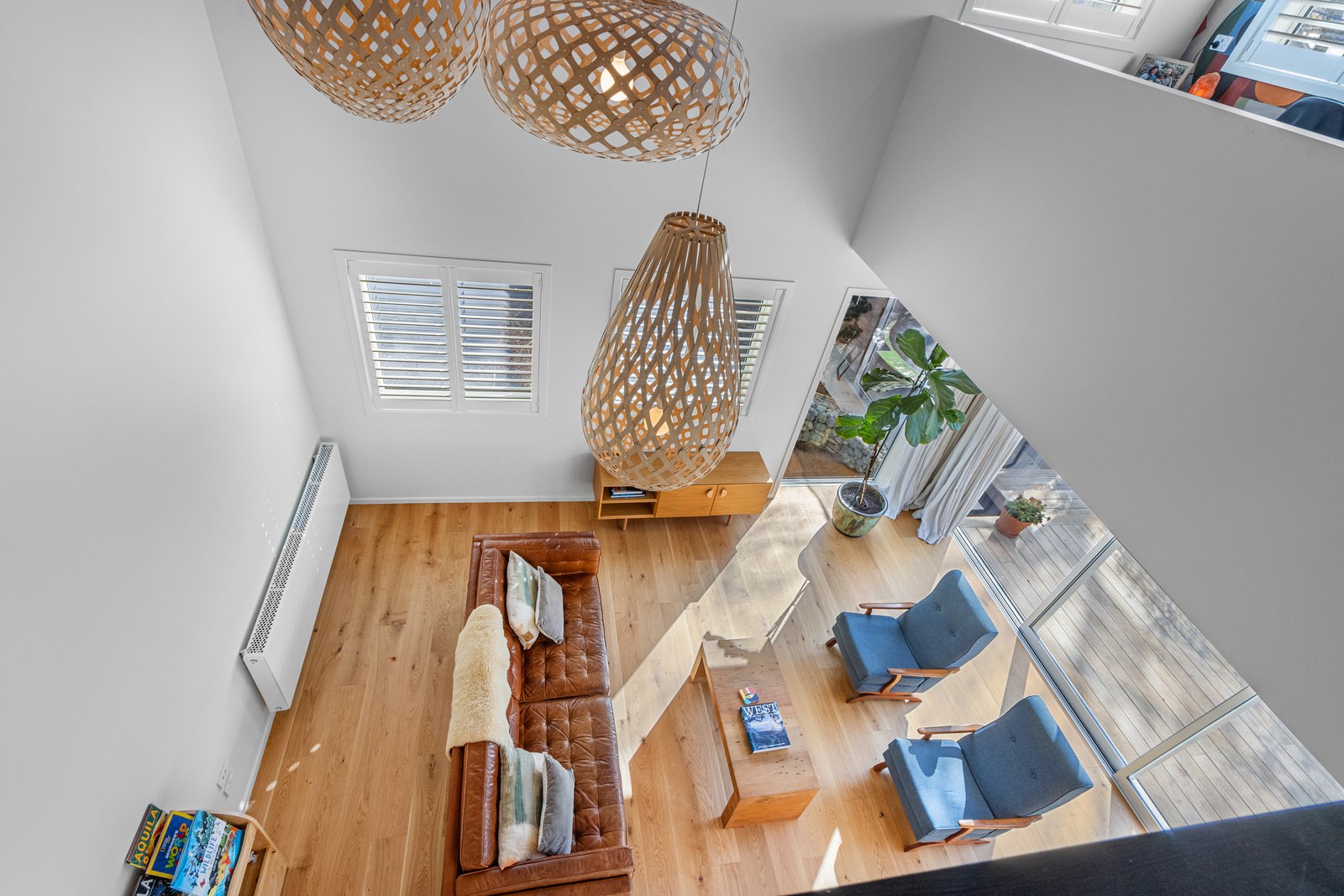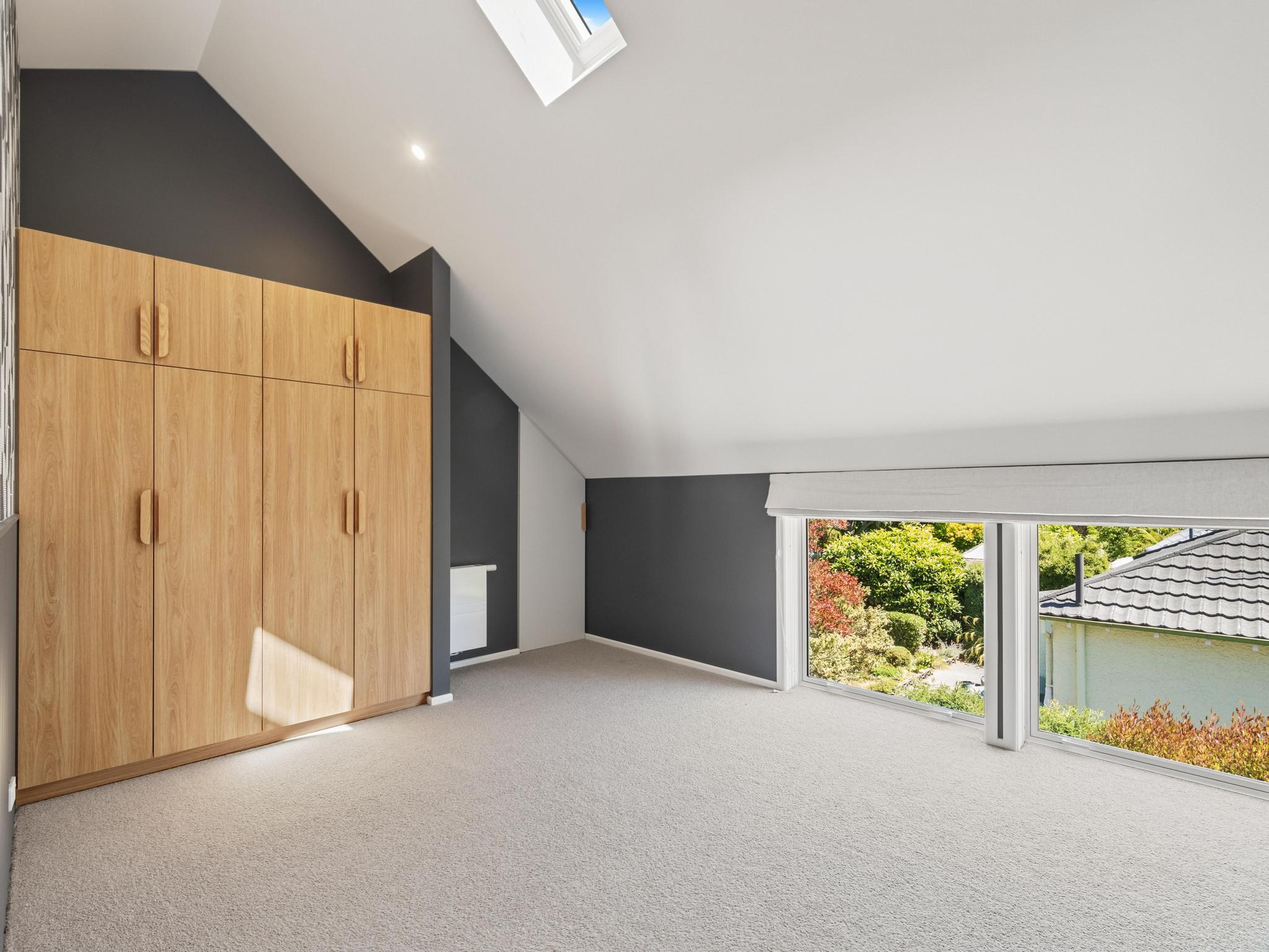 Step inside to see a white-and-wood interior where detail is king. Each space has been carefully curated and given its own personality. On the ground floor, the main living area features a soaring ceiling lined with cedar, a kitchen with blue finger-tiles and a trio of tangerine light shades hovering over the dining table. The main bedroom has lime-washed walls and a timber-panel feature wall. The stairwell is a showstopper. Bold geometric wallpaper leads residents up the staircase along the hall and into rooms that sing with colour — rust coloured tiles, blue and slate-grey feature walls and another geometric-patterned multi-coloured wallpaper. Overhead, timber ceilings add warmth and texture; skylights flood the areas with natural light. Up here you’ll find two more bedrooms, a second living room, another bathroom and a study. This house is a template for how to do striking and sophisticated in one skilfully built design.