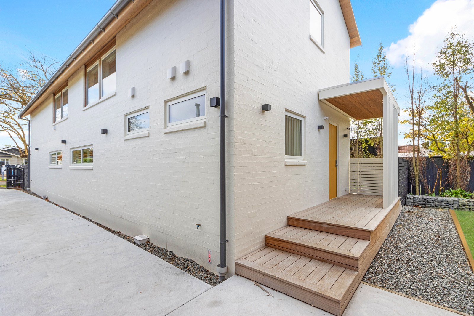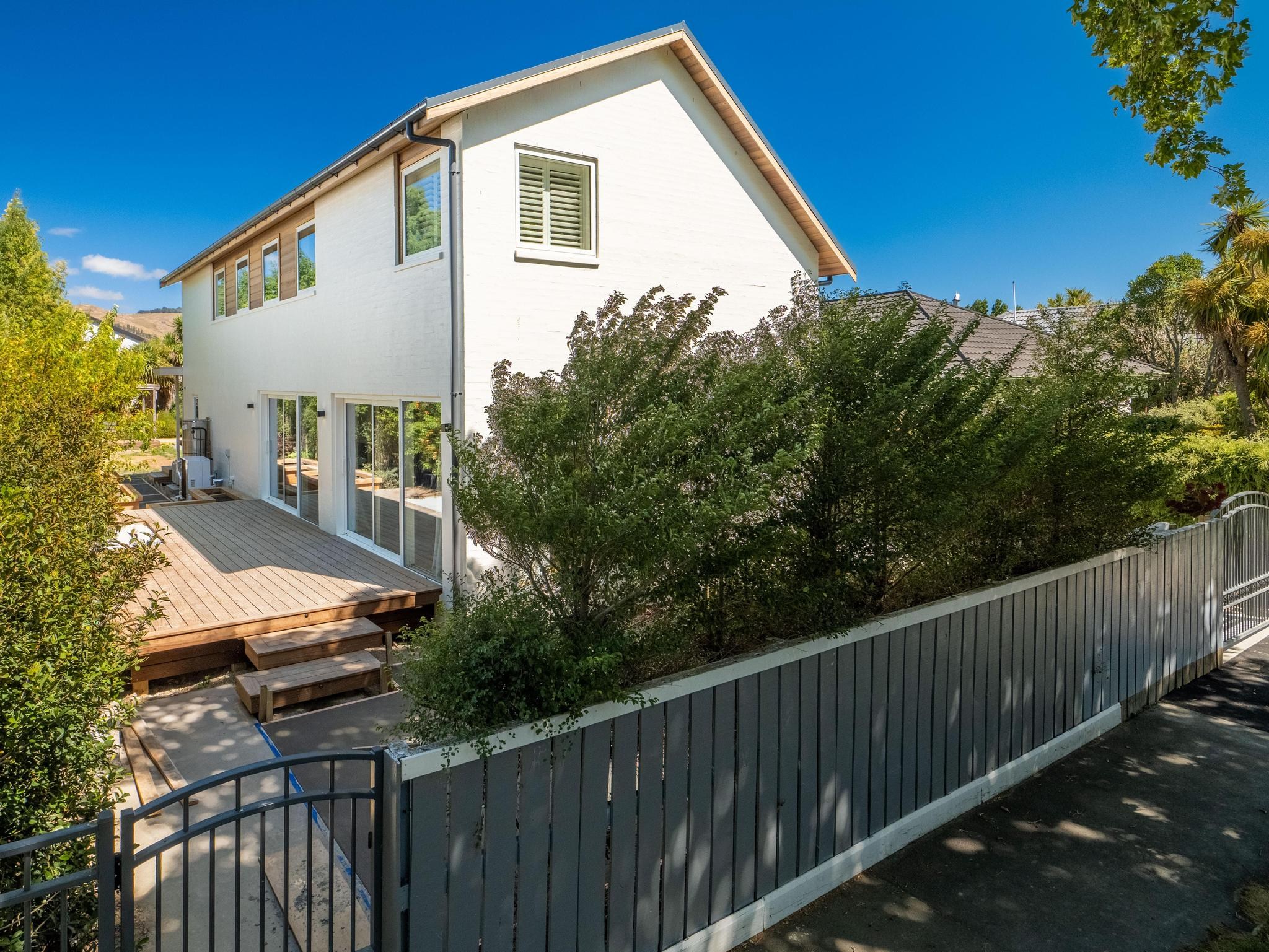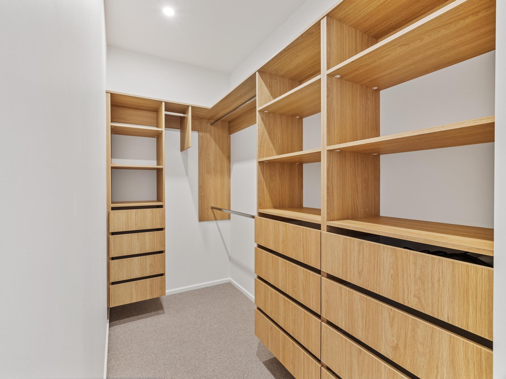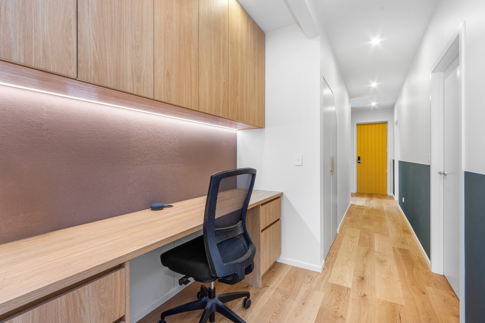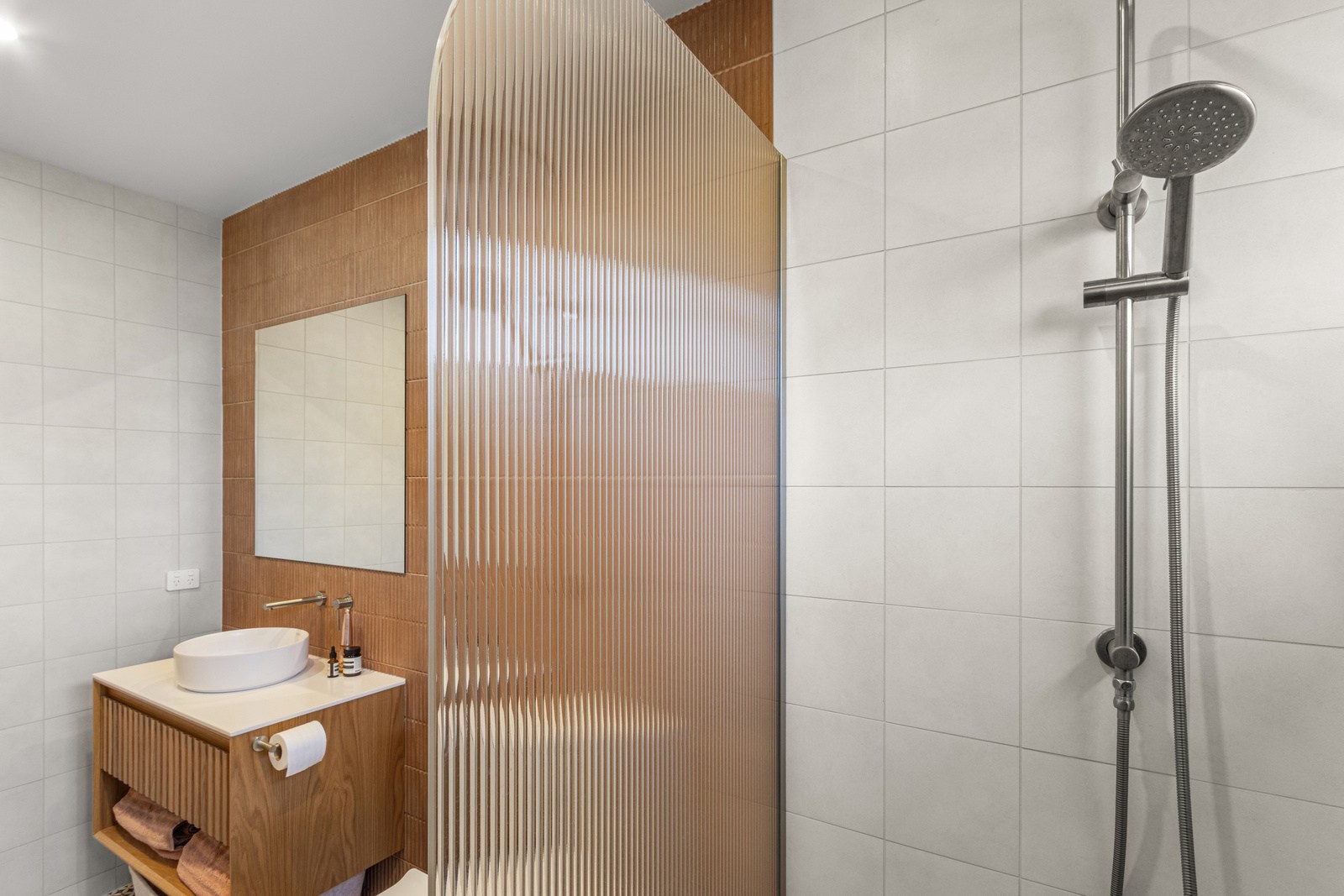 Step inside to see a white-and-wood interior where detail is king. Each space has been carefully curated and given its own personality. On the ground floor, the main living area features a soaring ceiling lined with cedar, a kitchen with blue finger-tiles and a trio of tangerine light shades hovering over the dining table. The main bedroom has lime-washed walls and a timber-panel feature wall. The stairwell is a showstopper. Bold geometric wallpaper leads residents up the staircase along the hall and into rooms that sing with colour — rust coloured tiles, blue and slate-grey feature walls and another geometric-patterned multi-coloured wallpaper. Overhead, timber ceilings add warmth and texture; skylights flood the areas with natural light. Up here you’ll find two more bedrooms, a second living room, another bathroom and a study. This house is a template for how to do striking and sophisticated in one skilfully built design.