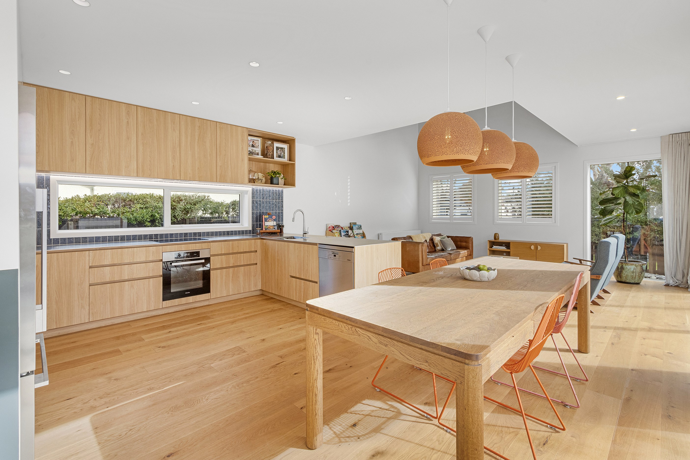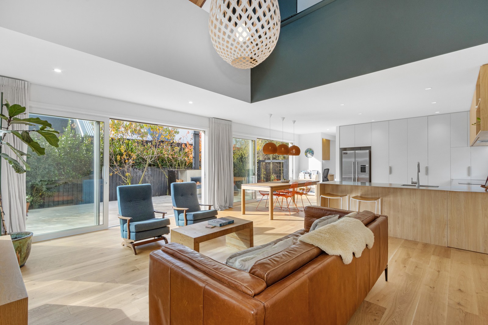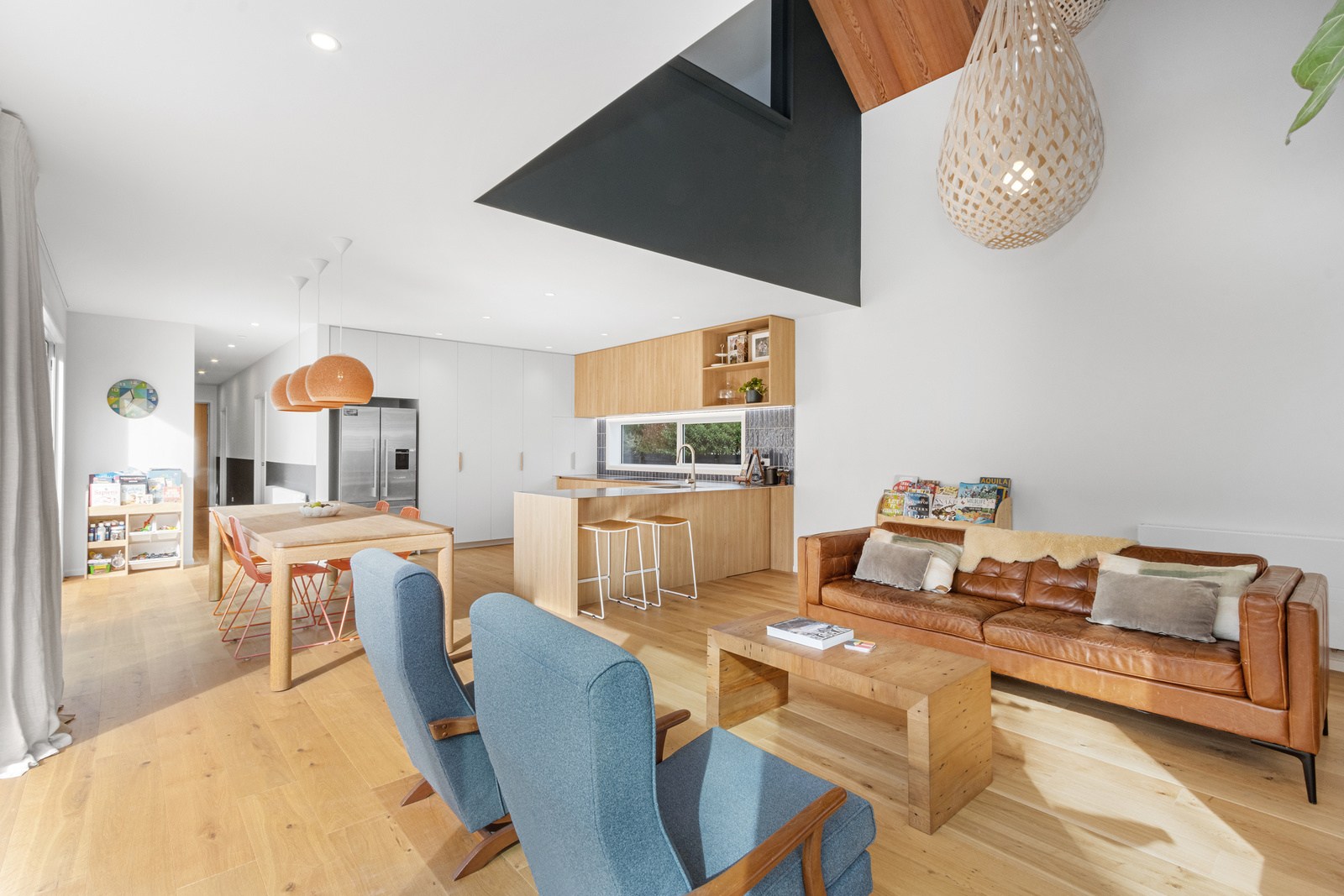 Innovation meets sensation in this three-bedroom house that punches above its weight. A long, narrow suburban site was a tricky proposition, but the home makes the most of the land and is a showcase for style and bold choices. It’s fair to say, the exterior doesn’t tell the whole story — it’s essentially a two-level 188sqm rectangle clad in painted bagged brick with cedar trim. The entrance, with vertical white timber struts and a golden-wood ceiling, provides a taste of what’s to come.
