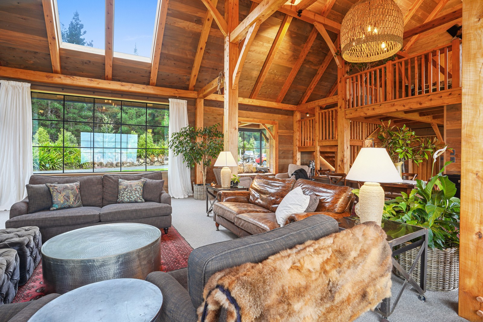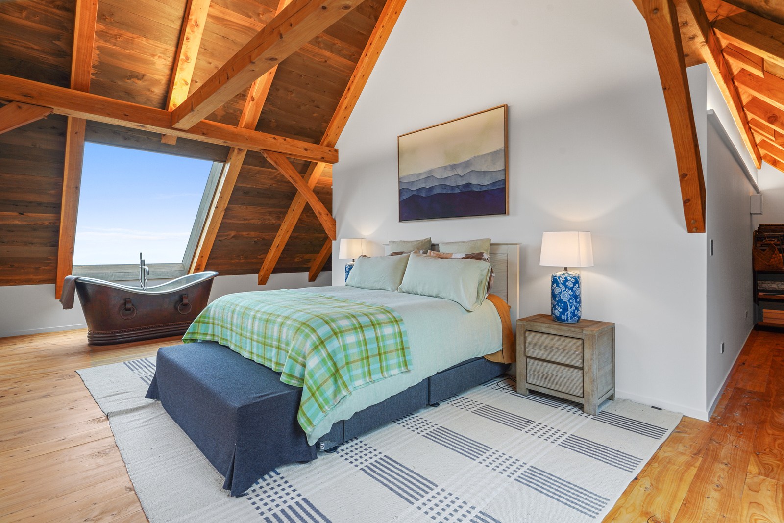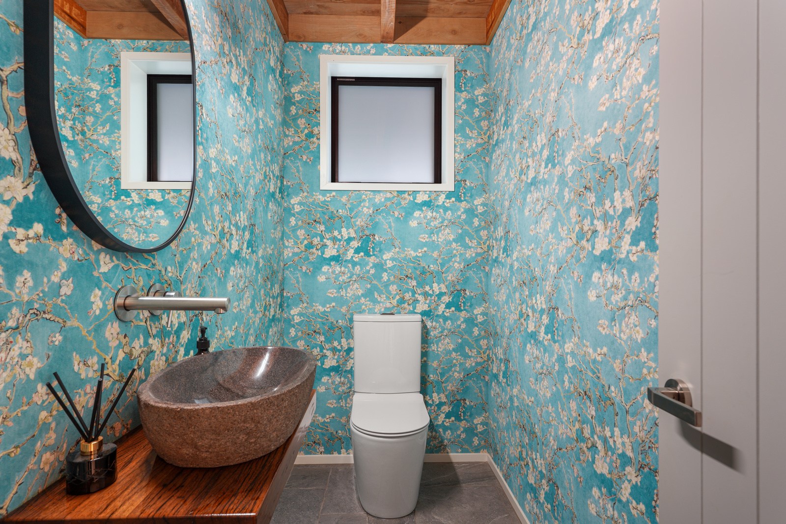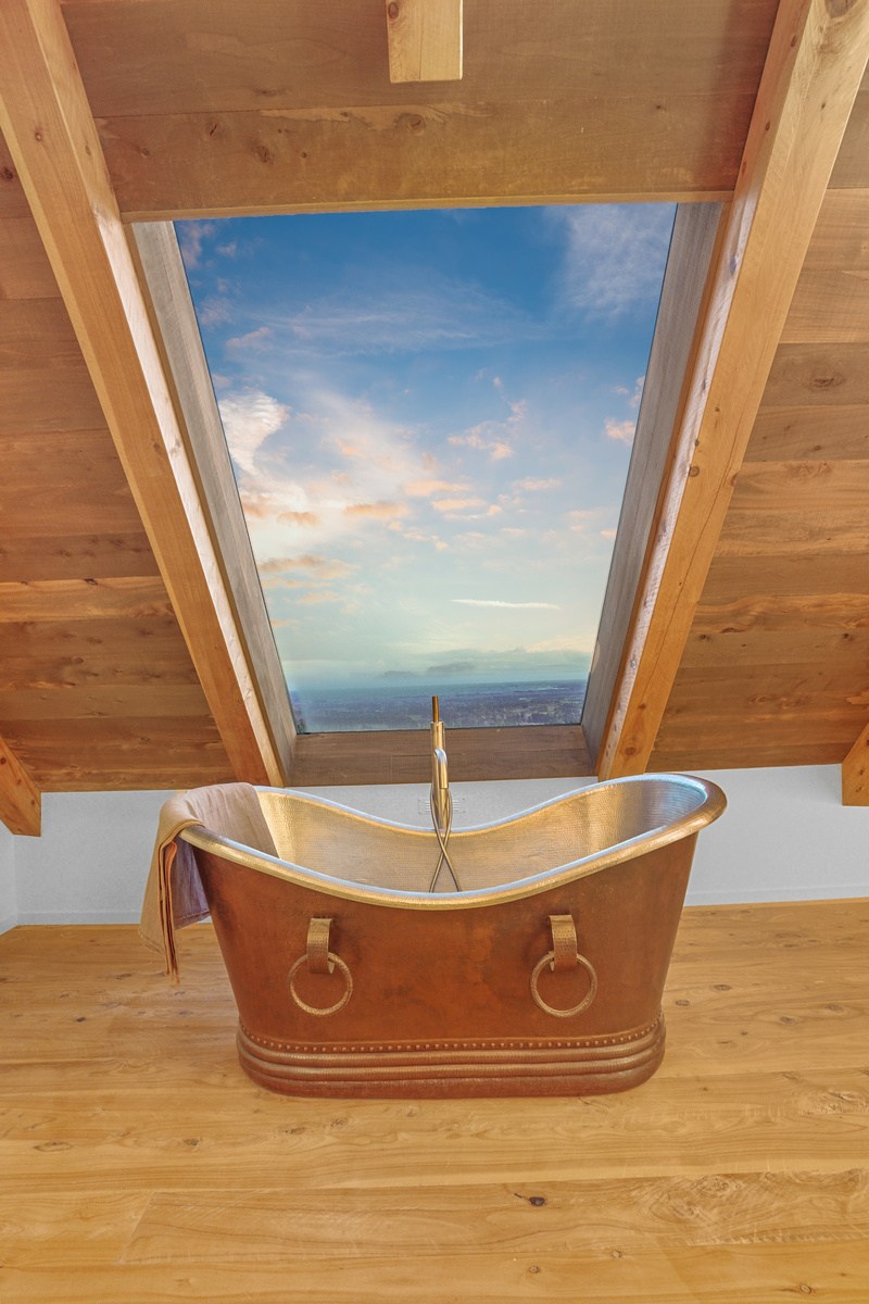 Environmental responsibility was paramount. Natural, sustainable and recyclable materials were used to avoid plastics and petrochemicals, while rainwater is put back in the ground with an innovative gutterless swale system that eliminates maintenance. A rigid air barrier of 12mm ply wraps the entire structure which improves seismic, wind, thermal and vermin resistance. A wood range, wetback log burner and 10kW solar array heat the remarkable timber-filled interior spaces, while outside a log fire is a gathering place for an evening drink. High verandahs, extended gables and roof windows passively control heat and UV year round. If that’s not enough innovation, the property has secret doors opening seamlessly through wall sarking, Van Gogh wallpaper, a feature timber staircase, mezzanine landing, outside entertaining area and a copper bath beneath massive skylights.