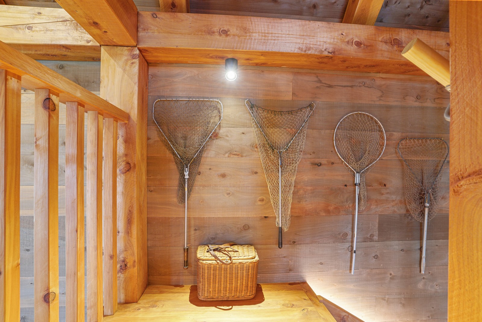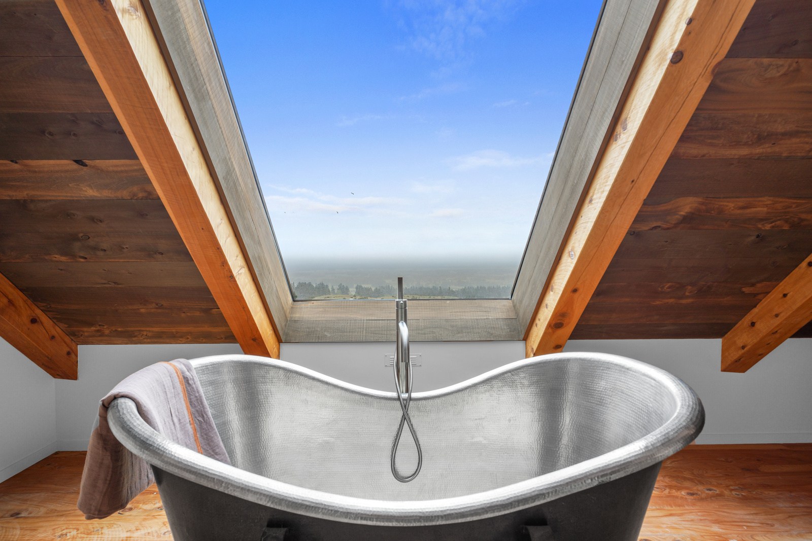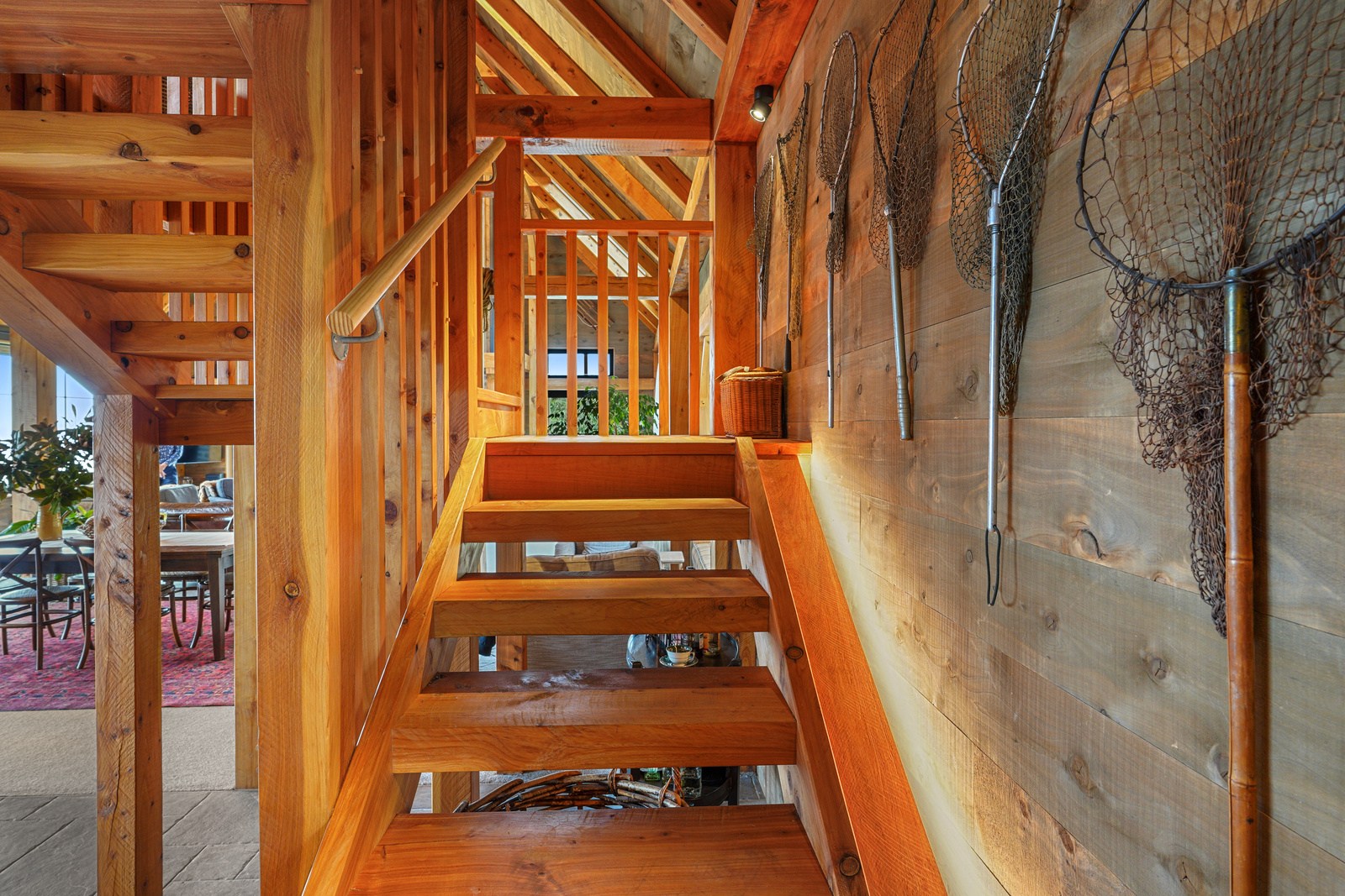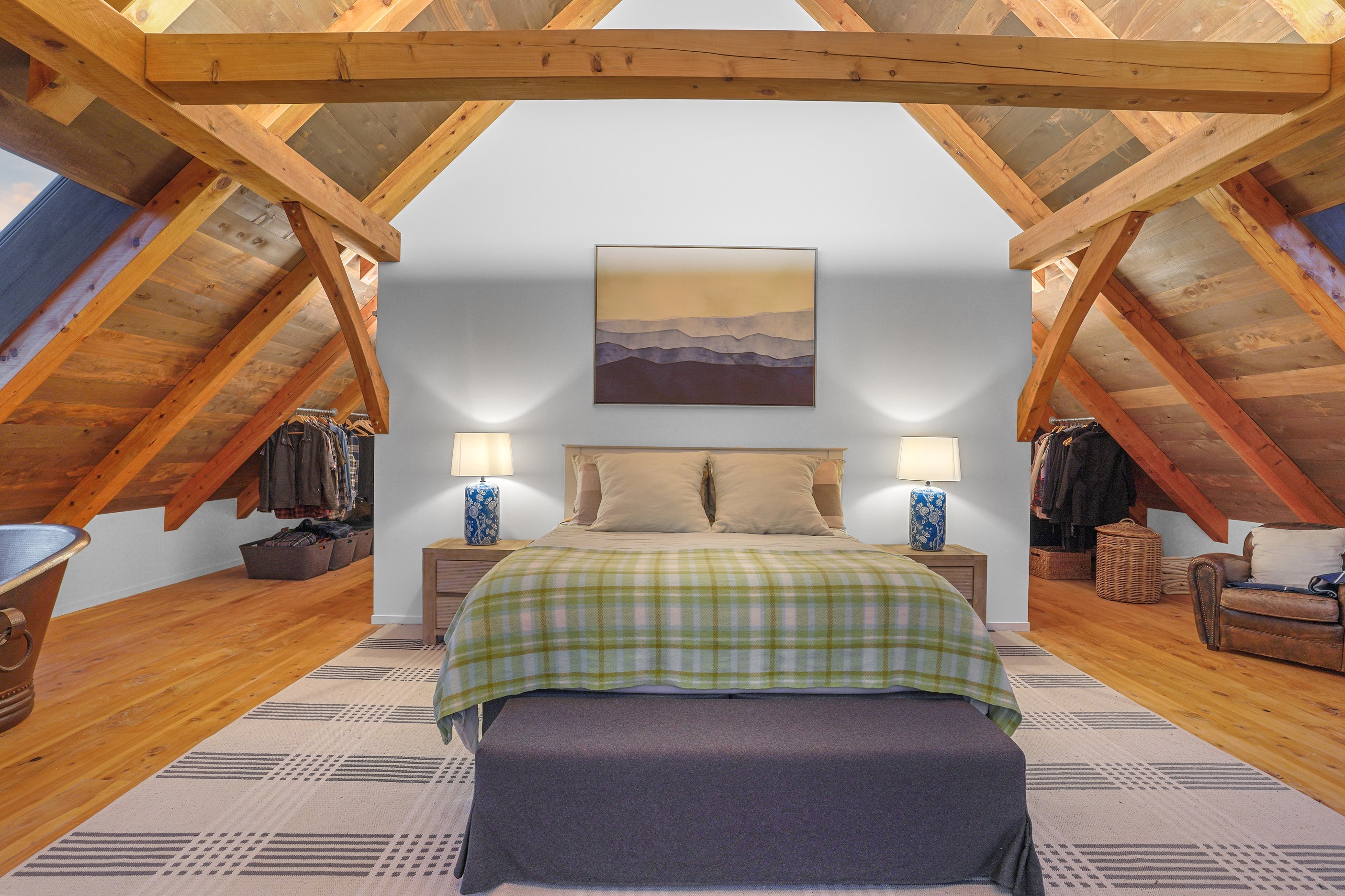 Environmental responsibility was paramount. Natural, sustainable and recyclable materials were used to avoid plastics and petrochemicals, while rainwater is put back in the ground with an innovative gutterless swale system that eliminates maintenance. A rigid air barrier of 12mm ply wraps the entire structure which improves seismic, wind, thermal and vermin resistance. A wood range, wetback log burner and 10kW solar array heat the remarkable timber-filled interior spaces, while outside a log fire is a gathering place for an evening drink. High verandahs, extended gables and roof windows passively control heat and UV year round. If that’s not enough innovation, the property has secret doors opening seamlessly through wall sarking, Van Gogh wallpaper, a feature timber staircase, mezzanine landing, outside entertaining area and a copper bath beneath massive skylights.