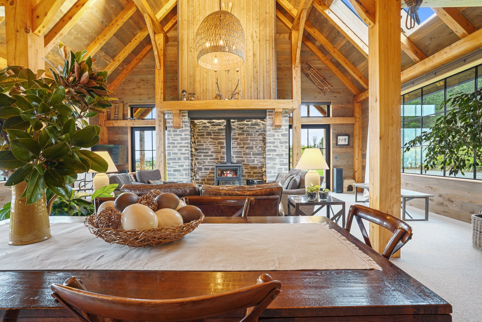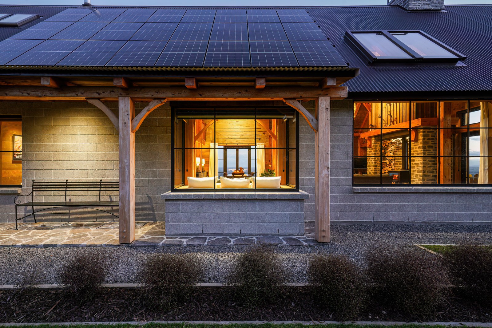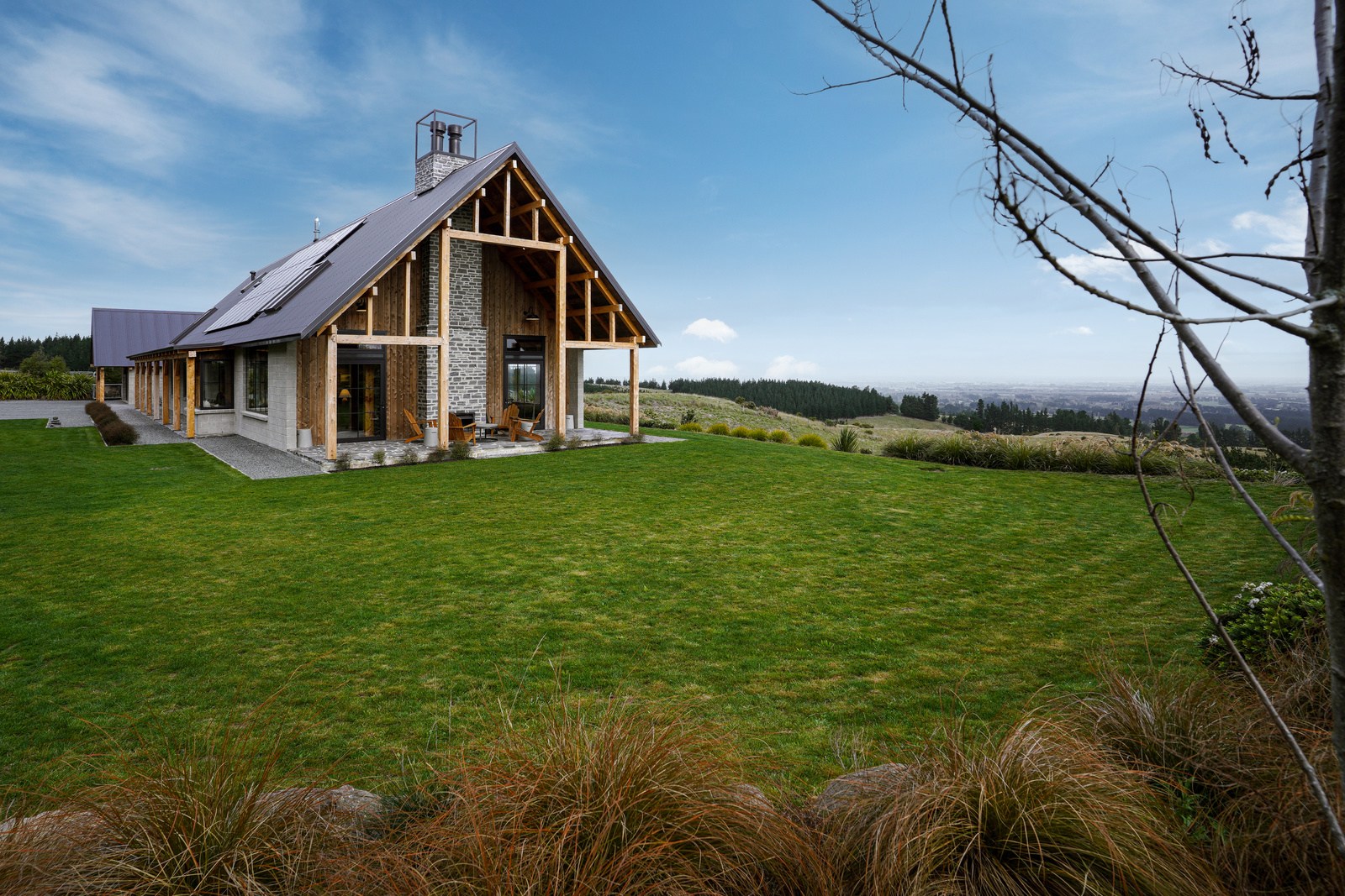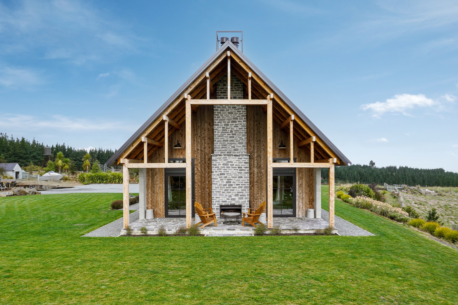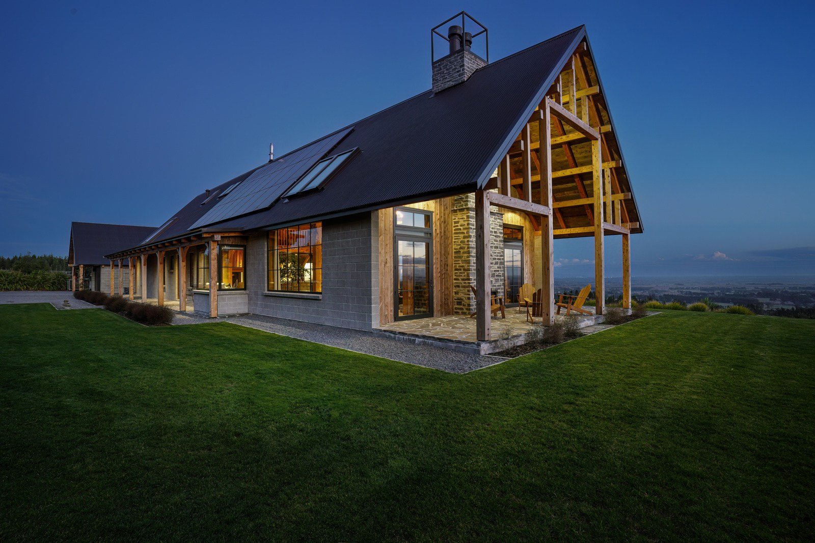 Located on a remote hilltop against a forest, this lodge-style home delivers big on personality, precision and performance. The builder, who is also an architectural designer, spent four years on the project starting at the outset of the pandemic. Once delivered, 65 tonnes of macrocarpa beams were honed into structural mortise-and-tenon joints – ancient stable connections that don’t need nails, but do require exceptional skill. You’ll also see stone, reverse board-and-batten and the first use of bush-hammered ViBlock masonry in Canterbury.