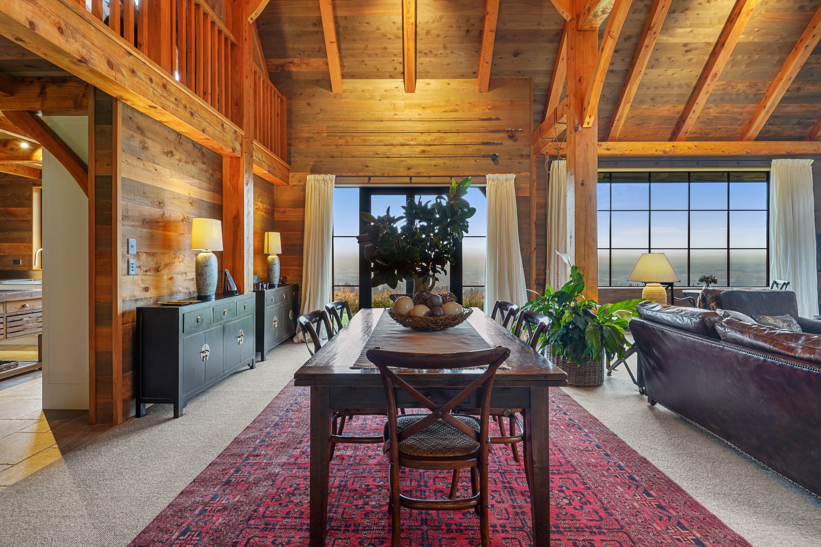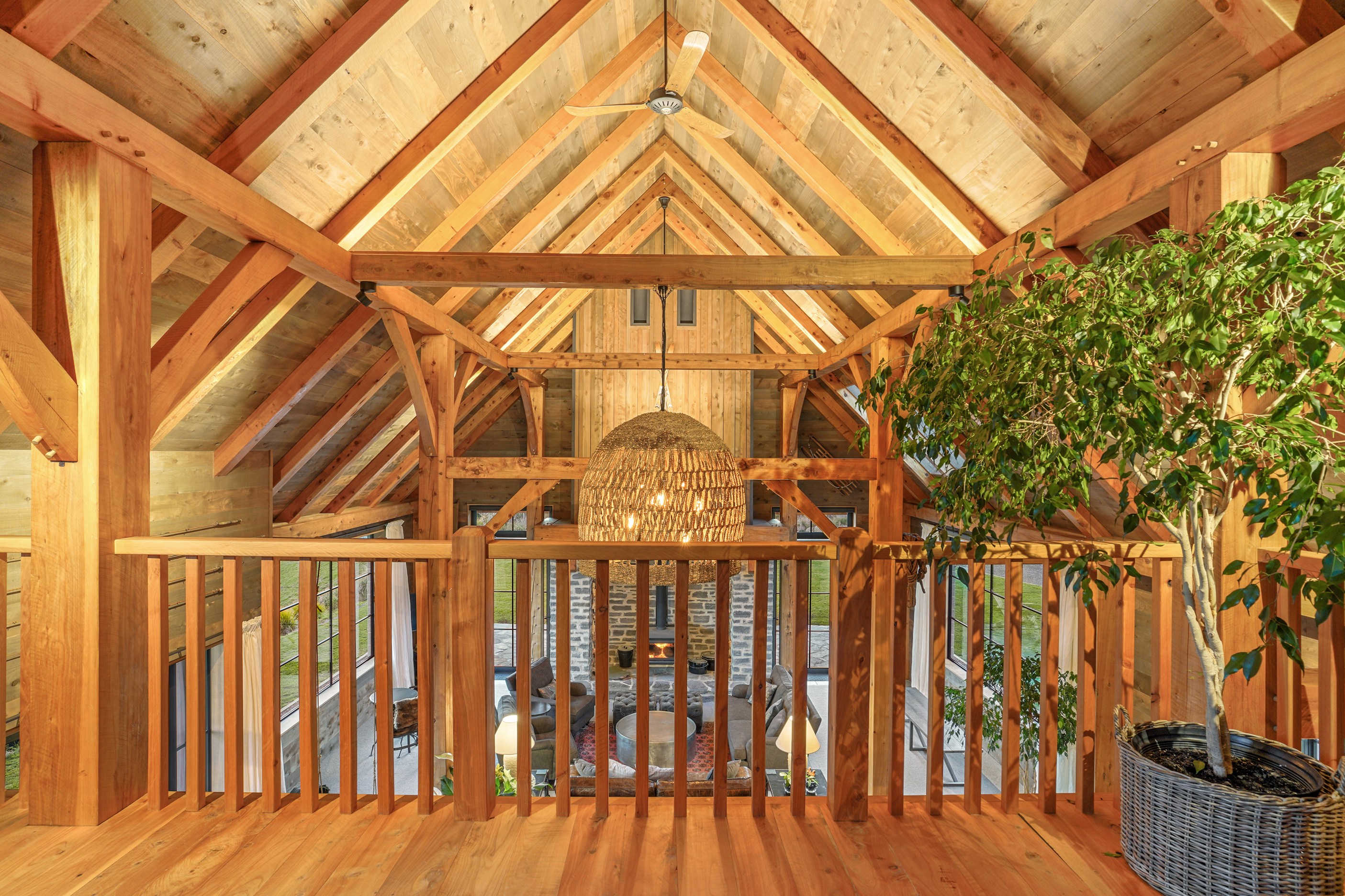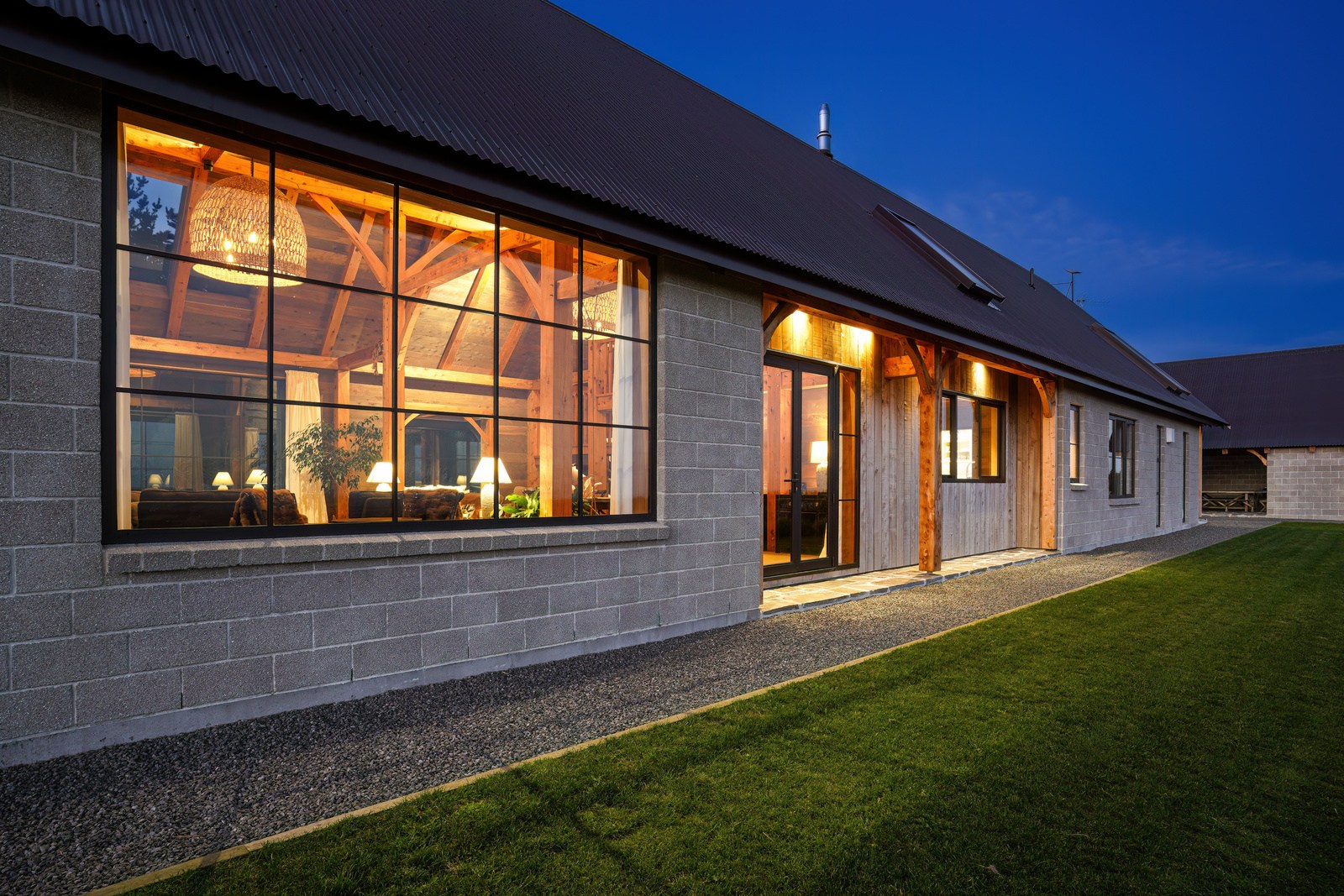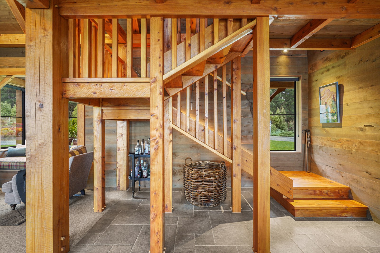 Located on a remote hilltop against a forest, this lodge-style home delivers big on personality, precision and performance. The builder, who is also an architectural designer, spent four years on the project starting at the outset of the pandemic. Once delivered, 65 tonnes of macrocarpa beams were honed into structural mortise-and-tenon joints – ancient stable connections that don’t need nails, but do require exceptional skill. You’ll also see stone, reverse board-and-batten and the first use of bush-hammered ViBlock masonry in Canterbury.