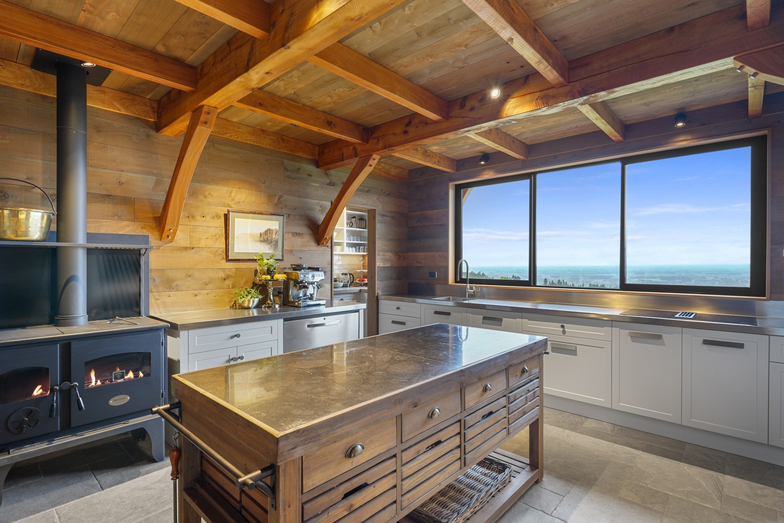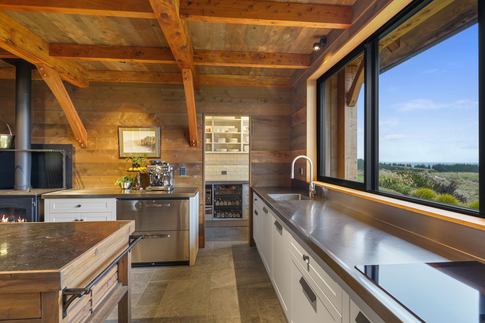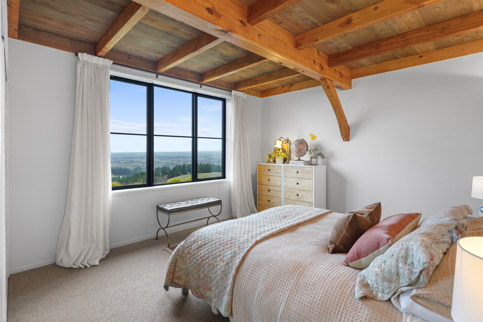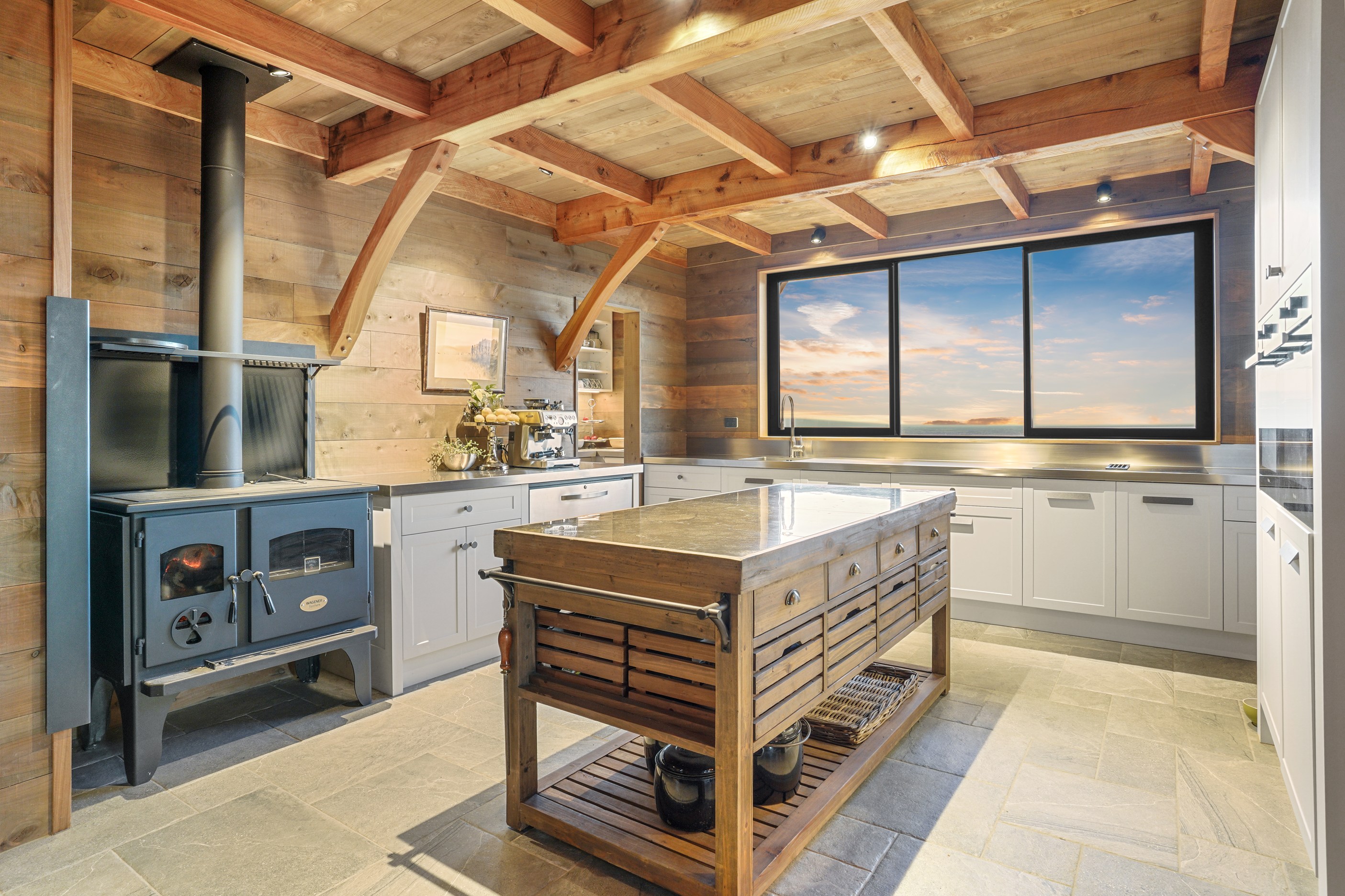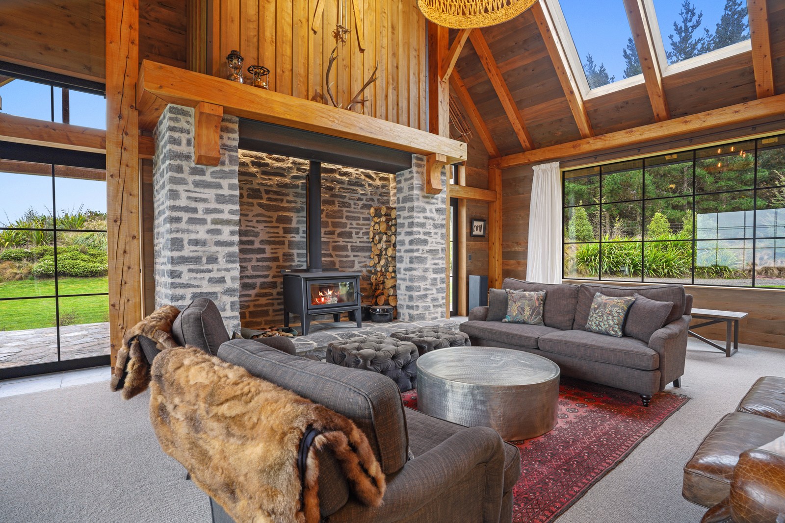 Located on a remote hilltop against a forest, this lodge-style home delivers big on personality, precision and performance. The builder, who is also an architectural designer, spent four years on the project starting at the outset of the pandemic. Once delivered, 65 tonnes of macrocarpa beams were honed into structural mortise-and-tenon joints – ancient stable connections that don’t need nails, but do require exceptional skill. You’ll also see stone, reverse board-and-batten and the first use of bush-hammered ViBlock masonry in Canterbury.