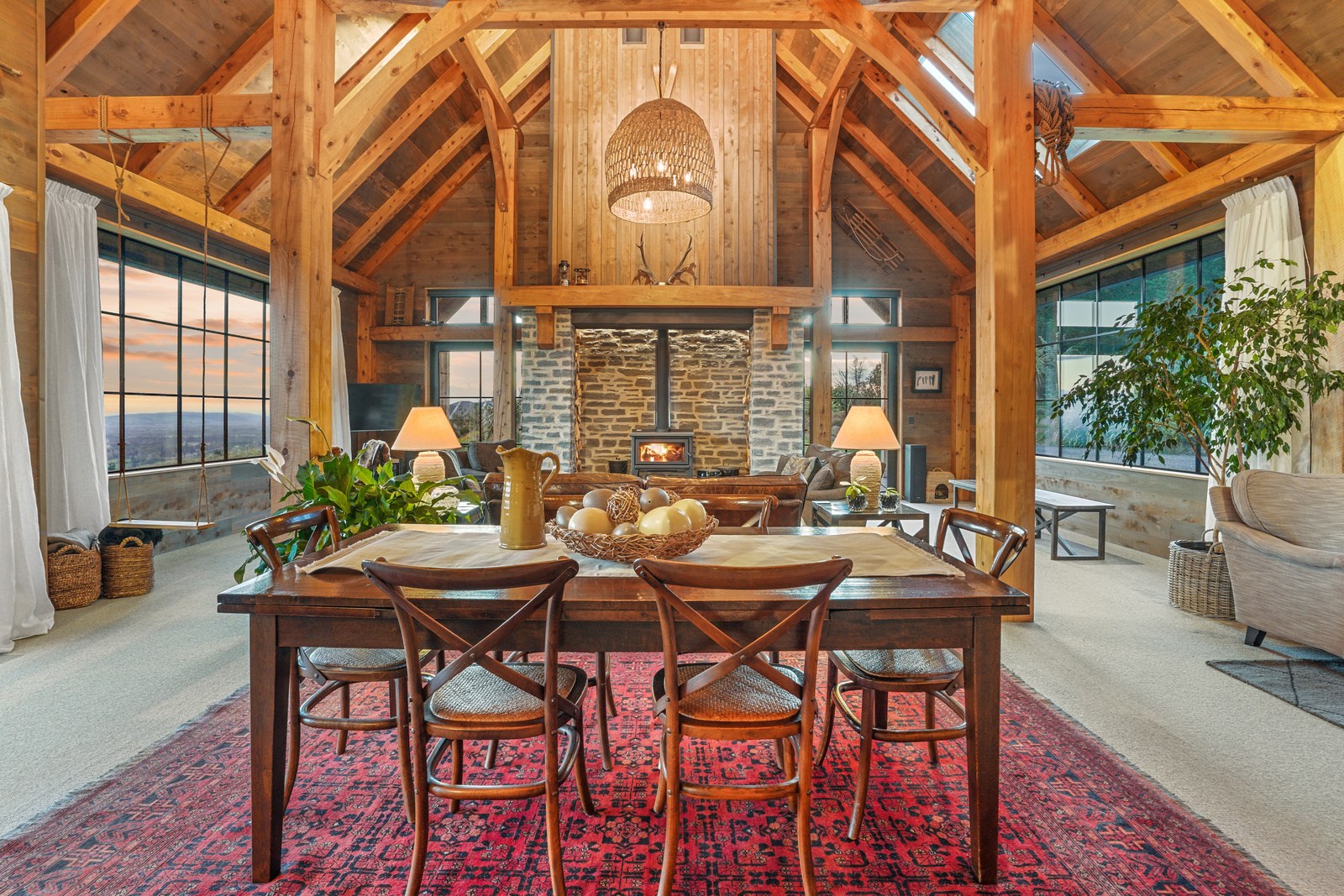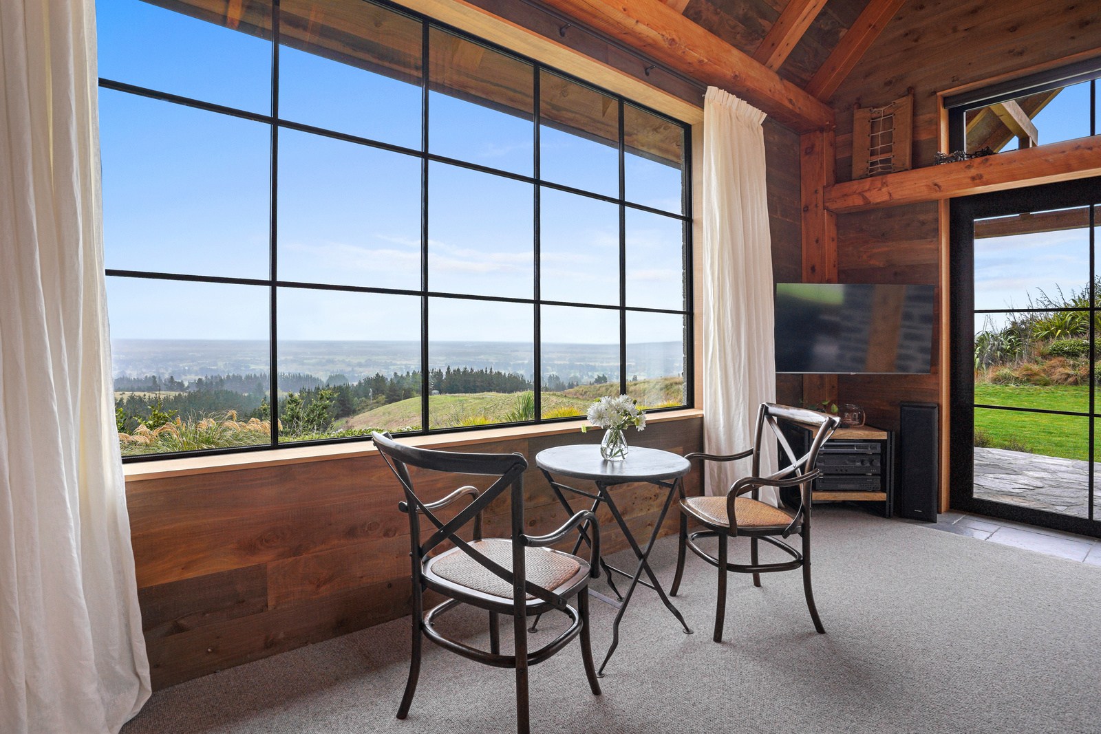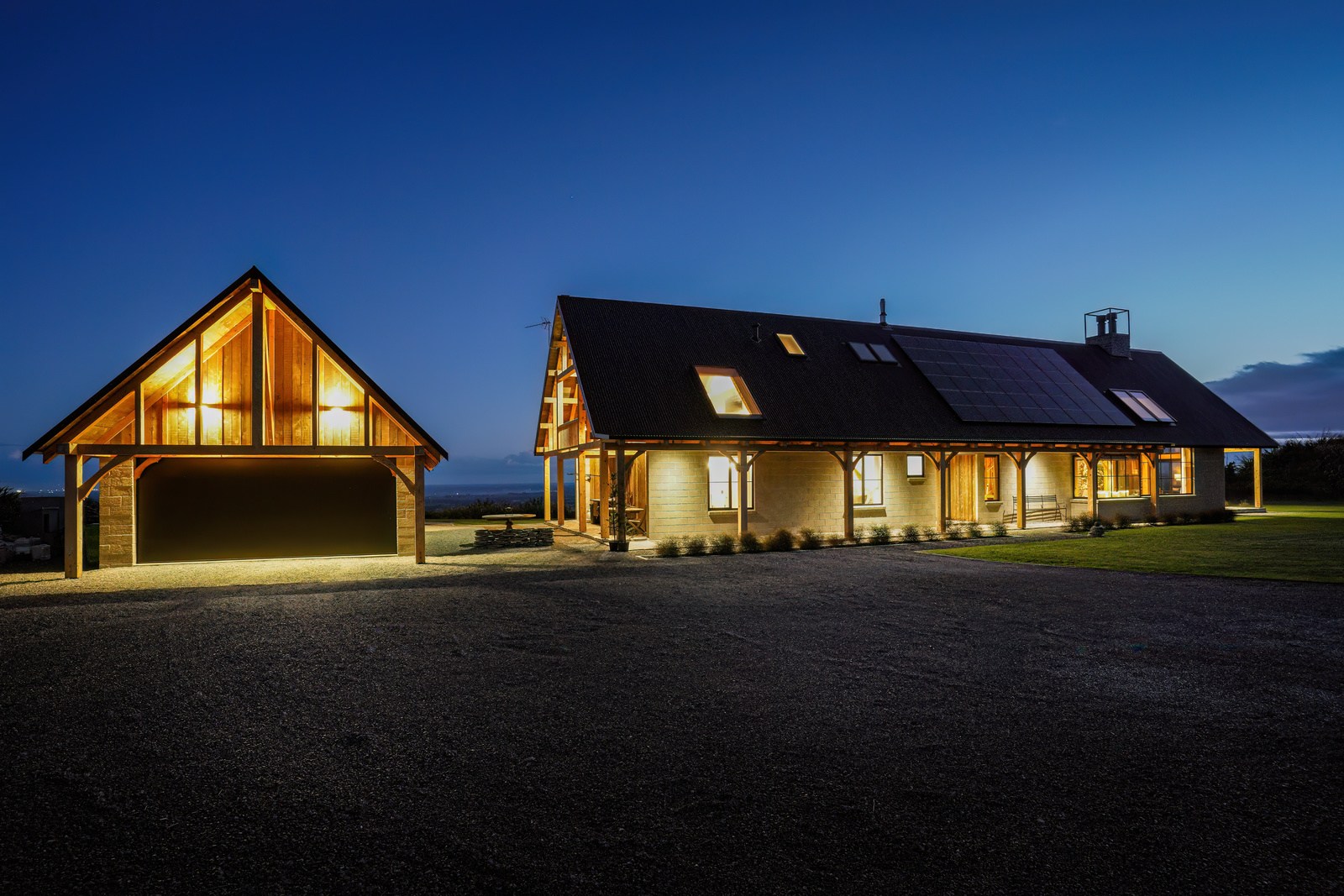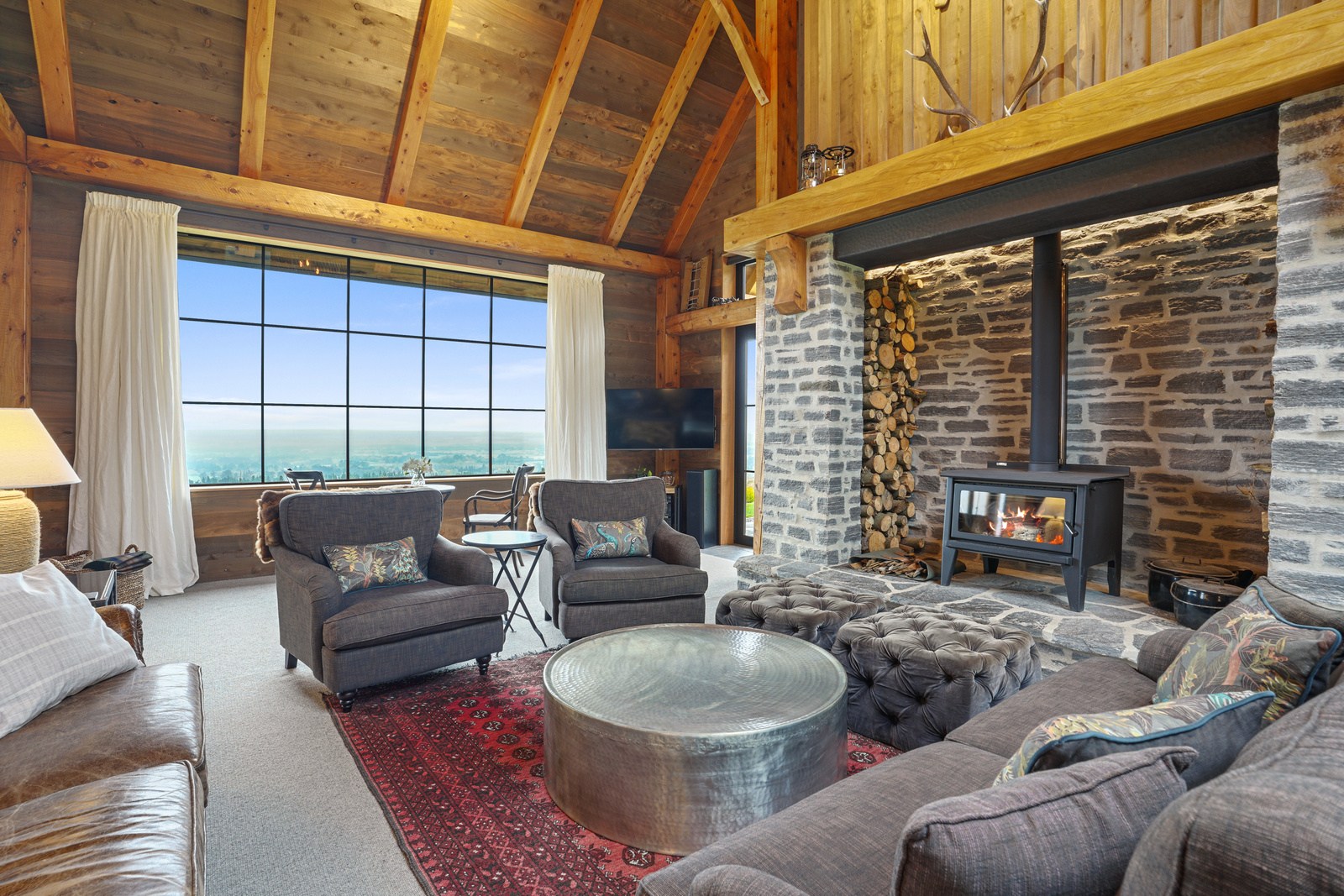 Located on a remote hilltop against a forest, this lodge-style home delivers big on personality, precision and performance. The builder, who is also an architectural designer, spent four years on the project starting at the outset of the pandemic. Once delivered, 65 tonnes of macrocarpa beams were honed into structural mortise-and-tenon joints – ancient stable connections that don’t need nails, but do require exceptional skill. You’ll also see stone, reverse board-and-batten and the first use of bush-hammered ViBlock masonry in Canterbury.