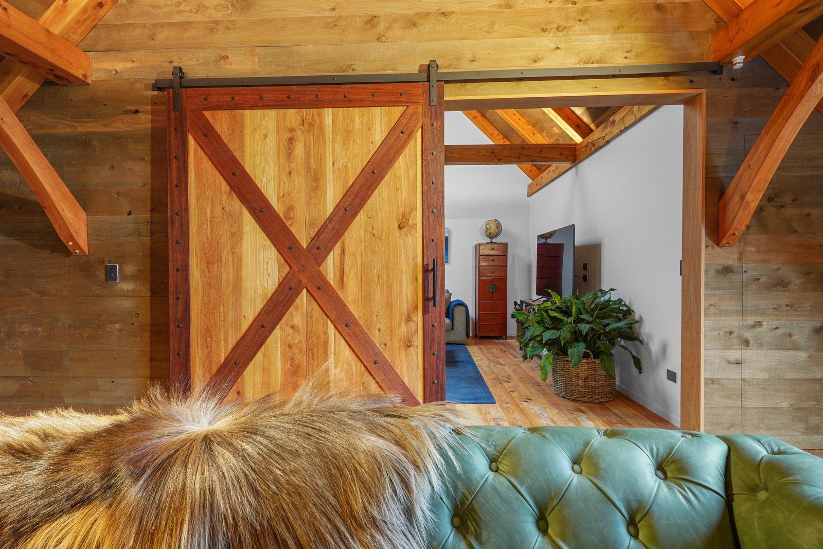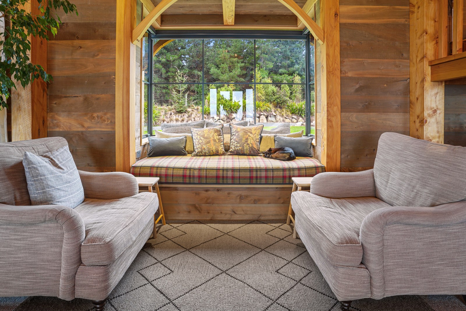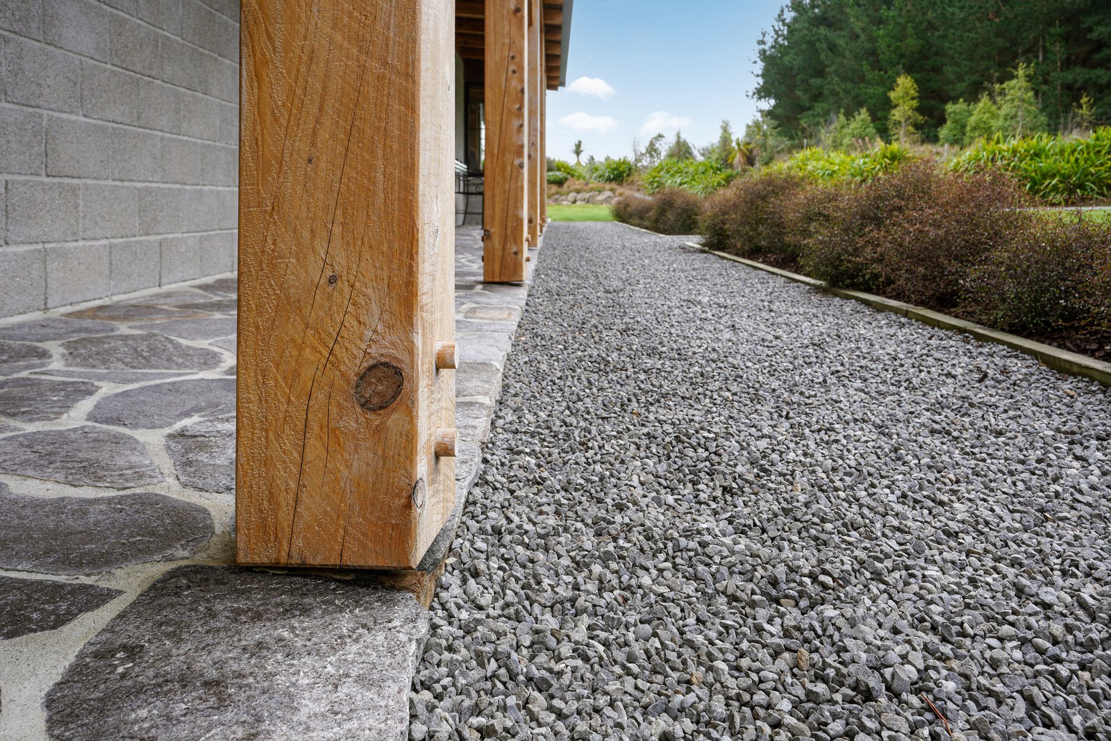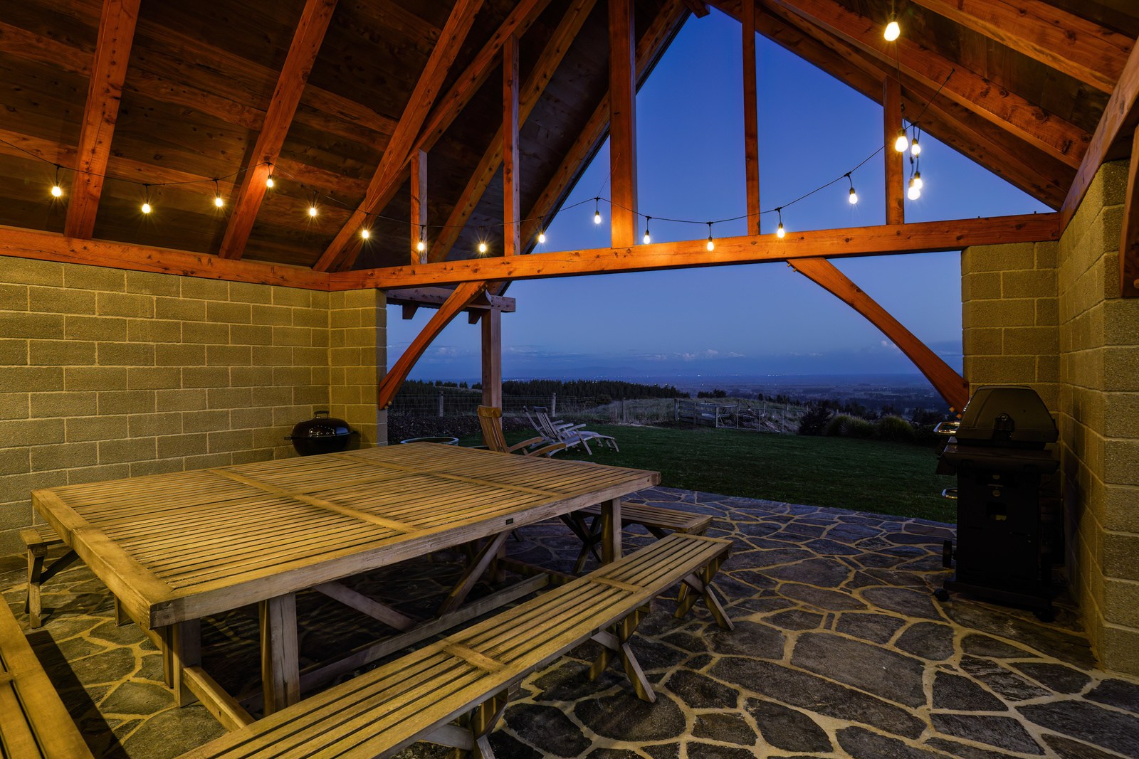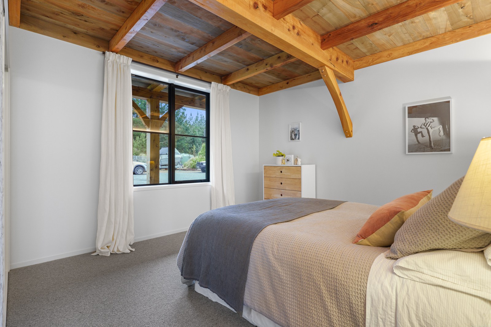 Located on a remote hilltop against a forest, this lodge-style home delivers big on personality, precision and performance. The builder, who is also an architectural designer, spent four years on the project starting at the outset of the pandemic. Once delivered, 65 tonnes of macrocarpa beams were honed into structural mortise-and-tenon joints – ancient stable connections that don’t need nails, but do require exceptional skill. You’ll also see stone, reverse board-and-batten and the first use of bush-hammered ViBlock masonry in Canterbury.