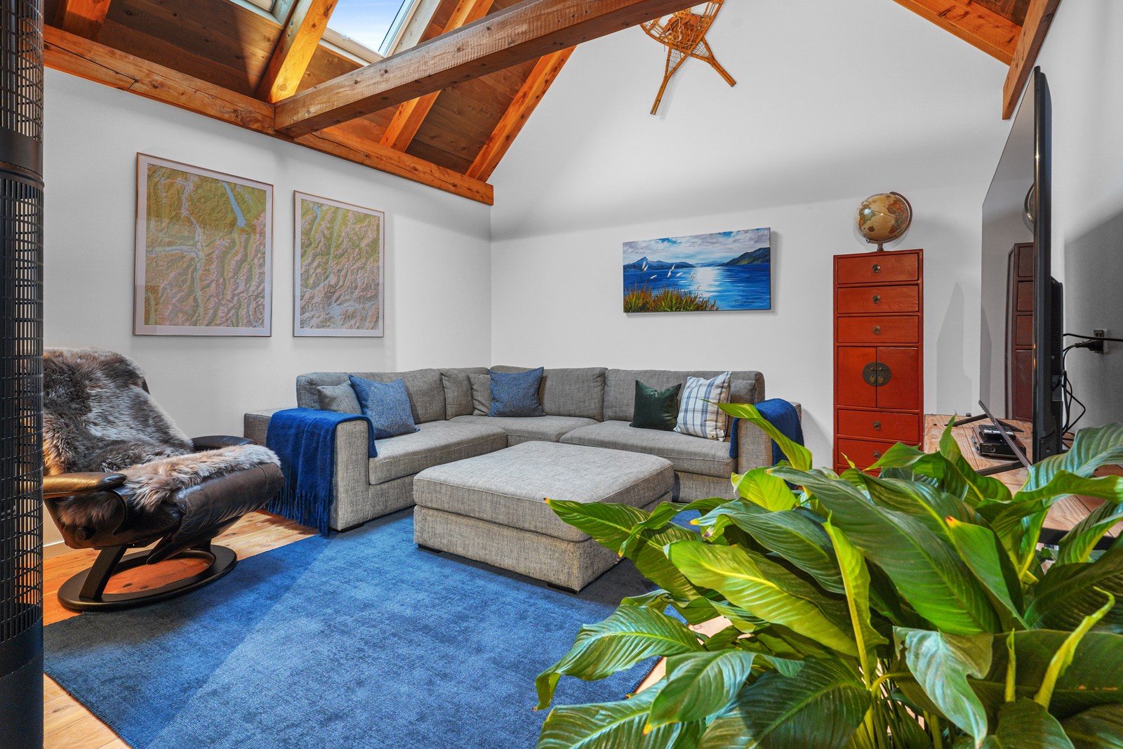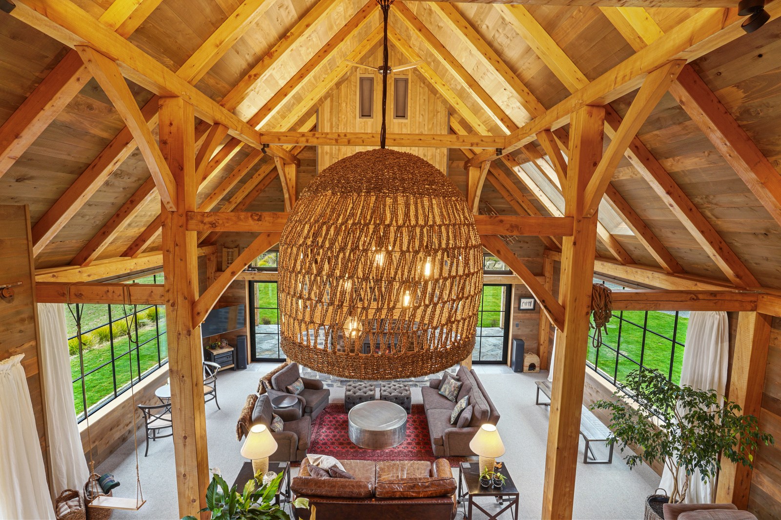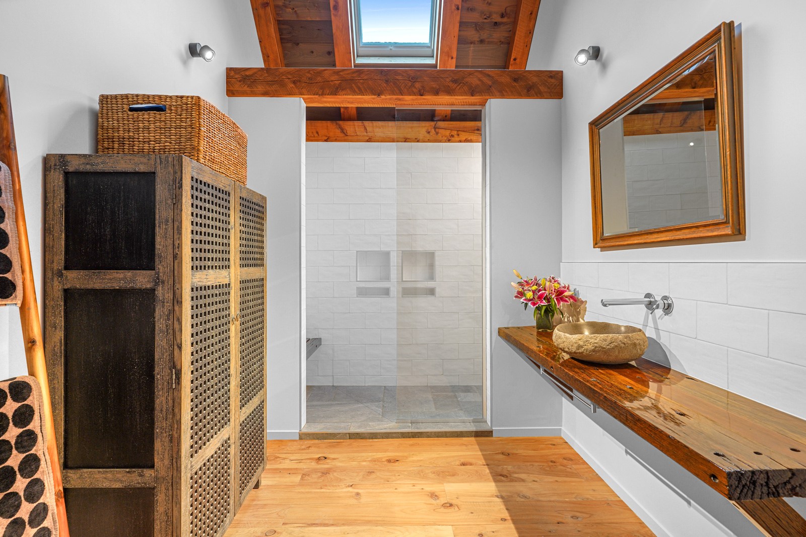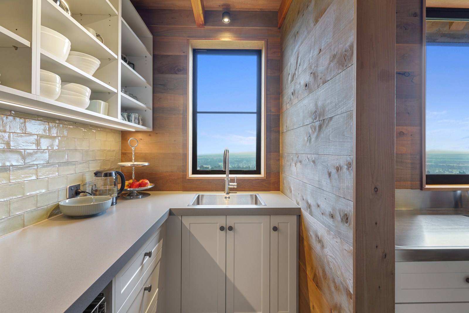 Located on a remote hilltop against a forest, this lodge-style home delivers big on personality, precision and performance. The builder, who is also an architectural designer, spent four years on the project starting at the outset of the pandemic. Once delivered, 65 tonnes of macrocarpa beams were honed into structural mortise-and-tenon joints – ancient stable connections that don’t need nails, but do require exceptional skill. You’ll also see stone, reverse board-and-batten and the first use of bush-hammered ViBlock masonry in Canterbury.