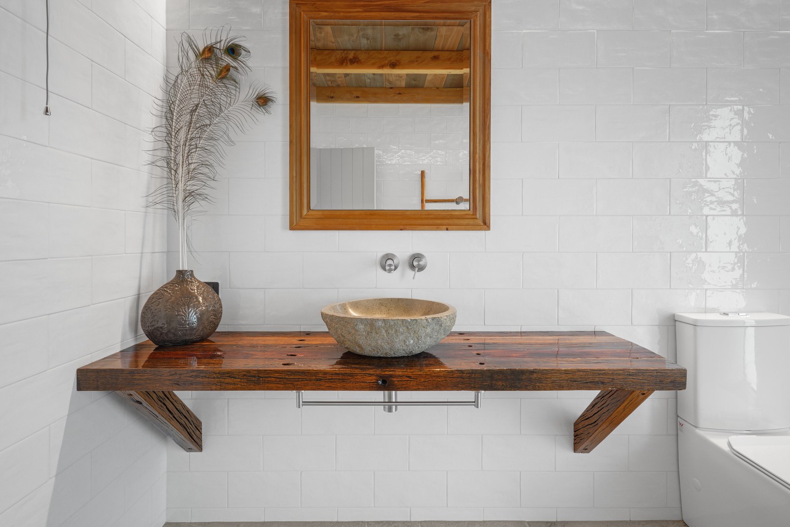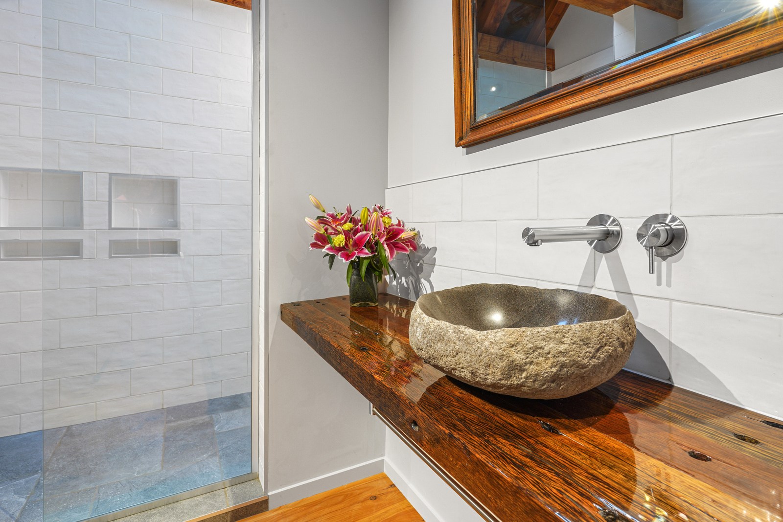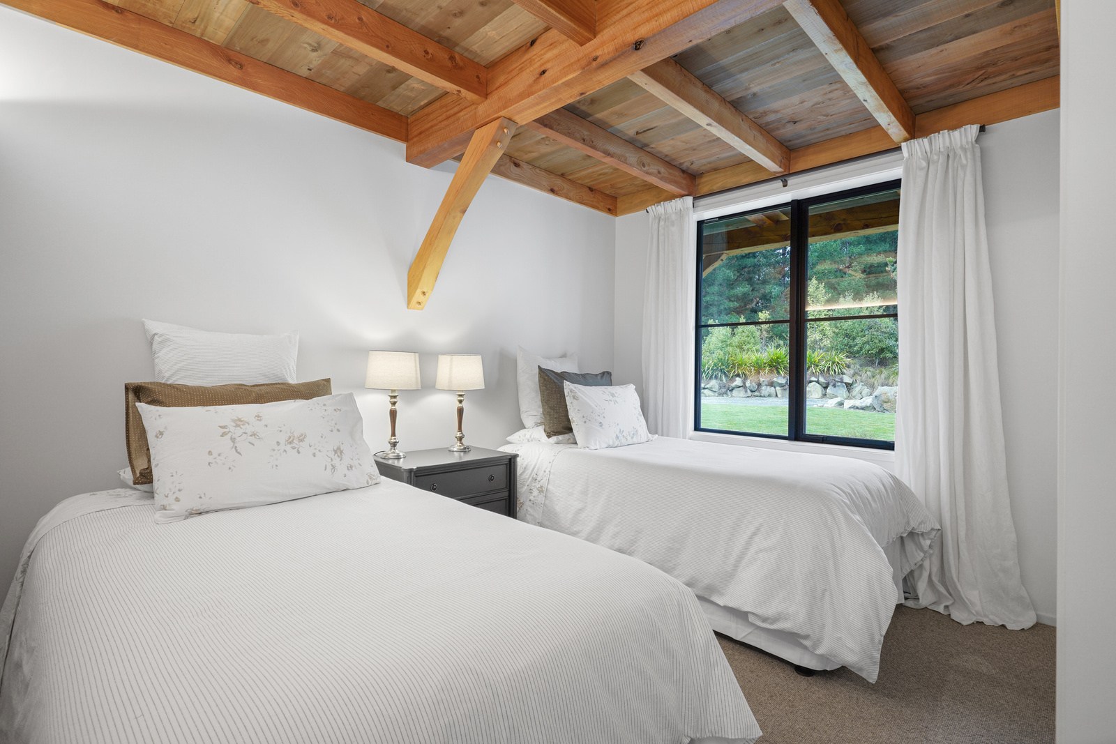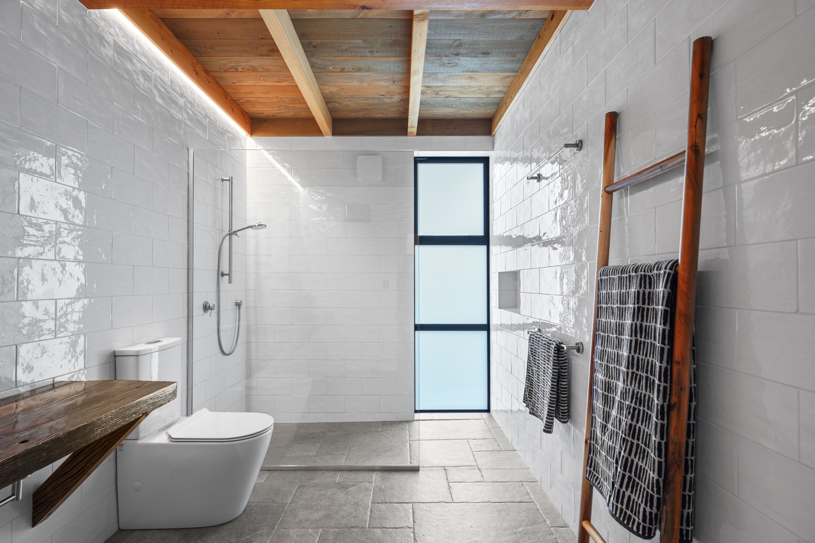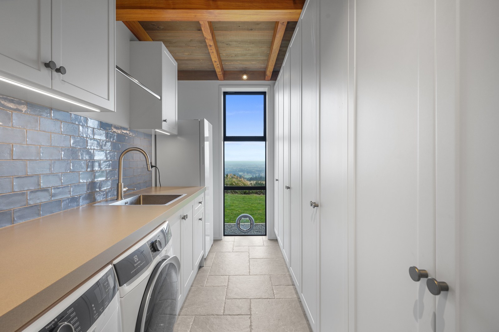 Located on a remote hilltop against a forest, this lodge-style home delivers big on personality, precision and performance. The builder, who is also an architectural designer, spent four years on the project starting at the outset of the pandemic. Once delivered, 65 tonnes of macrocarpa beams were honed into structural mortise-and-tenon joints – ancient stable connections that don’t need nails, but do require exceptional skill. You’ll also see stone, reverse board-and-batten and the first use of bush-hammered ViBlock masonry in Canterbury.