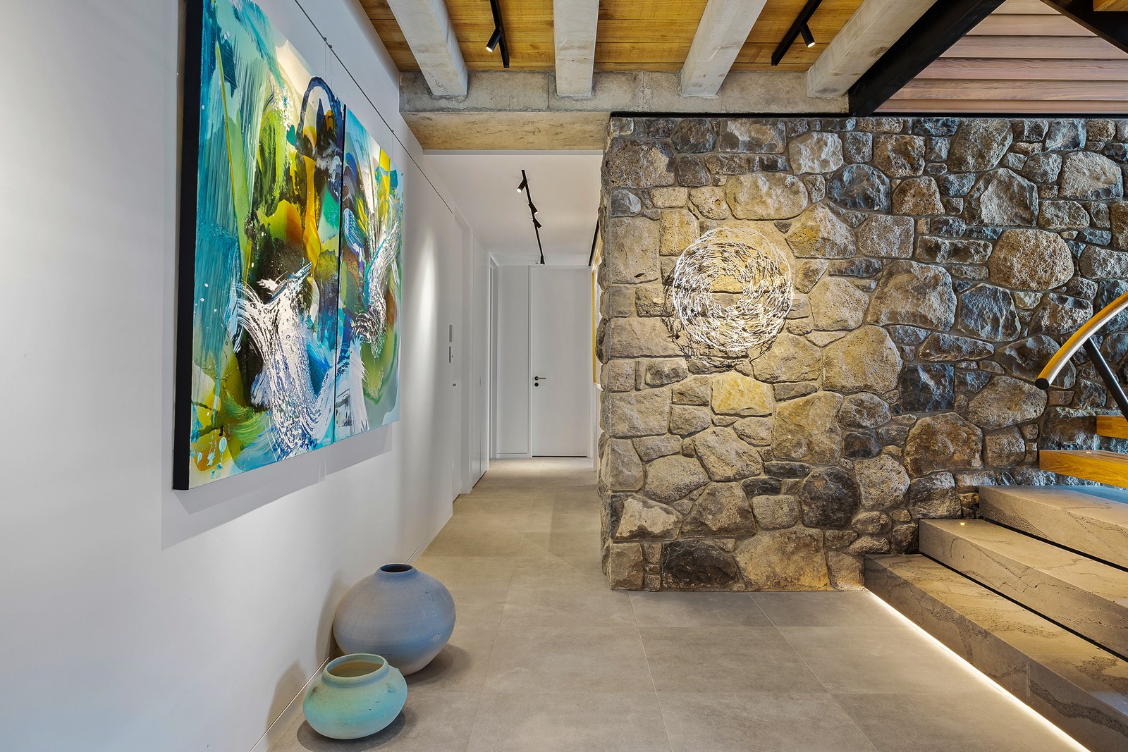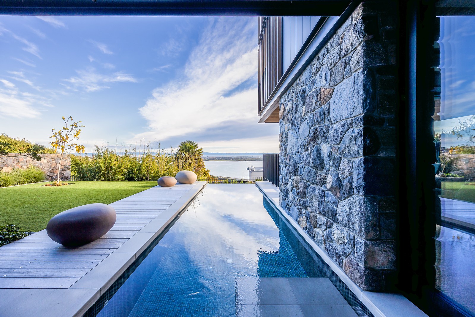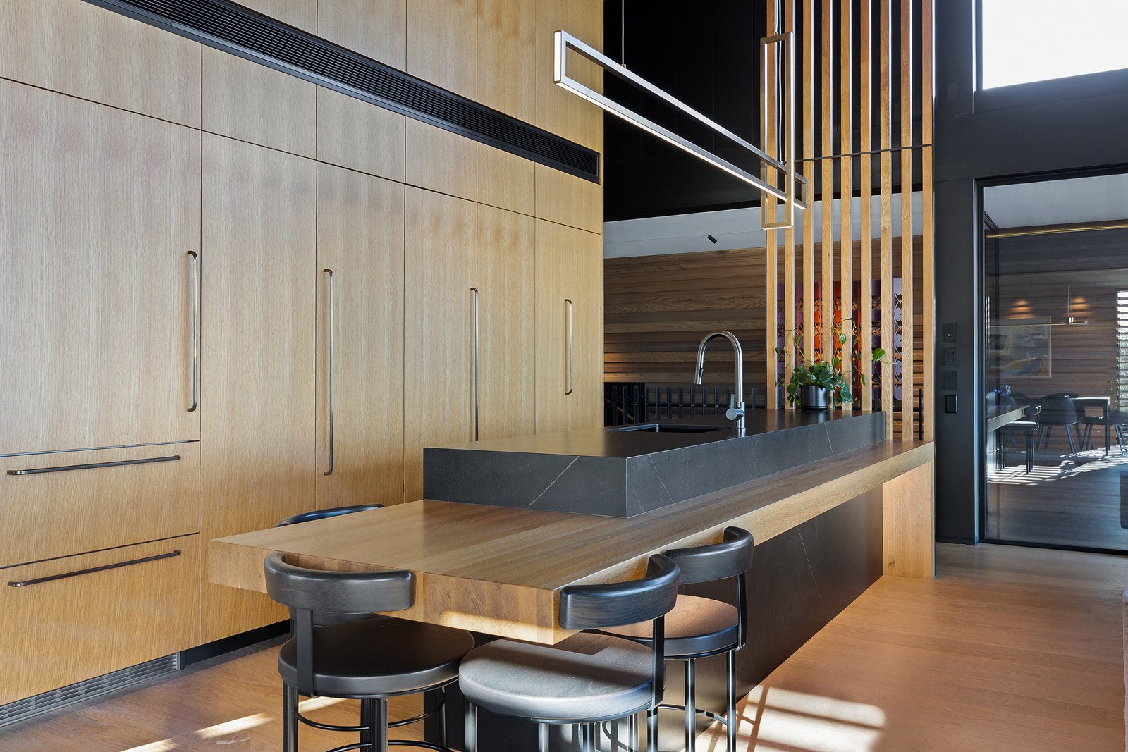 Strong, sculptural and seamlessly engineered, this is a forever home in every sense. The build brief was exacting. Energy-efficient heating and cooling, smart ventilation and solar screening were essential, as were natural materials and indoor-outdoor flow. Anchored into the hillside, the home steps with the land, its clean lines and gentle palette echoing the contours and colours of the coast. Timber, stone, concrete and metal have been employed with precision and restraint, creating a strong yet serene architectural form.