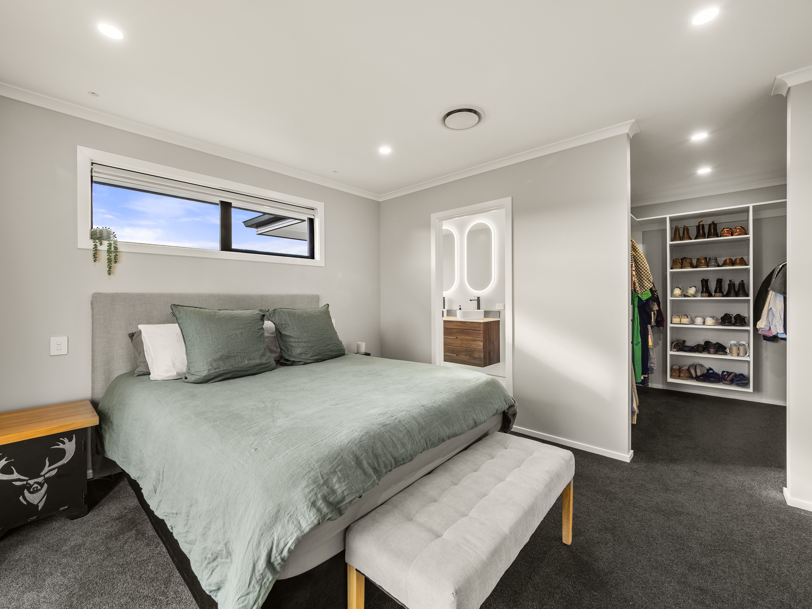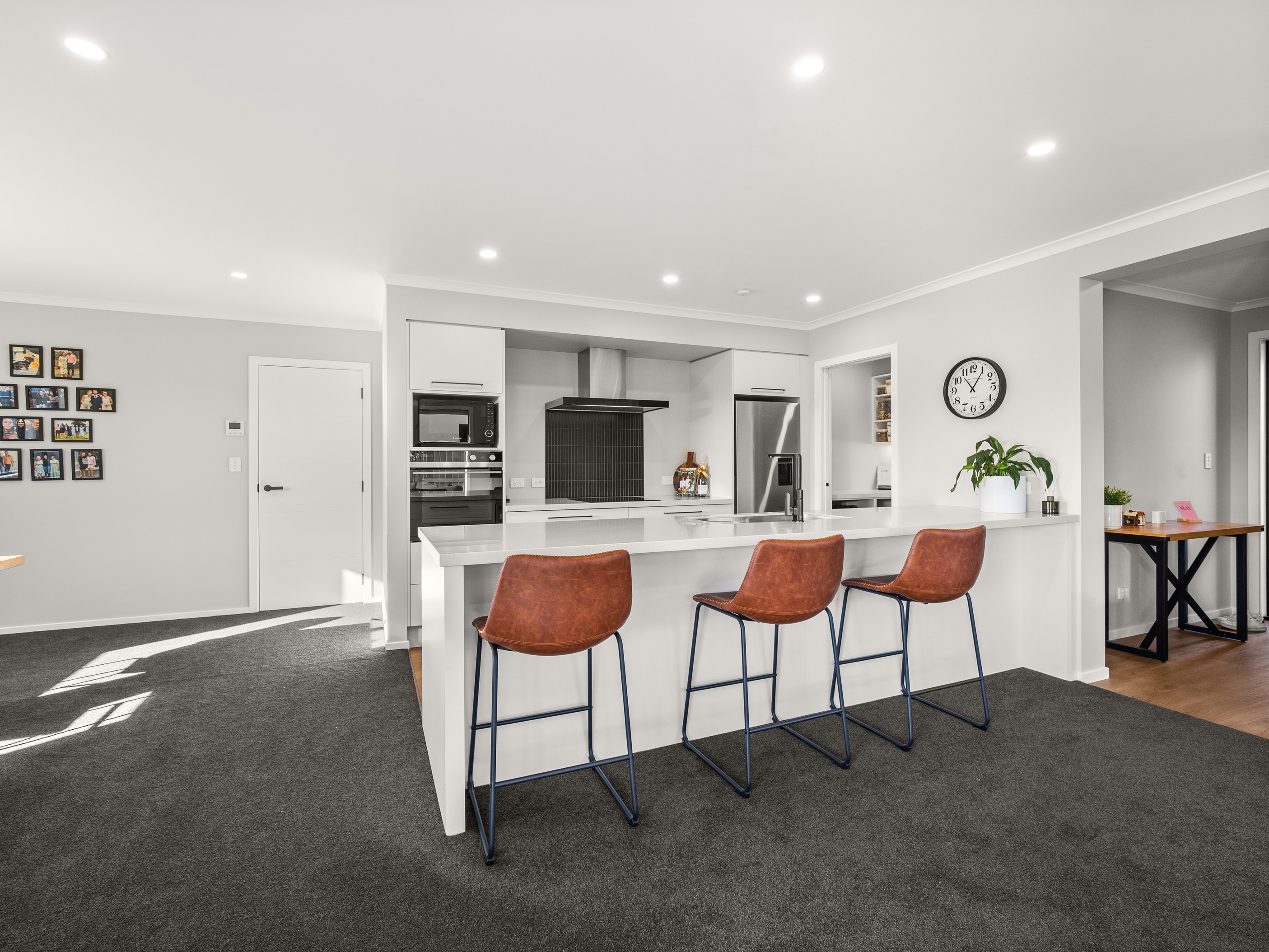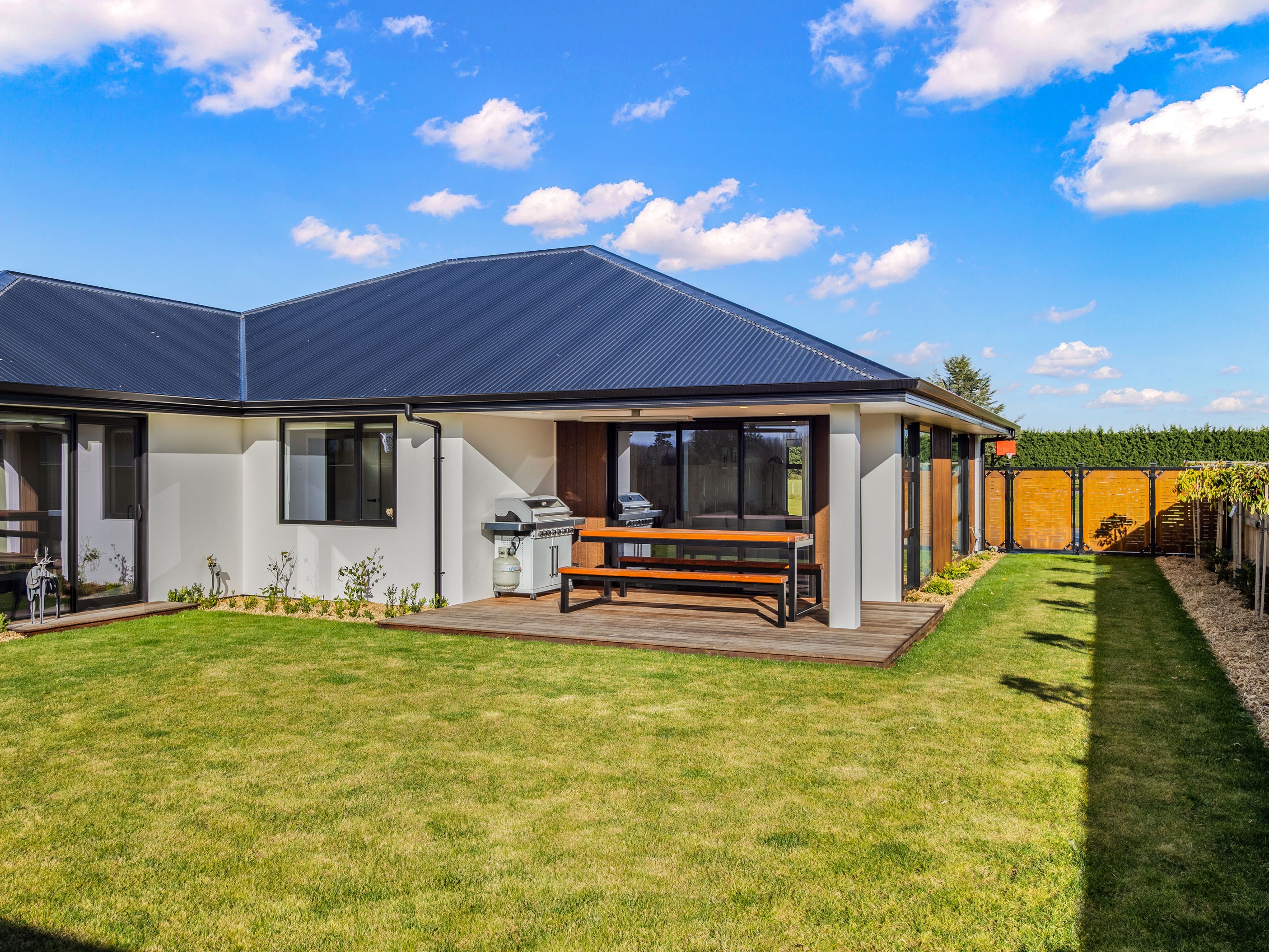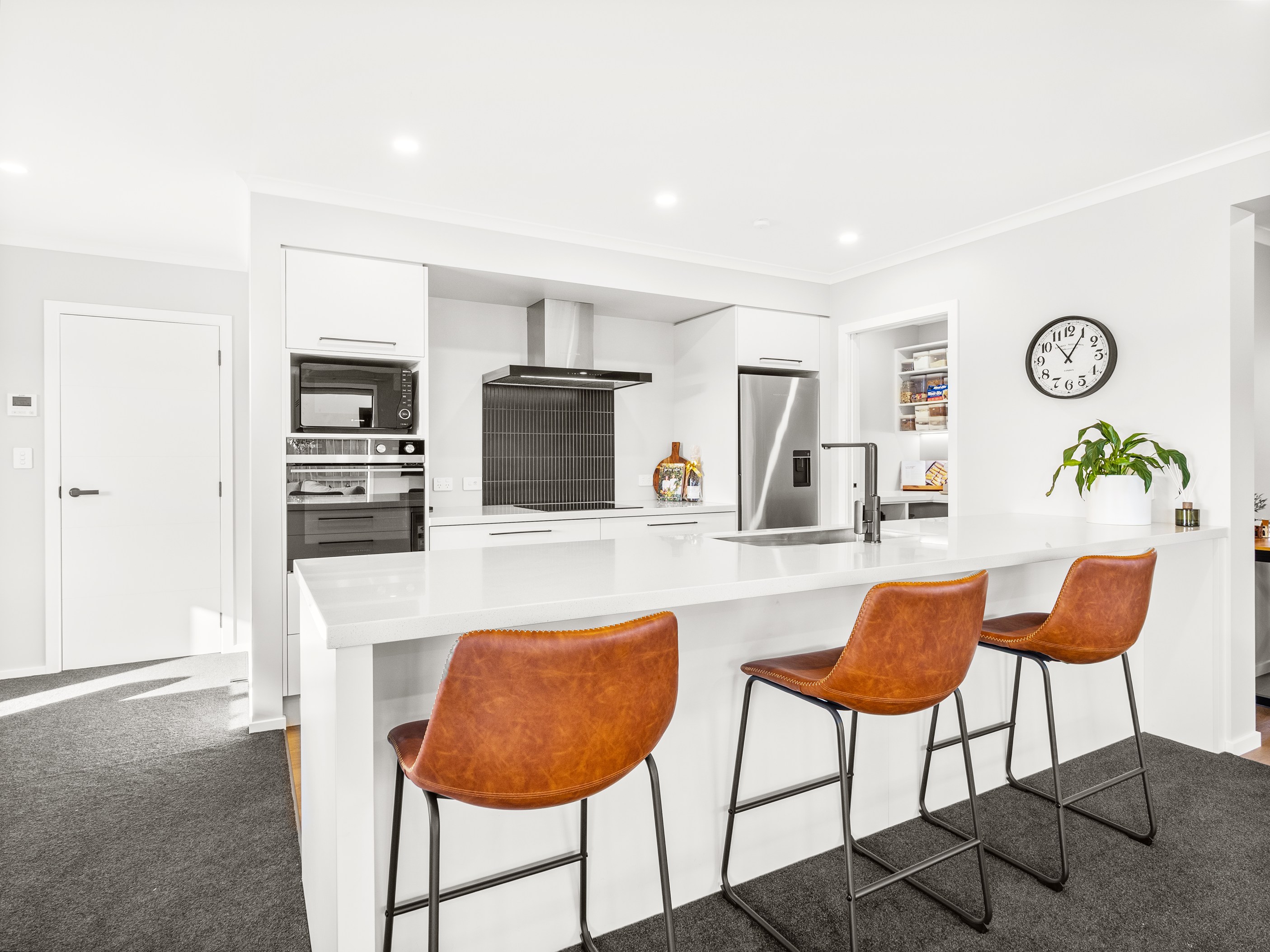 On the green fringes of Ashburton you’ll find a home that’s a perfect blend of contemporary design, convenience and extras tailored to the owners’ needs. One such client amenity is a carpeted triple garage that has oodles of storage for toys, vehicles, projects and more. To the house proper and the jewel of the crown the open-plan dining and living spaces, which arc around the sleek white kitchen. In fact, white is the consummate canvas for furniture, furnishings and the owners special pieces throughout the 233sqm three-bedroom home. These include russet-coloured dining chairs and bar stools, framed art, photographs and timber furniture. Expansive glazing, including sliding doors, allows green views to flood into this zone.
