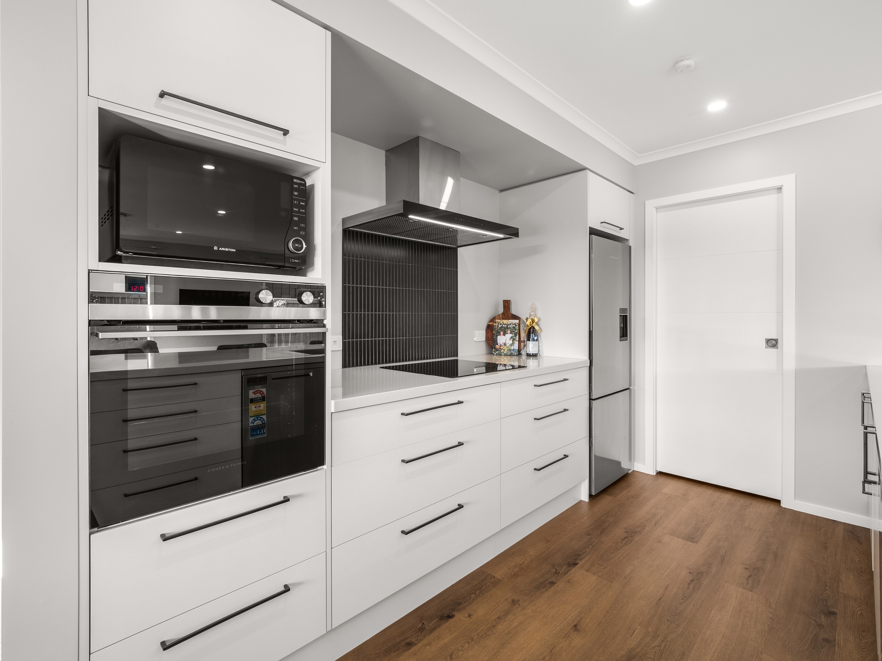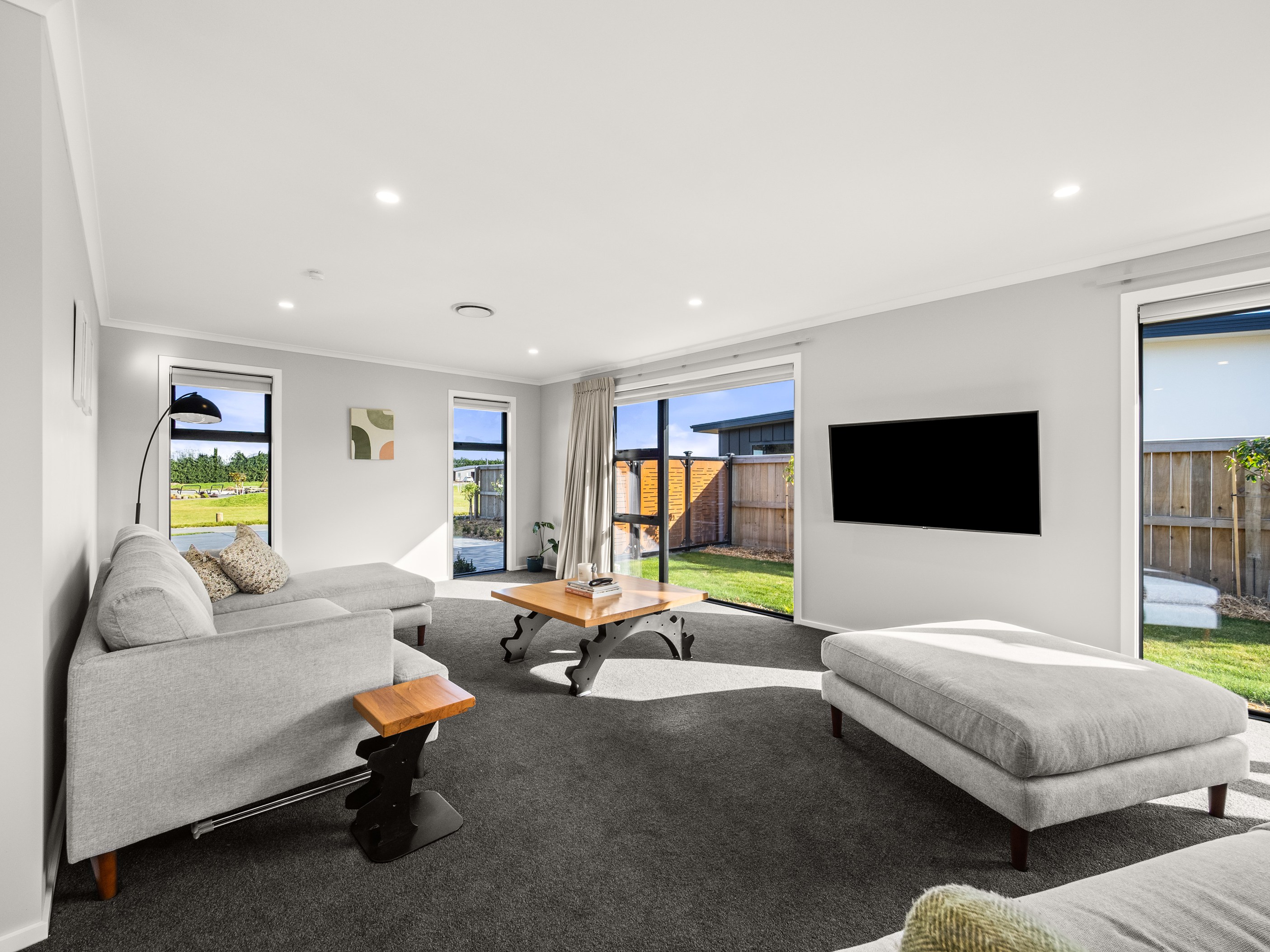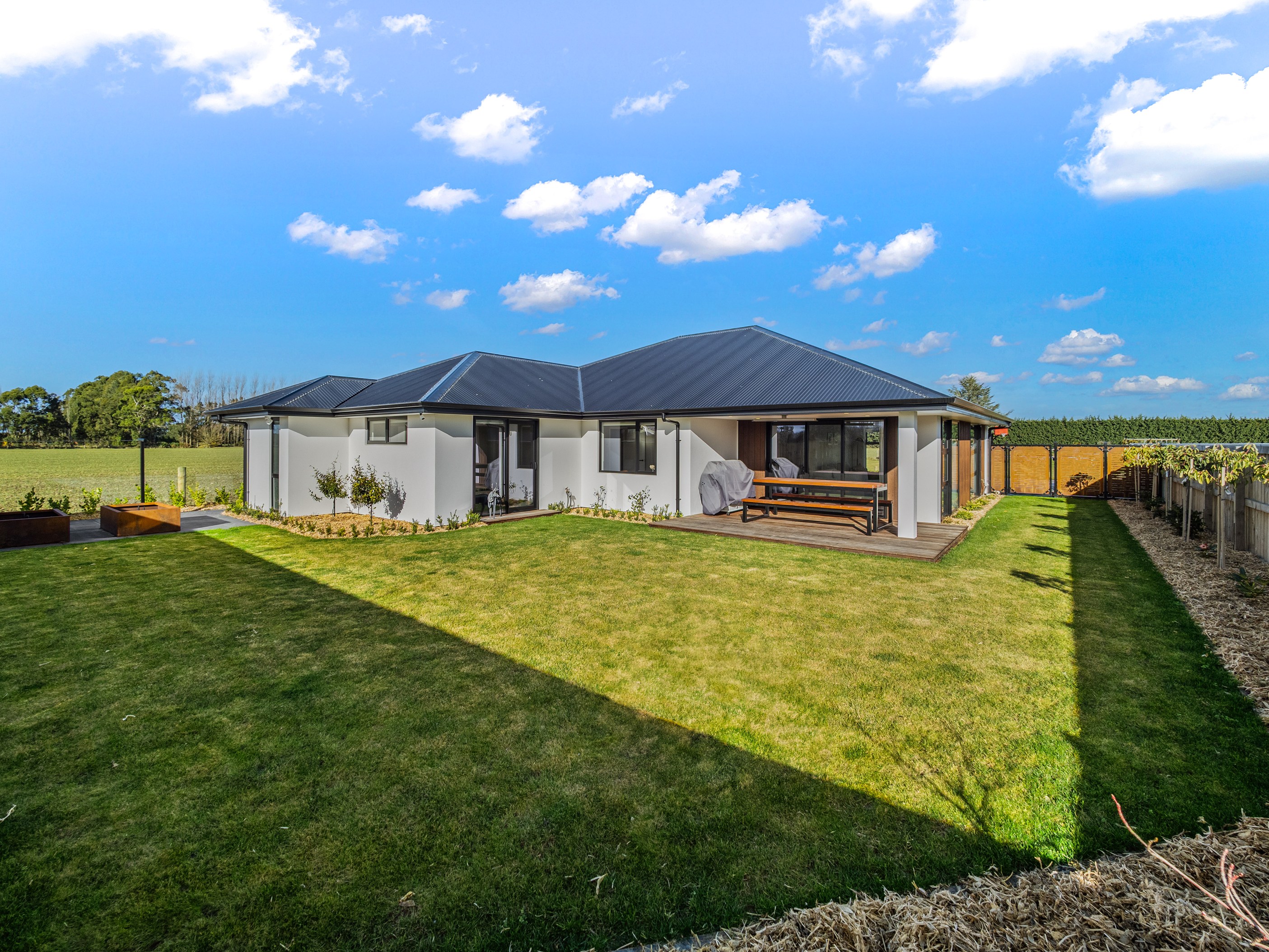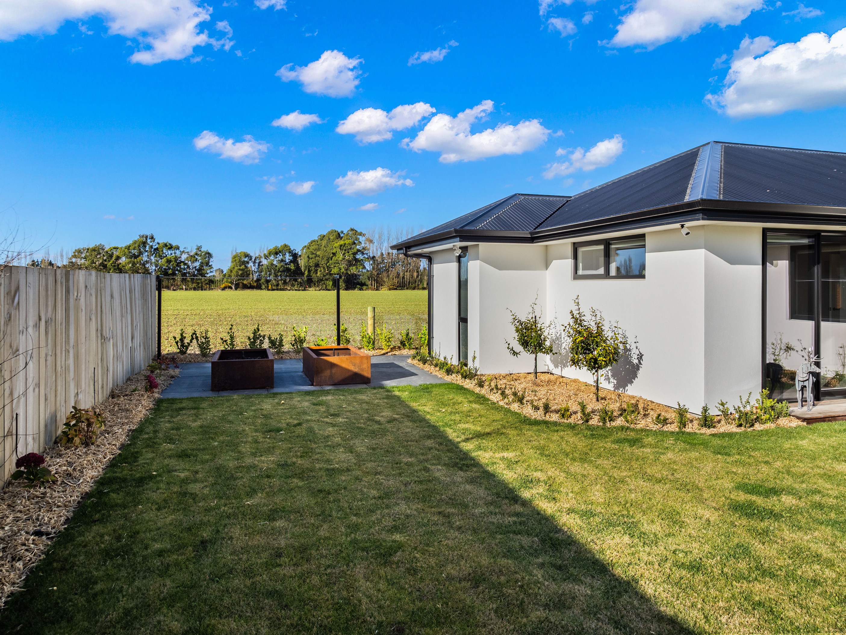 On the green fringes of Ashburton you’ll find a home that’s a perfect blend of contemporary design, convenience and extras tailored to the owners’ needs. One such client amenity is a carpeted triple garage that has oodles of storage for toys, vehicles, projects and more. To the house proper and the jewel of the crown the open-plan dining and living spaces, which arc around the sleek white kitchen. In fact, white is the consummate canvas for furniture, furnishings and the owners special pieces throughout the 233sqm three-bedroom home. These include russet-coloured dining chairs and bar stools, framed art, photographs and timber furniture. Expansive glazing, including sliding doors, allows green views to flood into this zone.