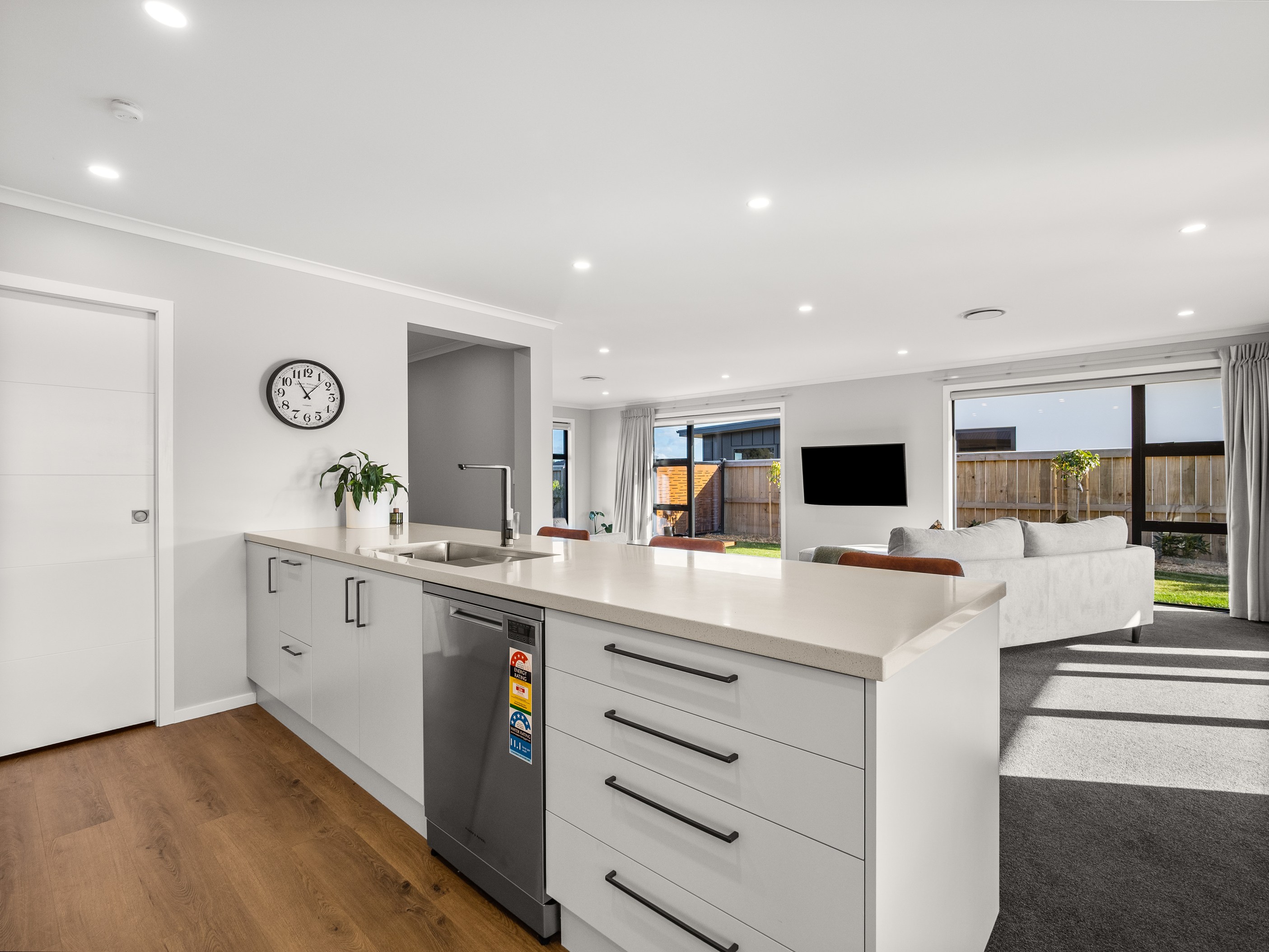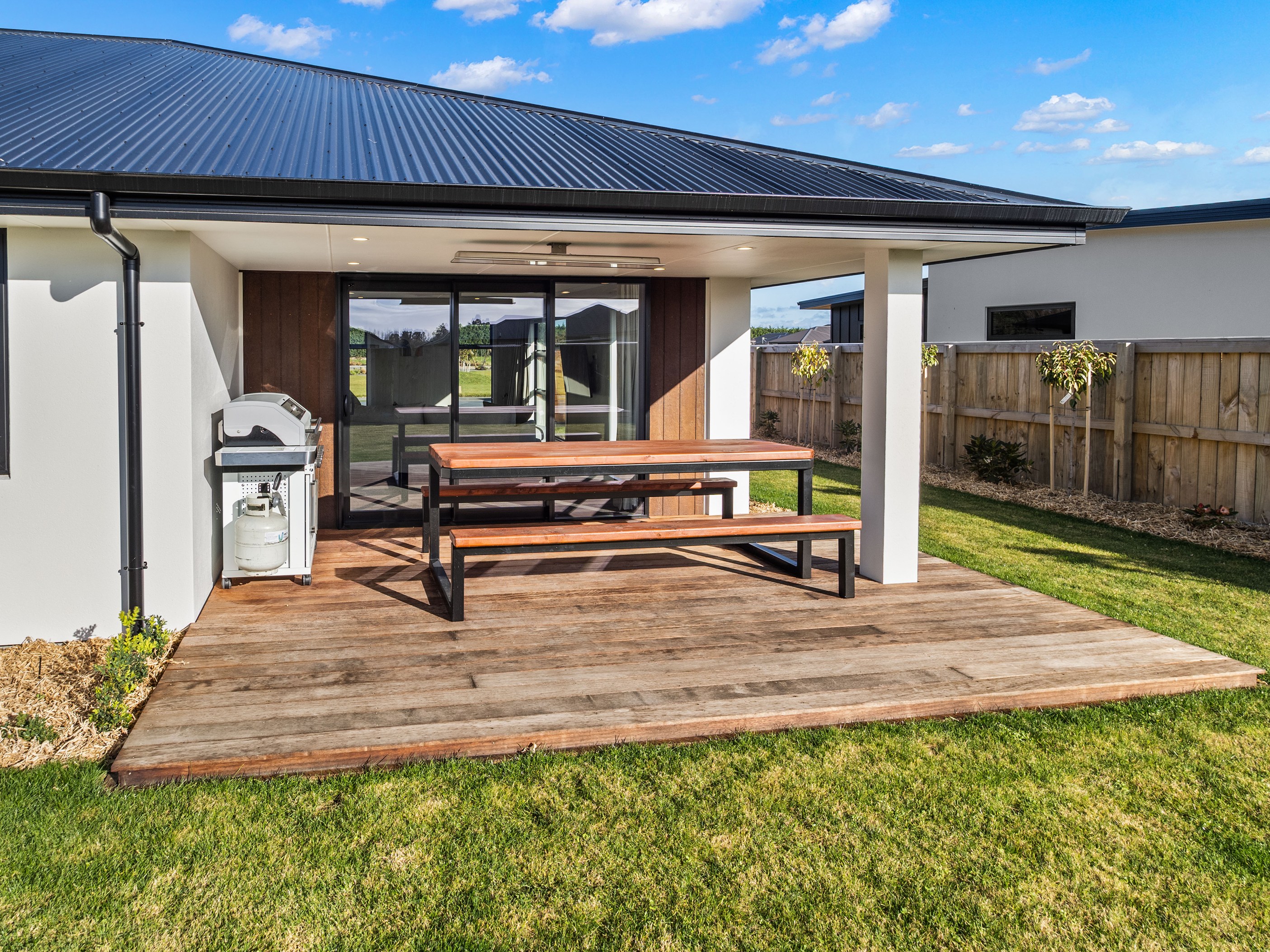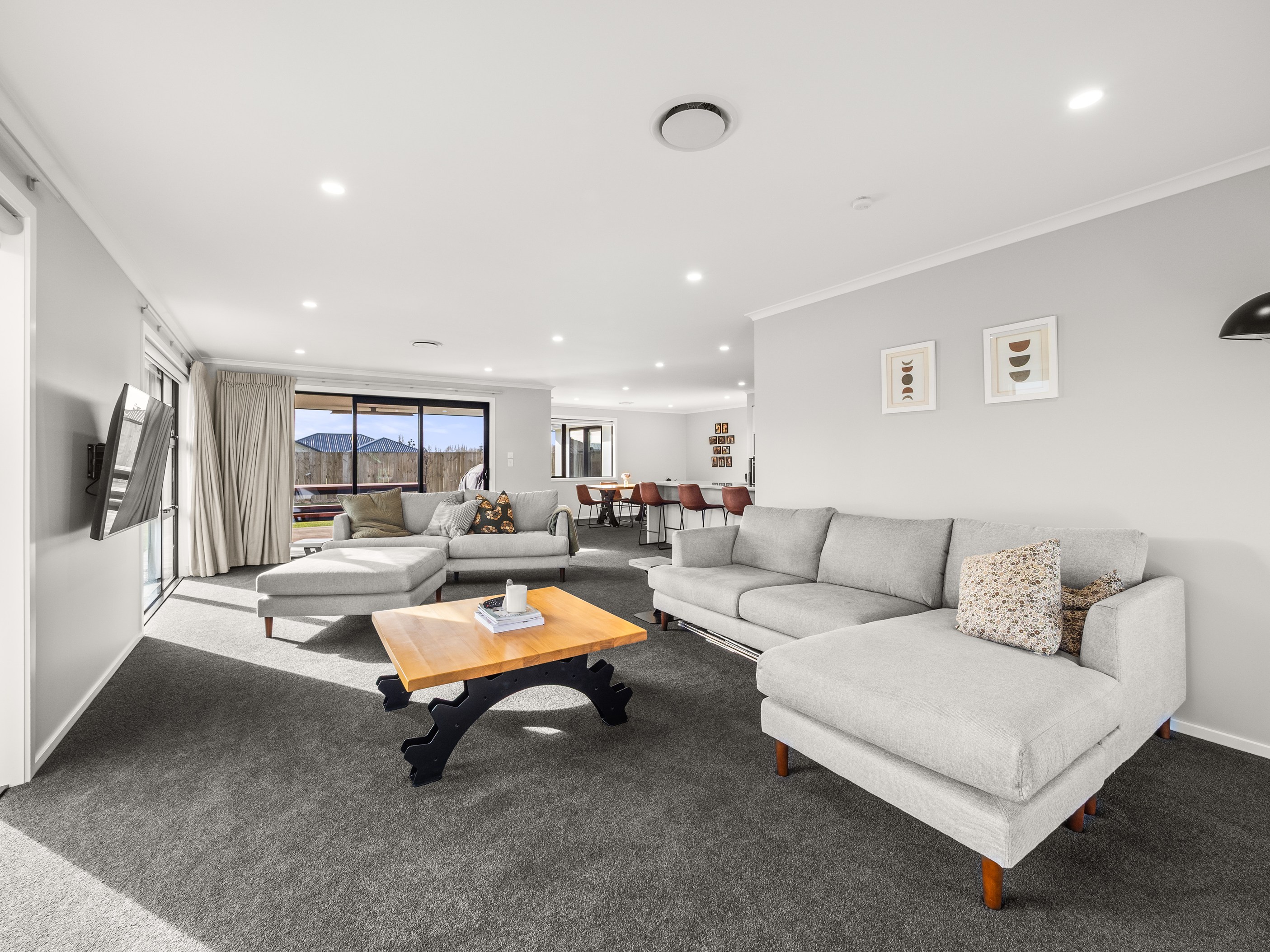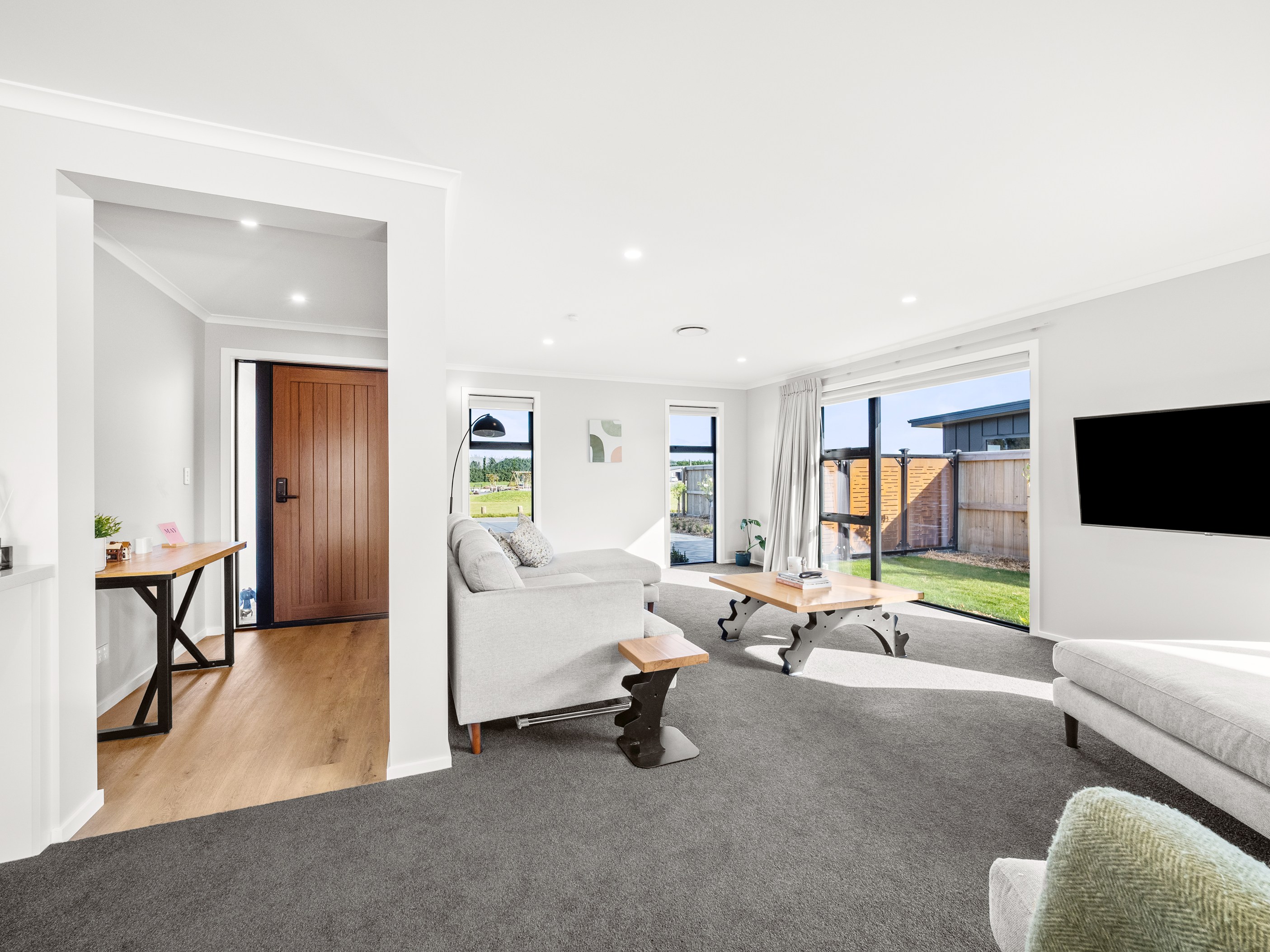 On the green fringes of Ashburton you’ll find a home that’s a perfect blend of contemporary design, convenience and extras tailored to the owners’ needs. One such client amenity is a carpeted triple garage that has oodles of storage for toys, vehicles, projects and more. To the house proper and the jewel of the crown the open-plan dining and living spaces, which arc around the sleek white kitchen. In fact, white is the consummate canvas for furniture, furnishings and the owners special pieces throughout the 233sqm three-bedroom home. These include russet-coloured dining chairs and bar stools, framed art, photographs and timber furniture. Expansive glazing, including sliding doors, allows green views to flood into this zone.