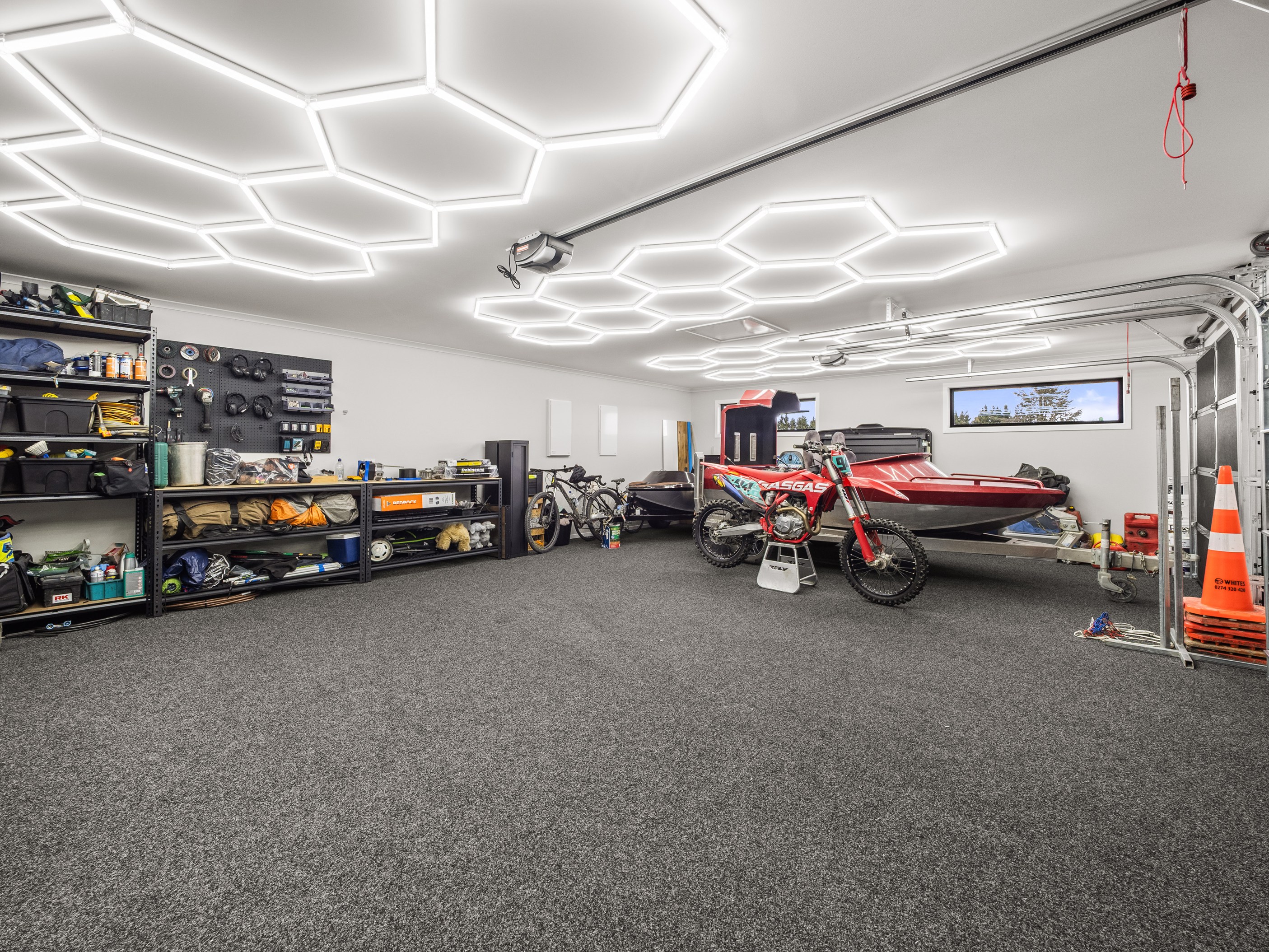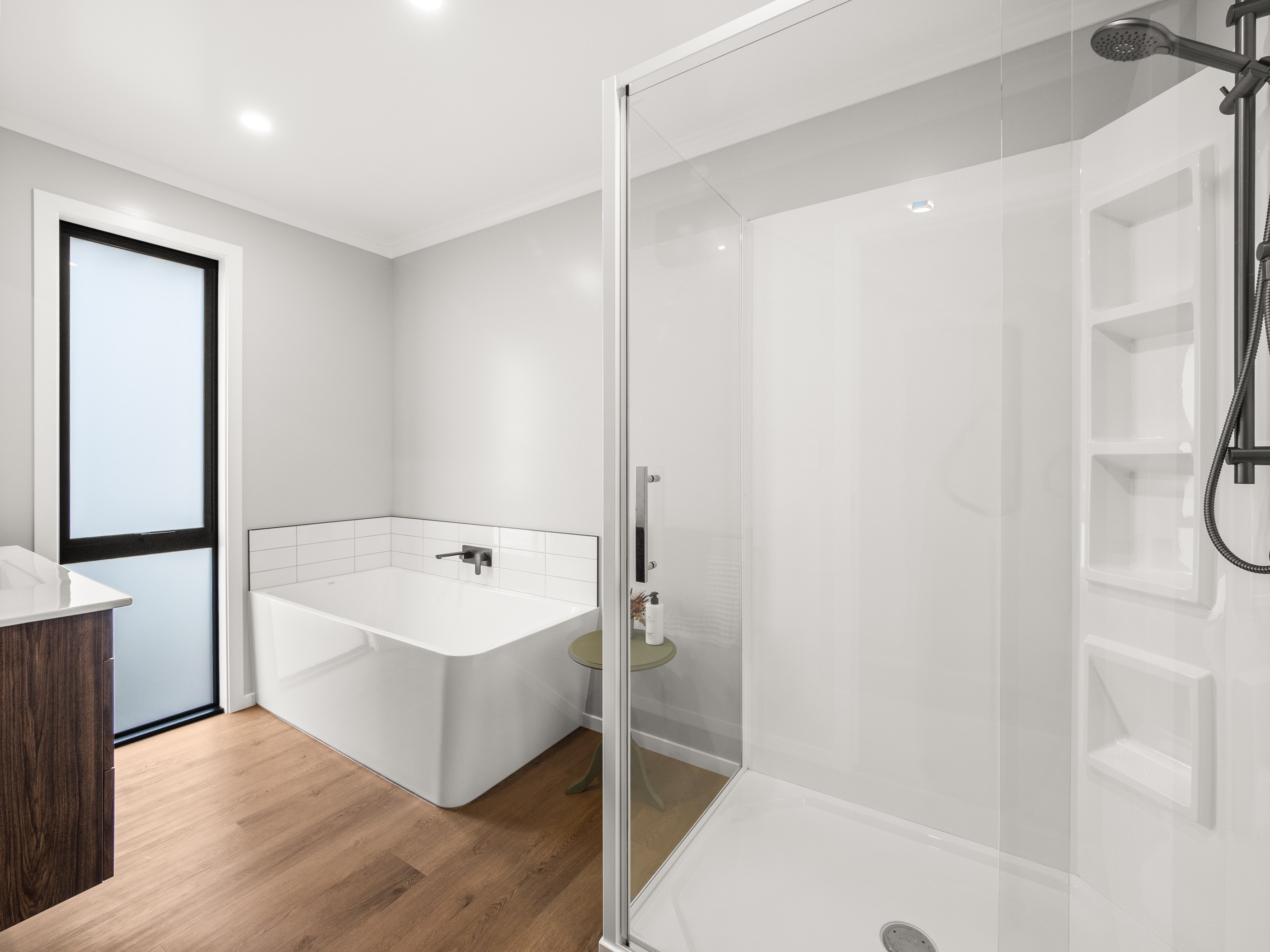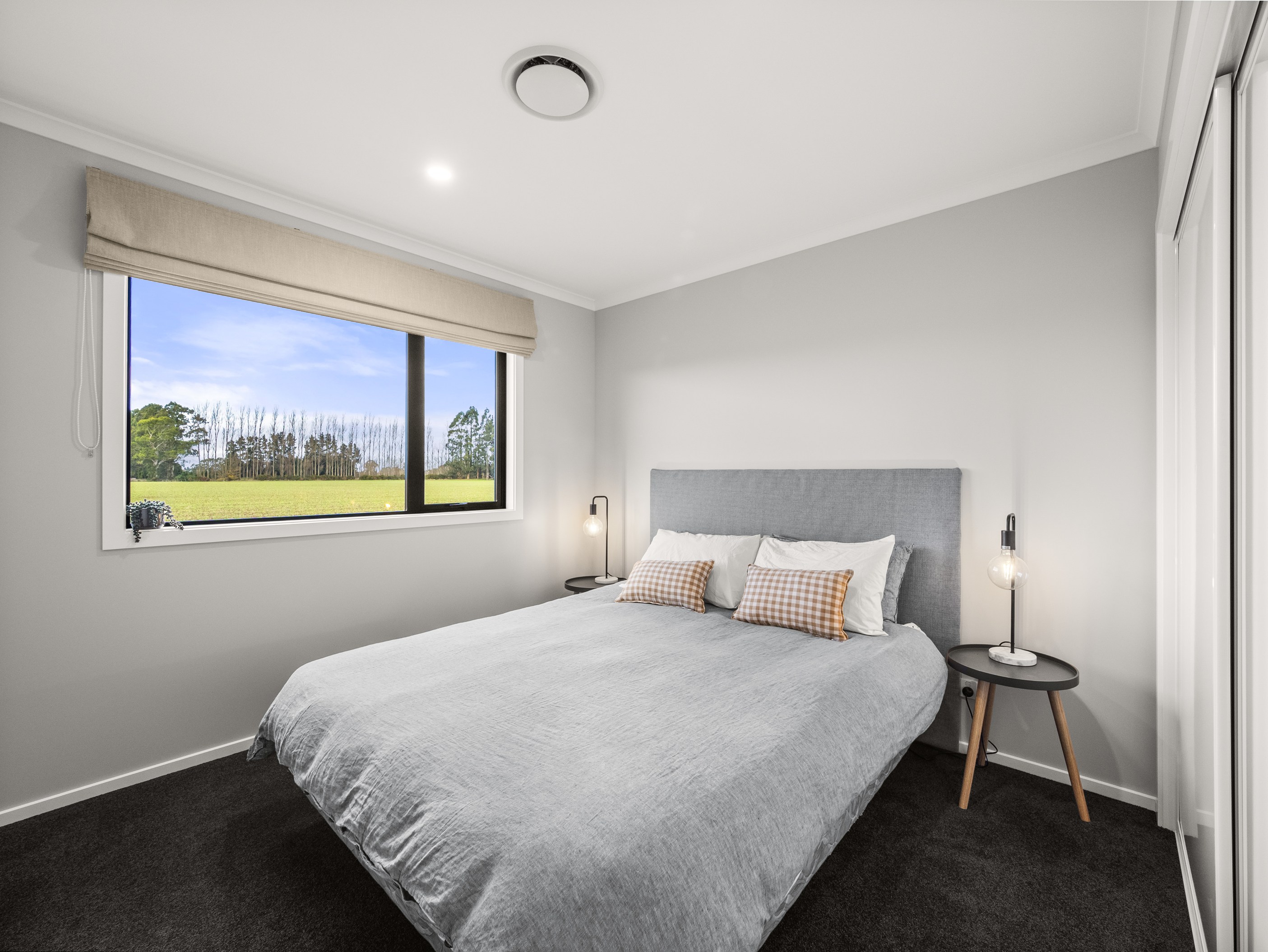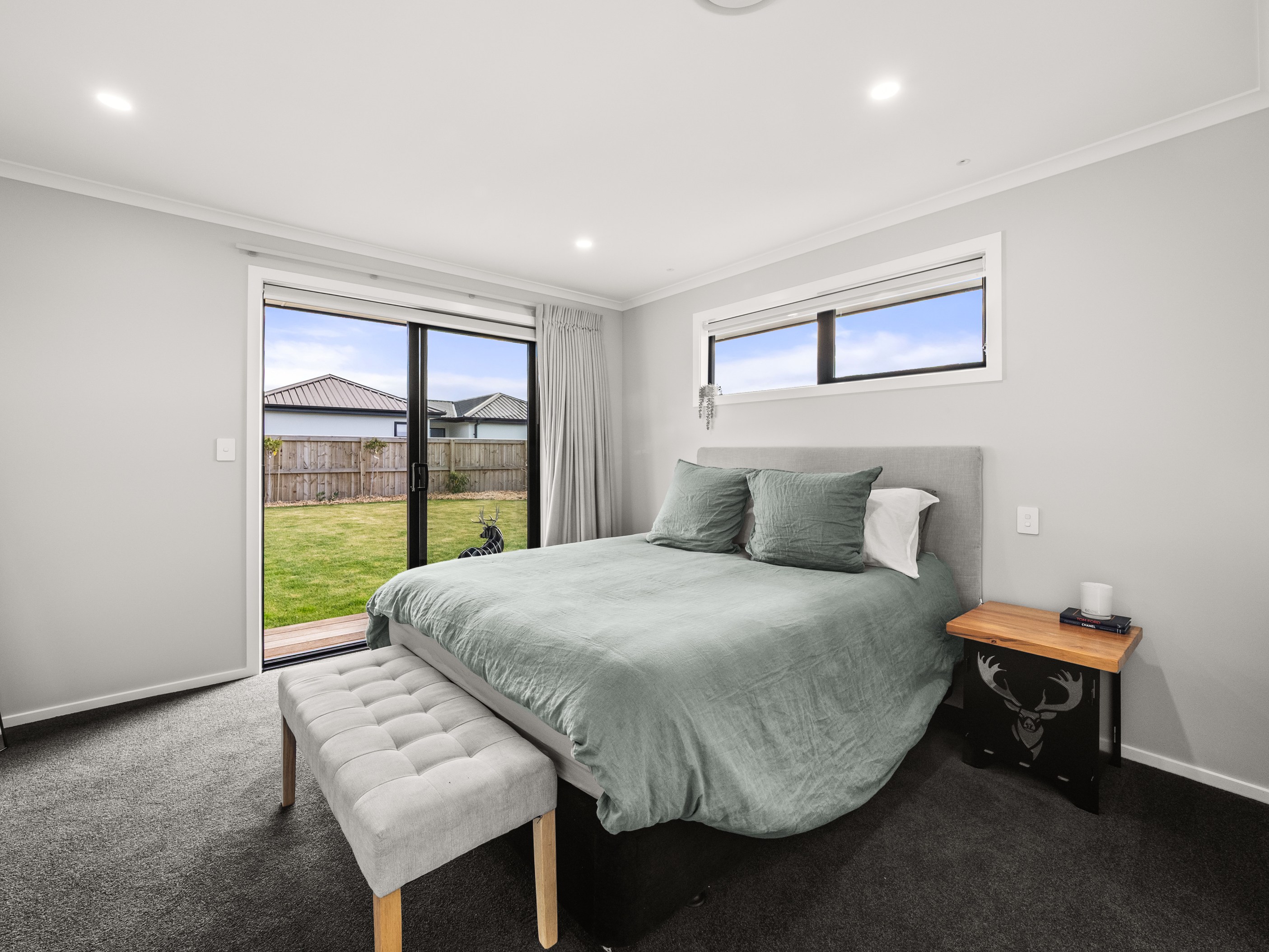 On the green fringes of Ashburton you’ll find a home that’s a perfect blend of contemporary design, convenience and extras tailored to the owners’ needs. One such client amenity is a carpeted triple garage that has oodles of storage for toys, vehicles, projects and more. To the house proper and the jewel of the crown the open-plan dining and living spaces, which arc around the sleek white kitchen. In fact, white is the consummate canvas for furniture, furnishings and the owners special pieces throughout the 233sqm three-bedroom home. These include russet-coloured dining chairs and bar stools, framed art, photographs and timber furniture. Expansive glazing, including sliding doors, allows green views to flood into this zone.