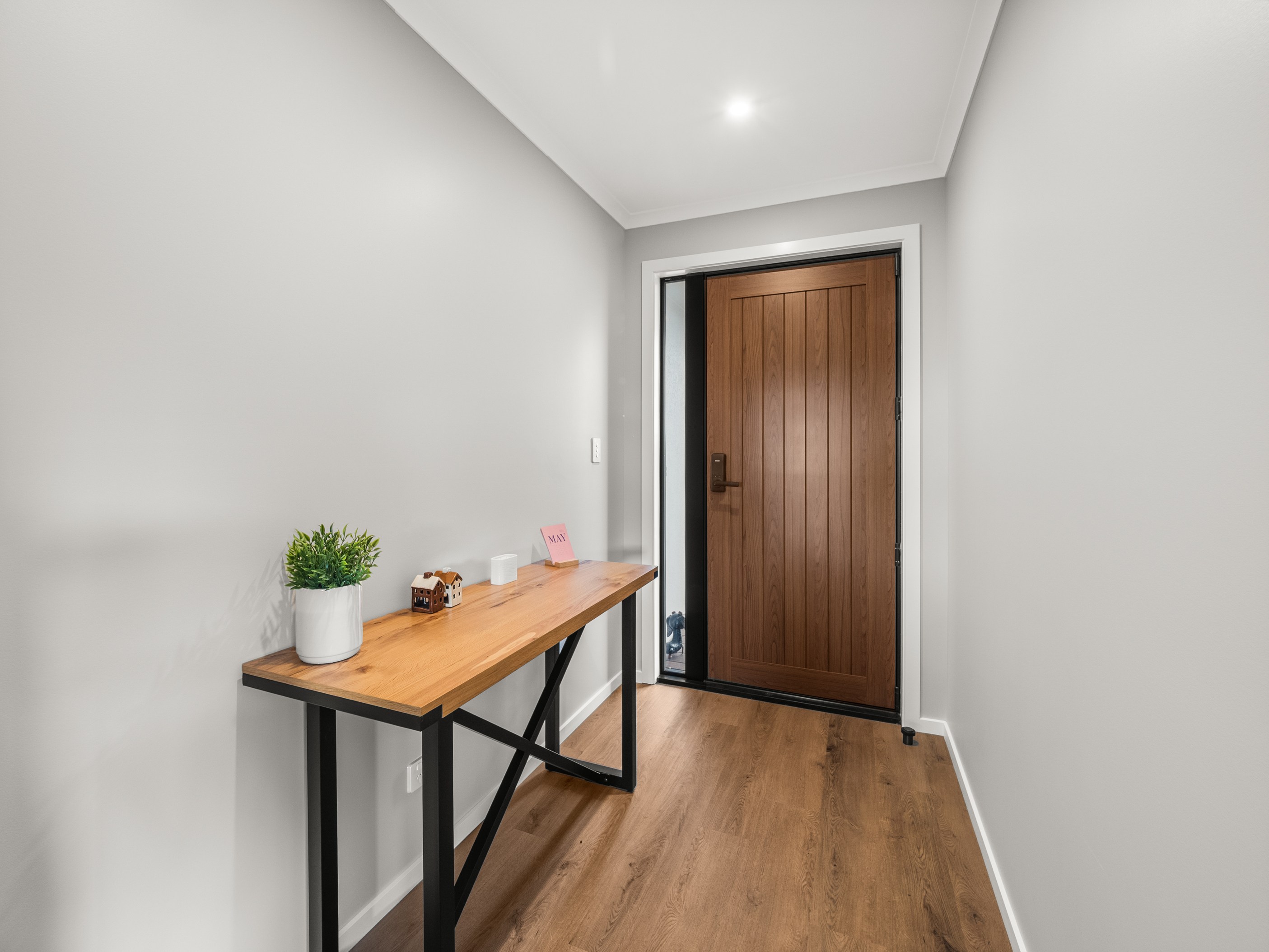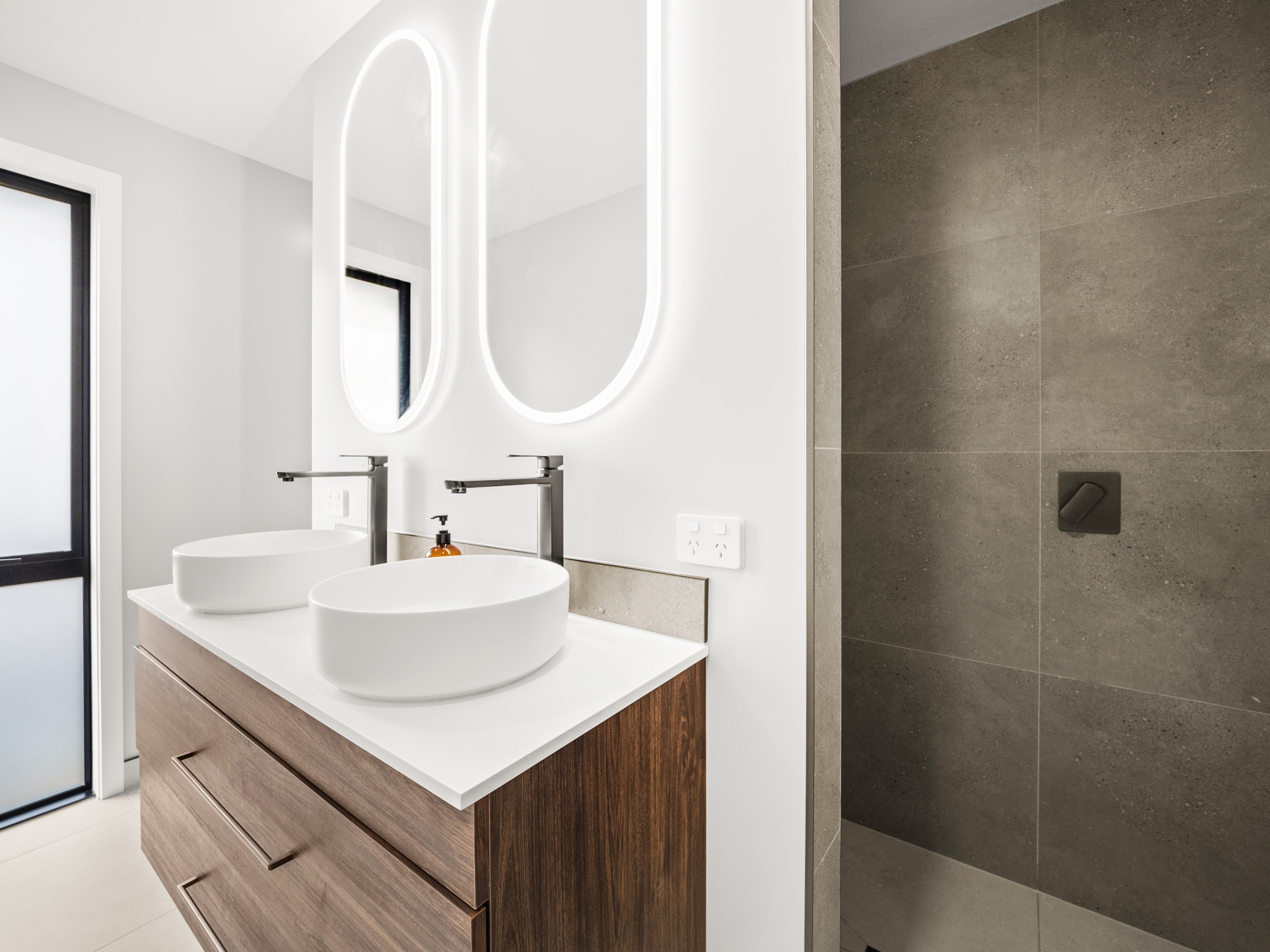 Step outdoors and onto a covered area that takes up an entire corner of the floorplan. The living is easy when it spills from the family and dining spaces out to the decking. Alfresco dining and sipping is always on the menu. The main-bedroom suite has a couple of notable additions: a walk-in wardrobe and a stylish ensuite. The home also has two more well-proportioned bedrooms, a family bathroom, powder room and that must-have for working from home — an office. The harmonious design and sleek finishes extend to the exterior of the house, which is clad in dapper white plaster trimmed with timber-look panels. This is modern living at its finest.