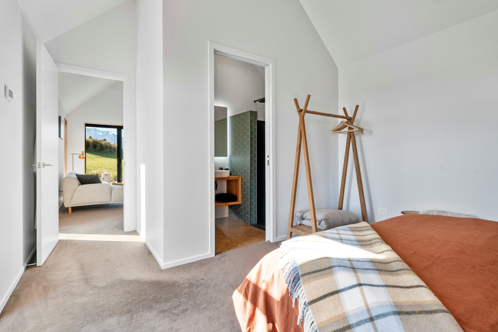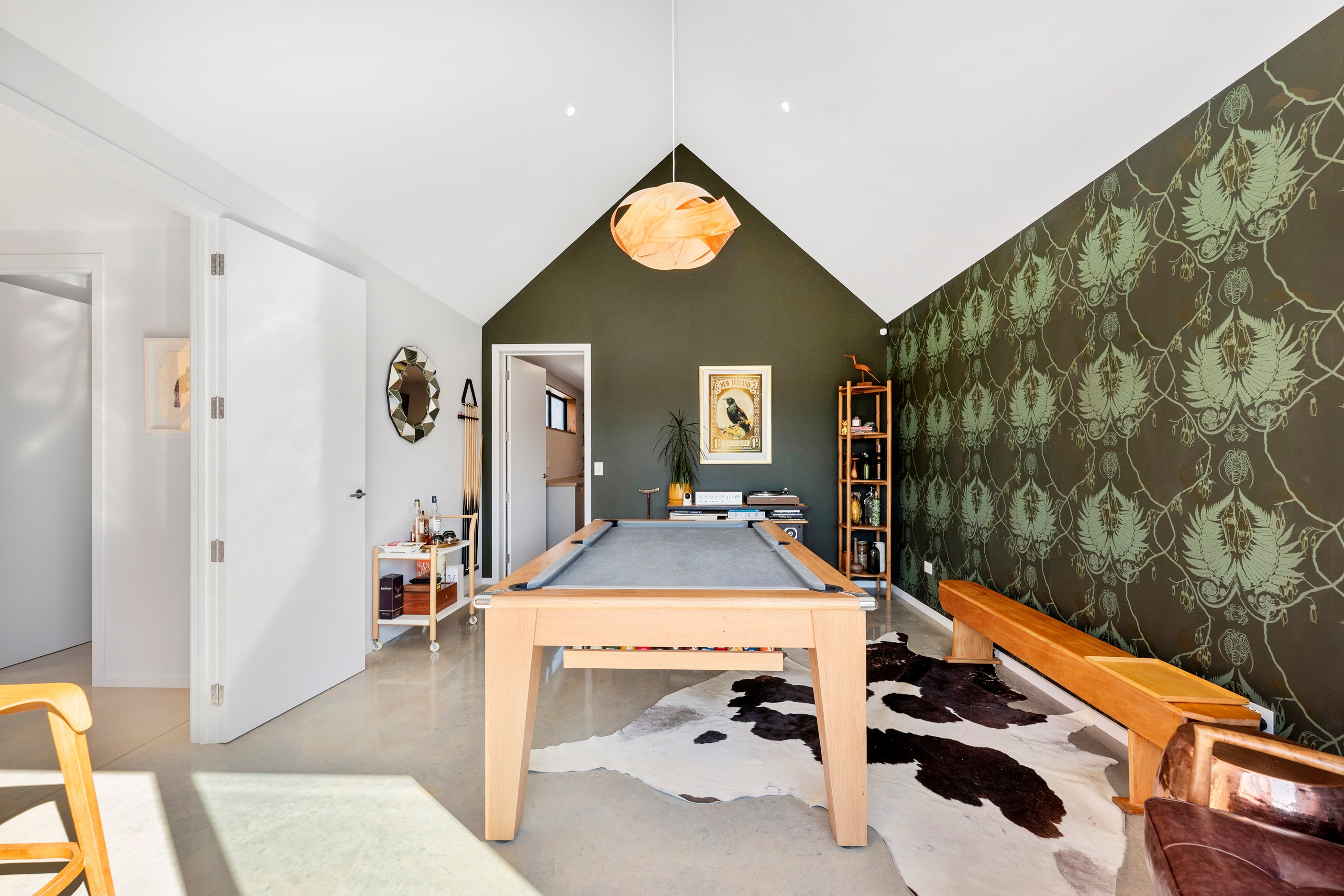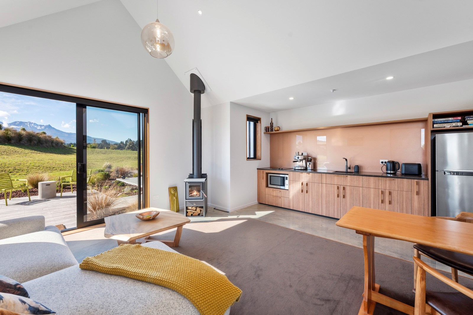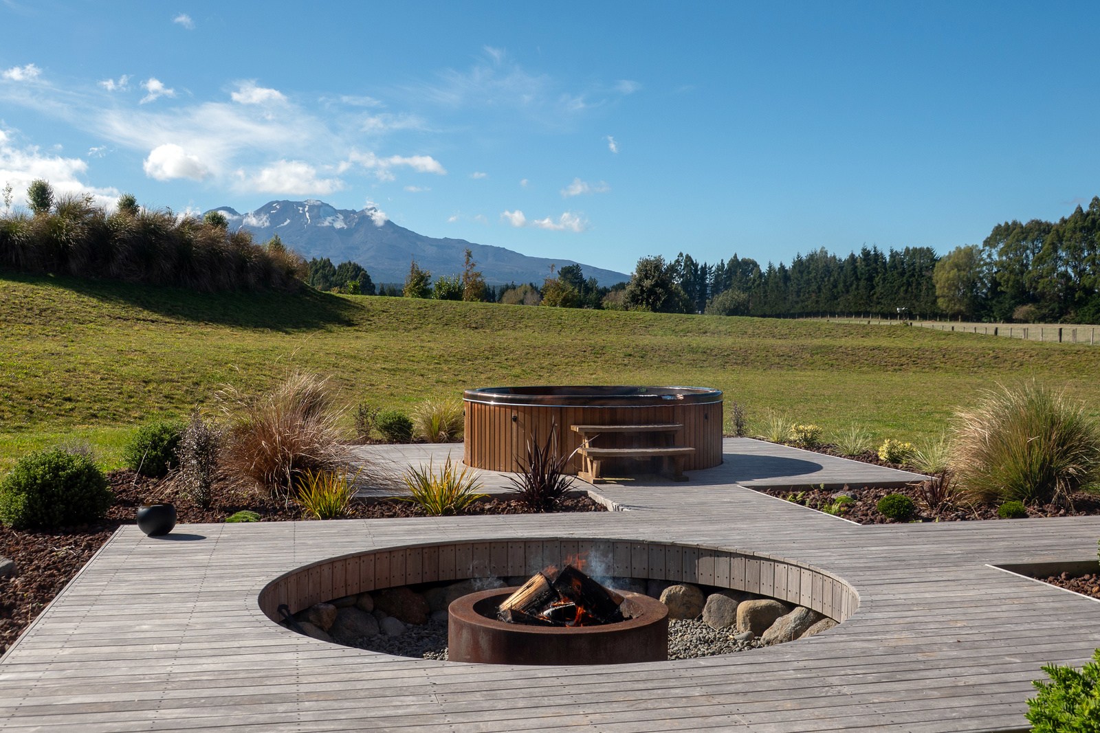 With four bedrooms, three bathrooms and a large open-plan communal space spread throughout the 315sqm floorplan, and three pavilions, there’s much to explore. On the ground floor, the kitchen spills into dining and living spaces which, in turn, open to a media room, as well as a verandah and patio. On this floor, you’ll find another lounge, office, utility room, powder room and a bedroom with ensuite. Head upstairs and three more bedrooms and a bathroom stretch along the elongated upper floor. Naturally, the main bedroom has a walk-in wardrobe and ensuite. In a property that’s an all-round achiever, the outdoor zone is a standout. Timber decking flows from the house, past a firepit and terminates just past a spa pool. Bliss under the mountain and starry night skies.