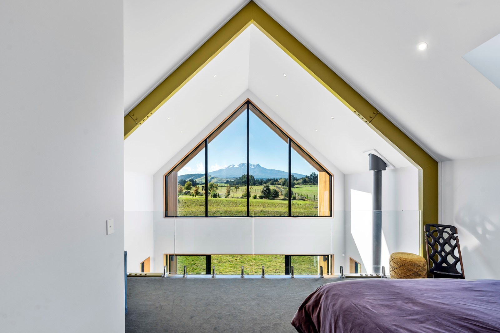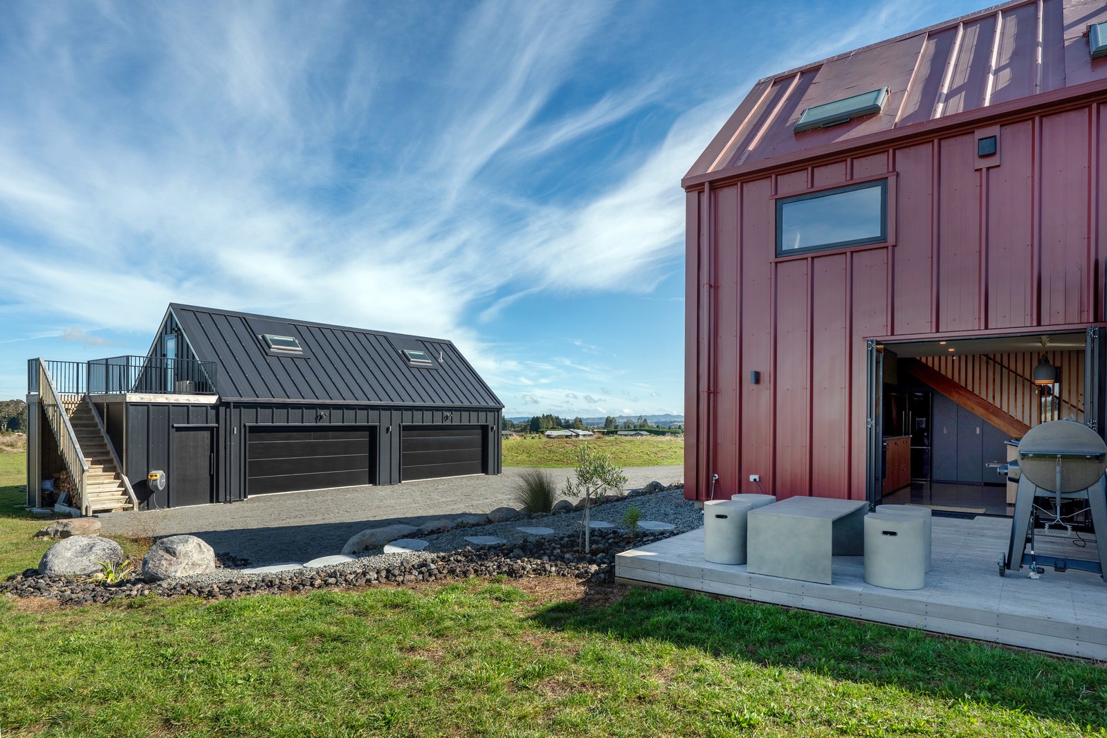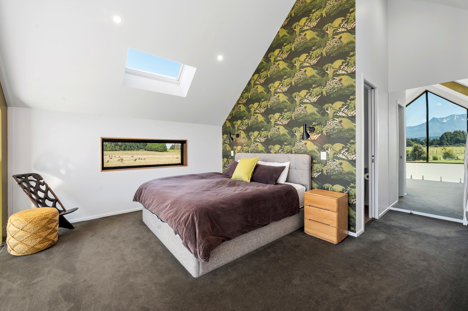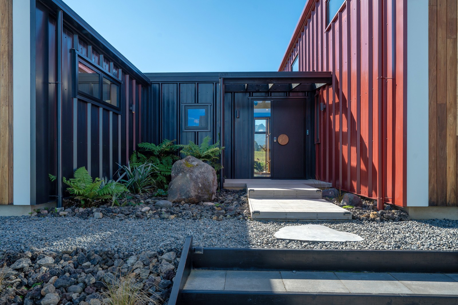 Could this striking Central Plateau house beneath Mt Ruapehu’s foothills look any more at home? With its colour palette and three barn-shaped linked pavilions in vertical timber and metal cladding, the house appears totally at ease in its environs. While the exterior is a nod to rural Aotearoa New Zealand, the interior is all about light, colour, playful decor and every modern convenience. You’ll find widespread glazing, including clerestory windows, skylights and sliding doors; painted, wallpapered and tiled feature walls; and striking timber features such as screens, built-in cabinetry and balustrades.