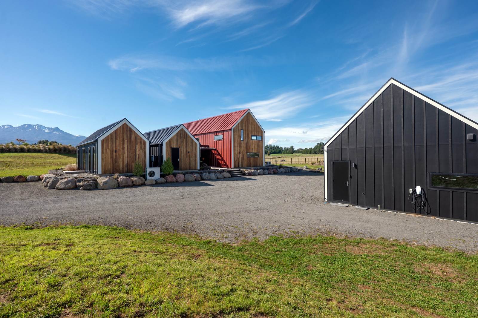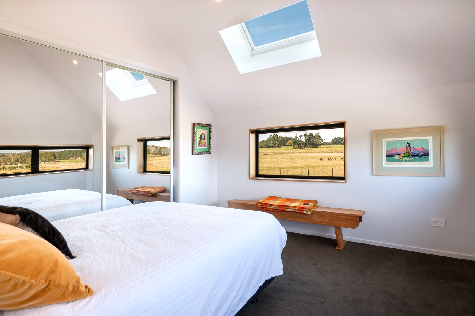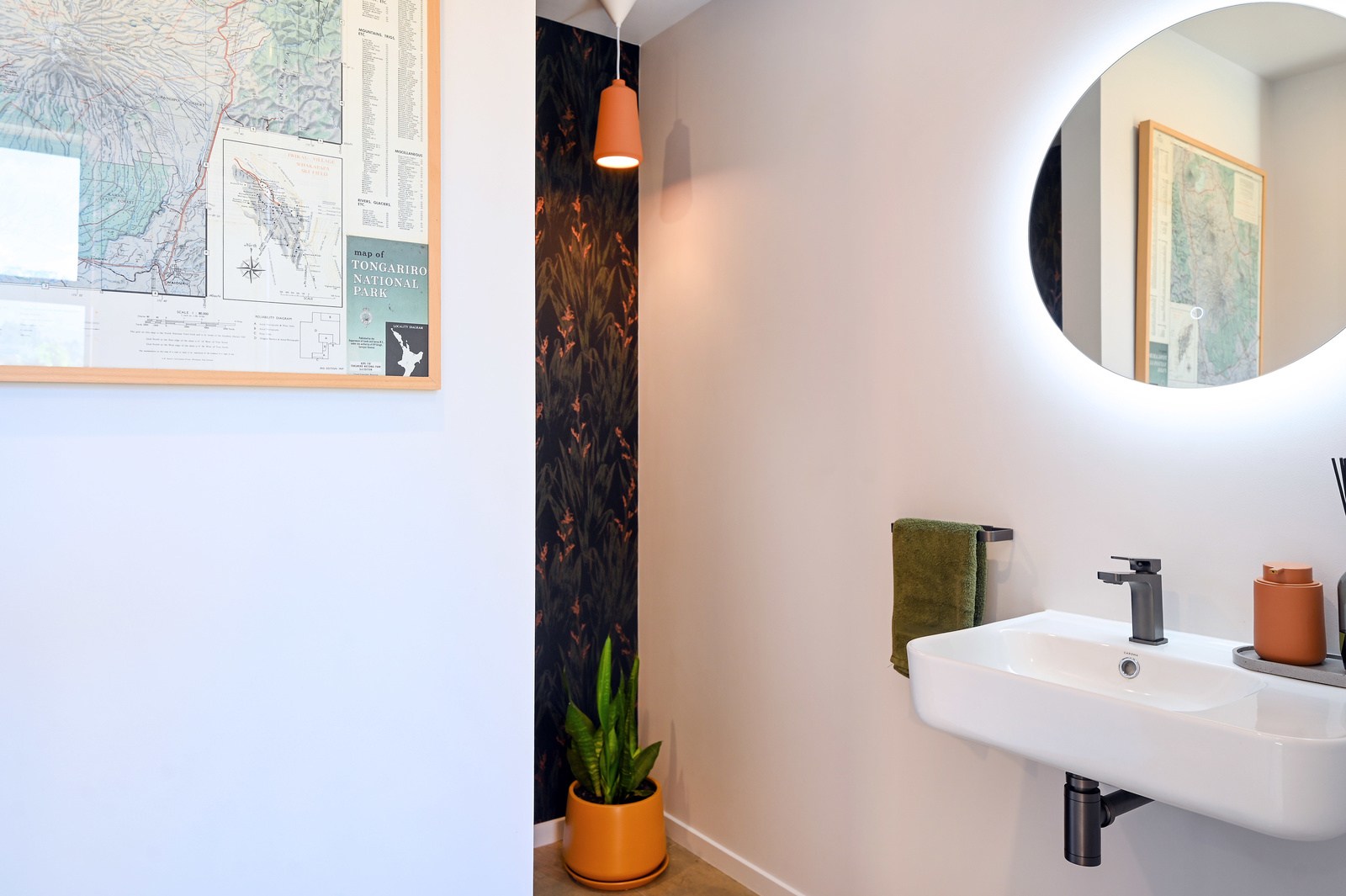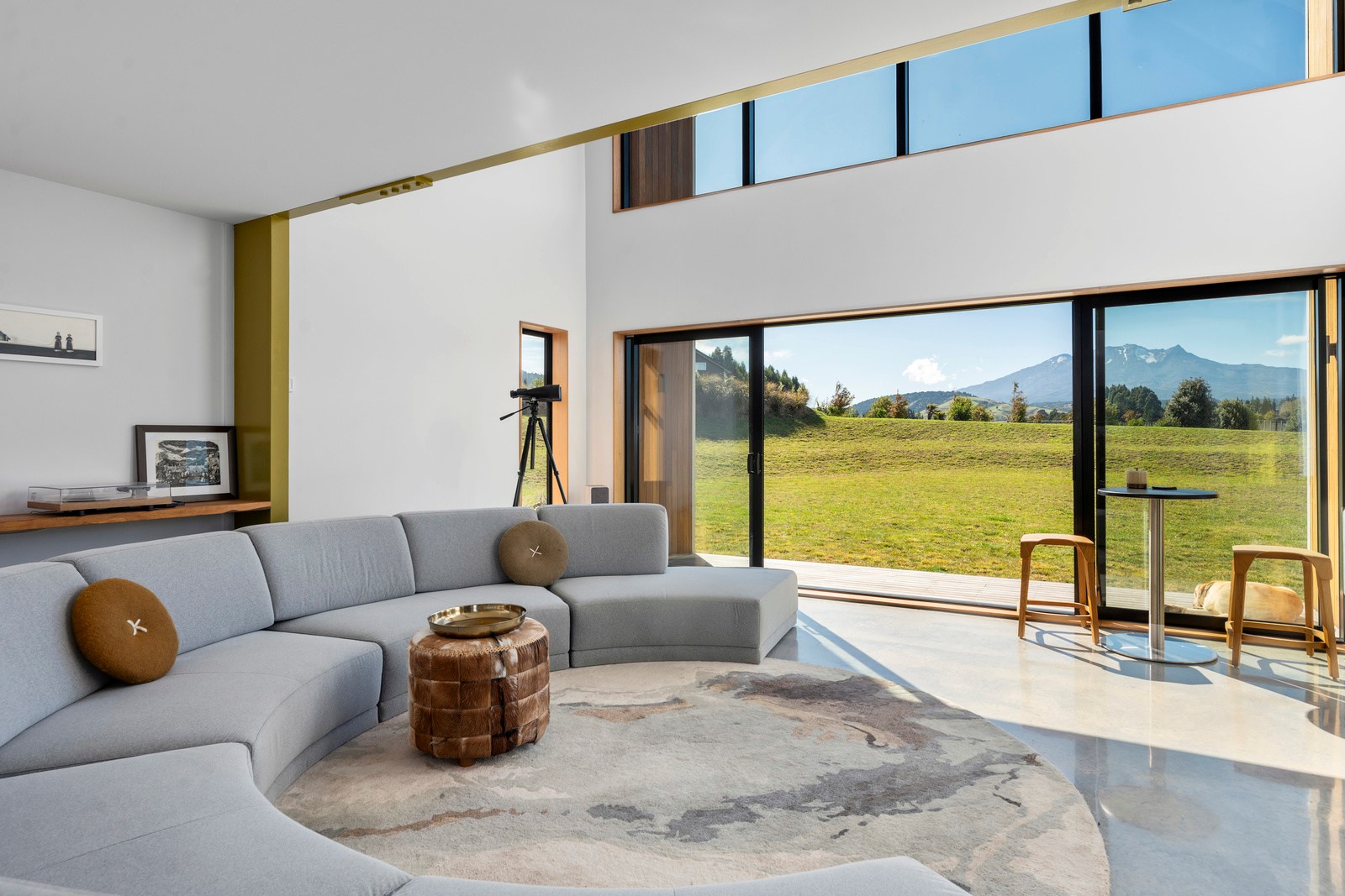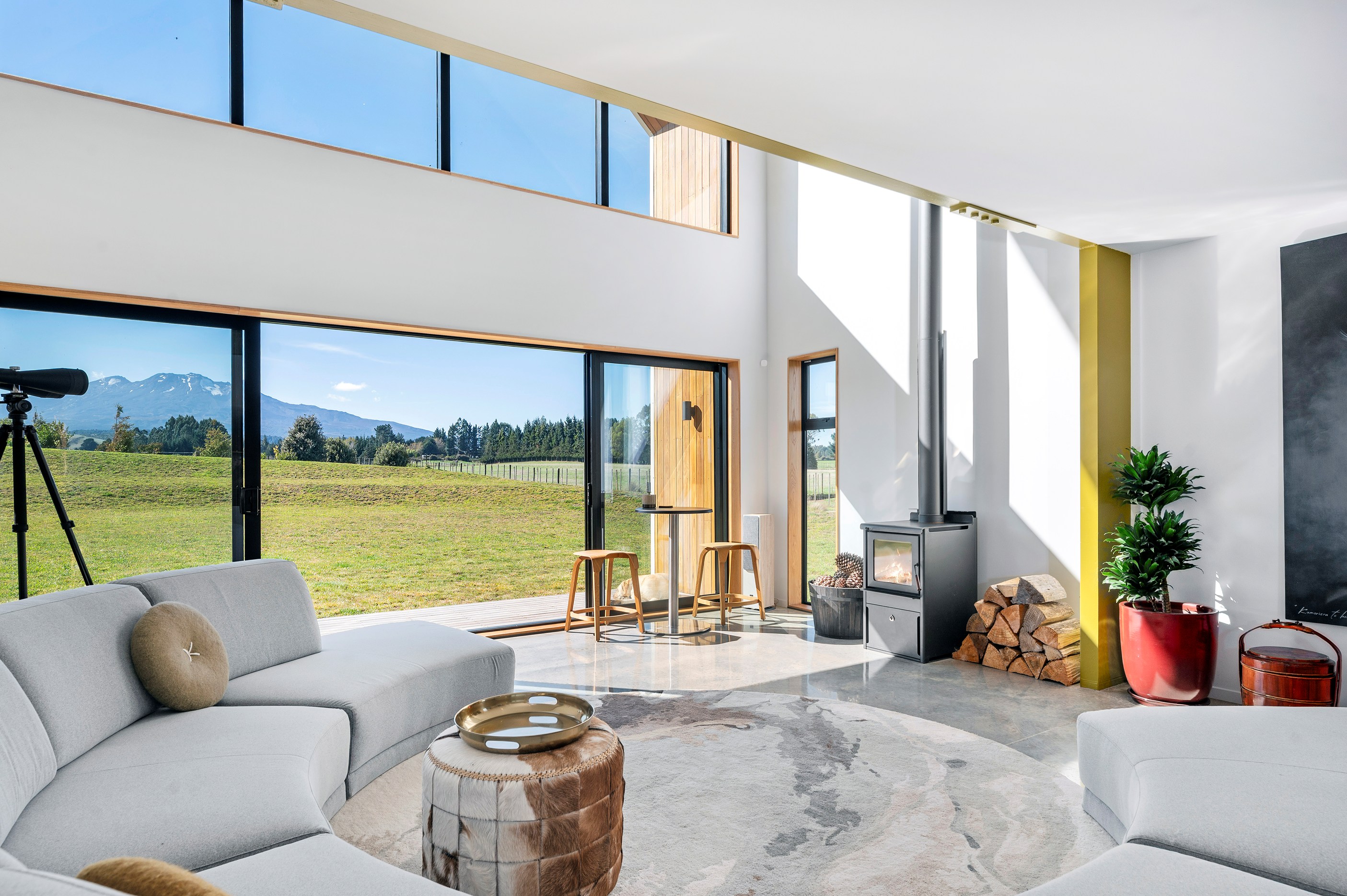 Could this striking Central Plateau house beneath Mt Ruapehu’s foothills look any more at home? With its colour palette and three barn-shaped linked pavilions in vertical timber and metal cladding, the house appears totally at ease in its environs. While the exterior is a nod to rural Aotearoa New Zealand, the interior is all about light, colour, playful decor and every modern convenience. You’ll find widespread glazing, including clerestory windows, skylights and sliding doors; painted, wallpapered and tiled feature walls; and striking timber features such as screens, built-in cabinetry and balustrades.