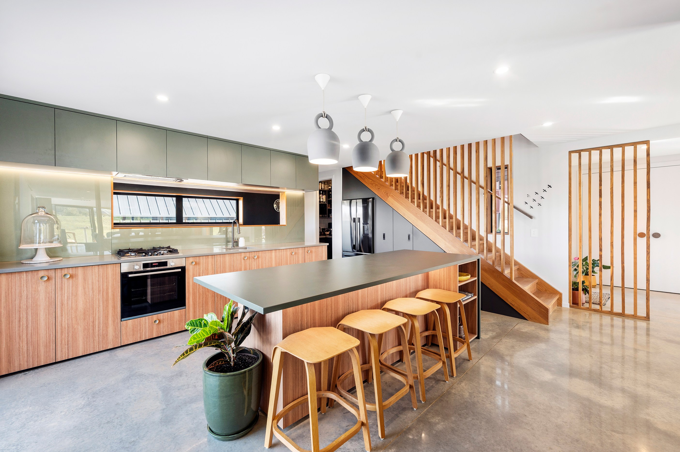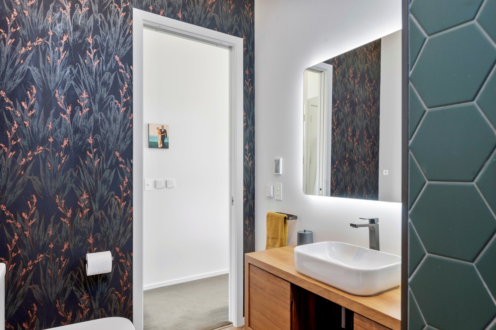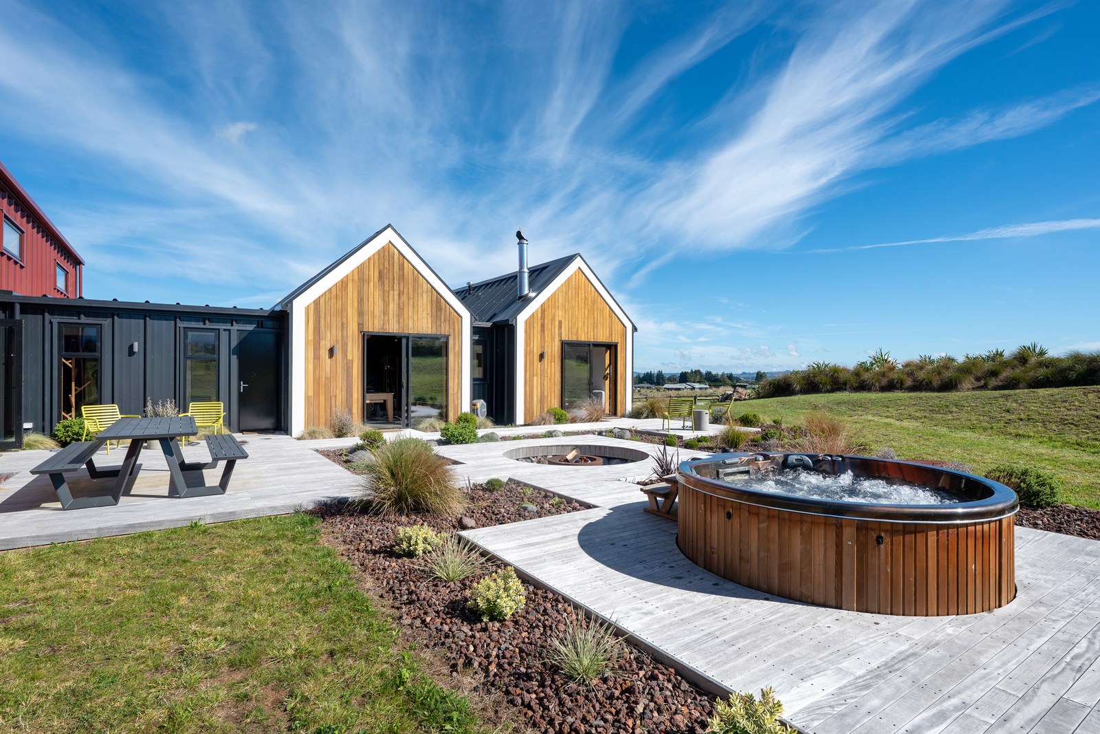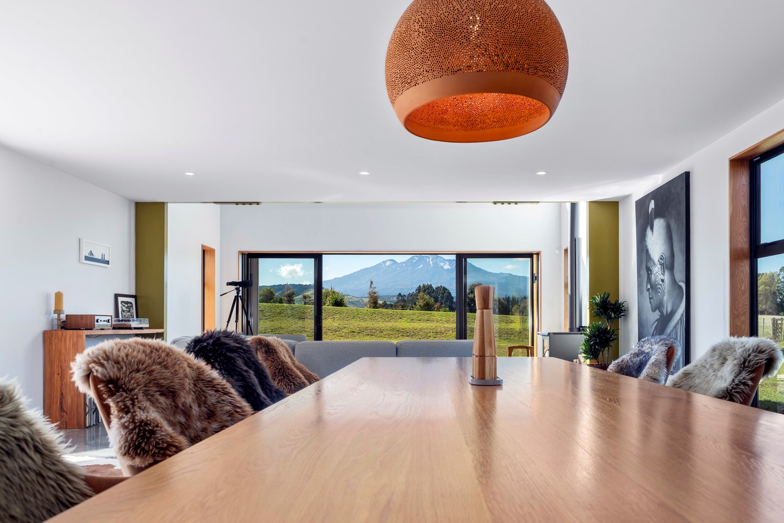 Could this striking Central Plateau house beneath Mt Ruapehu’s foothills look any more at home? With its colour palette and three barn-shaped linked pavilions in vertical timber and metal cladding, the house appears totally at ease in its environs. While the exterior is a nod to rural Aotearoa New Zealand, the interior is all about light, colour, playful decor and every modern convenience. You’ll find widespread glazing, including clerestory windows, skylights and sliding doors; painted, wallpapered and tiled feature walls; and striking timber features such as screens, built-in cabinetry and balustrades.