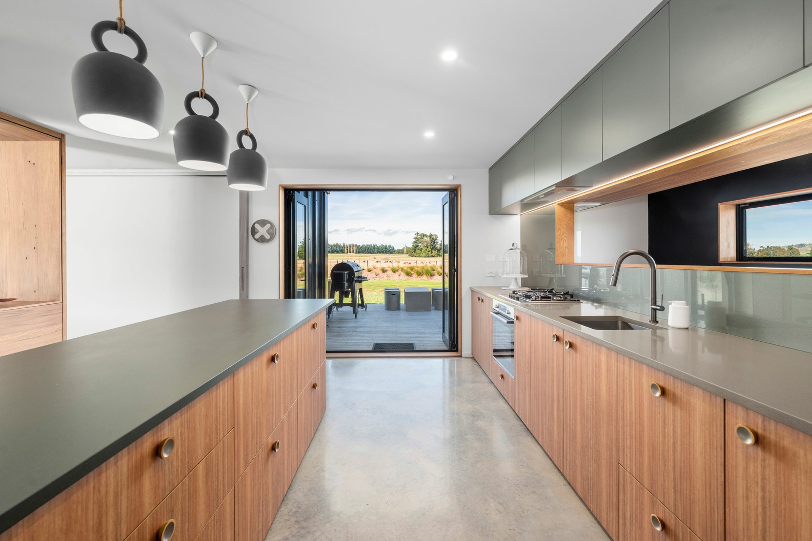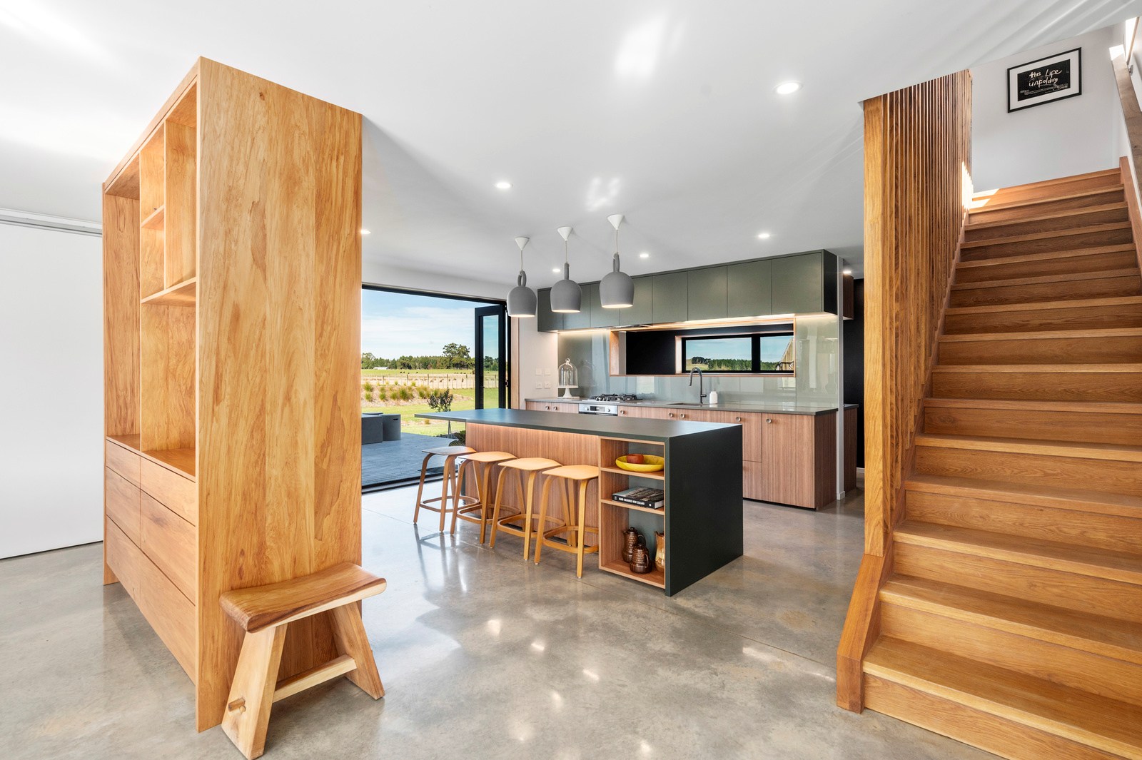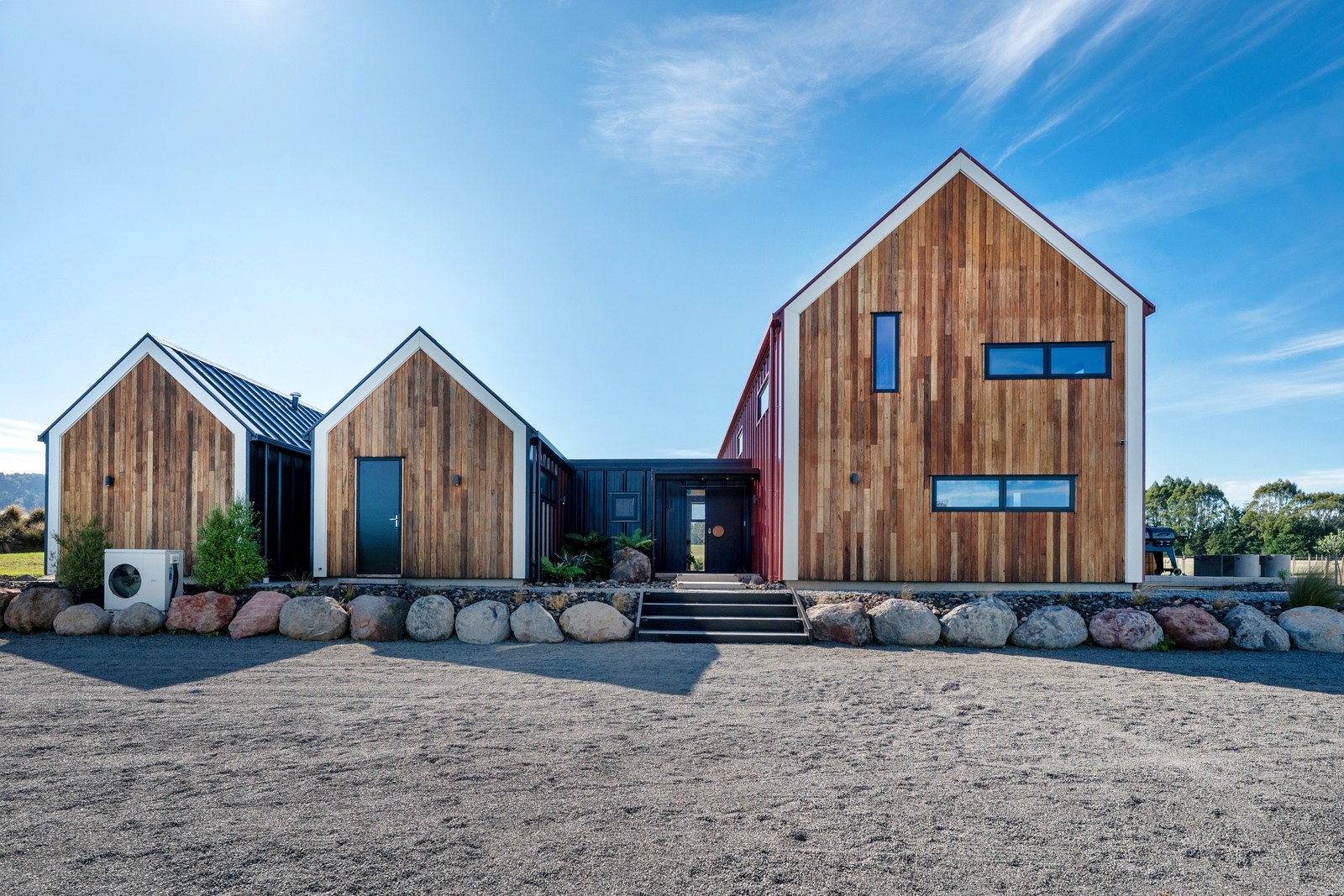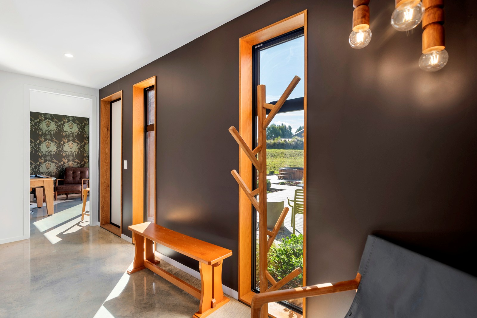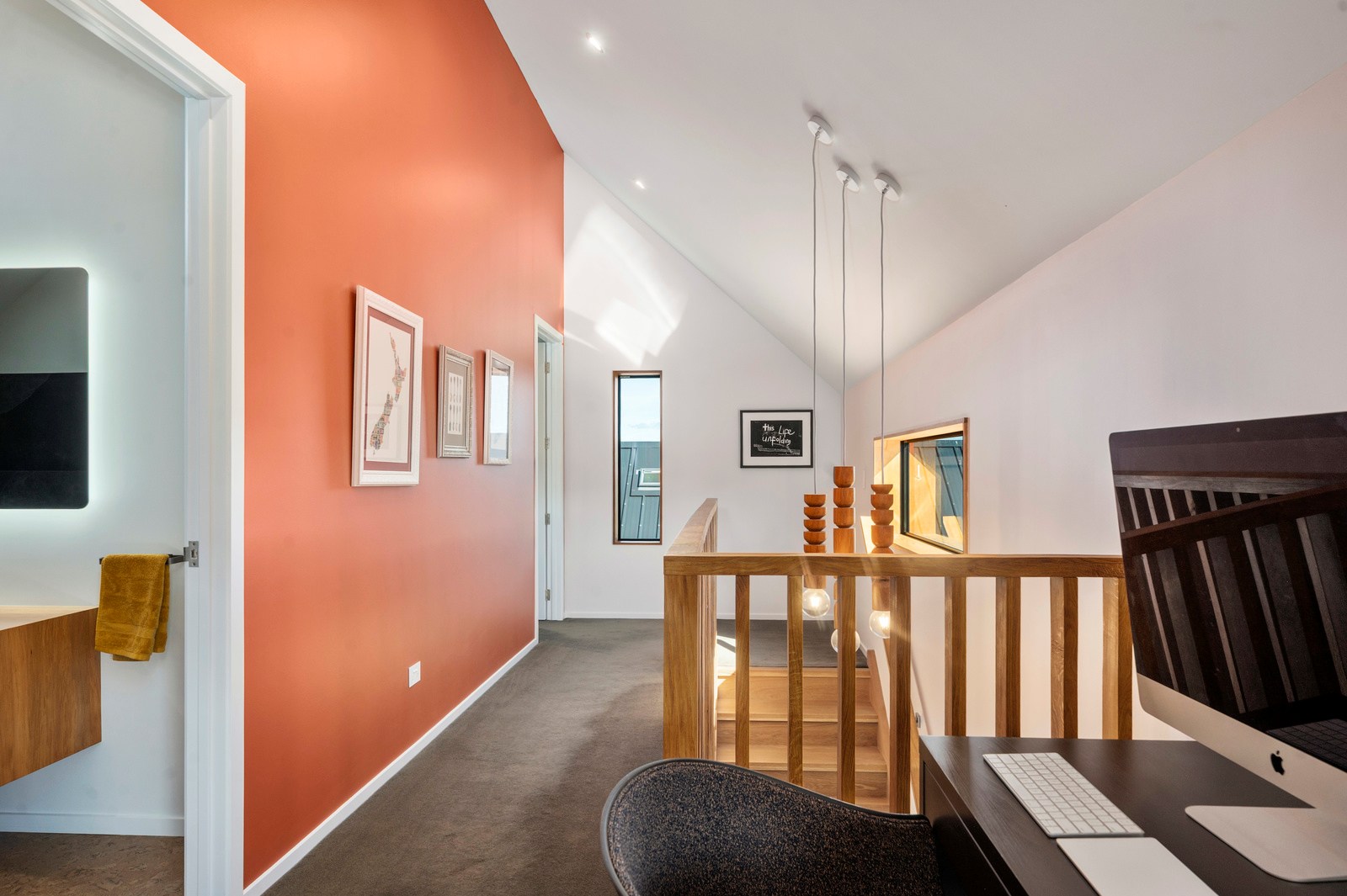 Could this striking Central Plateau house beneath Mt Ruapehu’s foothills look any more at home? With its colour palette and three barn-shaped linked pavilions in vertical timber and metal cladding, the house appears totally at ease in its environs. While the exterior is a nod to rural Aotearoa New Zealand, the interior is all about light, colour, playful decor and every modern convenience. You’ll find widespread glazing, including clerestory windows, skylights and sliding doors; painted, wallpapered and tiled feature walls; and striking timber features such as screens, built-in cabinetry and balustrades.