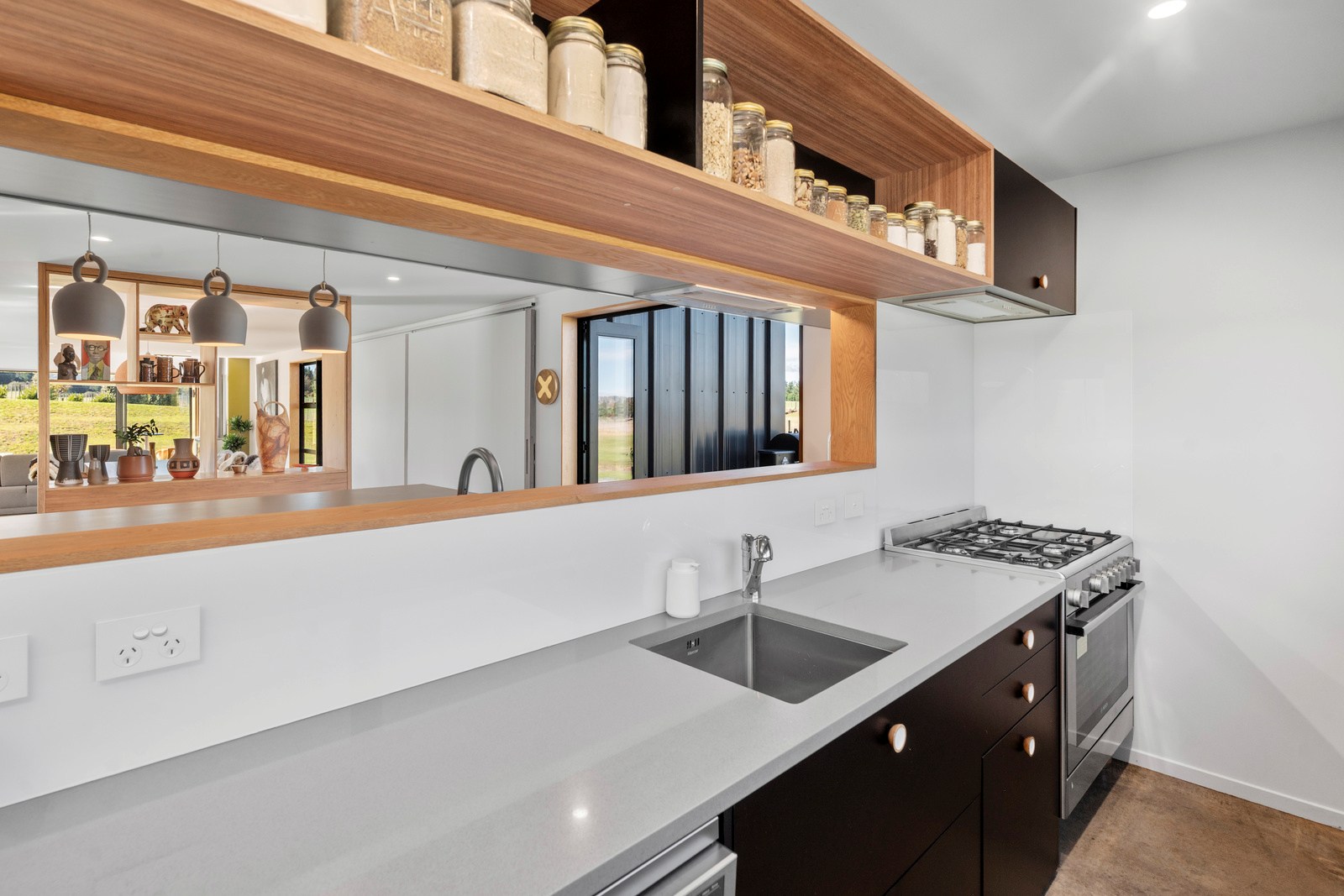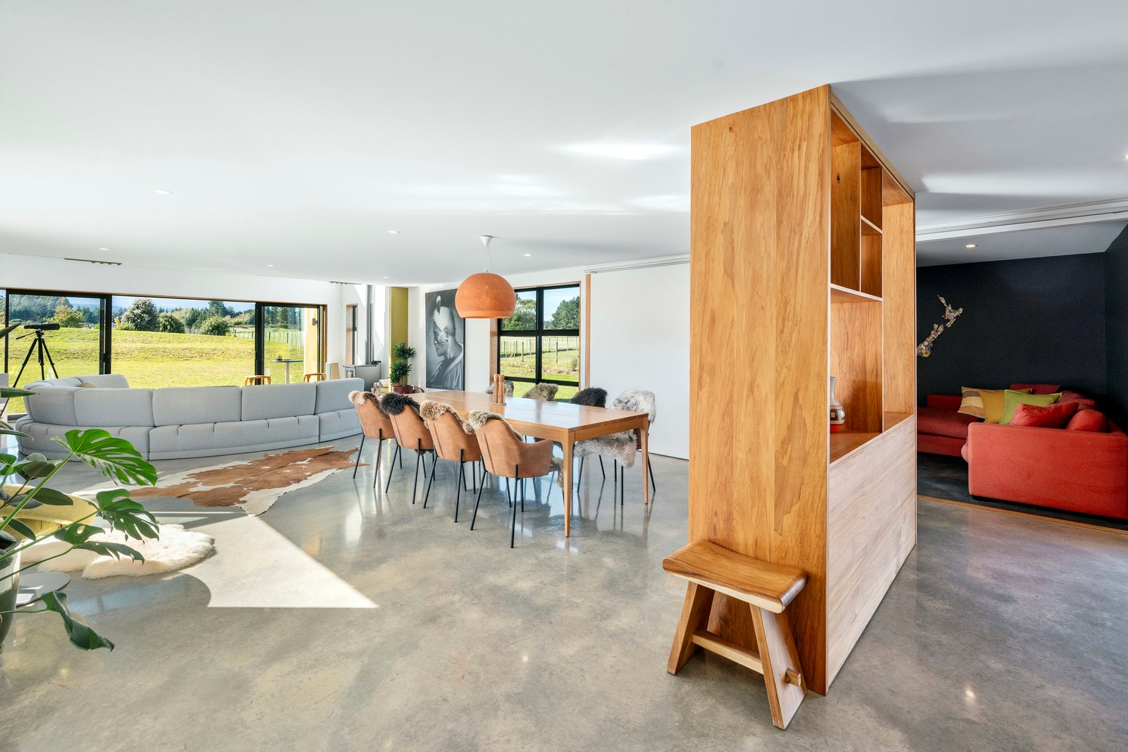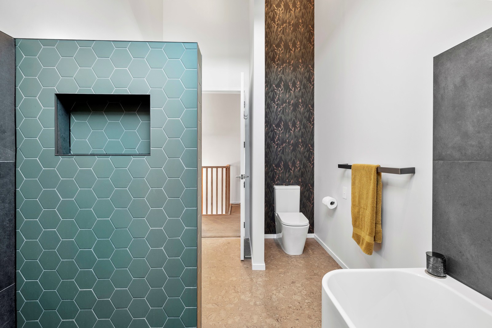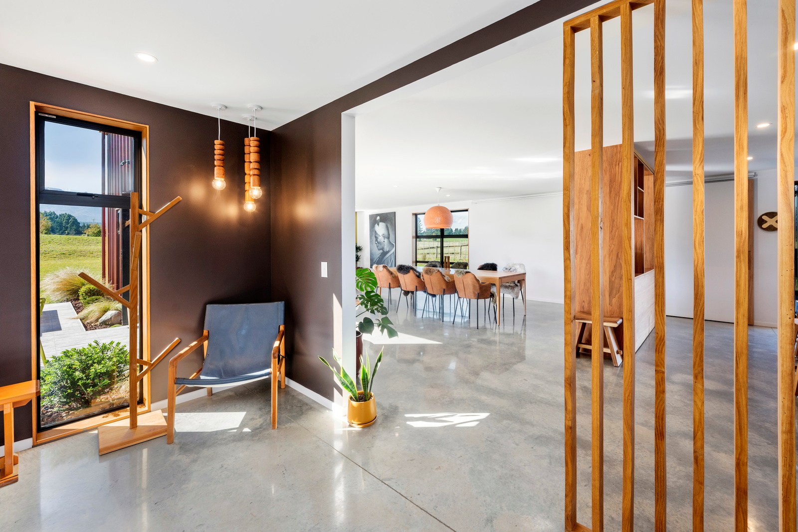 Could this striking Central Plateau house beneath Mt Ruapehu’s foothills look any more at home? With its colour palette and three barn-shaped linked pavilions in vertical timber and metal cladding, the house appears totally at ease in its environs. While the exterior is a nod to rural Aotearoa New Zealand, the interior is all about light, colour, playful decor and every modern convenience. You’ll find widespread glazing, including clerestory windows, skylights and sliding doors; painted, wallpapered and tiled feature walls; and striking timber features such as screens, built-in cabinetry and balustrades.