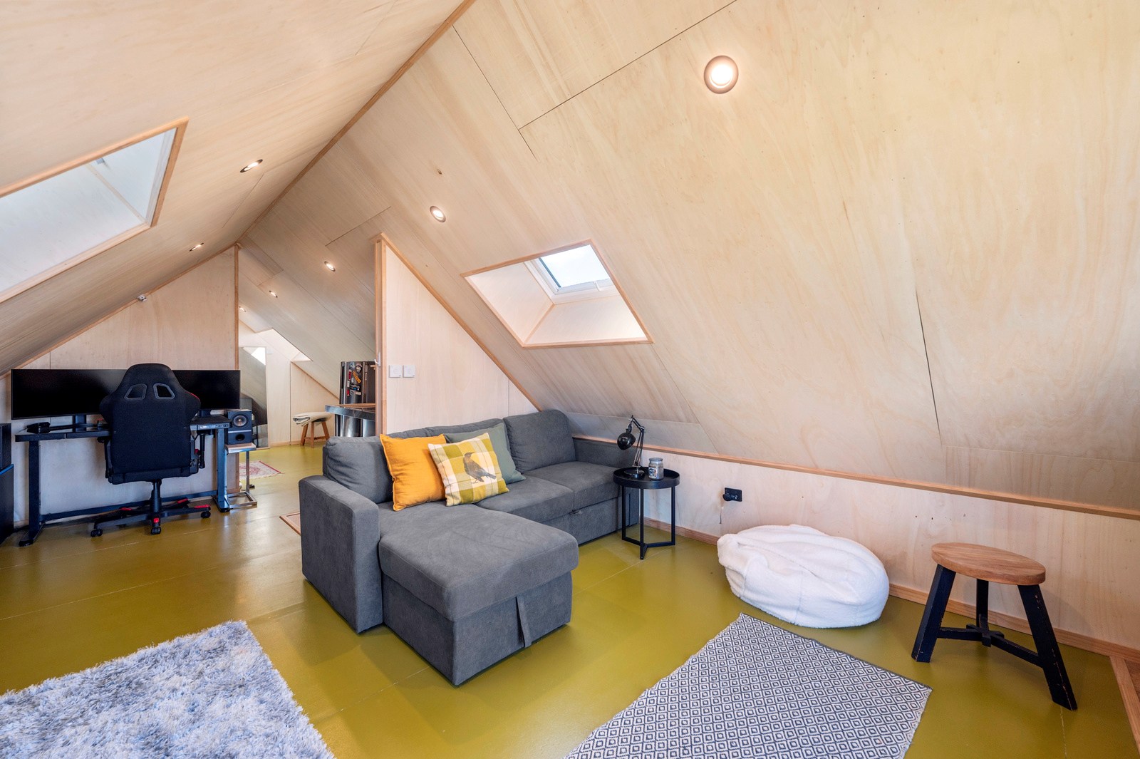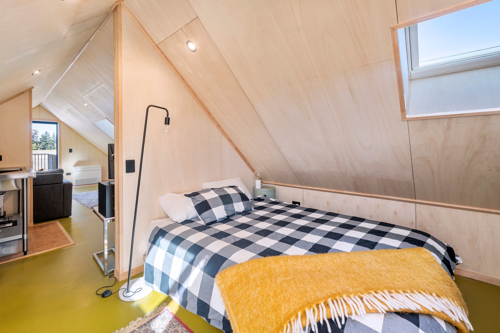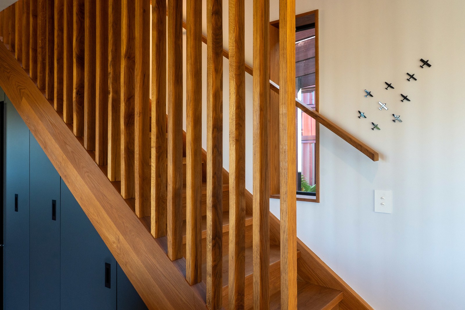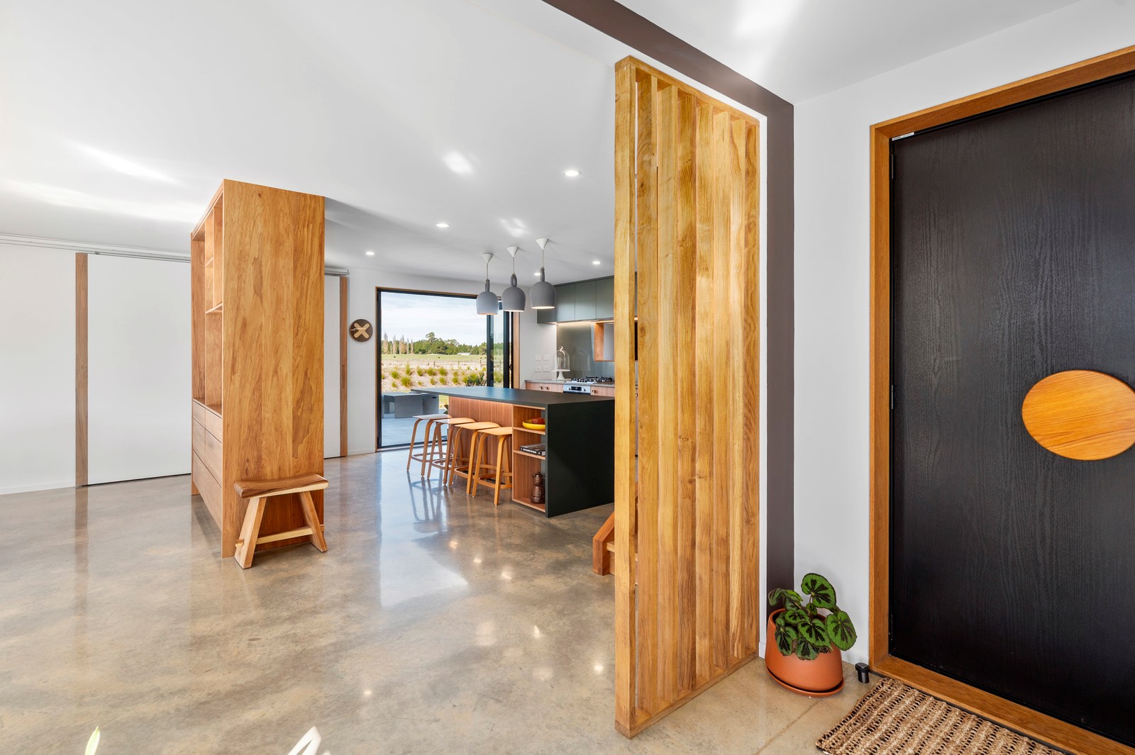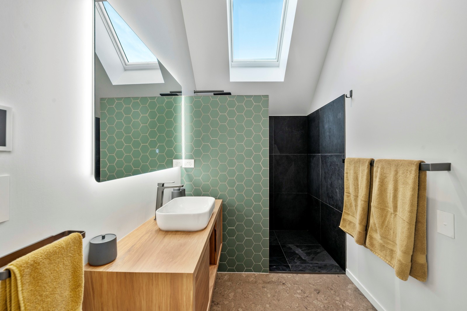 Could this striking Central Plateau house beneath Mt Ruapehu’s foothills look any more at home? With its colour palette and three barn-shaped linked pavilions in vertical timber and metal cladding, the house appears totally at ease in its environs. While the exterior is a nod to rural Aotearoa New Zealand, the interior is all about light, colour, playful decor and every modern convenience. You’ll find widespread glazing, including clerestory windows, skylights and sliding doors; painted, wallpapered and tiled feature walls; and striking timber features such as screens, built-in cabinetry and balustrades.