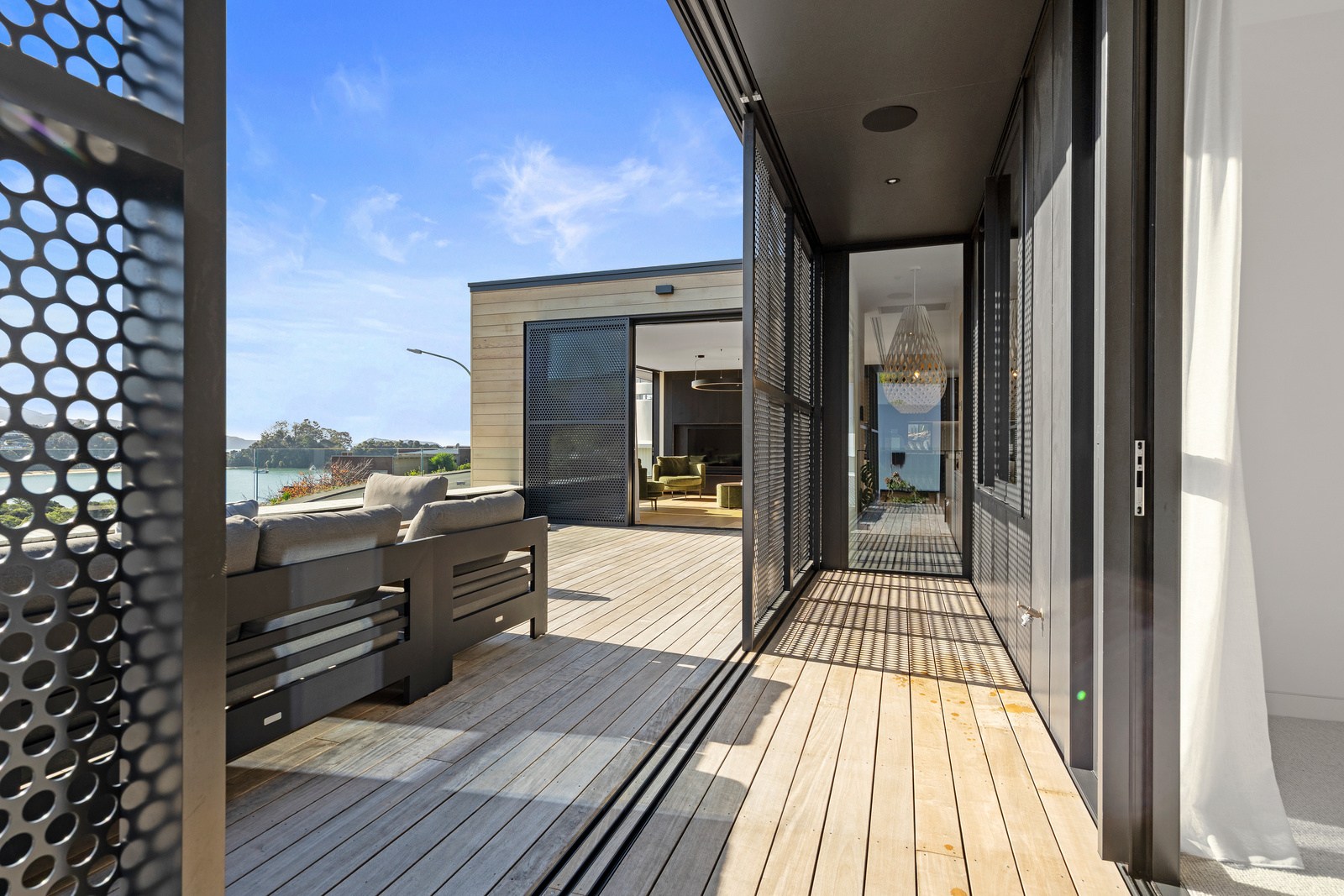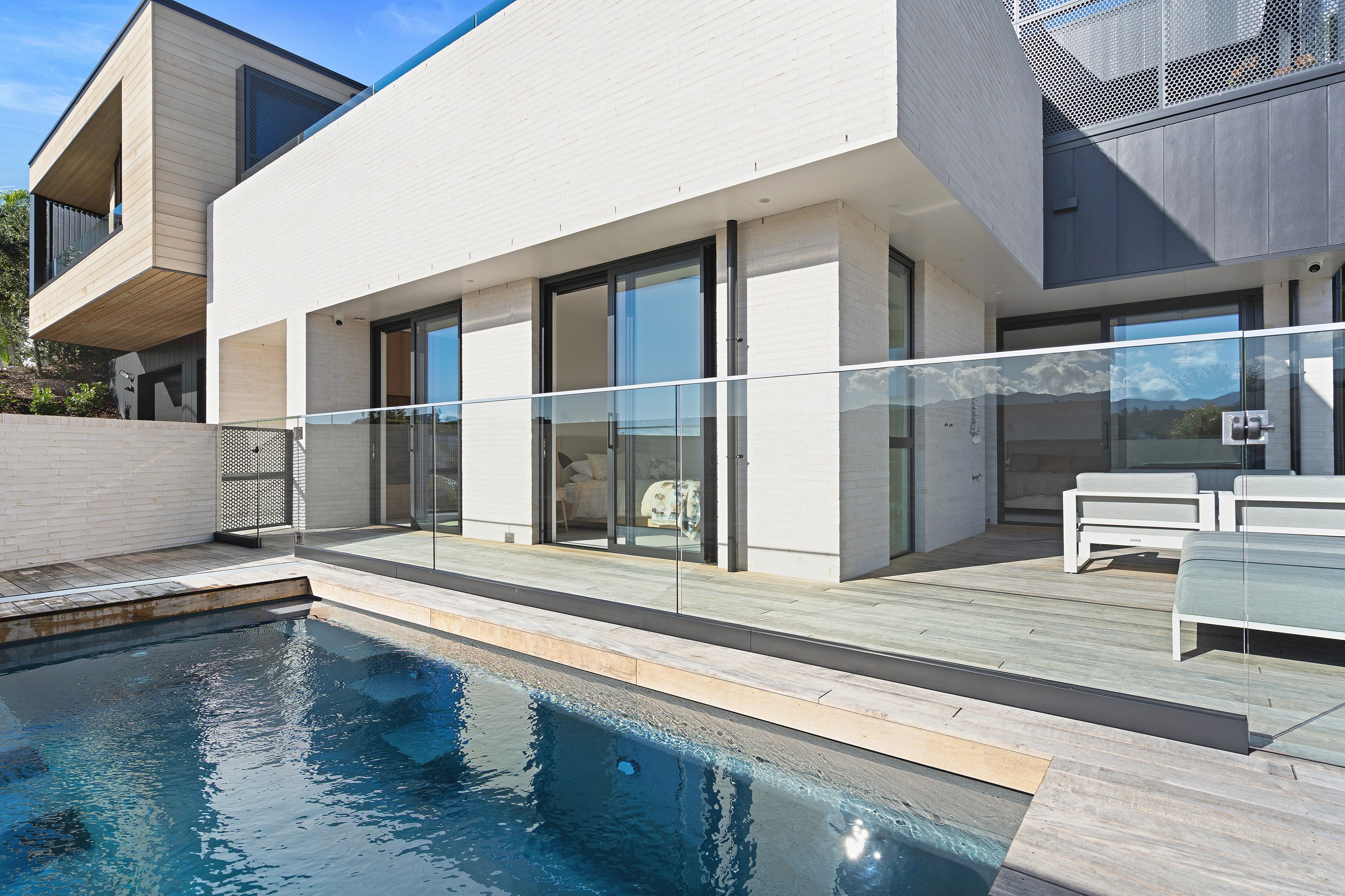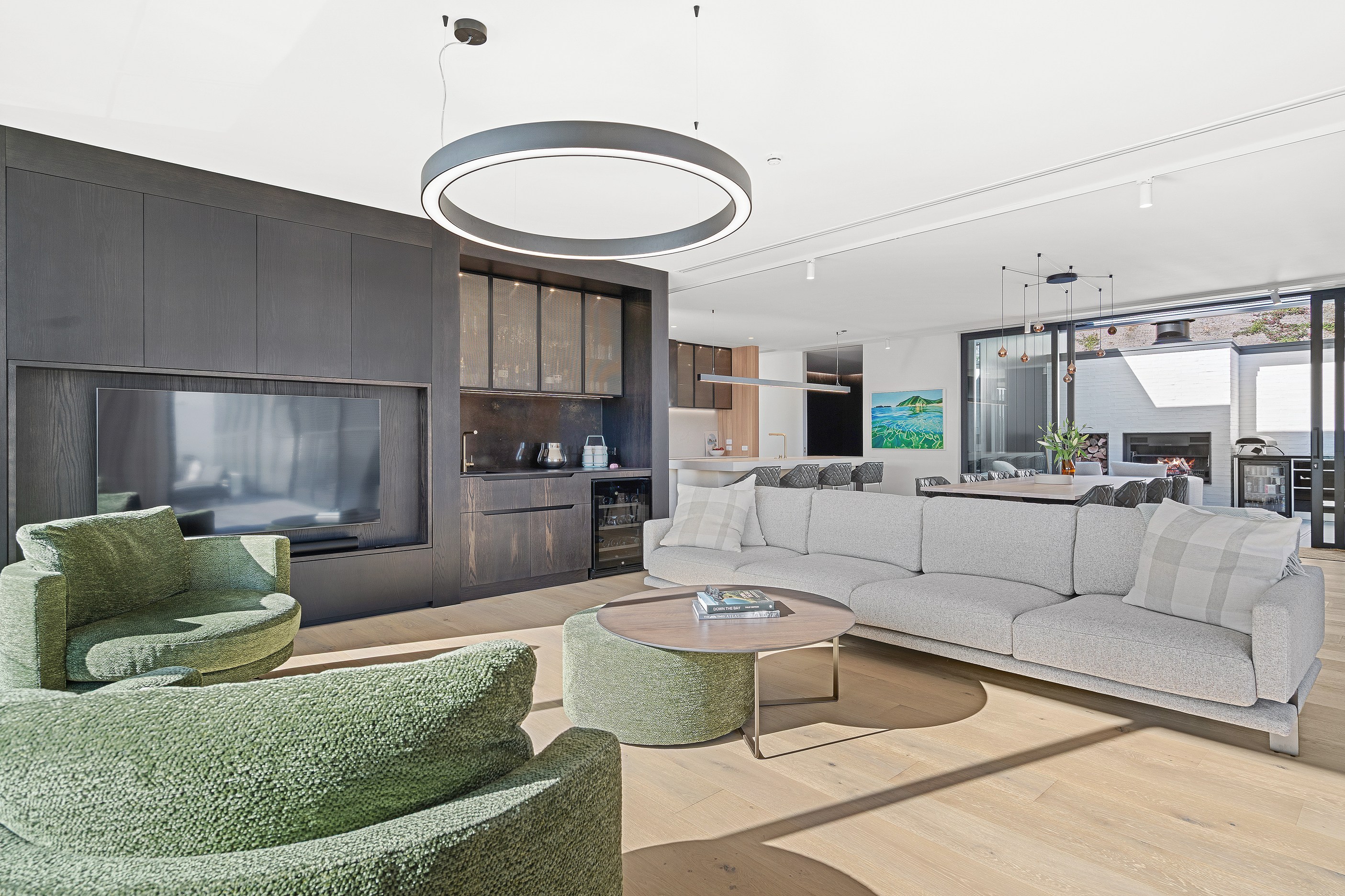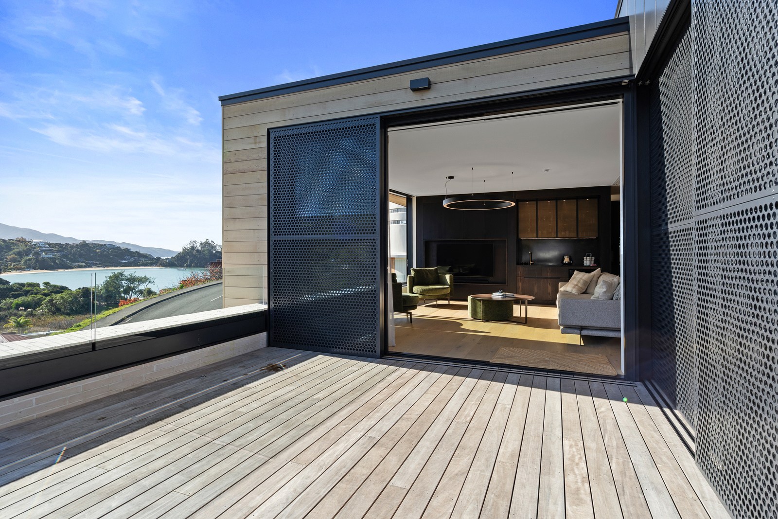 Embedded into a hill high above a beautiful gold-sand beach is this house that references hues of the coast. Custom bricks echo the colour of the sand, cedar cladding that mimics driftwood covers the cantilevered lookout and below is a dark box housing the garage. Of course, there is more to the 400sqm three-bedroom house — aluminium perforated screens that shelter a spa deck, for instance — but the materials all dovetail with each other and with the environment they inhabit. The owners enter through a pared-back cave-like opening on the ground floor. To the right is guest accommodation, including bedrooms, a bathroom, lounge and access to the inground swimming pool. You’ll also find three-car garaging. Turn left and the lift and stairs take you to the first floor and an astonishing variety of places to relax, no matter the weather.
