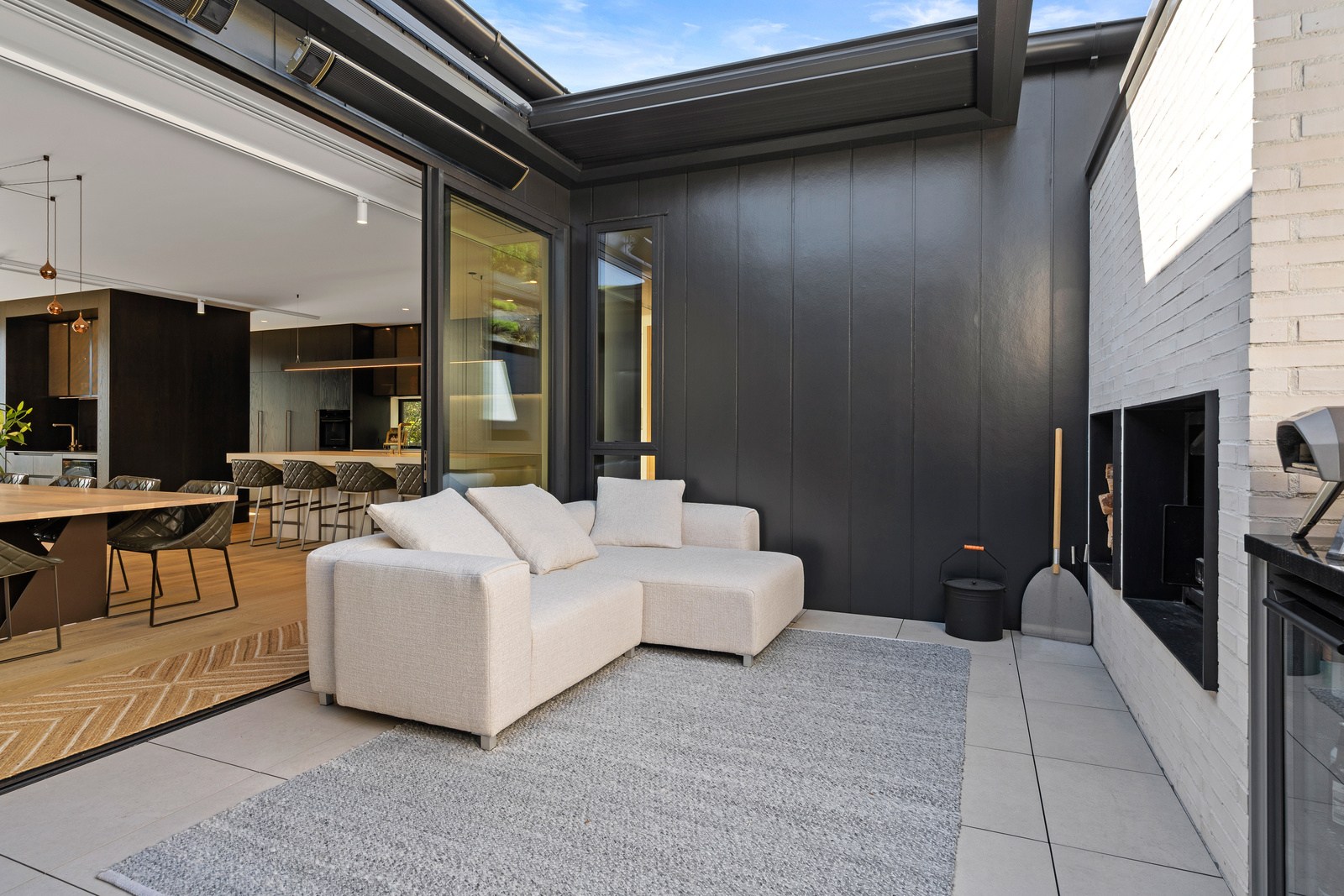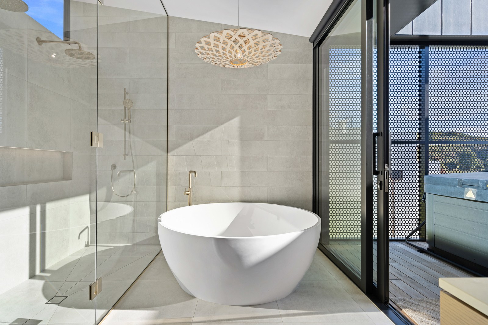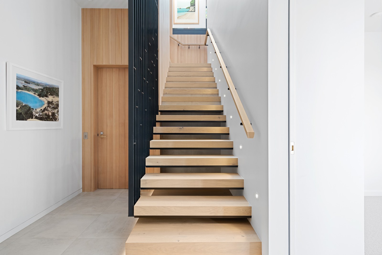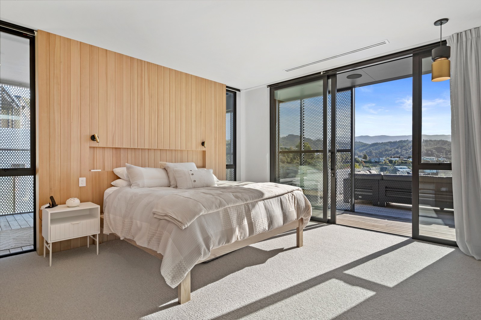 Embedded into a hill high above a beautiful gold-sand beach is this house that references hues of the coast. Custom bricks echo the colour of the sand, cedar cladding that mimics driftwood covers the cantilevered lookout and below is a dark box housing the garage. Of course, there is more to the 400sqm three-bedroom house — aluminium perforated screens that shelter a spa deck, for instance — but the materials all dovetail with each other and with the environment they inhabit. The owners enter through a pared-back cave-like opening on the ground floor. To the right is guest accommodation, including bedrooms, a bathroom, lounge and access to the inground swimming pool. You’ll also find three-car garaging. Turn left and the lift and stairs take you to the first floor and an astonishing variety of places to relax, no matter the weather.