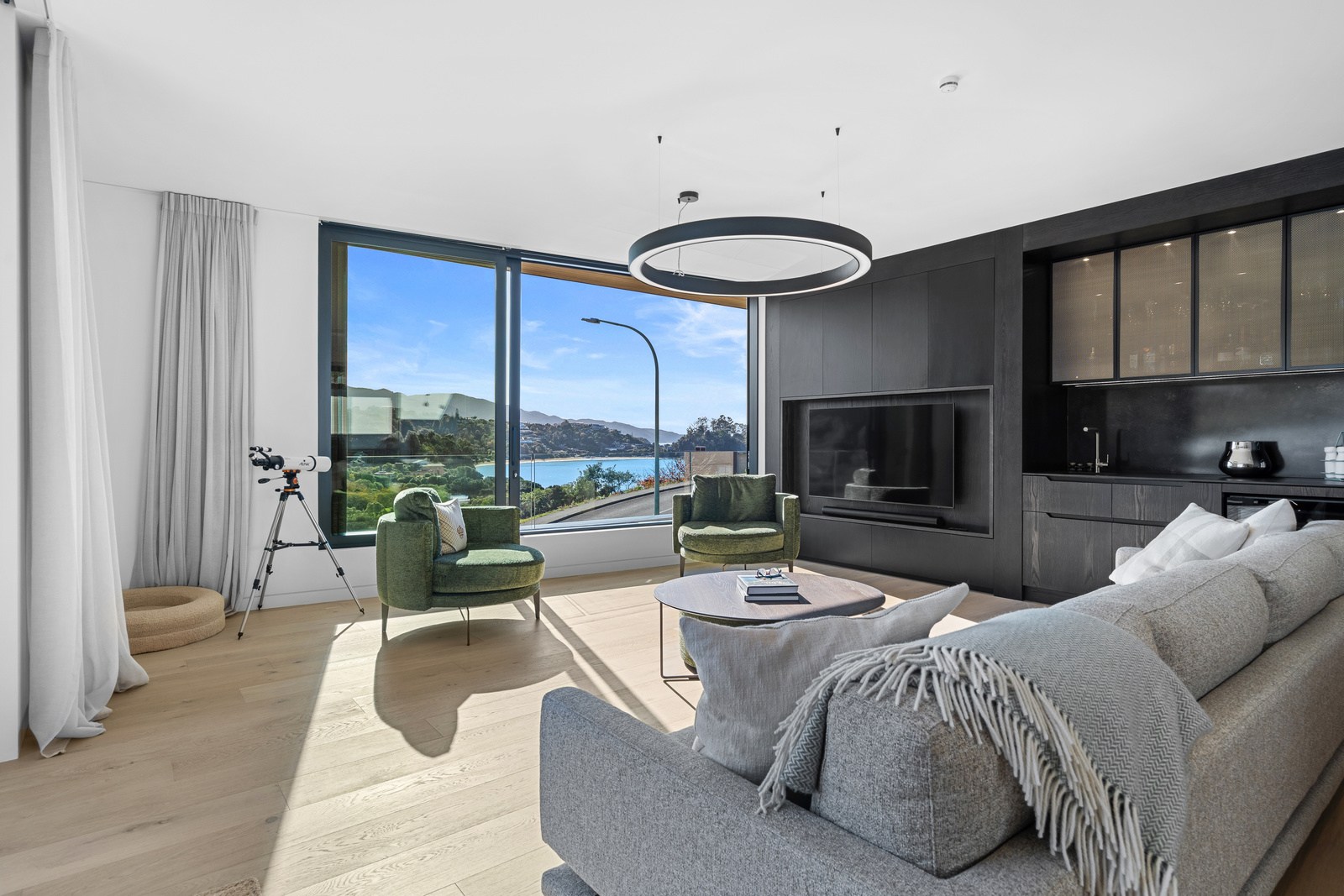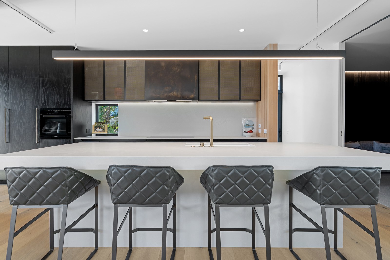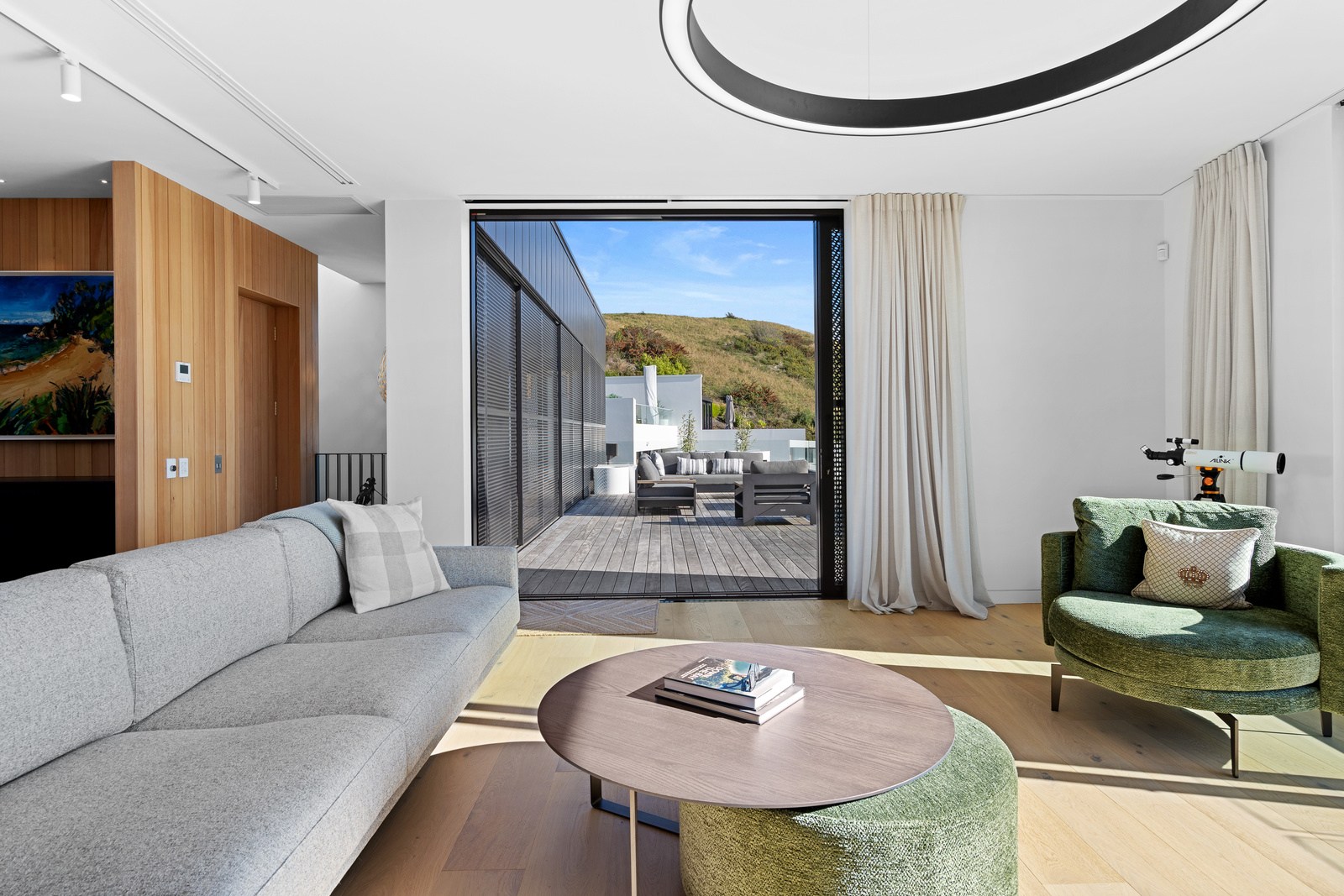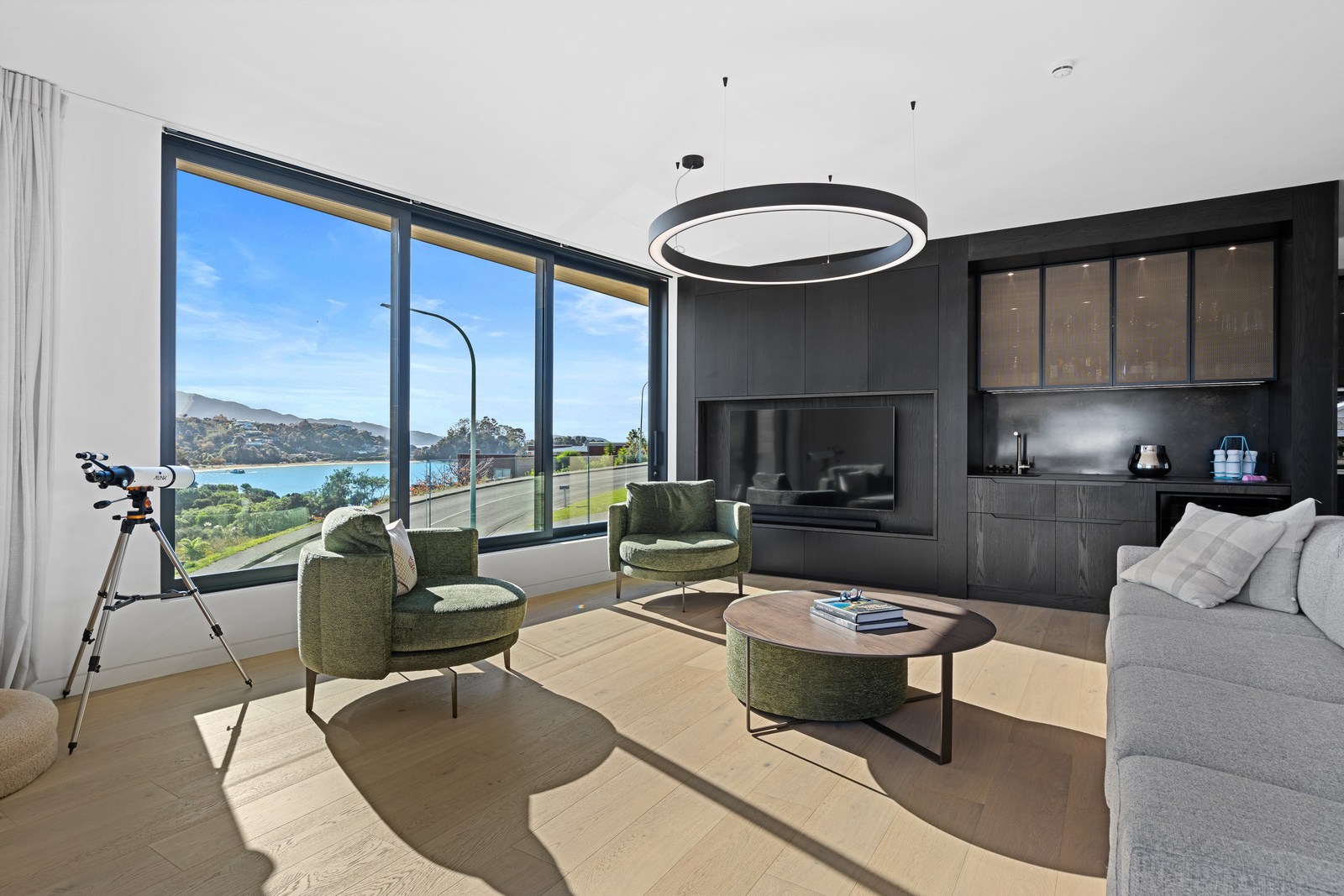 Outdoor living options include a sheltered courtyard, a morning deck, a main deck and that private spa deck accessed through the main-bedroom suite, which also has a walk-in robe and ensuite. On this floor there’s an L-shaped open-plan living space anchored by a kitchen accented with more of the earthy natural tones used on the exterior, plus a walk-in pantry as big as the kitchen itself. You’ll also find an office, snug and laundry. Designer details abound. Coastal views and expert craftsmanship are a match made in heaven.