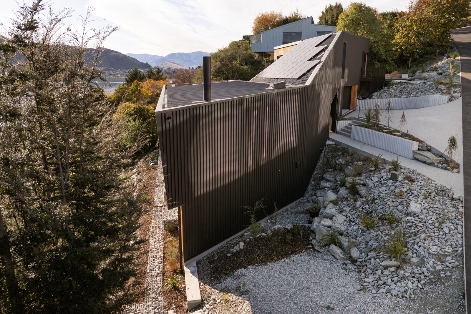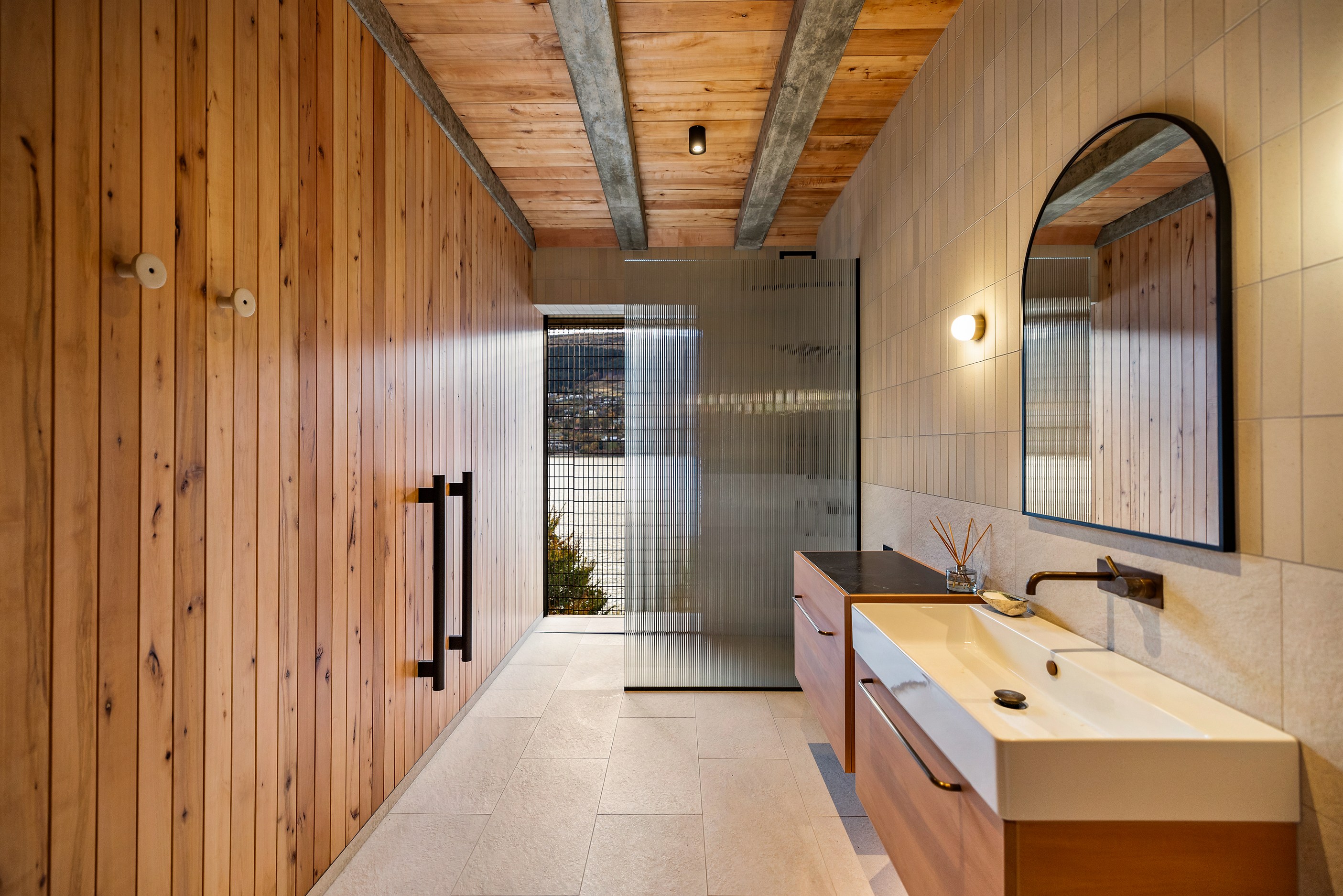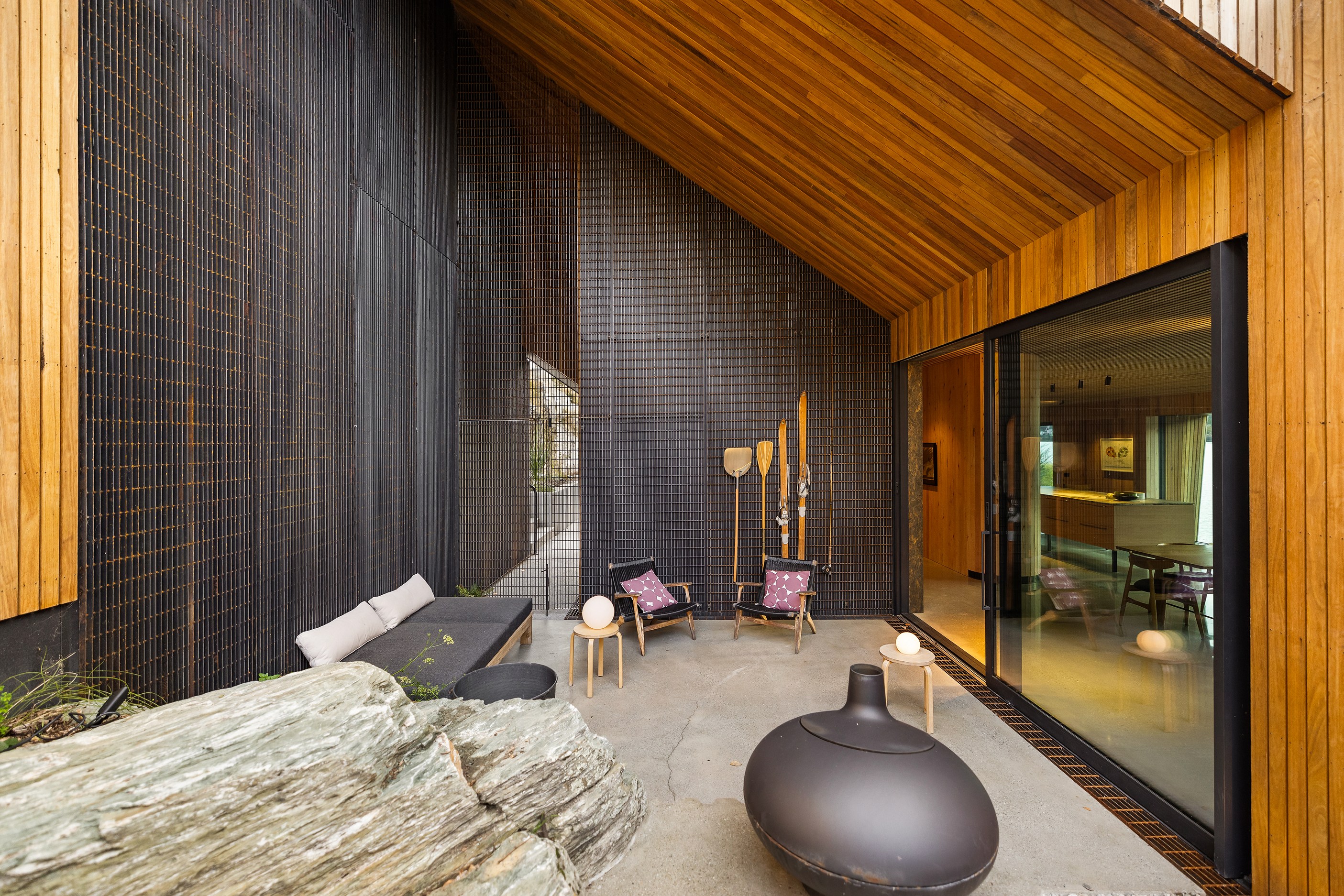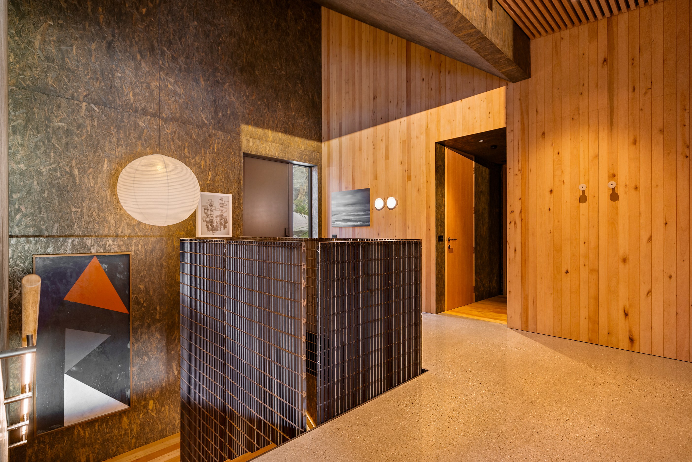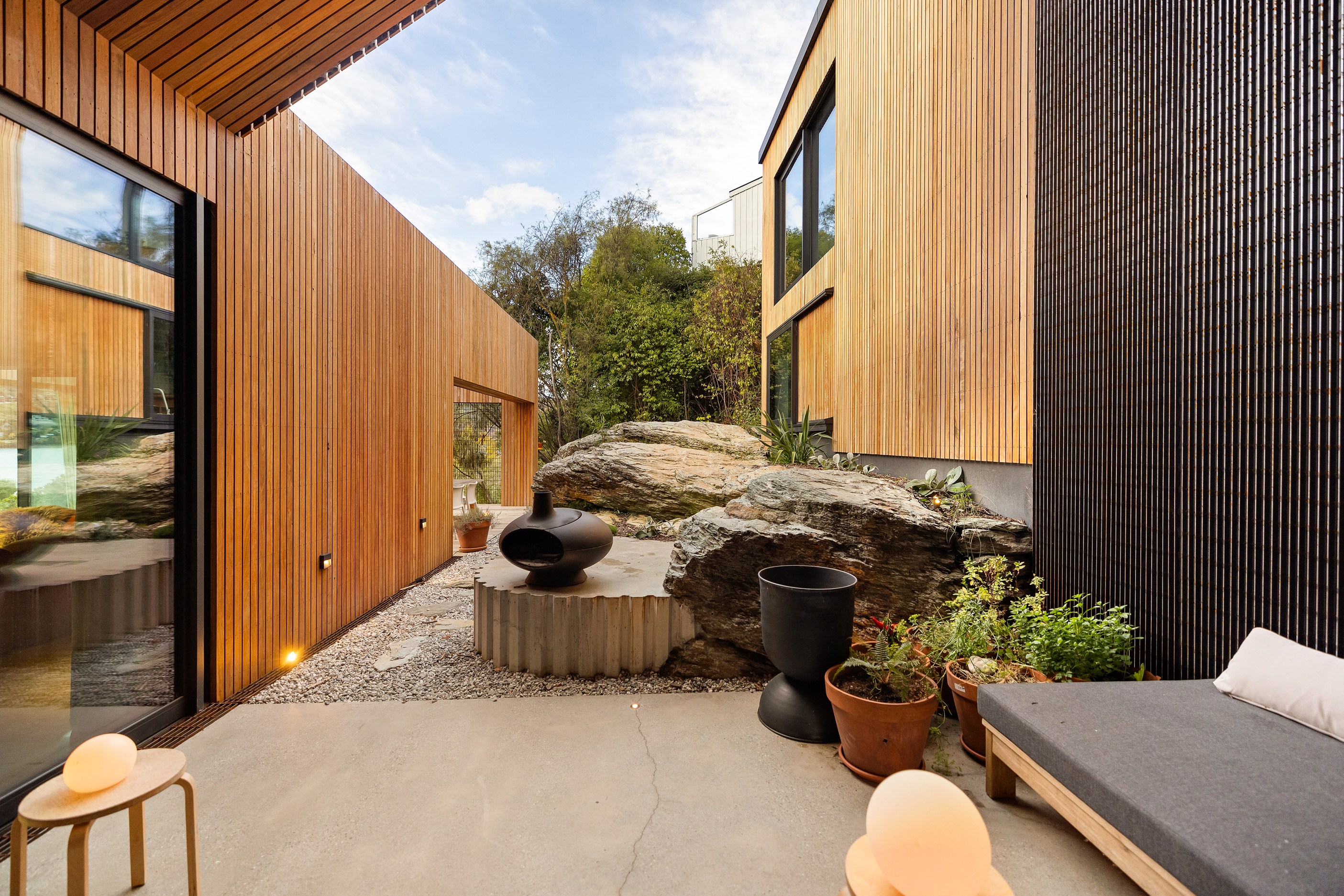 Each of the three levels has its own personality, while rustic timbers and a courtyard formed around schist boulders and steel web forge grating pique the interest, drawing inspiration from New Zealand’s agricultural heritage. Continuity and cohesion come courtesy of recycled Australian timber cladding, soffits and rainscreens, and a roof plane mimics the contours of the landscape. No doubt, this is a home of great beauty, but it also excels in myriad other ways. It’s warm, healthy, energy efficient and highly automated. Locally manufactured prefabricated wall and roof panels were utilised to improve efficiency. Passive design principals were adhered to, and the house features include an air-to-water heat pump with costs offset by solar panels, carefully orientated windows with triple glazing, and a mechanical ventilation system. These add up to a home that will stand the test of time.