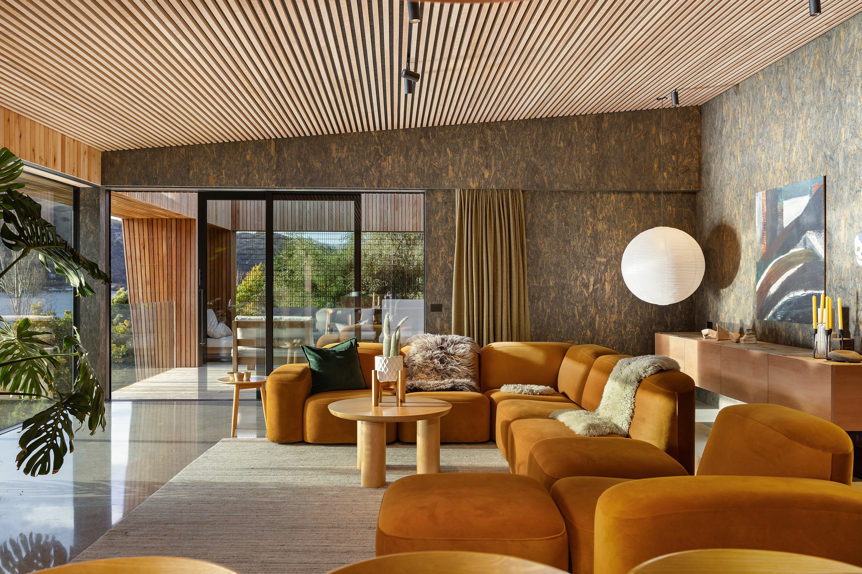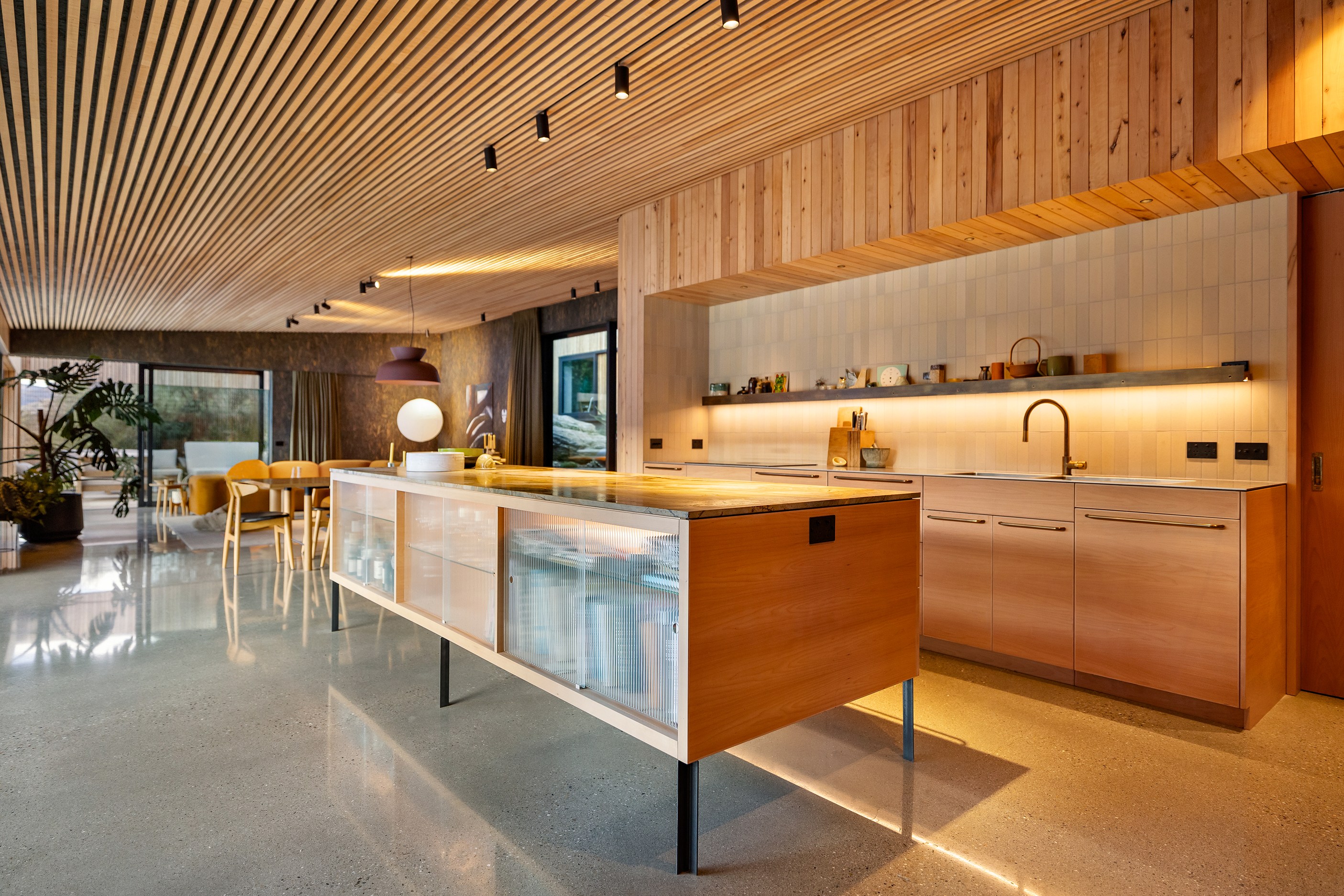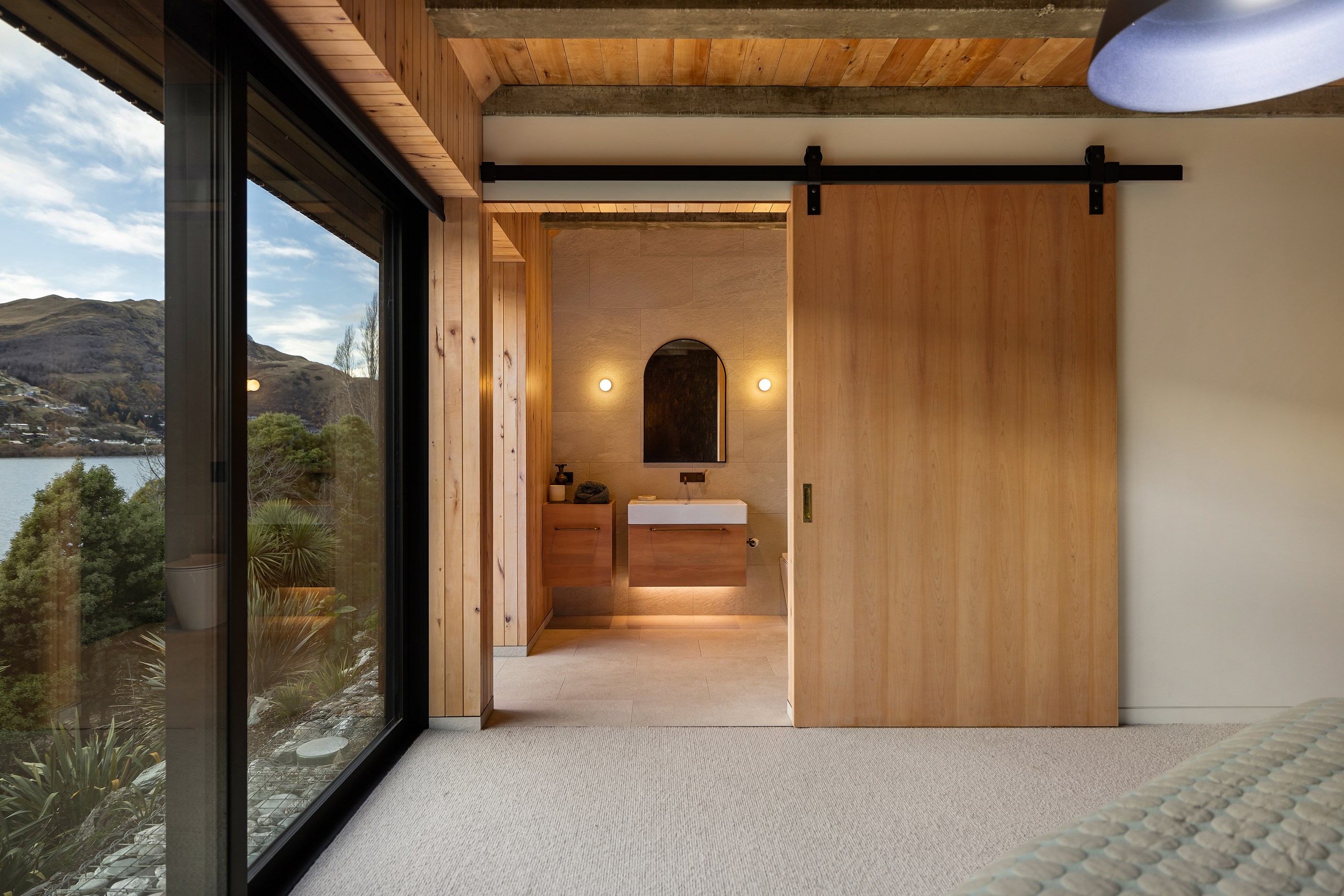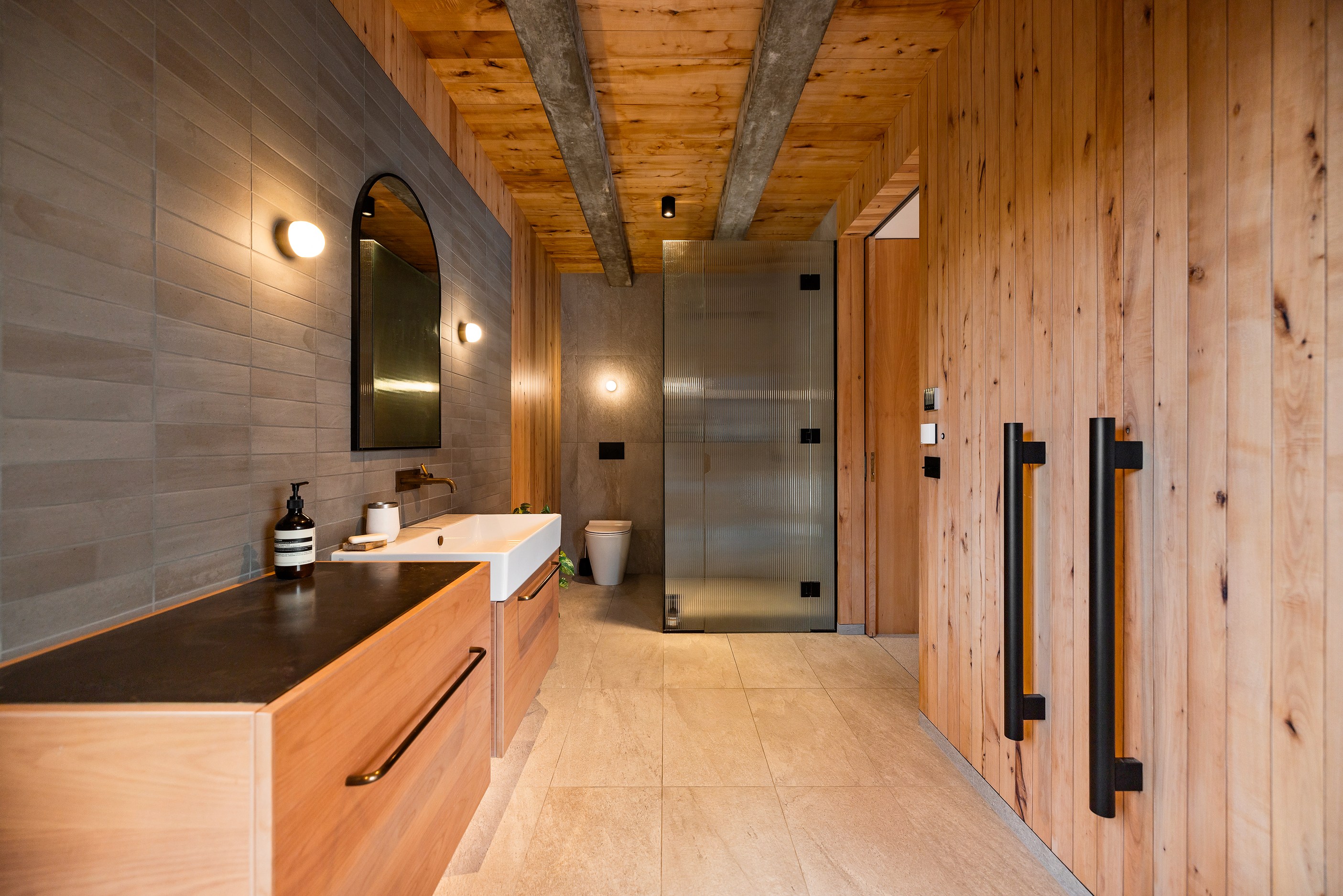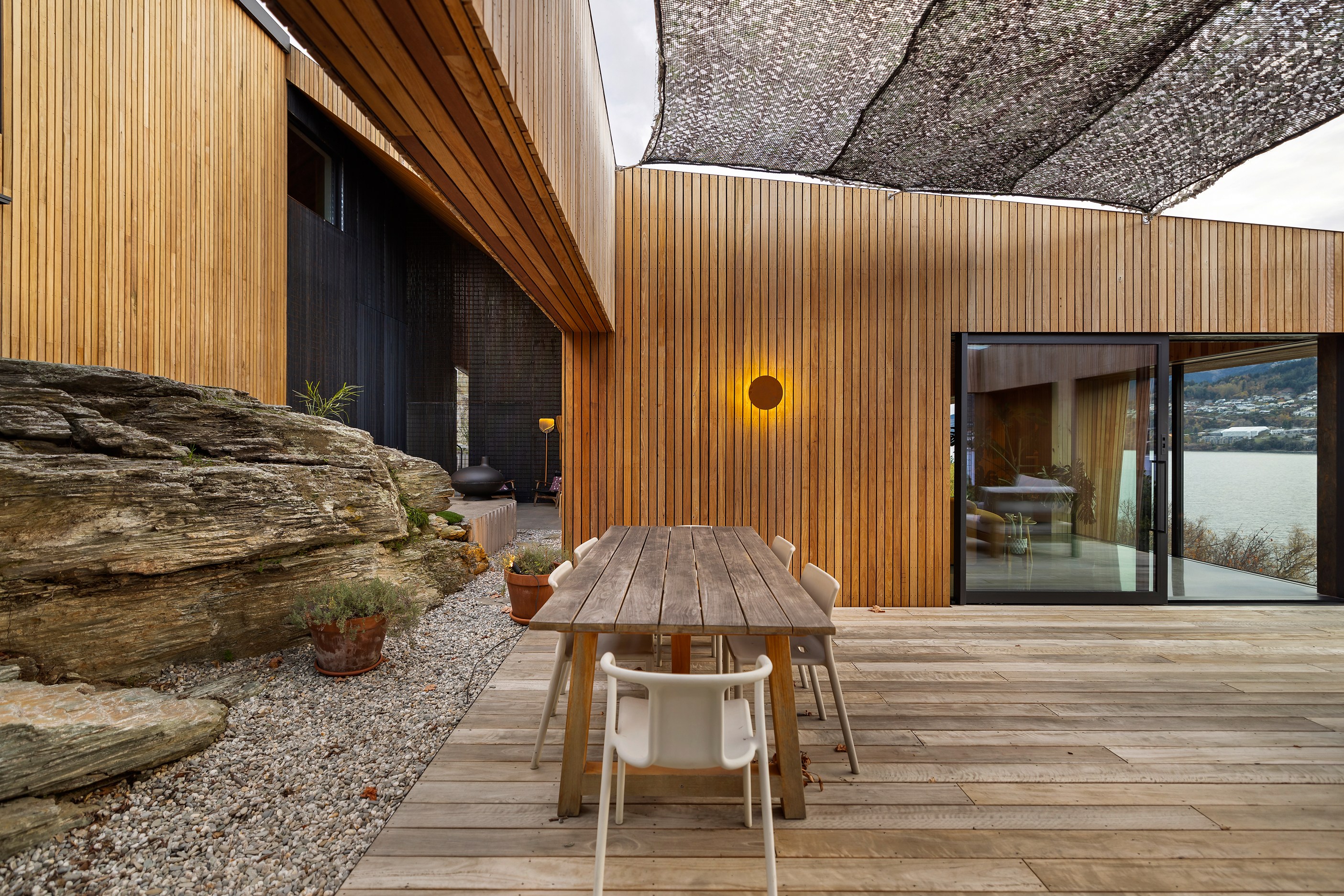Each of the three levels has its own personality, while rustic timbers and a courtyard formed around schist boulders and steel web forge grating pique the interest, drawing inspiration from New Zealand’s agricultural heritage. Continuity and cohesion come courtesy of recycled Australian timber cladding, soffits and rainscreens, and a roof plane mimics the contours of the landscape. No doubt, this is a home of great beauty, but it also excels in myriad other ways. It’s warm, healthy, energy efficient and highly automated. Locally manufactured prefabricated wall and roof panels were utilised to improve efficiency. Passive design principals were adhered to, and the house features include an air-to-water heat pump with costs offset by solar panels, carefully orientated windows with triple glazing, and a mechanical ventilation system. These add up to a home that will stand the test of time.