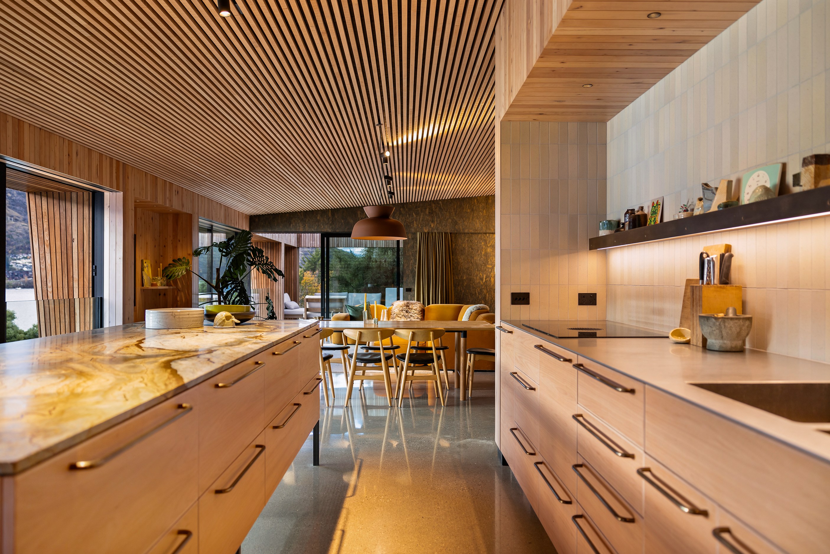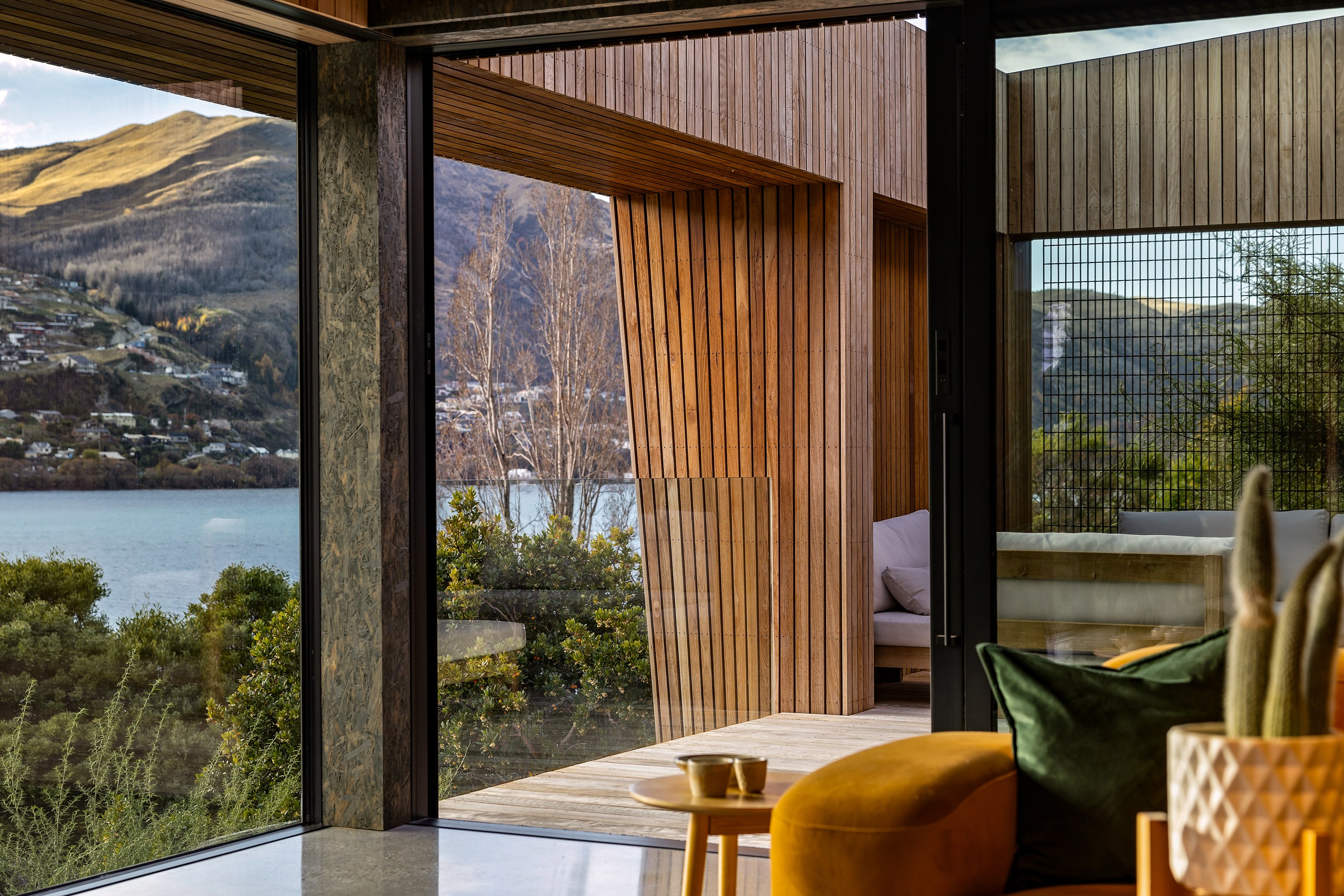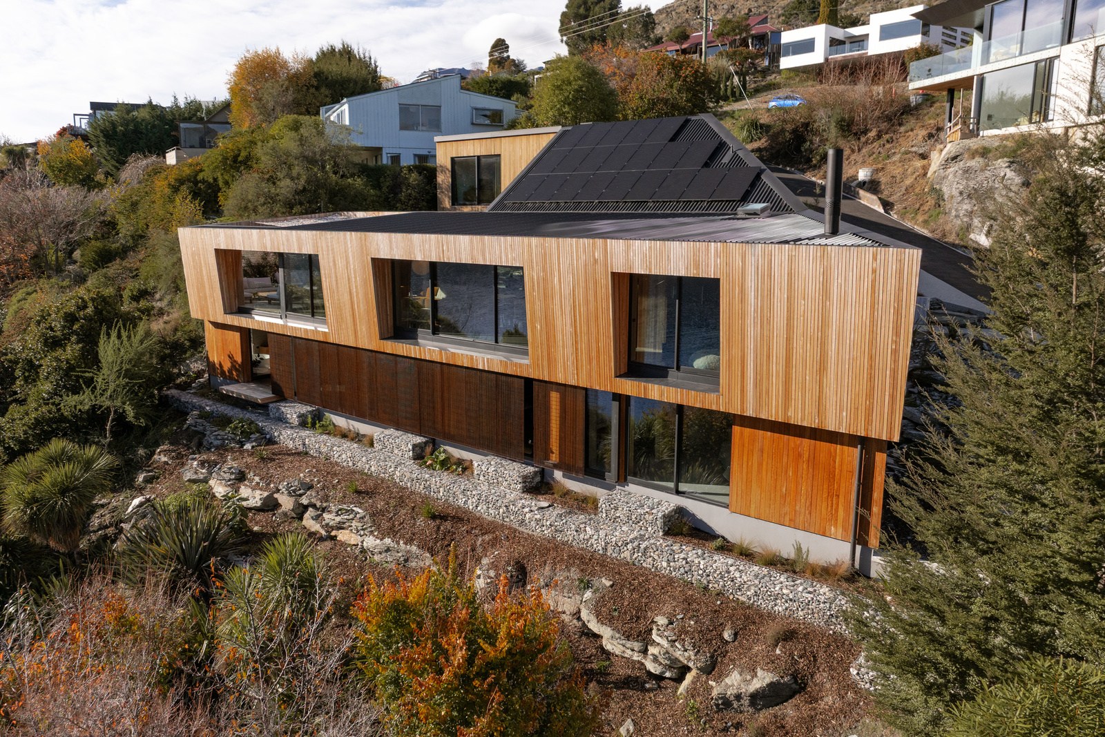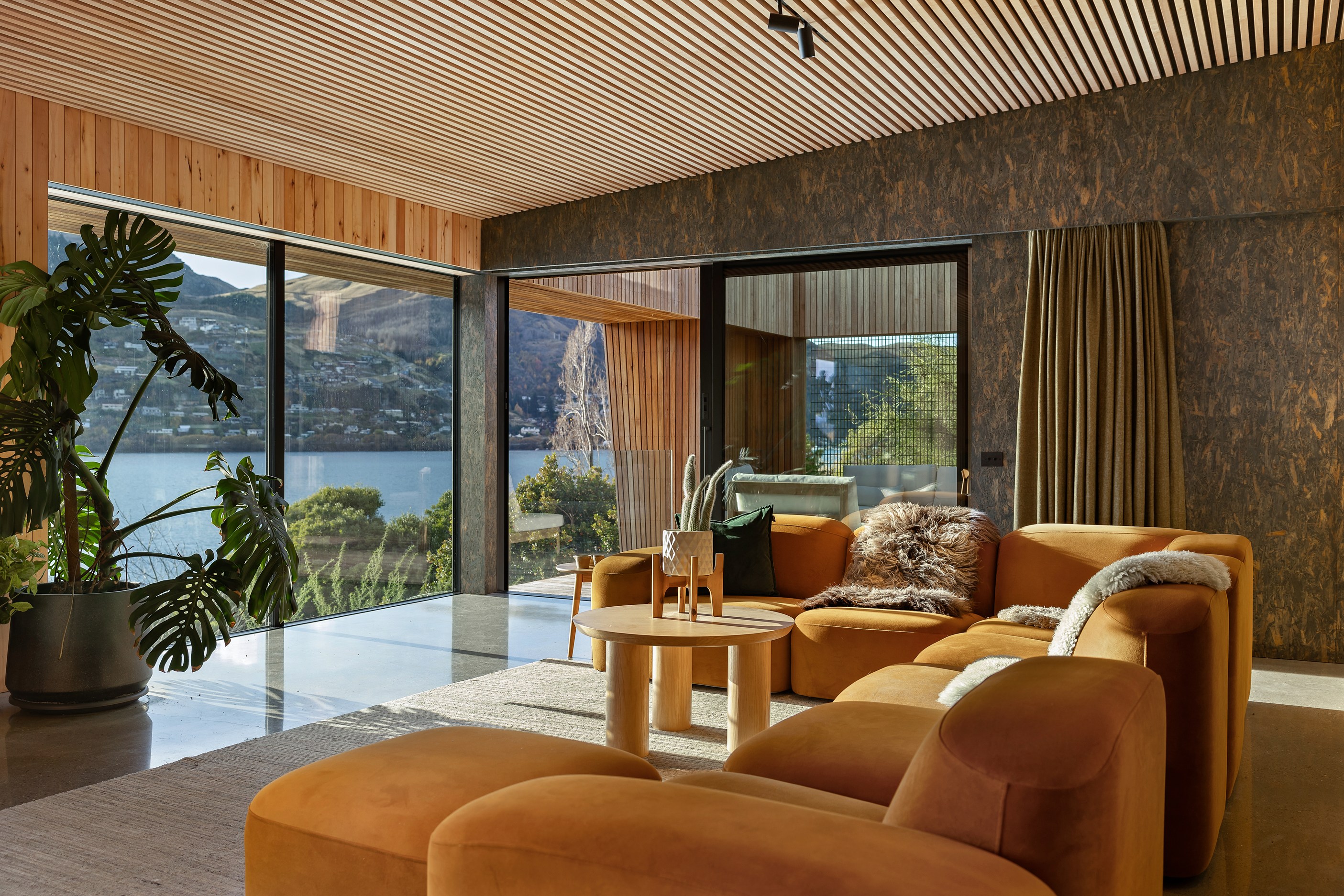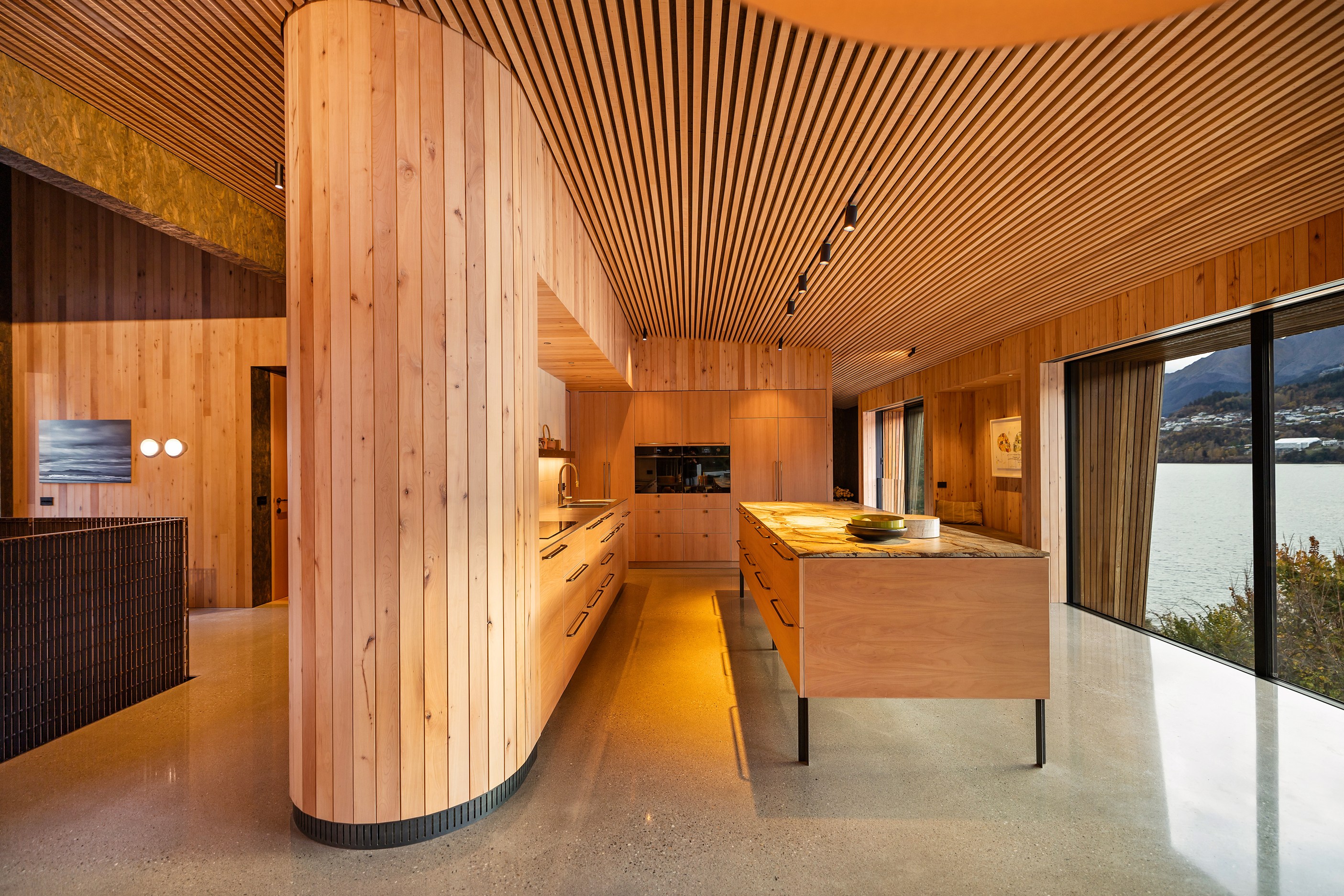 Each of the three levels has its own personality, while rustic timbers and a courtyard formed around schist boulders and steel web forge grating pique the interest, drawing inspiration from New Zealand’s agricultural heritage. Continuity and cohesion come courtesy of recycled Australian timber cladding, soffits and rainscreens, and a roof plane mimics the contours of the landscape. No doubt, this is a home of great beauty, but it also excels in myriad other ways. It’s warm, healthy, energy efficient and highly automated. Locally manufactured prefabricated wall and roof panels were utilised to improve efficiency. Passive design principals were adhered to, and the house features include an air-to-water heat pump with costs offset by solar panels, carefully orientated windows with triple glazing, and a mechanical ventilation system. These add up to a home that will stand the test of time.