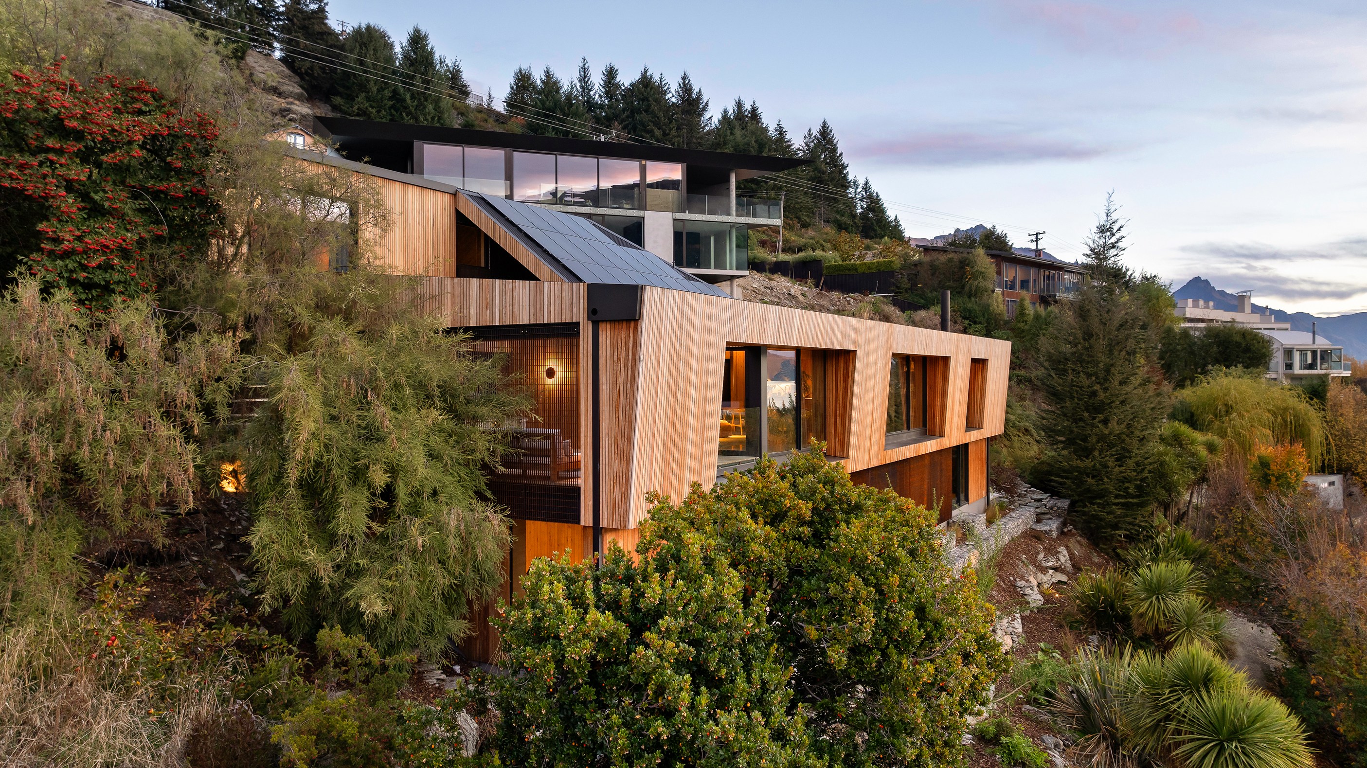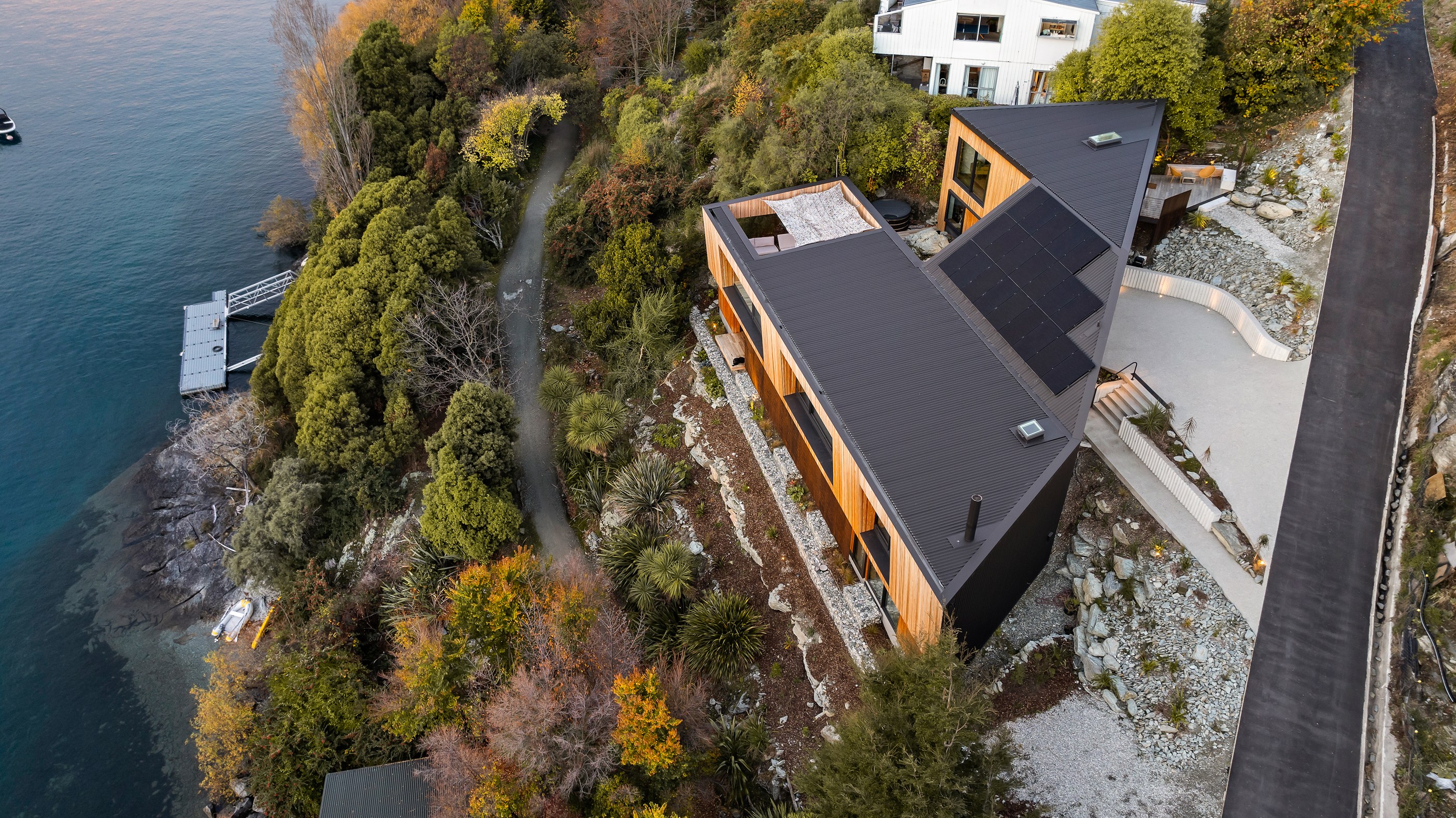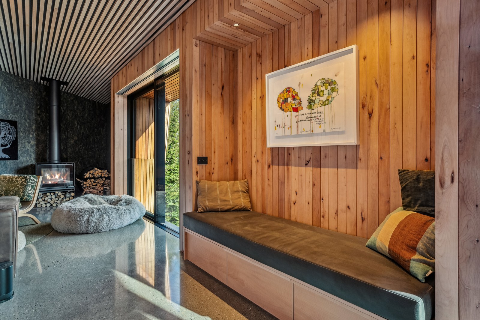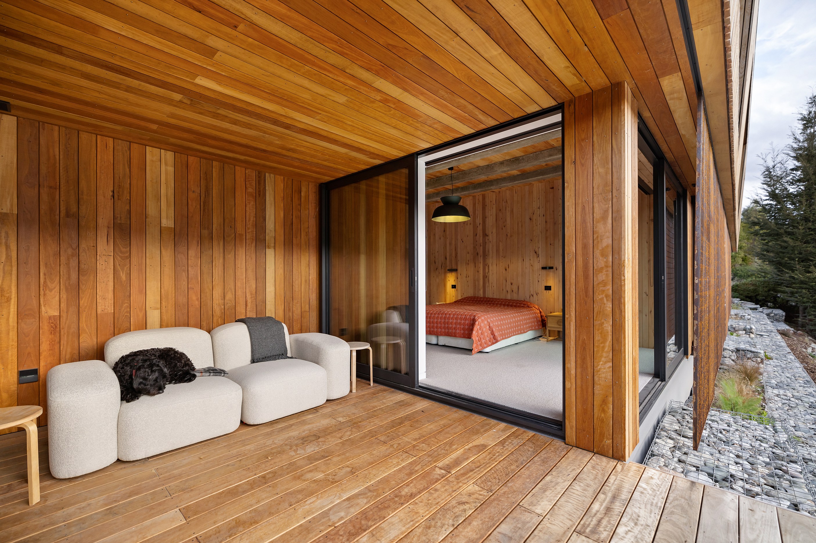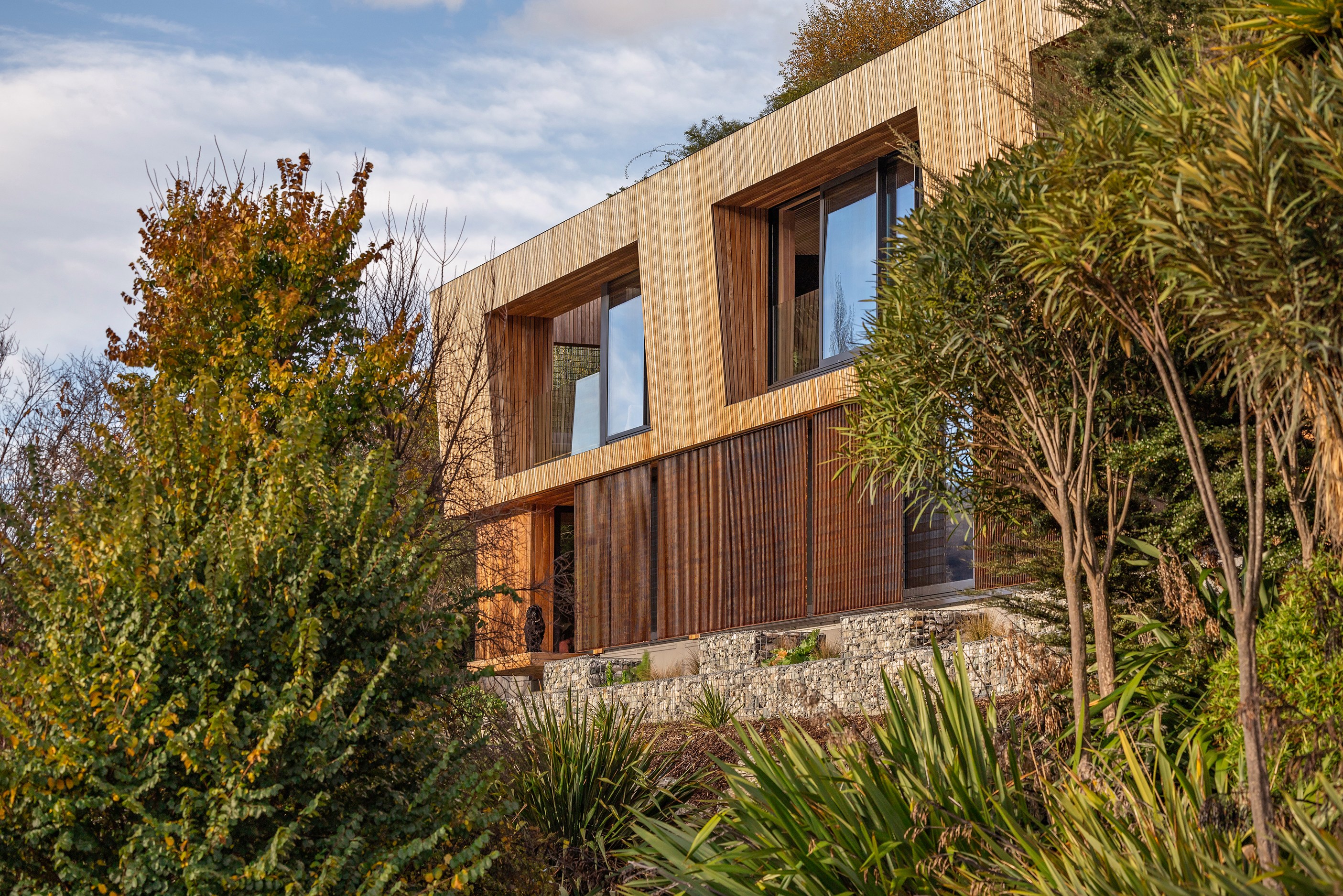 Each of the three levels has its own personality, while rustic timbers and a courtyard formed around schist boulders and steel web forge grating pique the interest, drawing inspiration from New Zealand’s agricultural heritage. Continuity and cohesion come courtesy of recycled Australian timber cladding, soffits and rainscreens, and a roof plane mimics the contours of the landscape. No doubt, this is a home of great beauty, but it also excels in myriad other ways. It’s warm, healthy, energy efficient and highly automated. Locally manufactured prefabricated wall and roof panels were utilised to improve efficiency. Passive design principals were adhered to, and the house features include an air-to-water heat pump with costs offset by solar panels, carefully orientated windows with triple glazing, and a mechanical ventilation system. These add up to a home that will stand the test of time.
