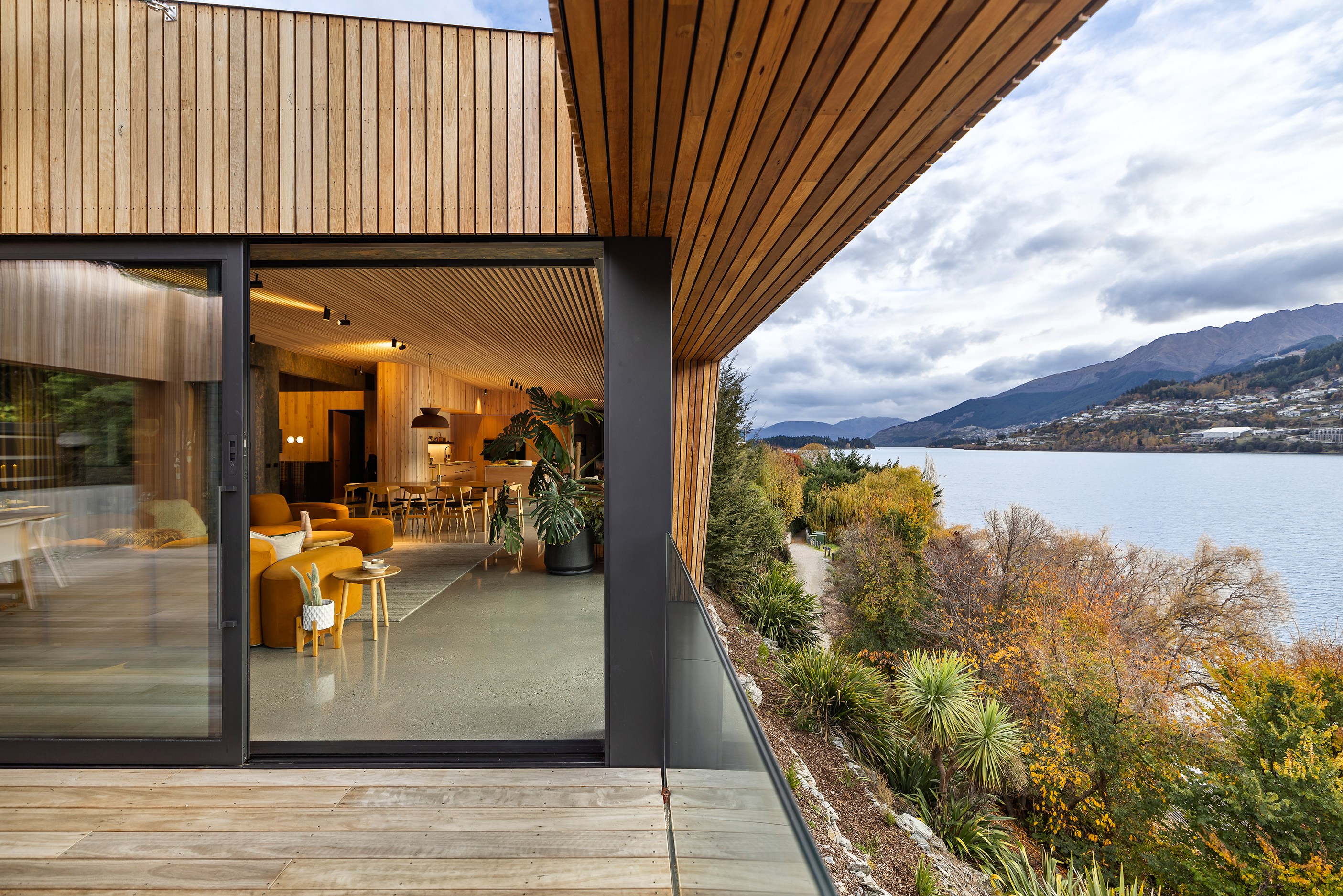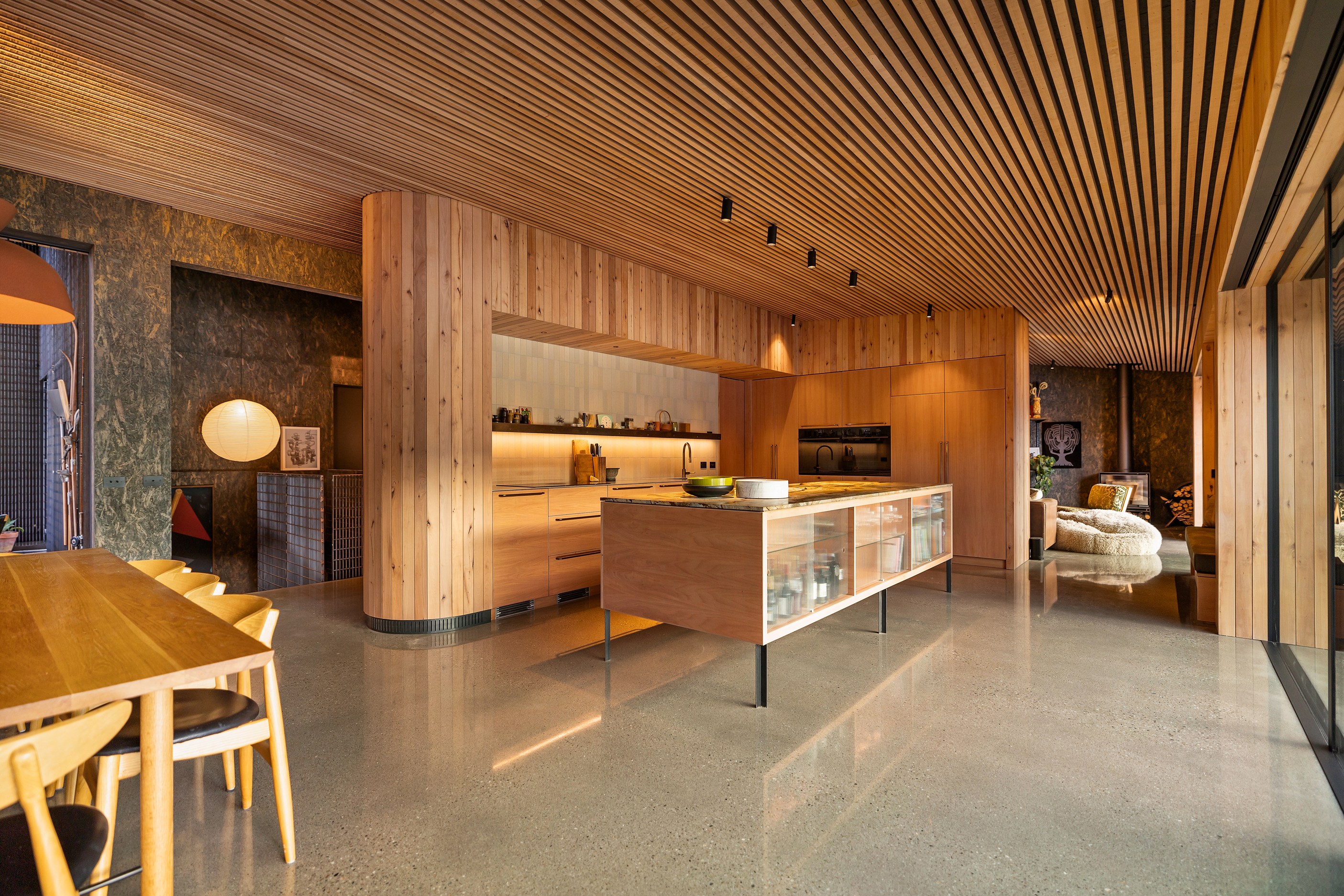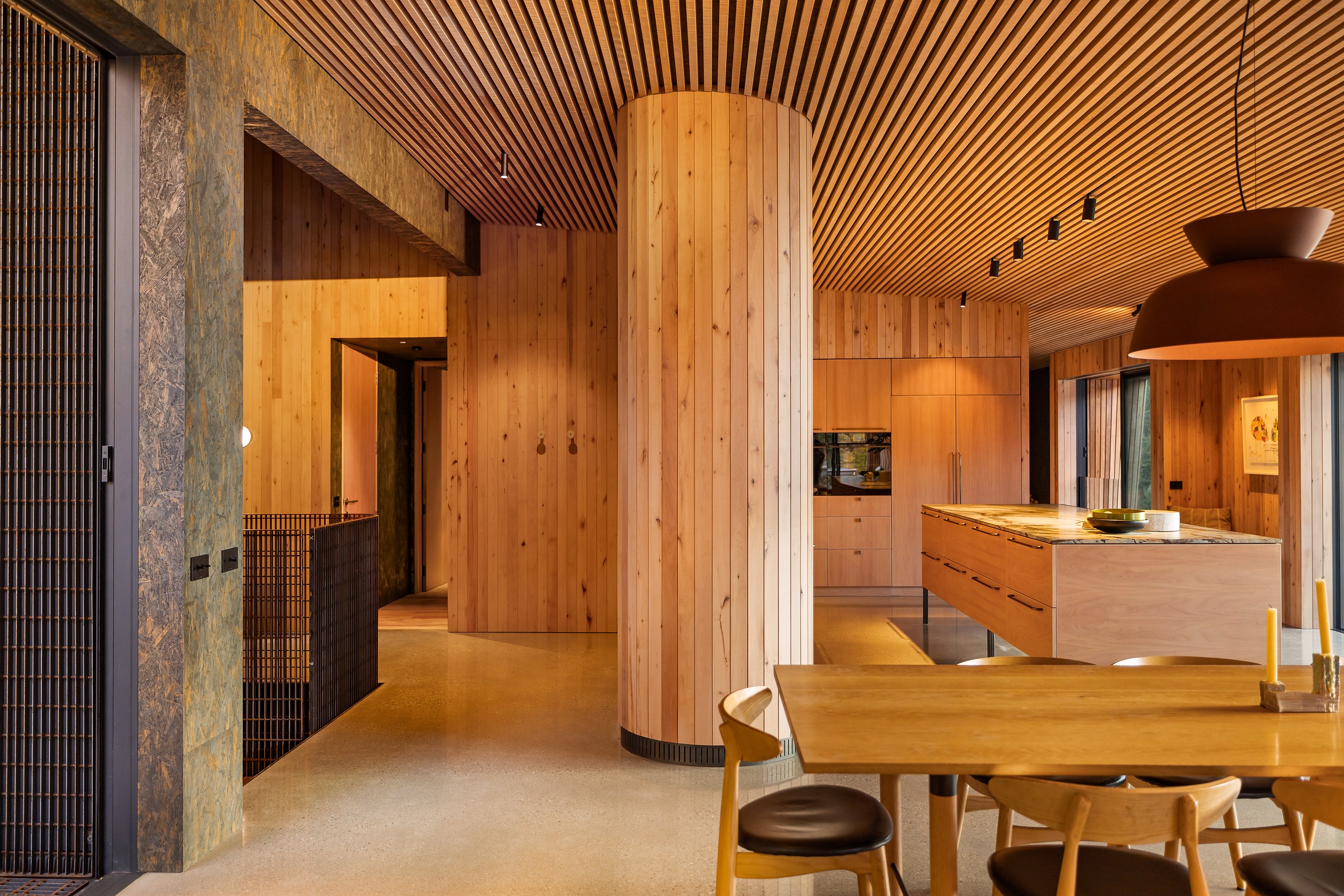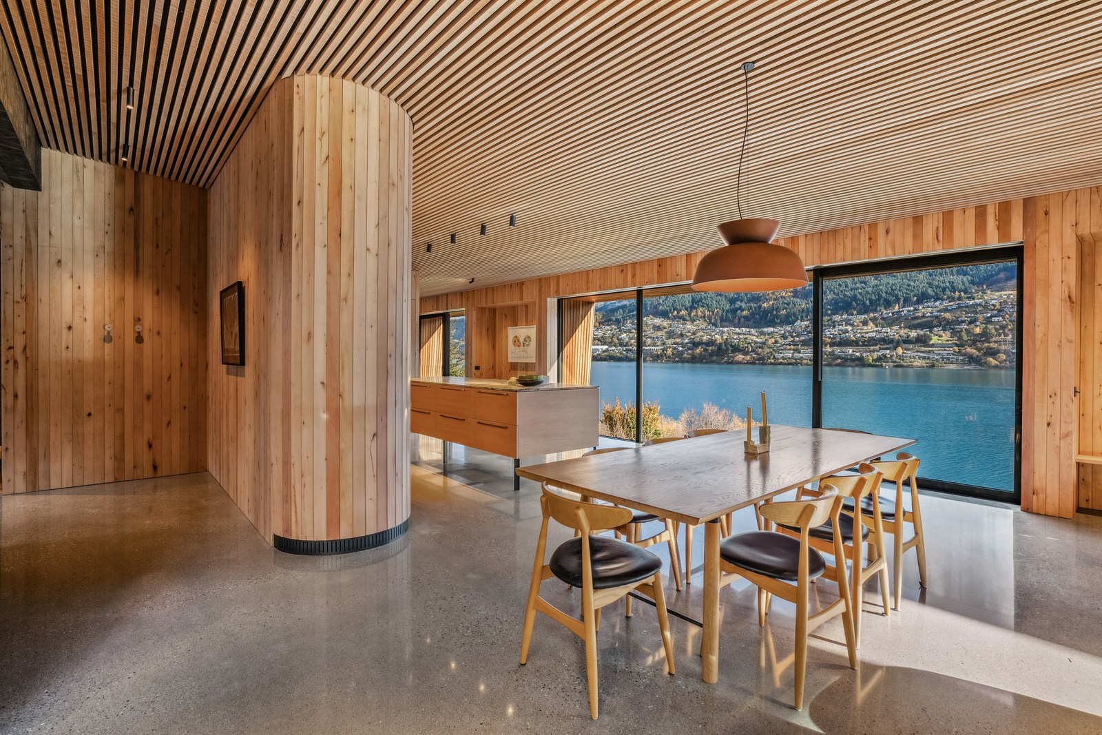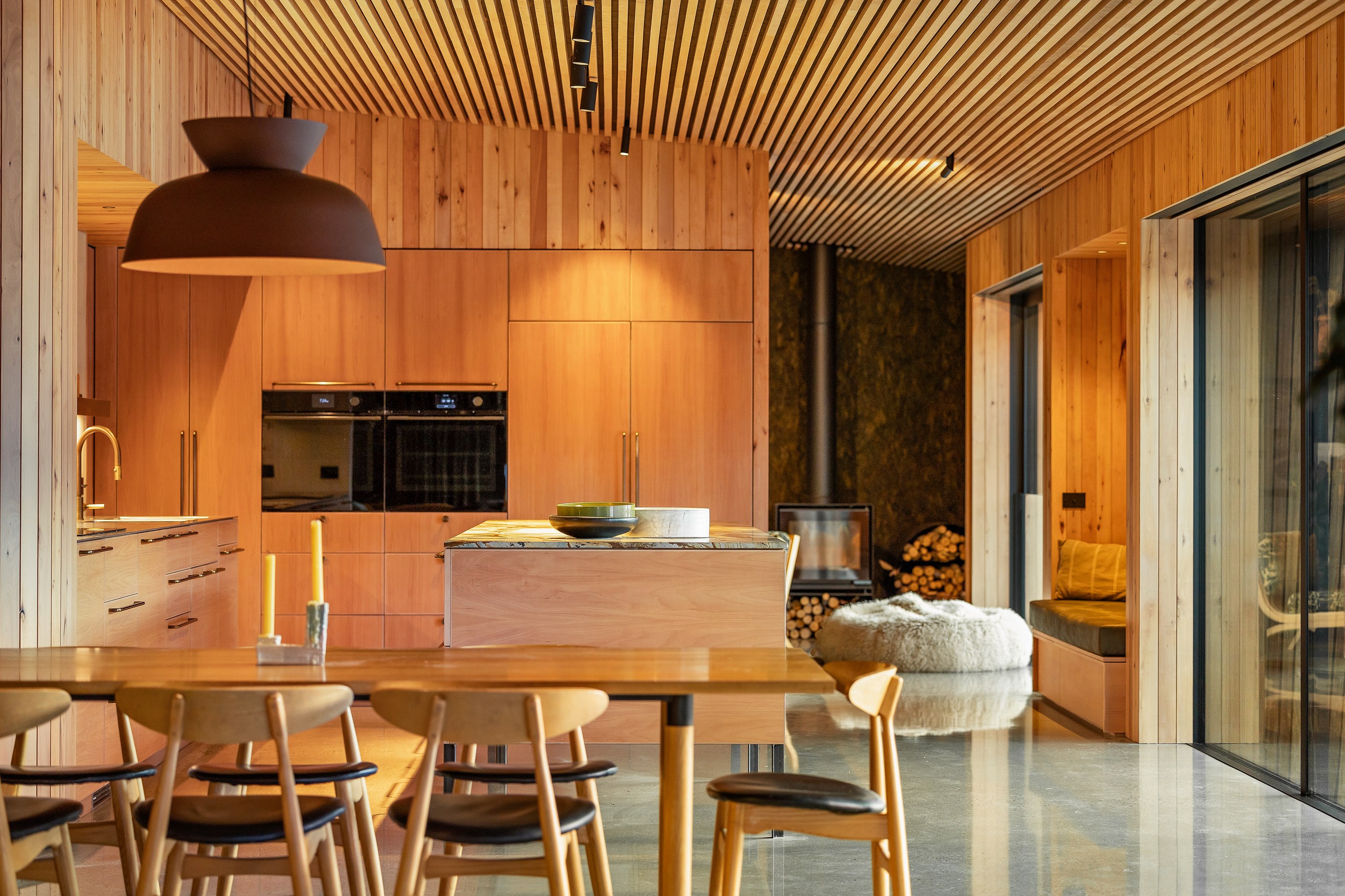 Each of the three levels has its own personality, while rustic timbers and a courtyard formed around schist boulders and steel web forge grating pique the interest, drawing inspiration from New Zealand’s agricultural heritage. Continuity and cohesion come courtesy of recycled Australian timber cladding, soffits and rainscreens, and a roof plane mimics the contours of the landscape. No doubt, this is a home of great beauty, but it also excels in myriad other ways. It’s warm, healthy, energy efficient and highly automated. Locally manufactured prefabricated wall and roof panels were utilised to improve efficiency. Passive design principals were adhered to, and the house features include an air-to-water heat pump with costs offset by solar panels, carefully orientated windows with triple glazing, and a mechanical ventilation system. These add up to a home that will stand the test of time.