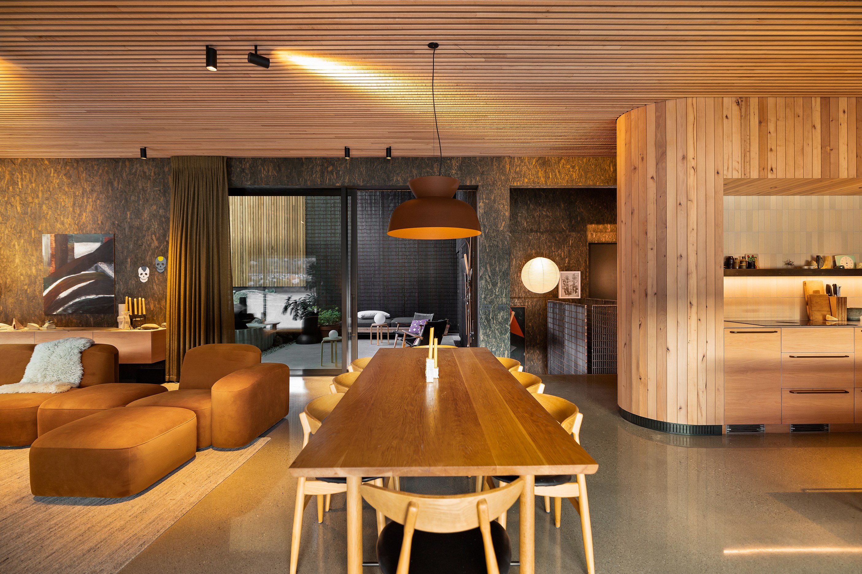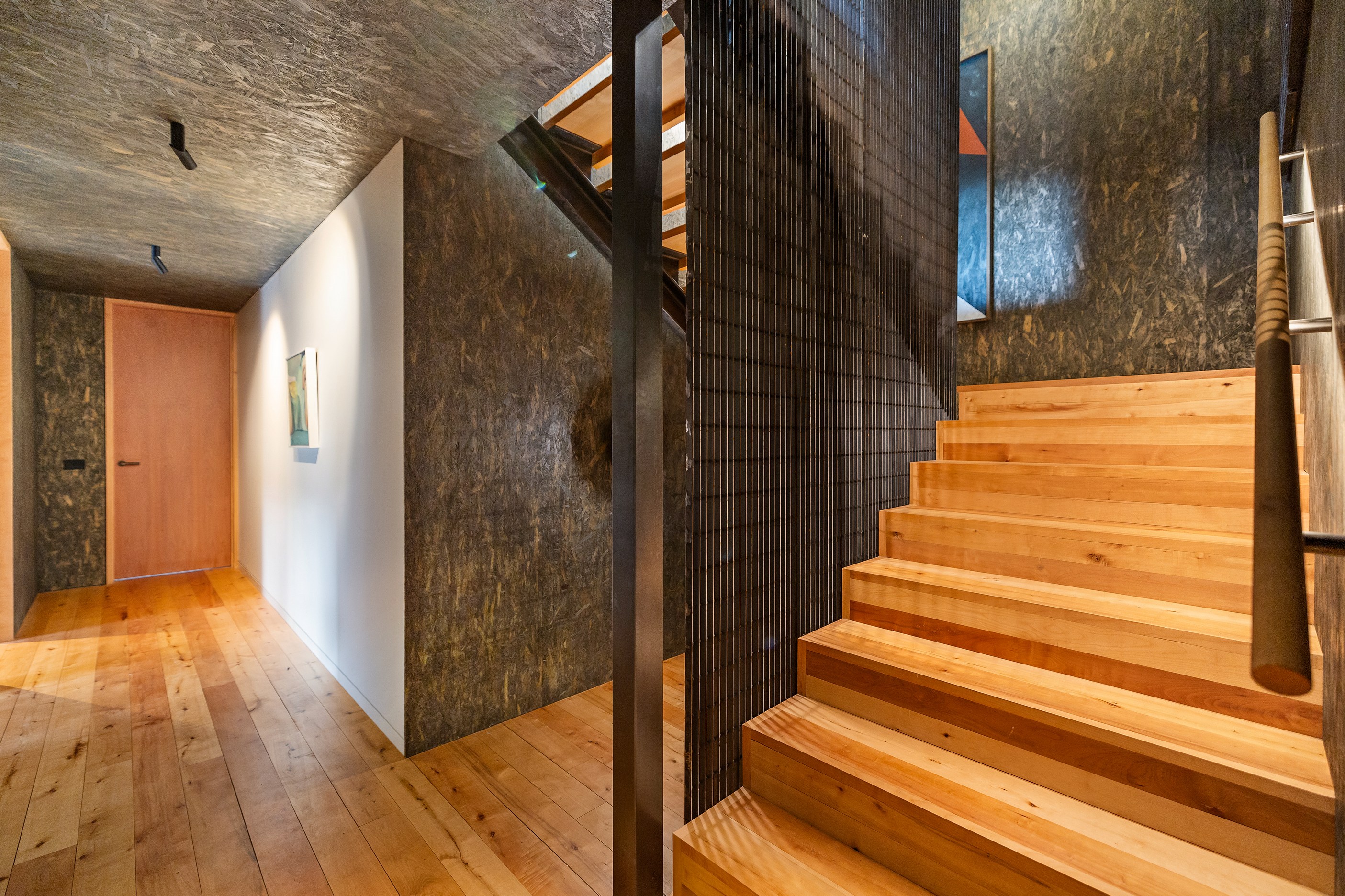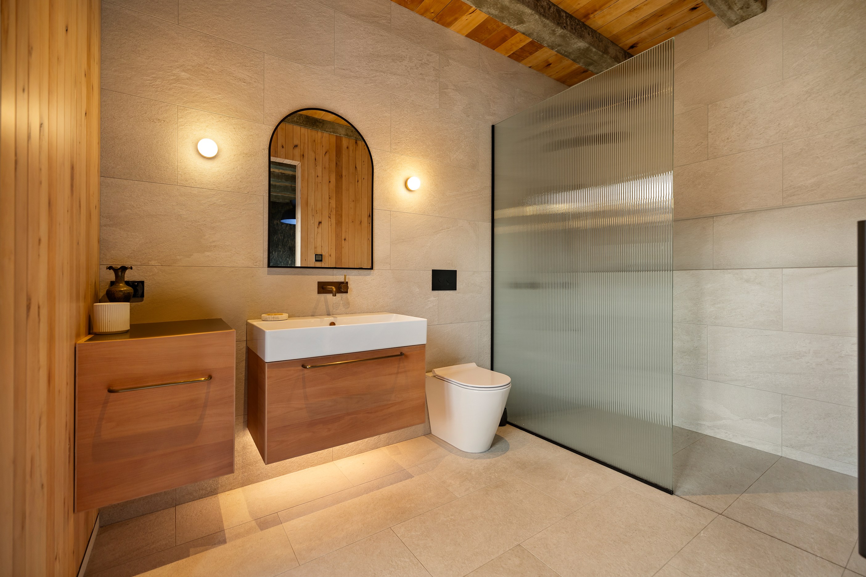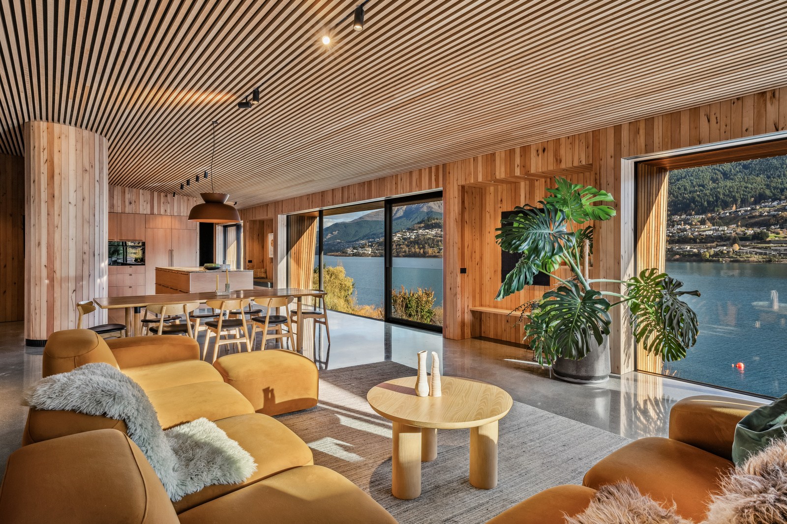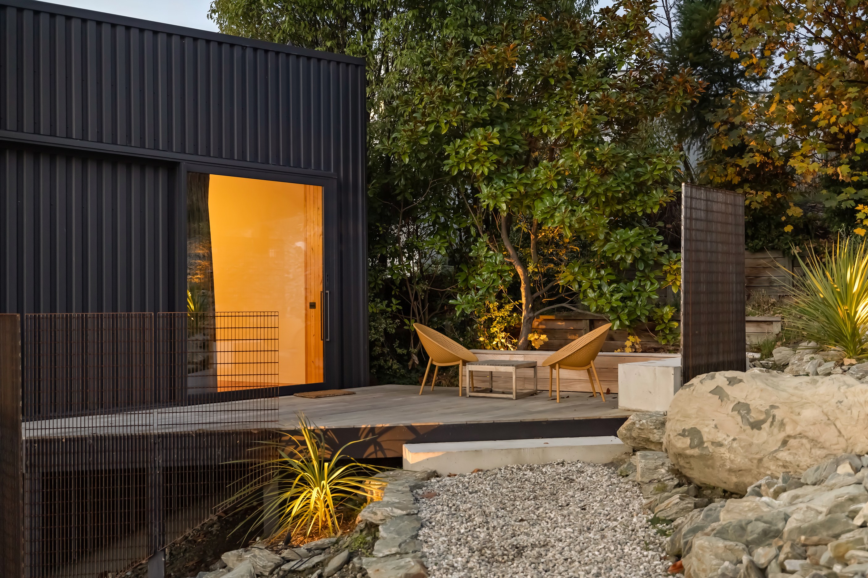 Each of the three levels has its own personality, while rustic timbers and a courtyard formed around schist boulders and steel web forge grating pique the interest, drawing inspiration from New Zealand’s agricultural heritage. Continuity and cohesion come courtesy of recycled Australian timber cladding, soffits and rainscreens, and a roof plane mimics the contours of the landscape. No doubt, this is a home of great beauty, but it also excels in myriad other ways. It’s warm, healthy, energy efficient and highly automated. Locally manufactured prefabricated wall and roof panels were utilised to improve efficiency. Passive design principals were adhered to, and the house features include an air-to-water heat pump with costs offset by solar panels, carefully orientated windows with triple glazing, and a mechanical ventilation system. These add up to a home that will stand the test of time.