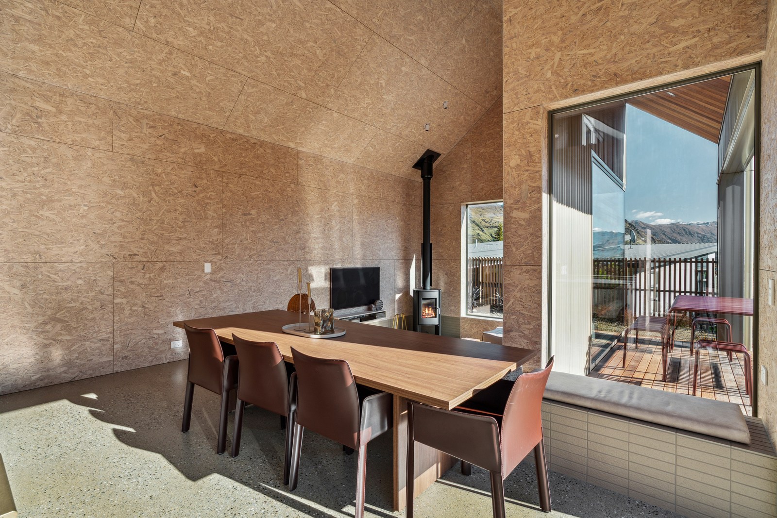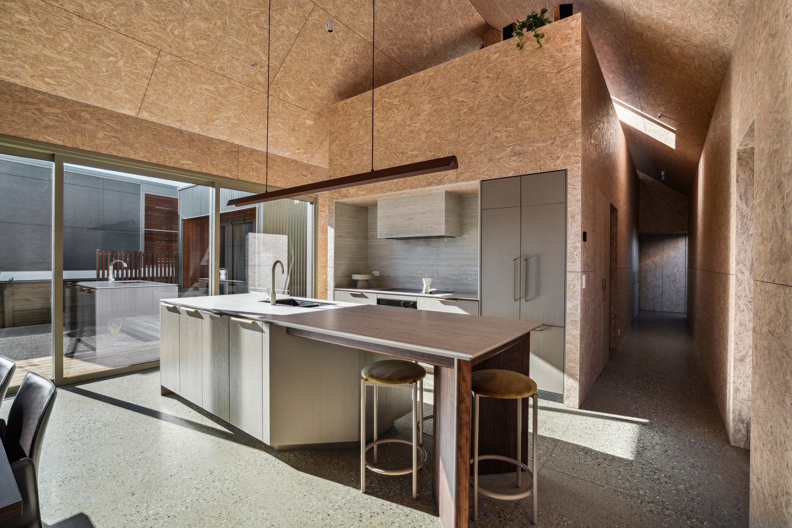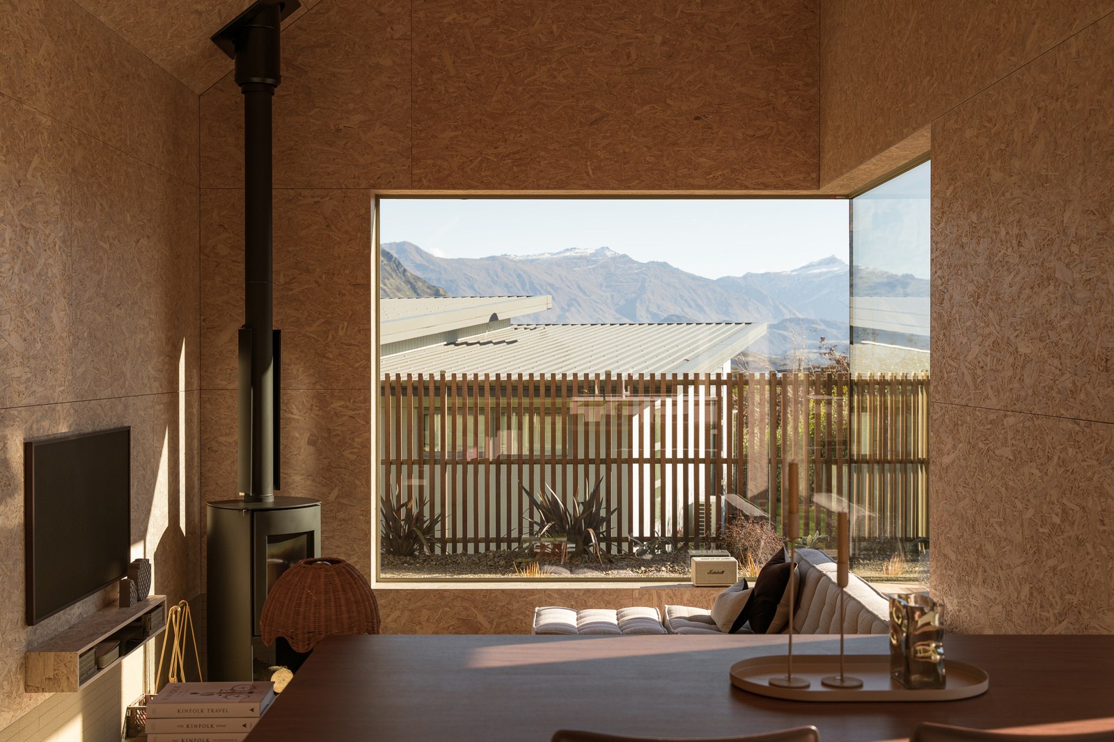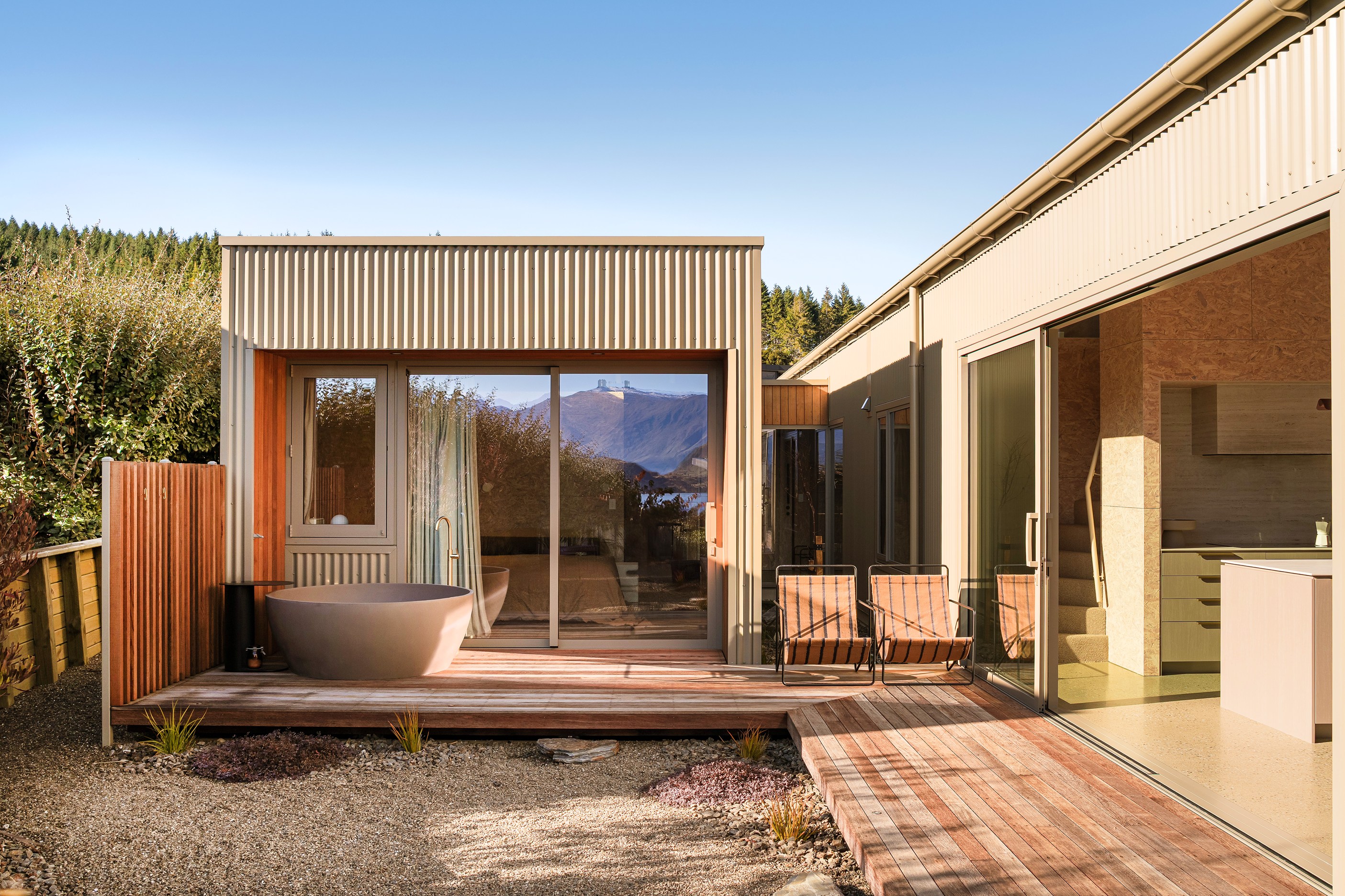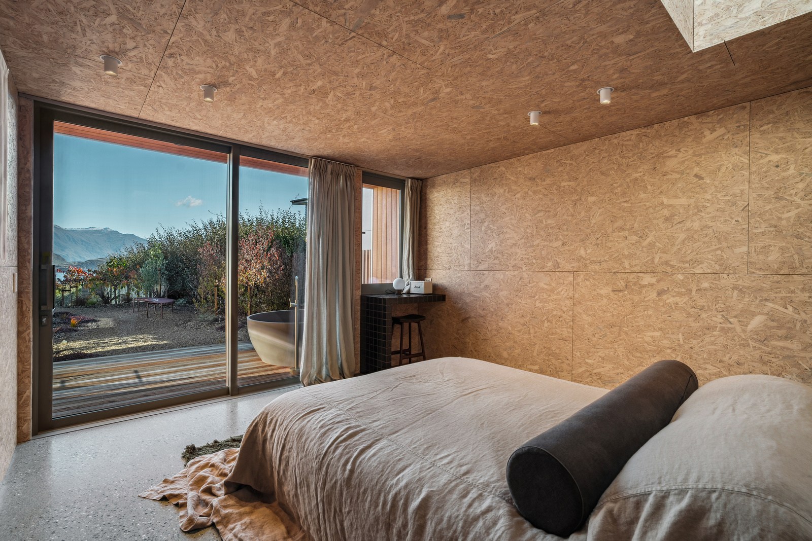 The interior, lined in oriented strand board, is equally stylish and thoughtful. So well positioned are windows and other glazing that stepping inside is like stepping outside. Finishes, too, echo the colours of the land — polished concrete floors, walnut-toned joinery and earthy handmade tiles. The clever layout divides the main bedroom from the rest of the house. You’ll find an ensuite, dressing room and its own deck with the ultimate in outdoor decadence — a bath. In the other wing are two luxe bedrooms — one with an ensuite, the other accessing a separate bathroom, and the open-plan kitchen, dining and living zone with sunken lounge and mezzanine floor. For the people who live here, this home is an invitation to pause and reconnect with the beauty on their doorstep.