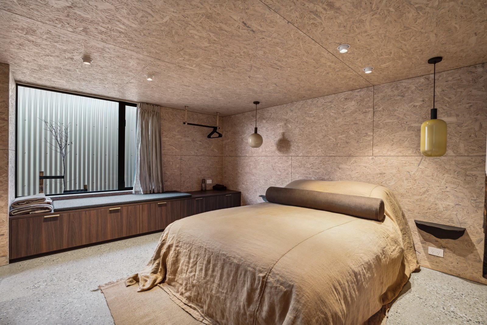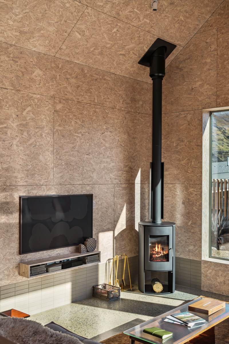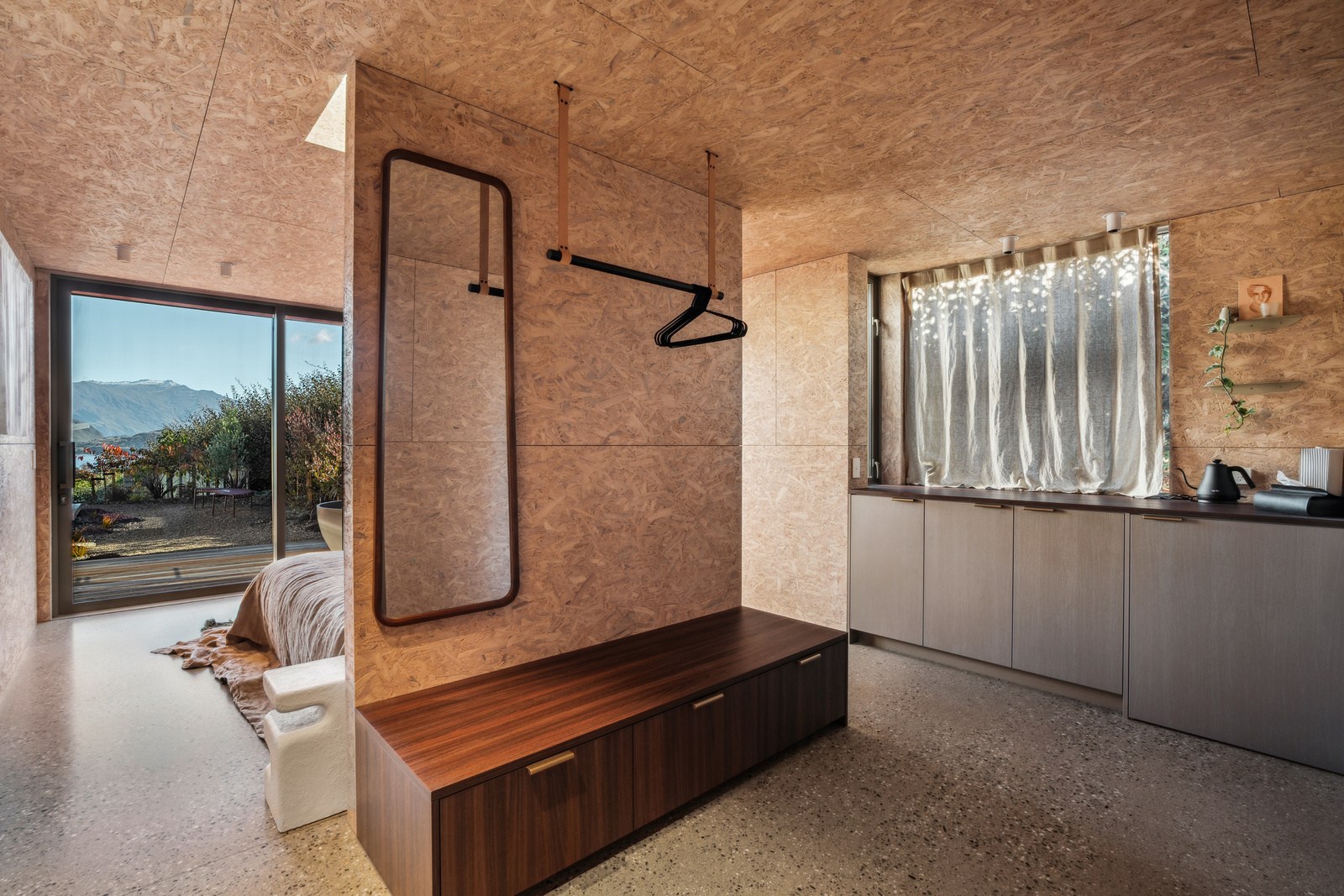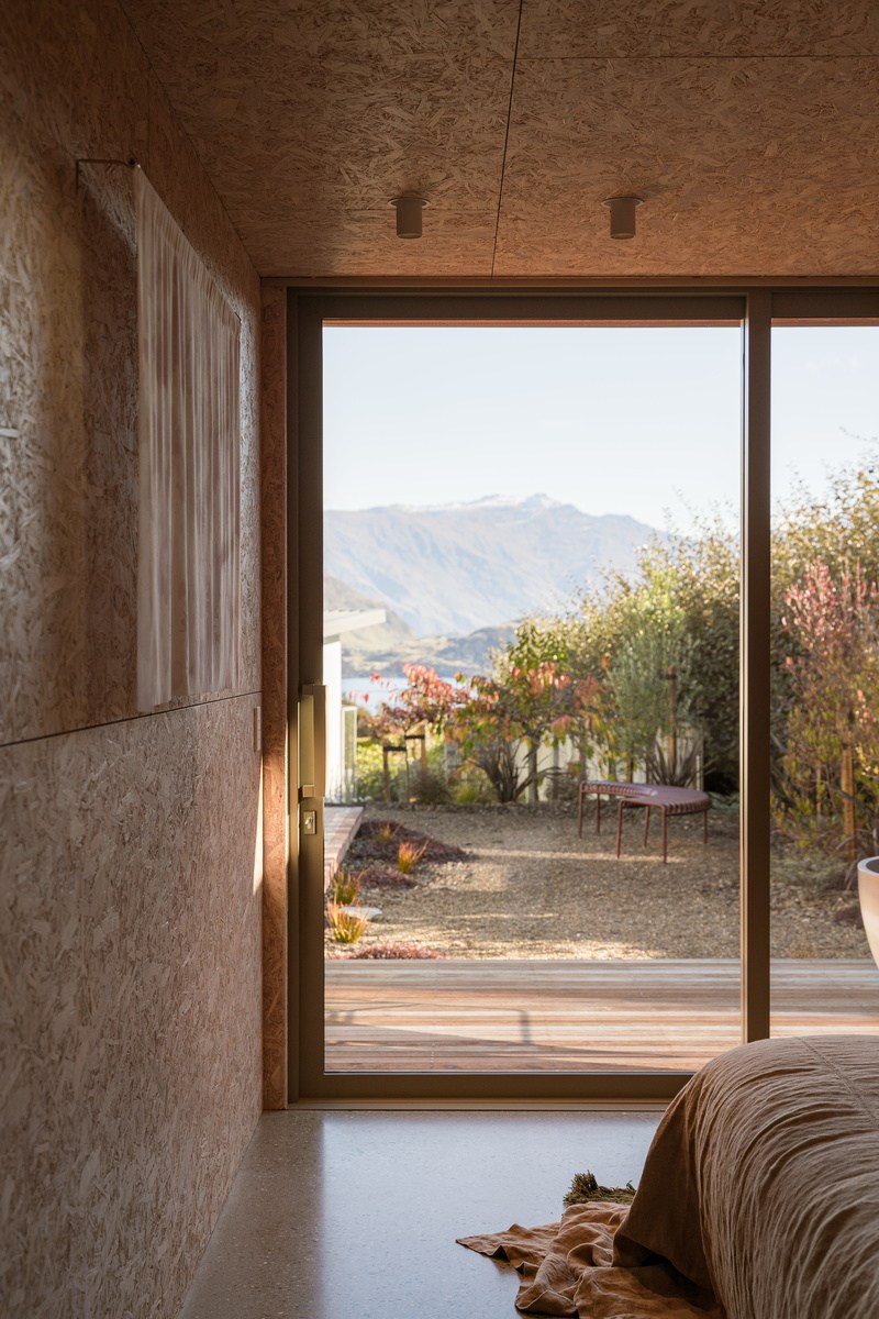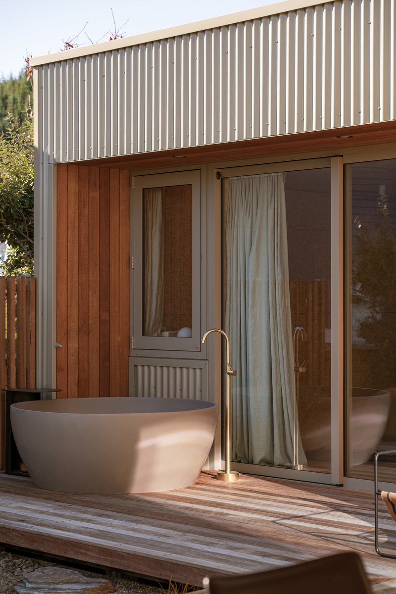 The interior, lined in oriented strand board, is equally stylish and thoughtful. So well positioned are windows and other glazing that stepping inside is like stepping outside. Finishes, too, echo the colours of the land — polished concrete floors, walnut-toned joinery and earthy handmade tiles. The clever layout divides the main bedroom from the rest of the house. You’ll find an ensuite, dressing room and its own deck with the ultimate in outdoor decadence — a bath. In the other wing are two luxe bedrooms — one with an ensuite, the other accessing a separate bathroom, and the open-plan kitchen, dining and living zone with sunken lounge and mezzanine floor. For the people who live here, this home is an invitation to pause and reconnect with the beauty on their doorstep.