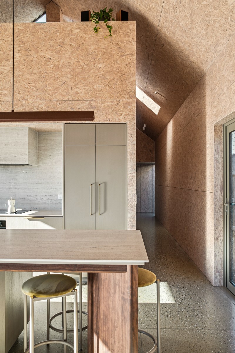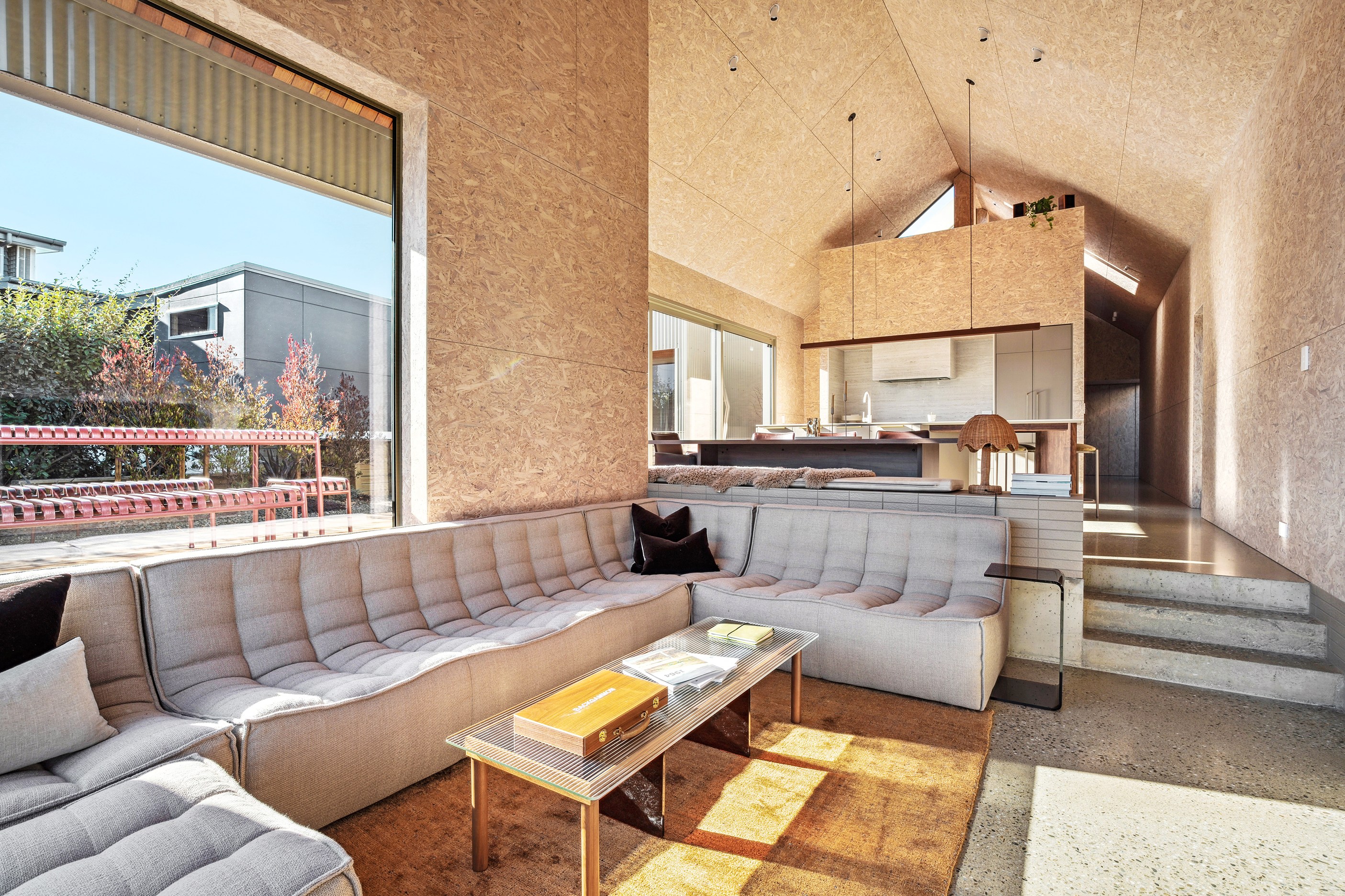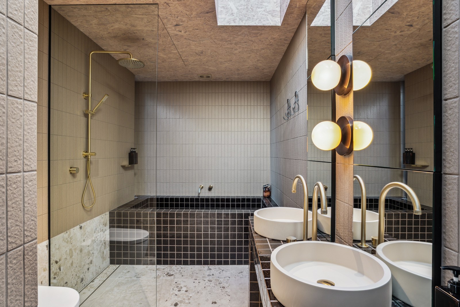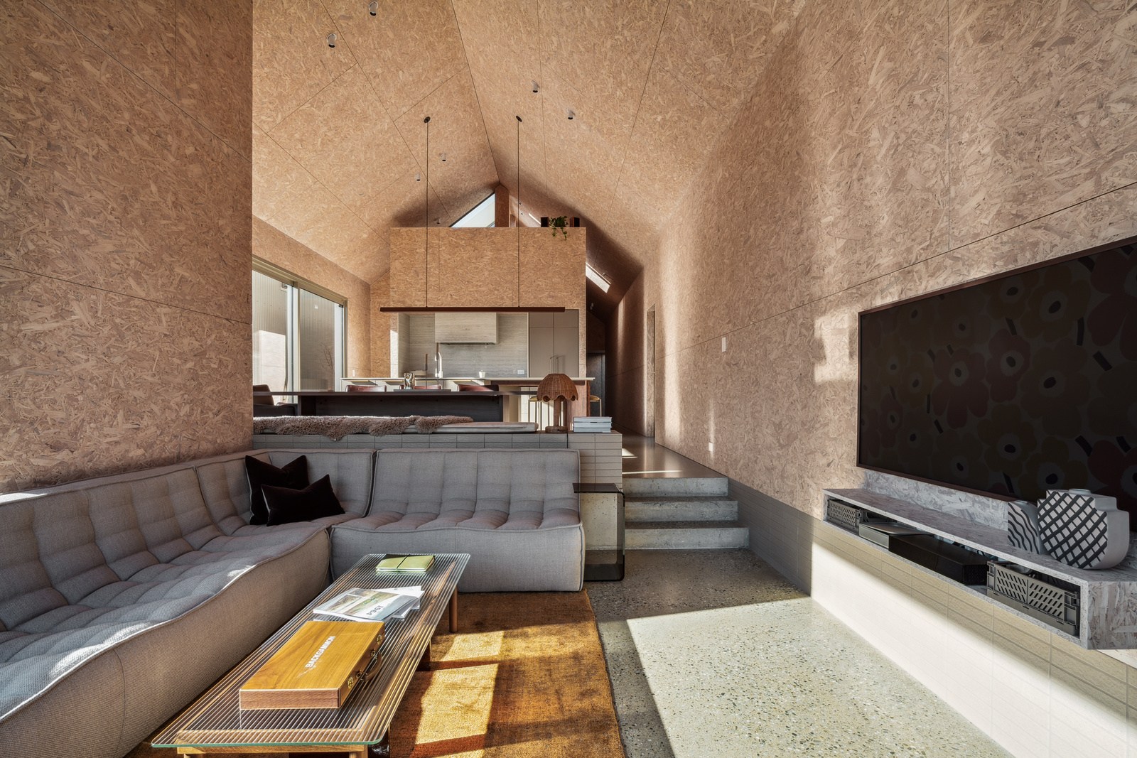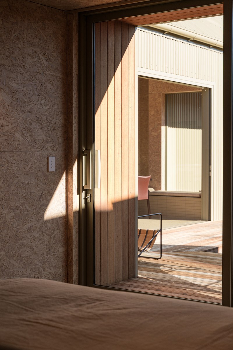 The interior, lined in oriented strand board, is equally stylish and thoughtful. So well positioned are windows and other glazing that stepping inside is like stepping outside. Finishes, too, echo the colours of the land — polished concrete floors, walnut-toned joinery and earthy handmade tiles. The clever layout divides the main bedroom from the rest of the house. You’ll find an ensuite, dressing room and its own deck with the ultimate in outdoor decadence — a bath. In the other wing are two luxe bedrooms — one with an ensuite, the other accessing a separate bathroom, and the open-plan kitchen, dining and living zone with sunken lounge and mezzanine floor. For the people who live here, this home is an invitation to pause and reconnect with the beauty on their doorstep.