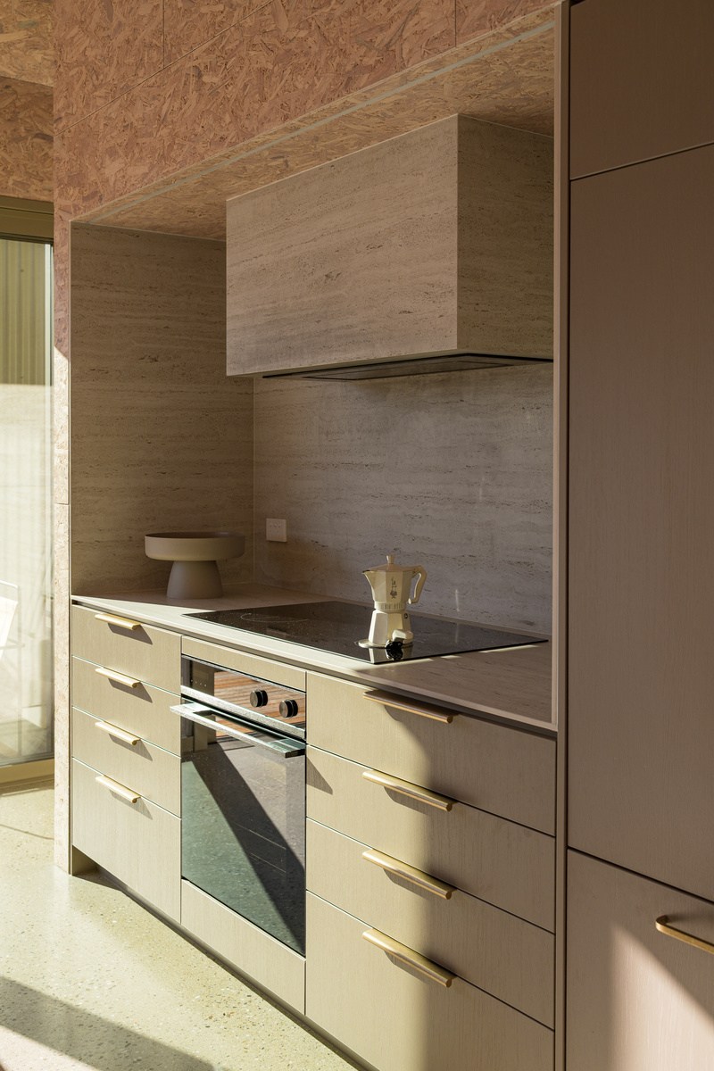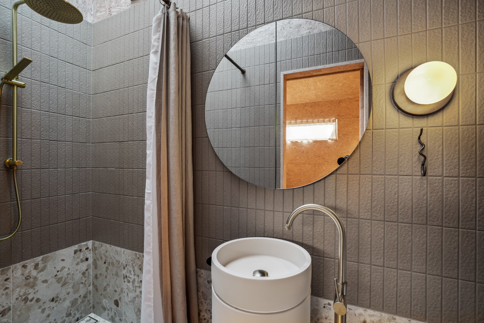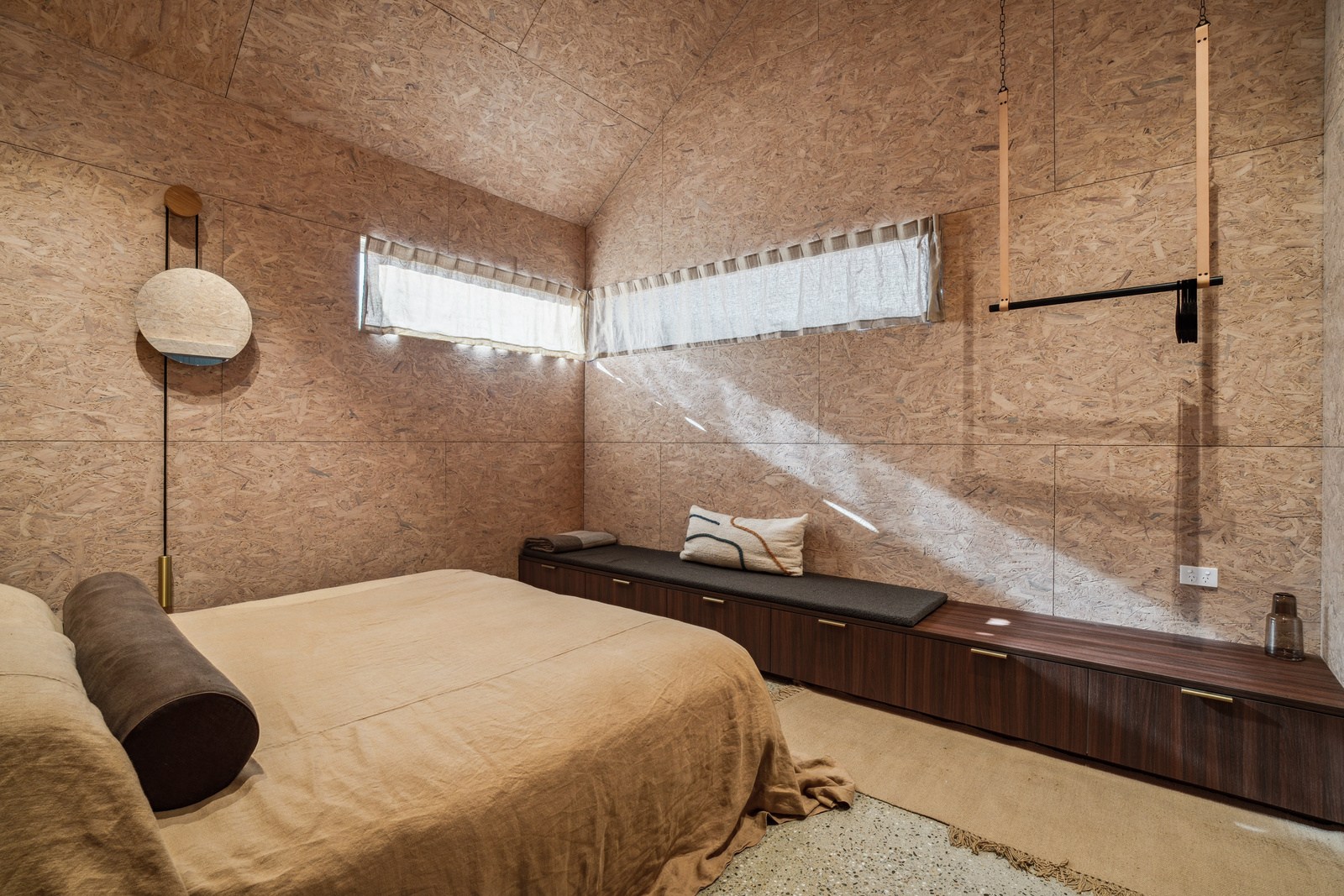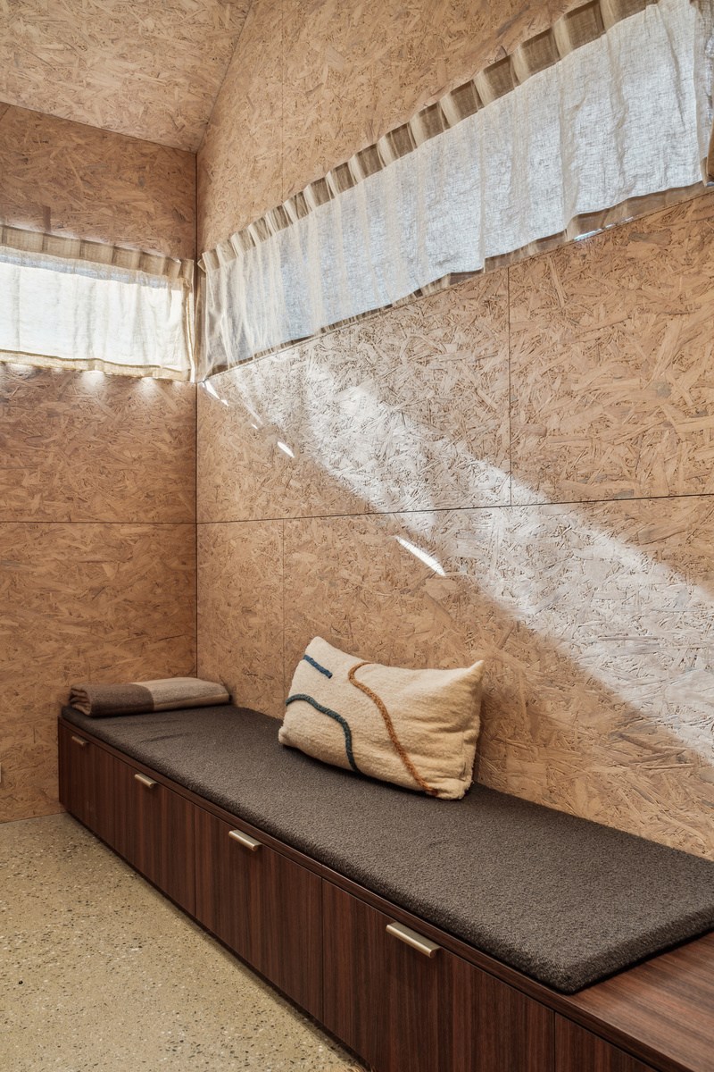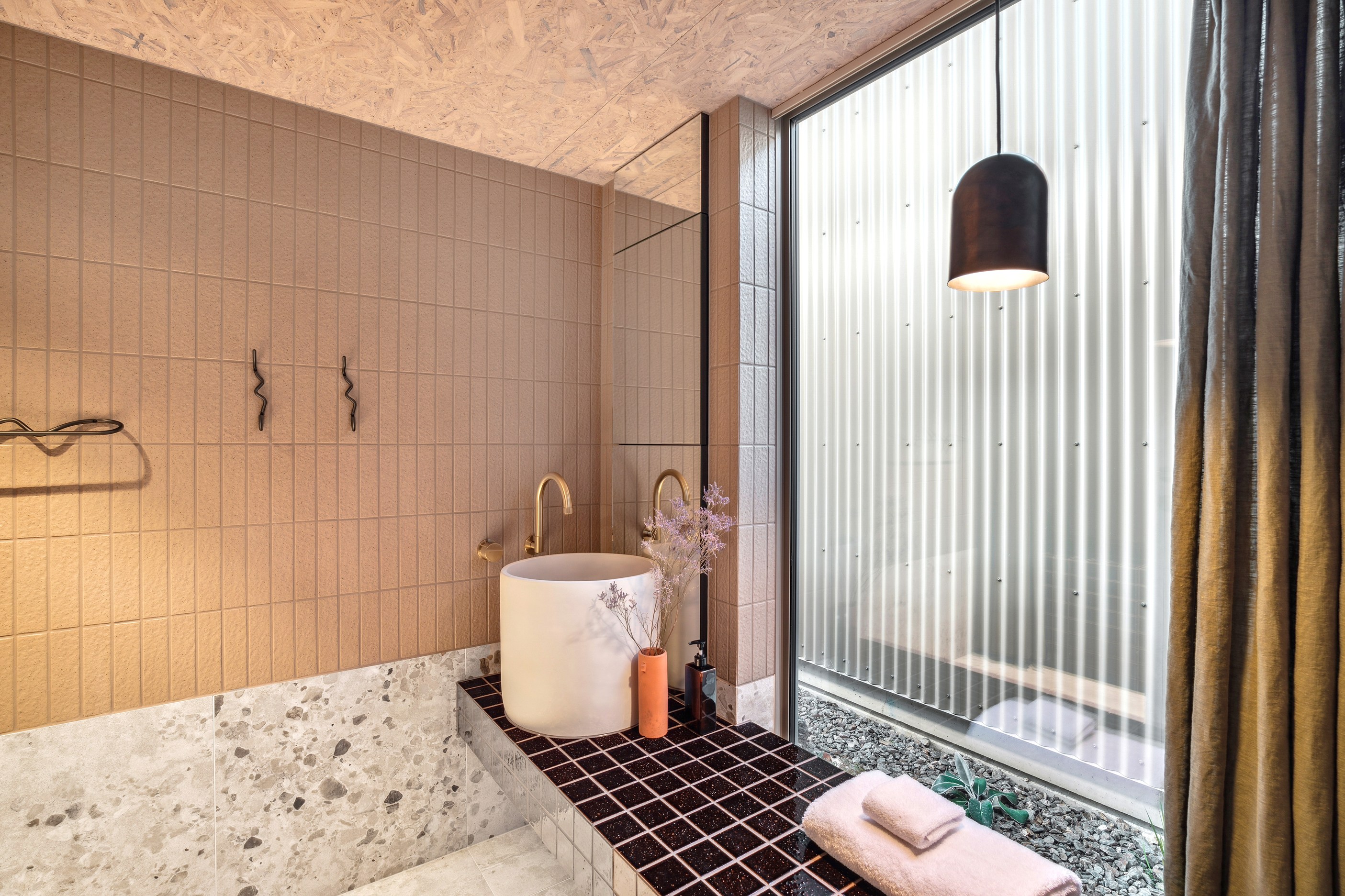 The interior, lined in oriented strand board, is equally stylish and thoughtful. So well positioned are windows and other glazing that stepping inside is like stepping outside. Finishes, too, echo the colours of the land — polished concrete floors, walnut-toned joinery and earthy handmade tiles. The clever layout divides the main bedroom from the rest of the house. You’ll find an ensuite, dressing room and its own deck with the ultimate in outdoor decadence — a bath. In the other wing are two luxe bedrooms — one with an ensuite, the other accessing a separate bathroom, and the open-plan kitchen, dining and living zone with sunken lounge and mezzanine floor. For the people who live here, this home is an invitation to pause and reconnect with the beauty on their doorstep.