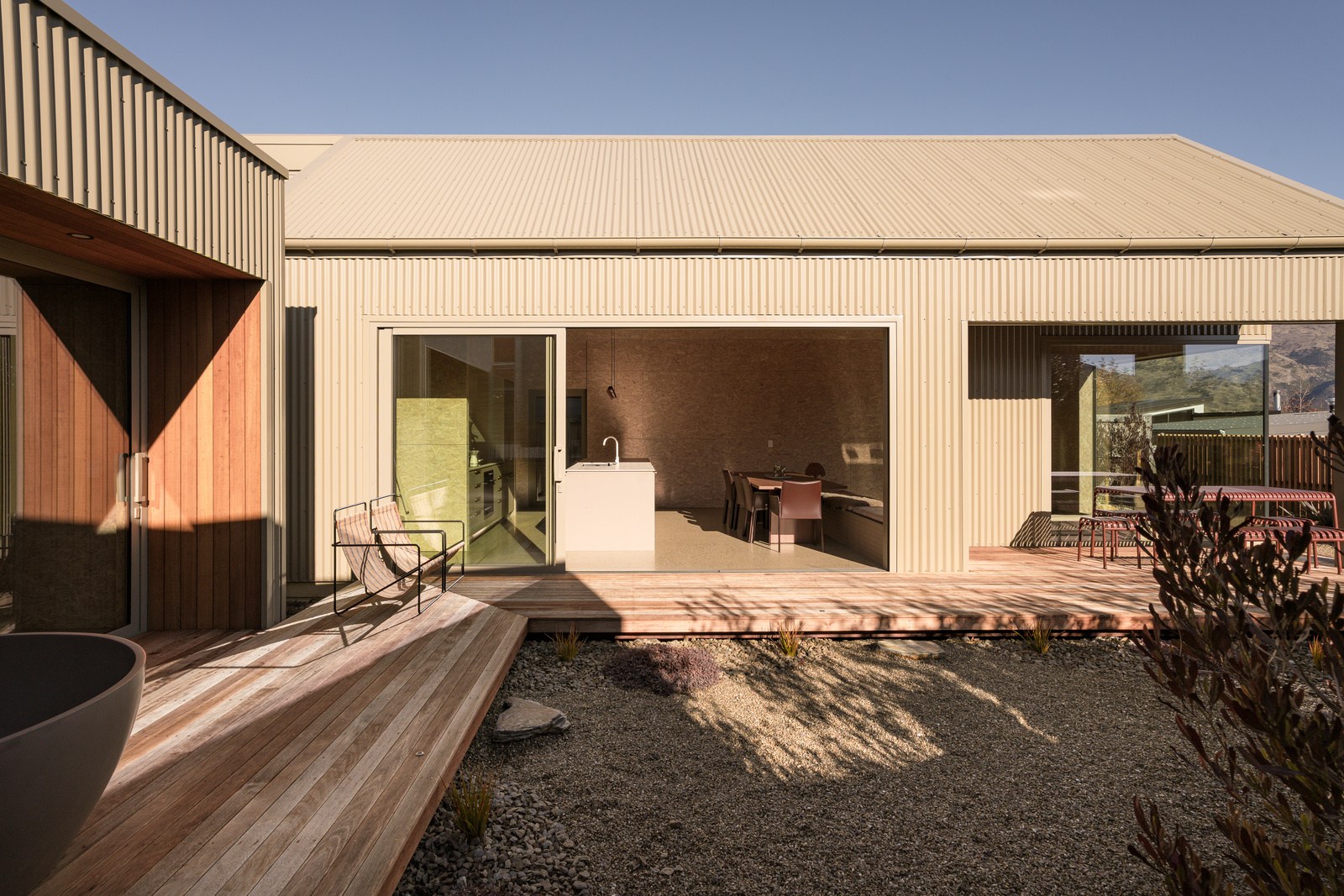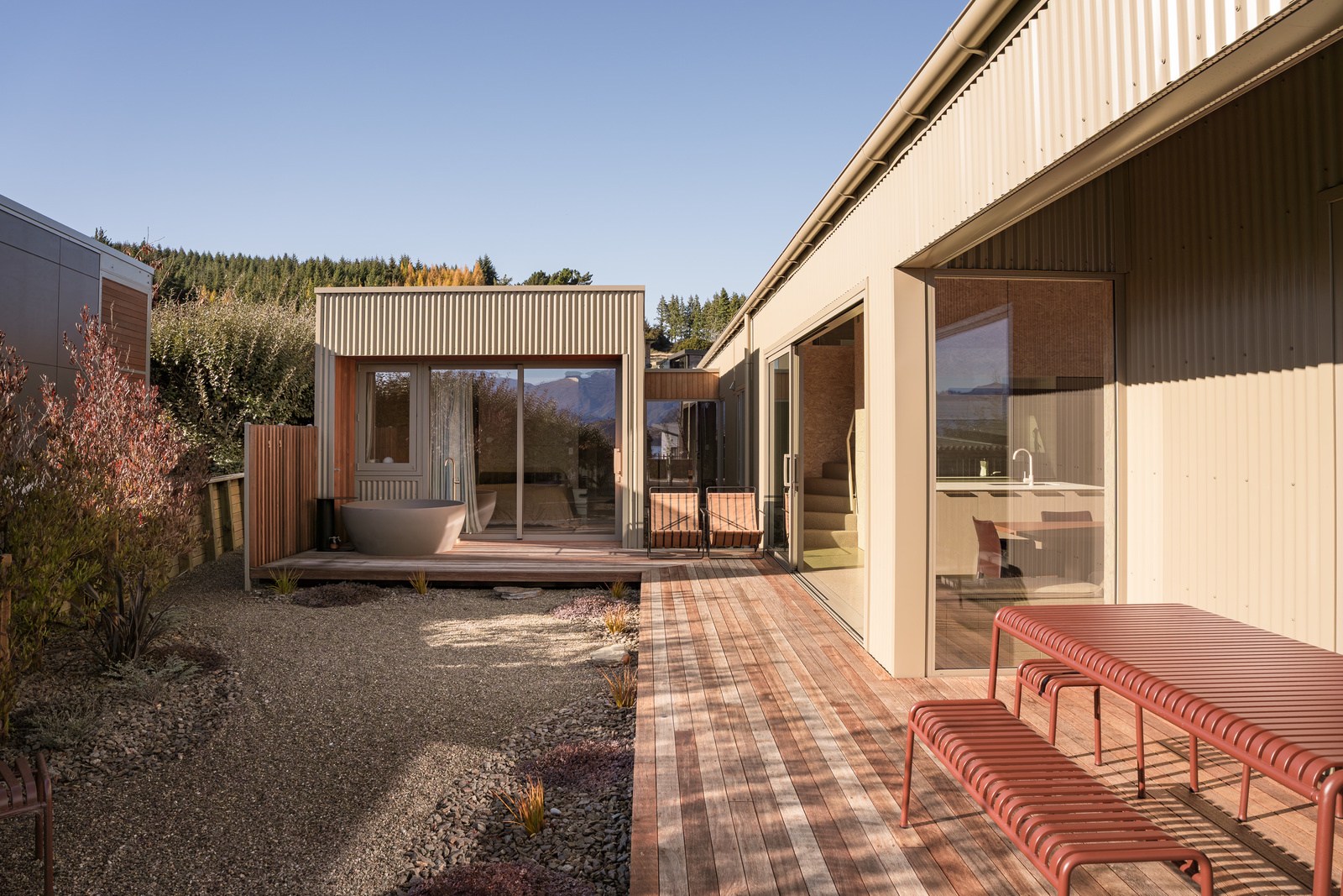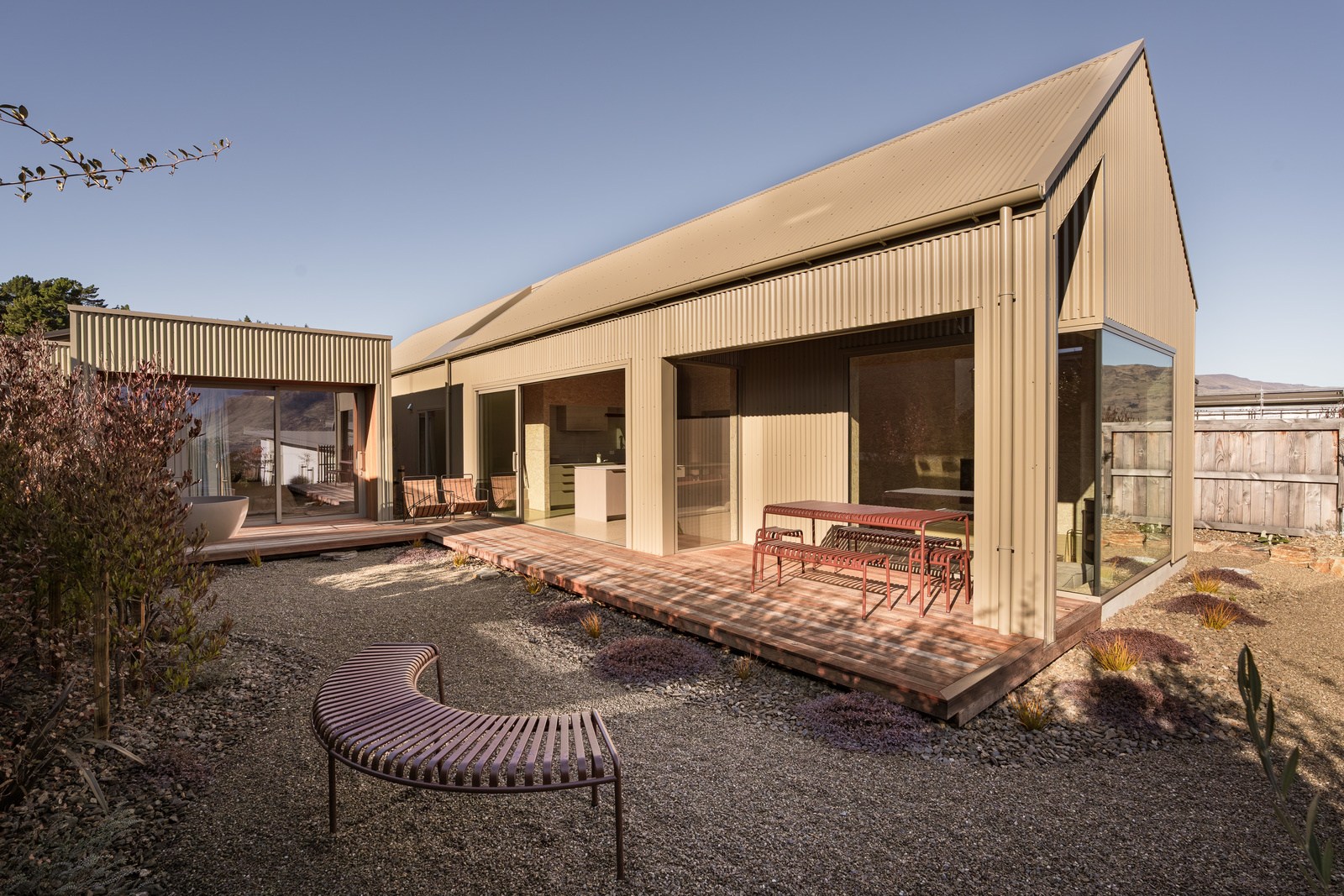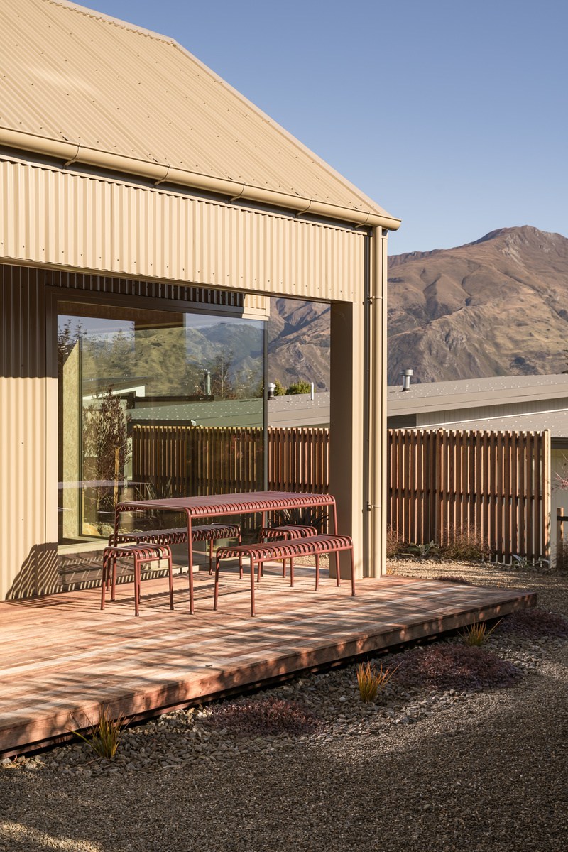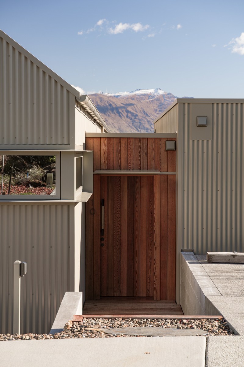 In this 176sqm house, the environment is reflected and embraced. When you live in a special place such as Central Otago, you don’t need a home that competes with what nature has delivered. That’s not to say this three-bedroom property is without character or visual appeal. Far from it. Traditional alpine architecture has been reimagined and given a contemporary edge. The result is in tune with its surrounds, but with deluxe and designer touches in exactly the right places. A coloured steel exterior, painted in Lichen, settles the two wings — one with a pitched roof, the other flat — into the landscape, then eases into the cedar at the entrance.