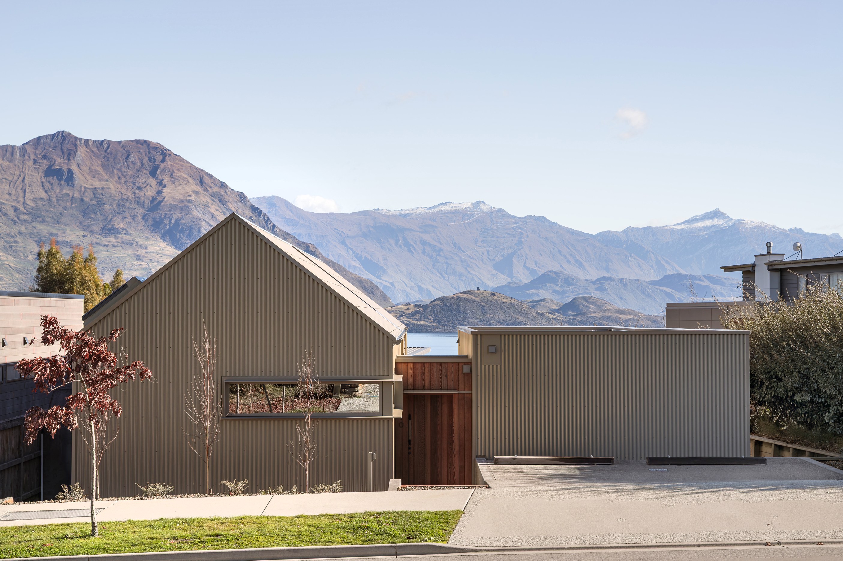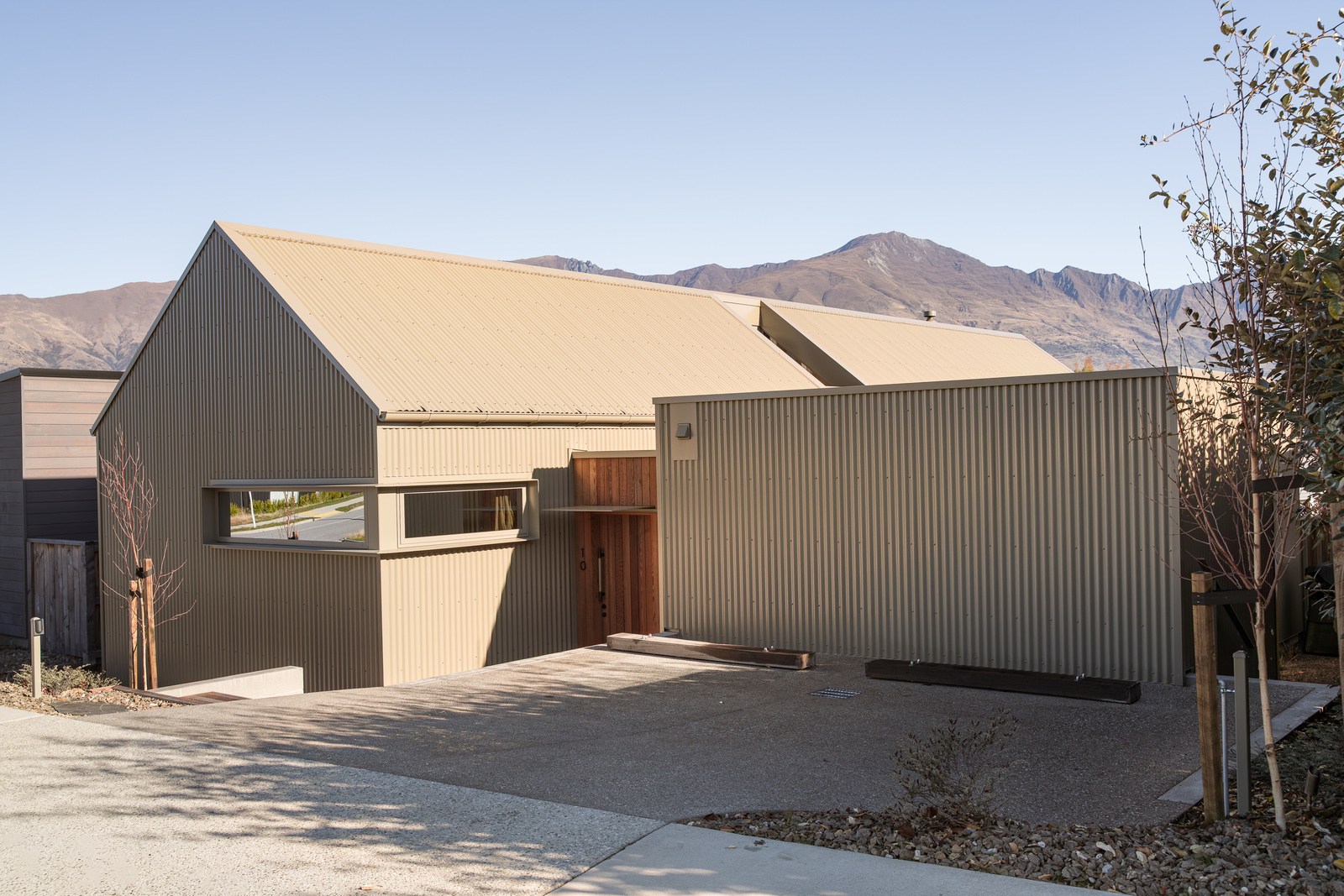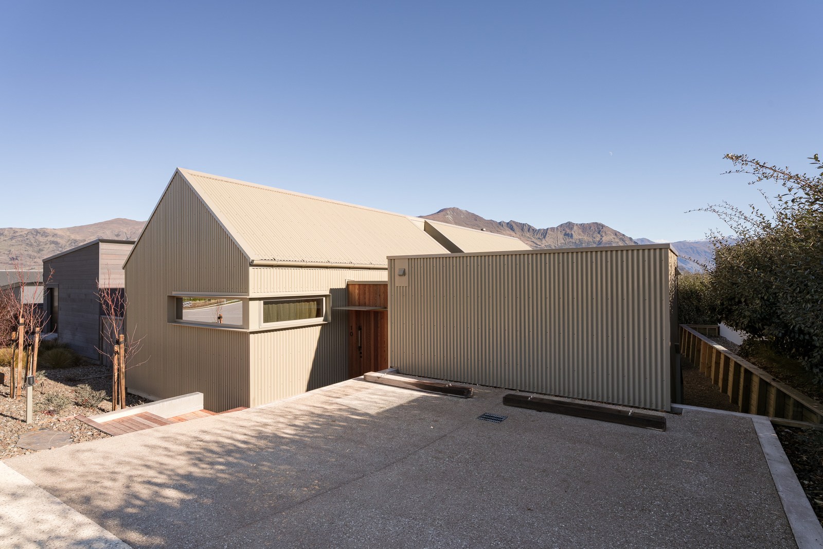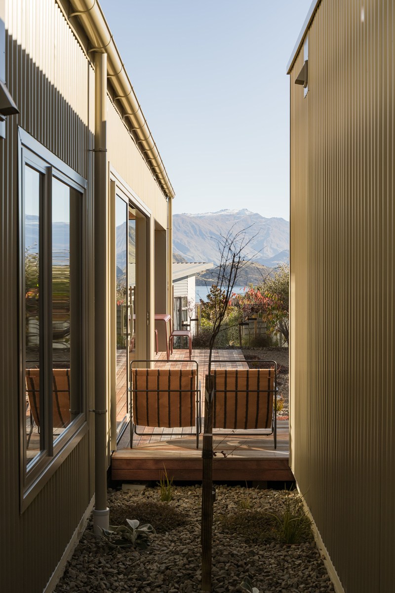 In this 176sqm house, the environment is reflected and embraced. When you live in a special place such as Central Otago, you don’t need a home that competes with what nature has delivered. That’s not to say this three-bedroom property is without character or visual appeal. Far from it. Traditional alpine architecture has been reimagined and given a contemporary edge. The result is in tune with its surrounds, but with deluxe and designer touches in exactly the right places. A coloured steel exterior, painted in Lichen, settles the two wings — one with a pitched roof, the other flat — into the landscape, then eases into the cedar at the entrance.