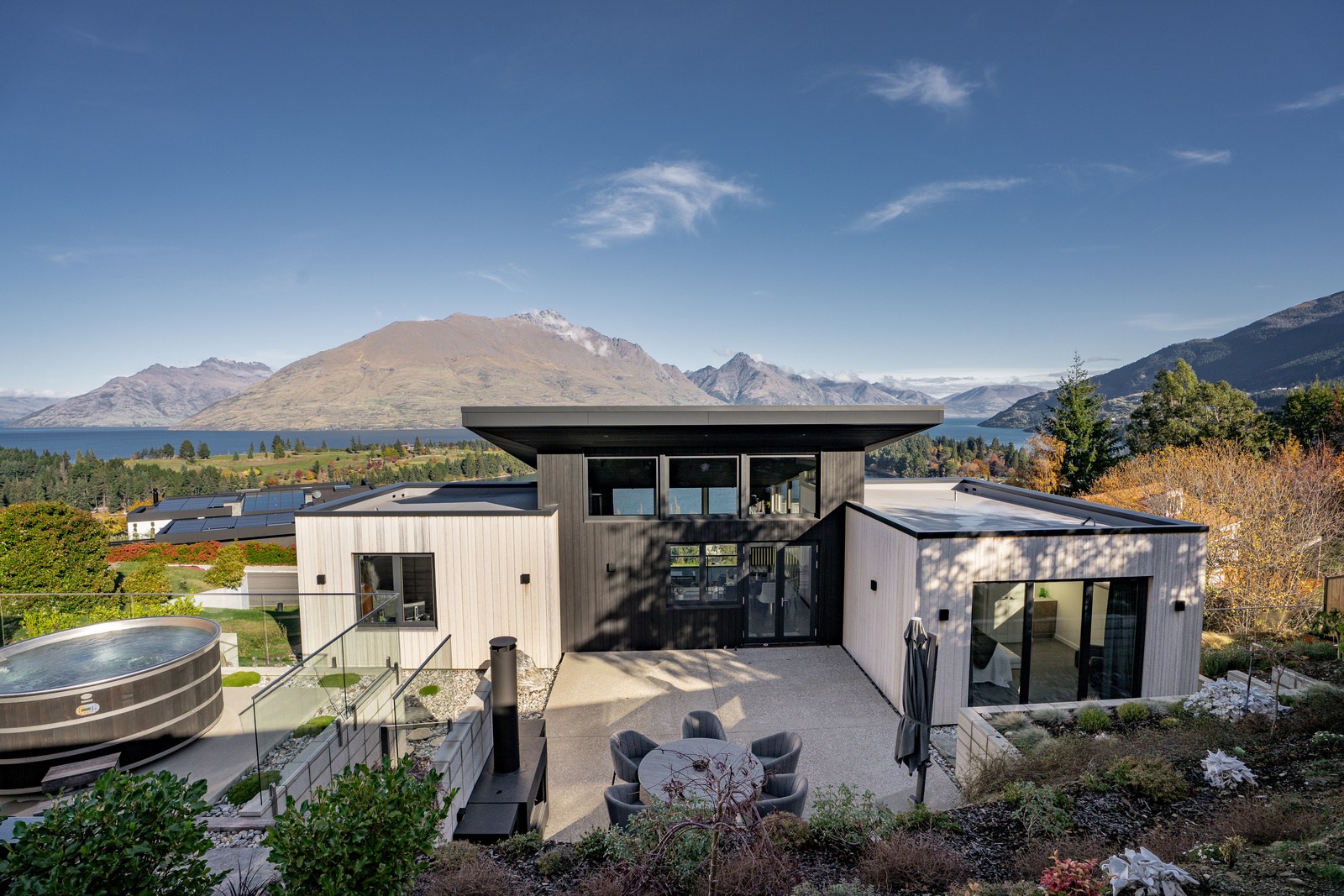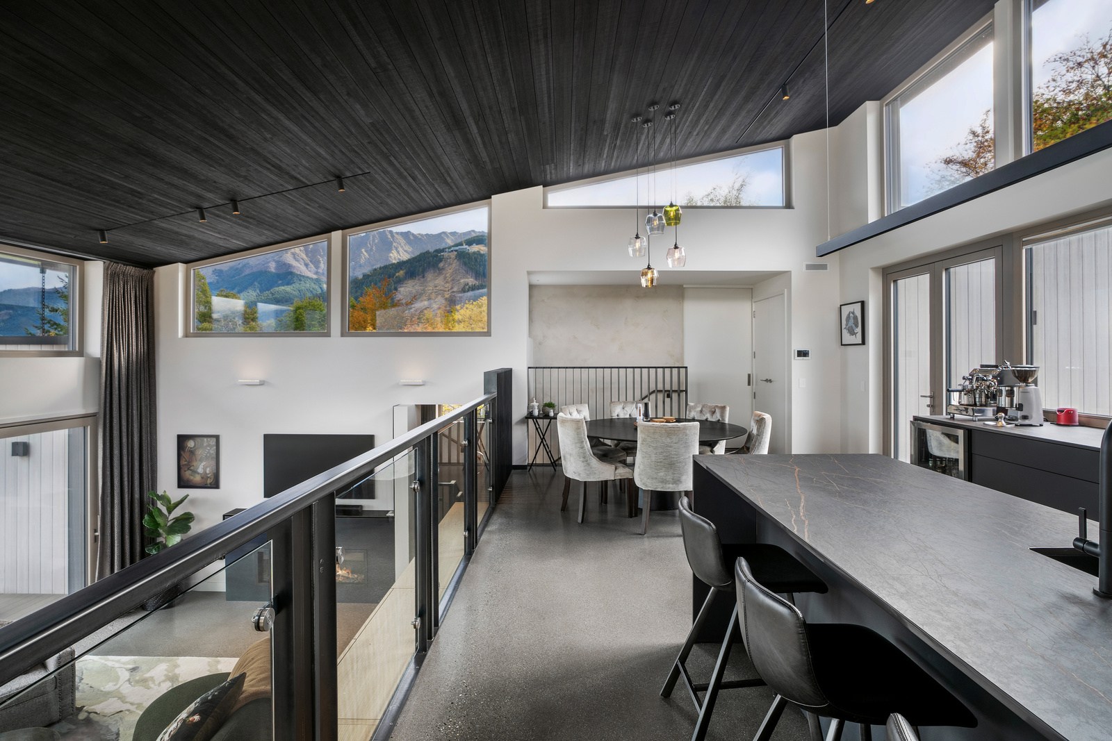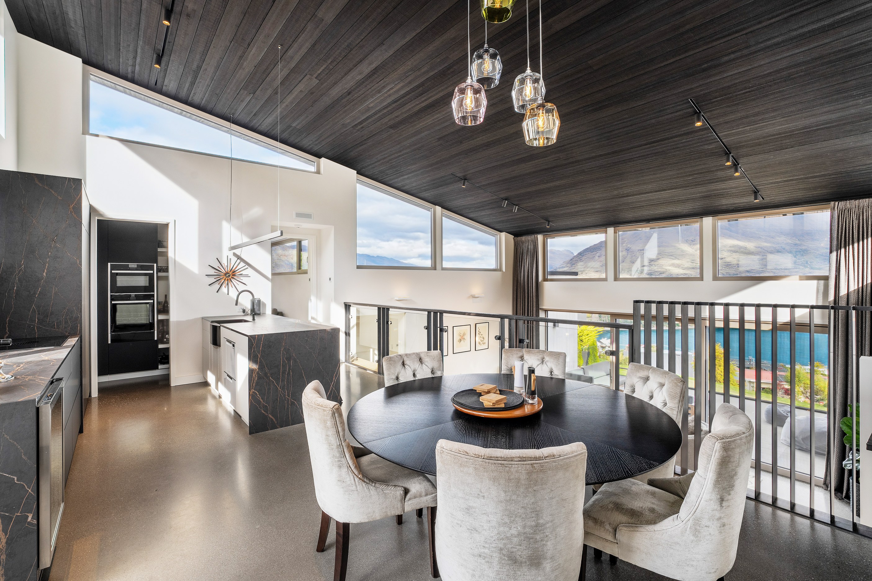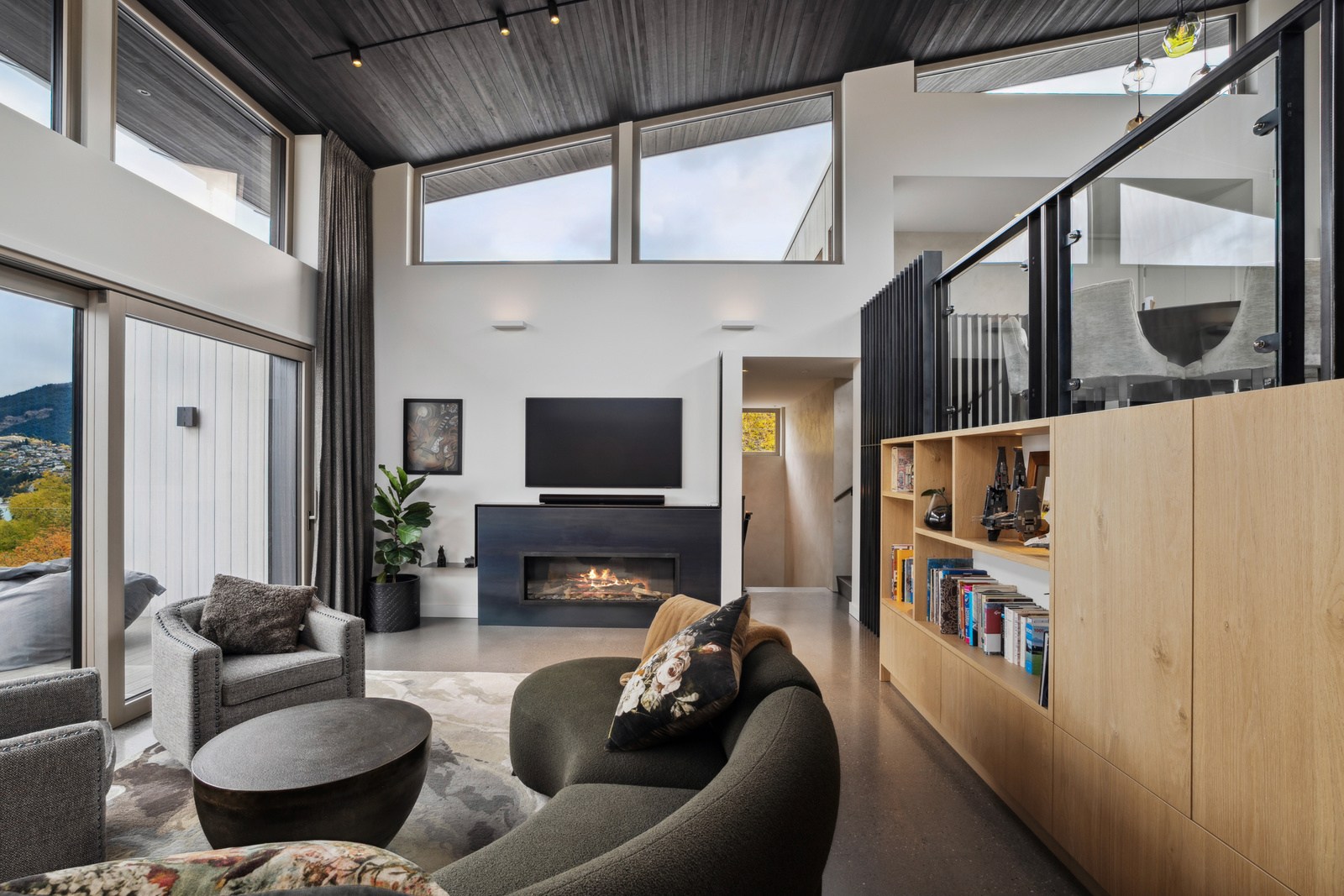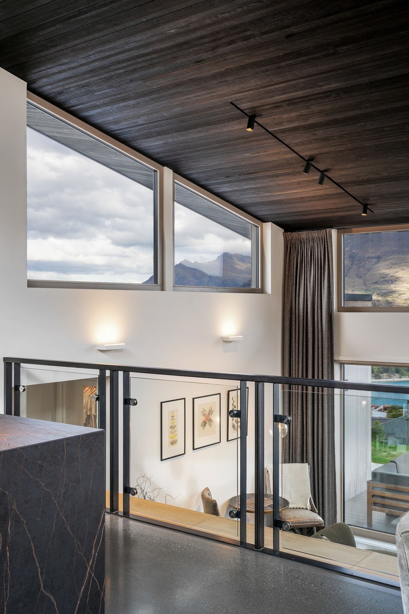 Views and performance were paramount to the success of this home, and it shows. The spectacular lake and alpine vistas have been expertly captured in this four-bedroom sanctuary. The 385sqm split-level house is pivoted on the site, and has subtle cantilevers and bespoke windows to maximise the 270-degree outlook. From the street, the house appears settled into its section, yet twists the architectural language of the neighbourhood. The black ceiling, which matches the sloping external soffit, draws the eye out to the views. The entry below leads to a foyer with a steel-battened screen beside the steel, oak and glass stairs, which open into a nearly six-metre high ceiling.