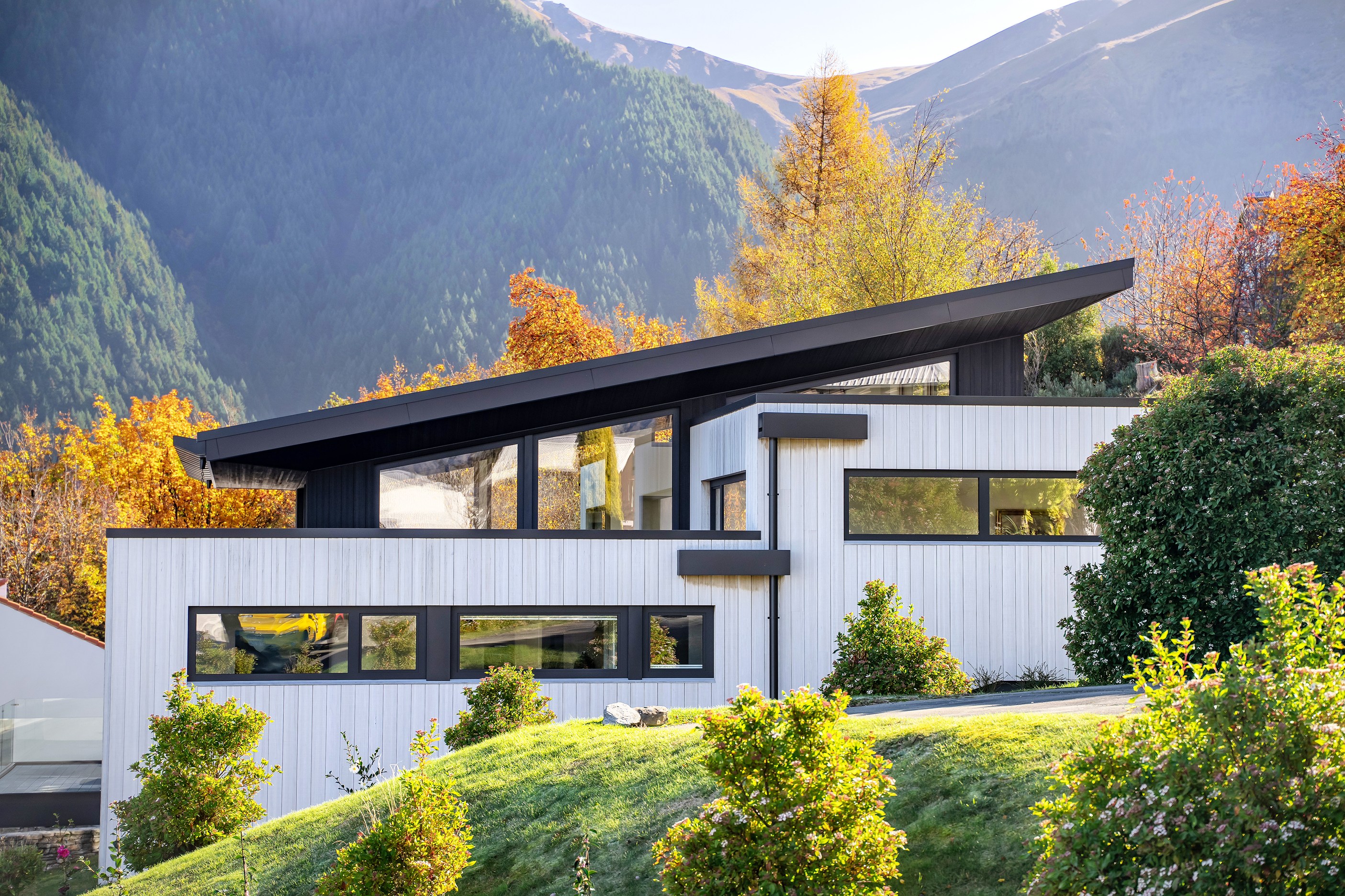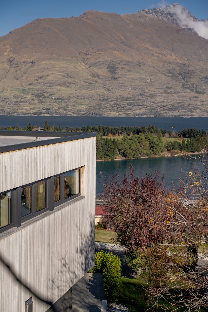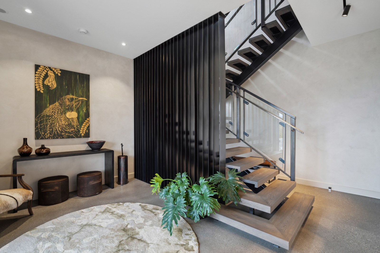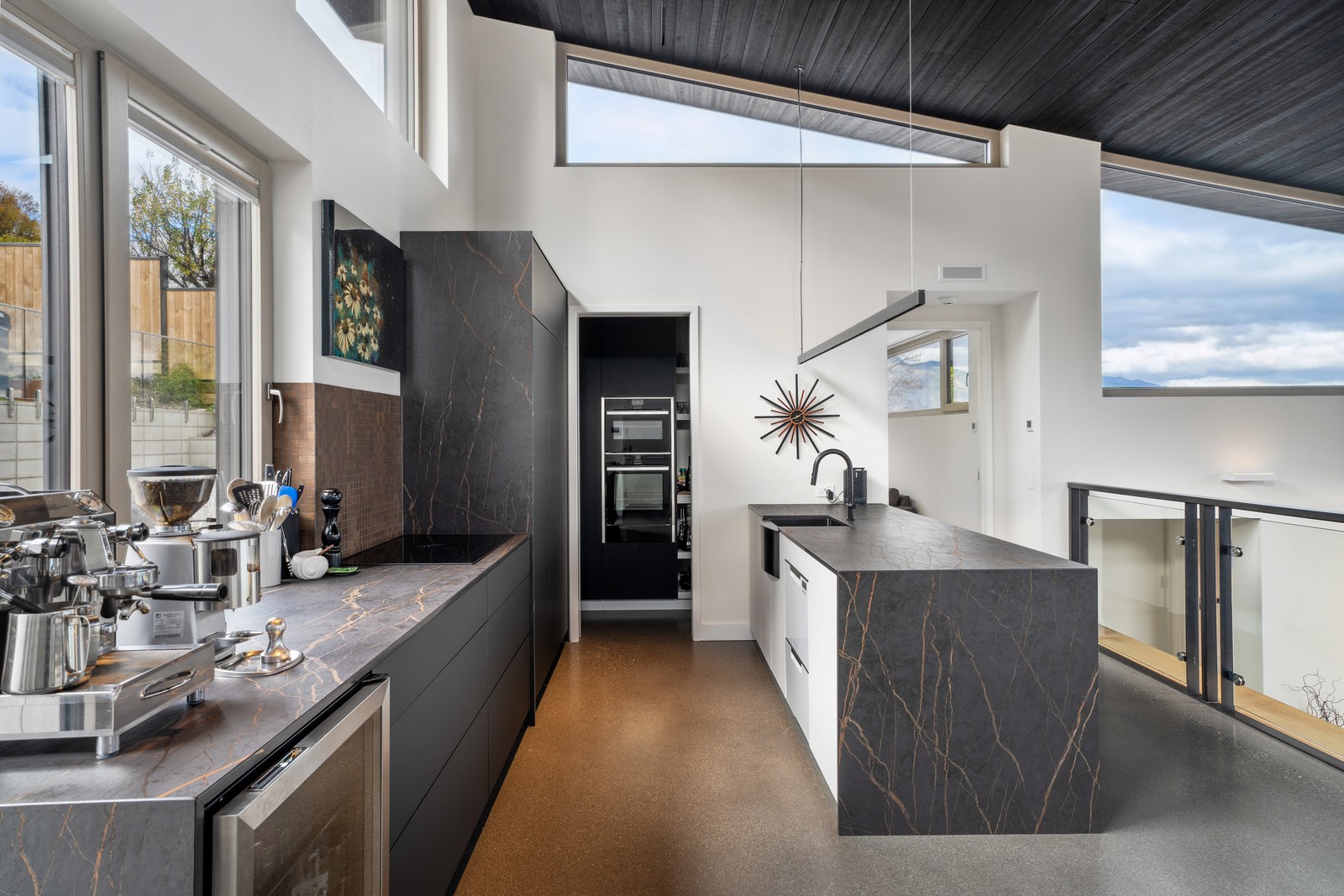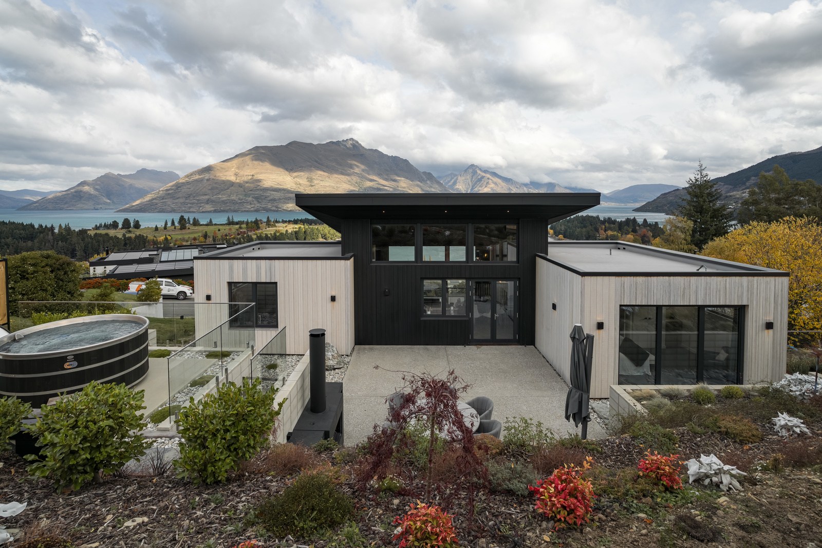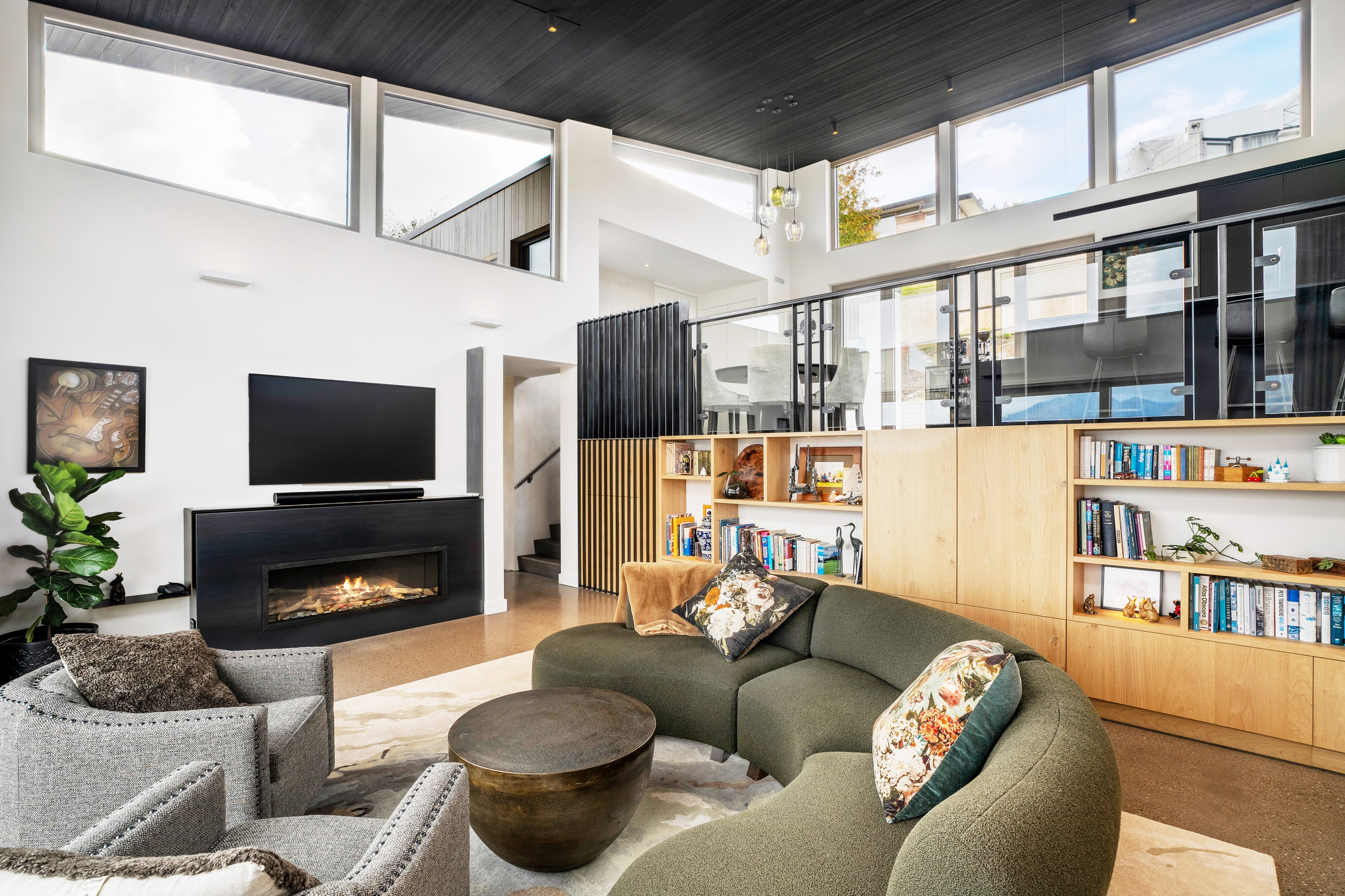 Views and performance were paramount to the success of this home, and it shows. The spectacular lake and alpine vistas have been expertly captured in this four-bedroom sanctuary. The 385sqm split-level house is pivoted on the site, and has subtle cantilevers and bespoke windows to maximise the 270-degree outlook. From the street, the house appears settled into its section, yet twists the architectural language of the neighbourhood. The black ceiling, which matches the sloping external soffit, draws the eye out to the views. The entry below leads to a foyer with a steel-battened screen beside the steel, oak and glass stairs, which open into a nearly six-metre high ceiling.