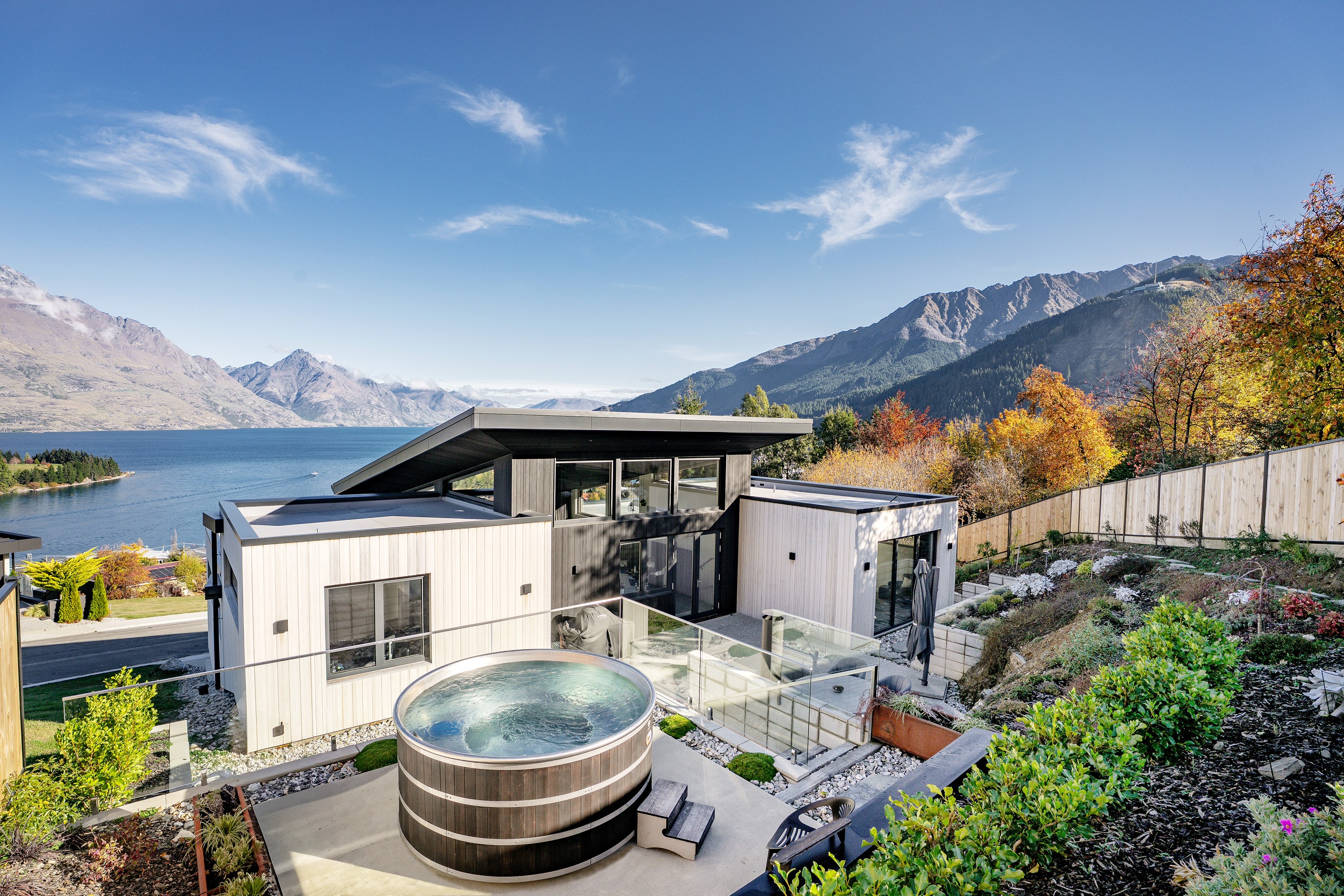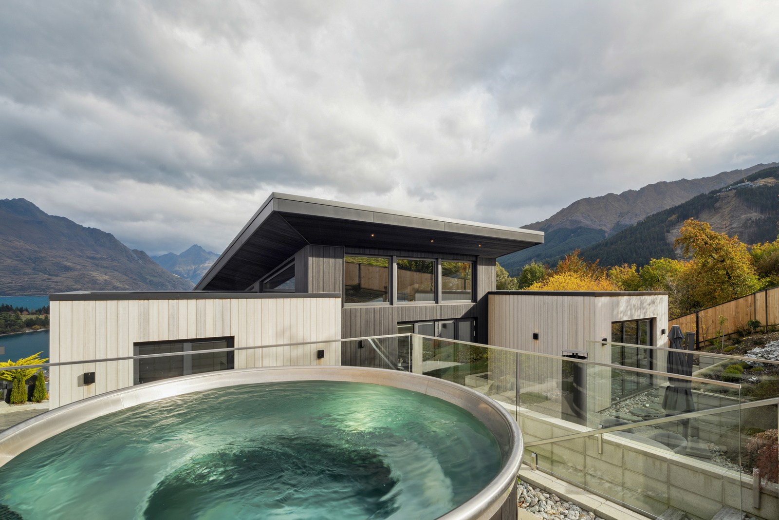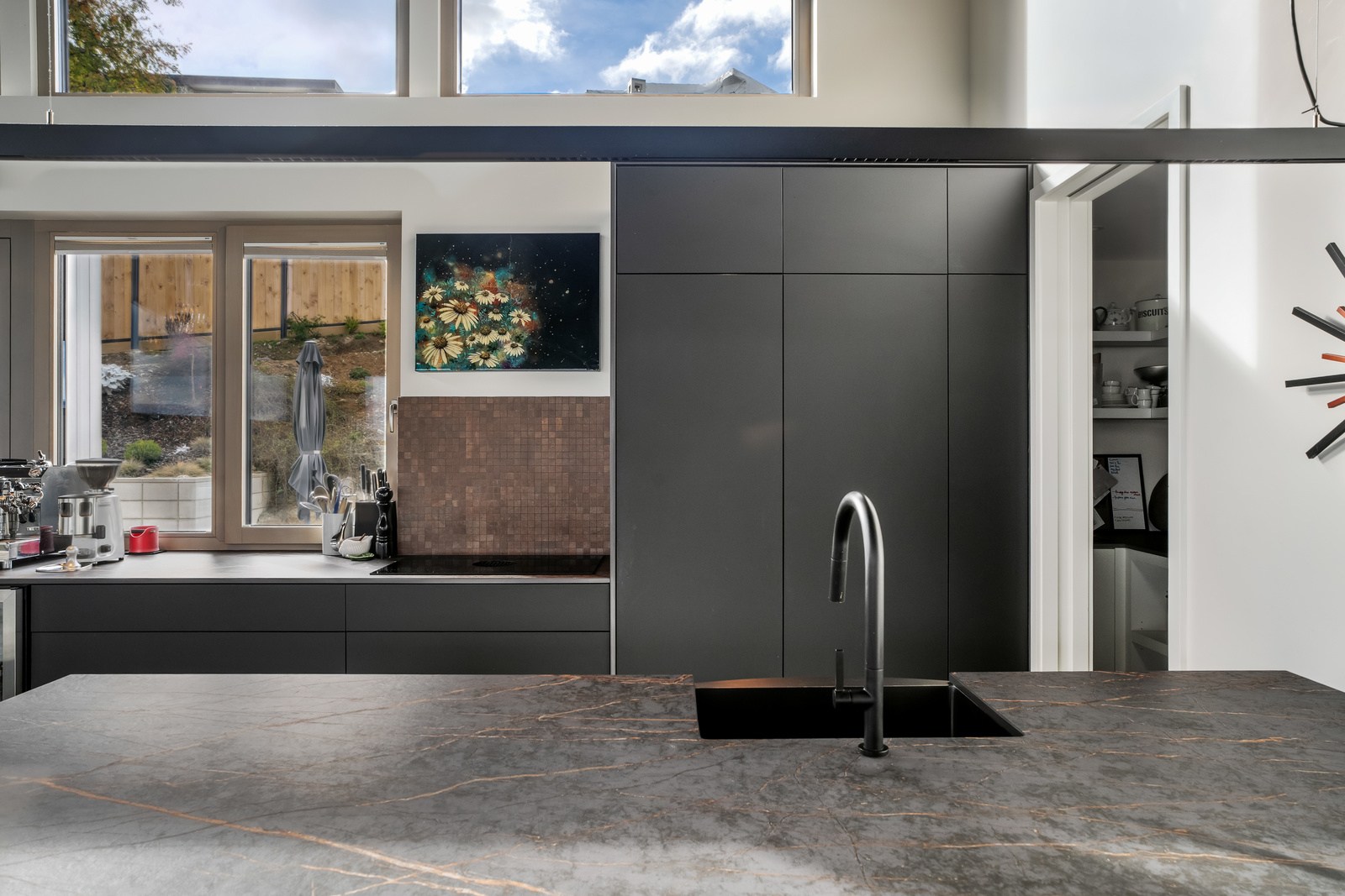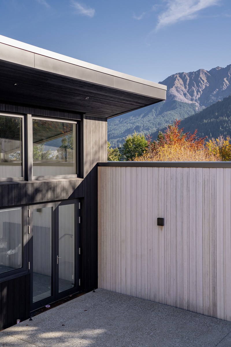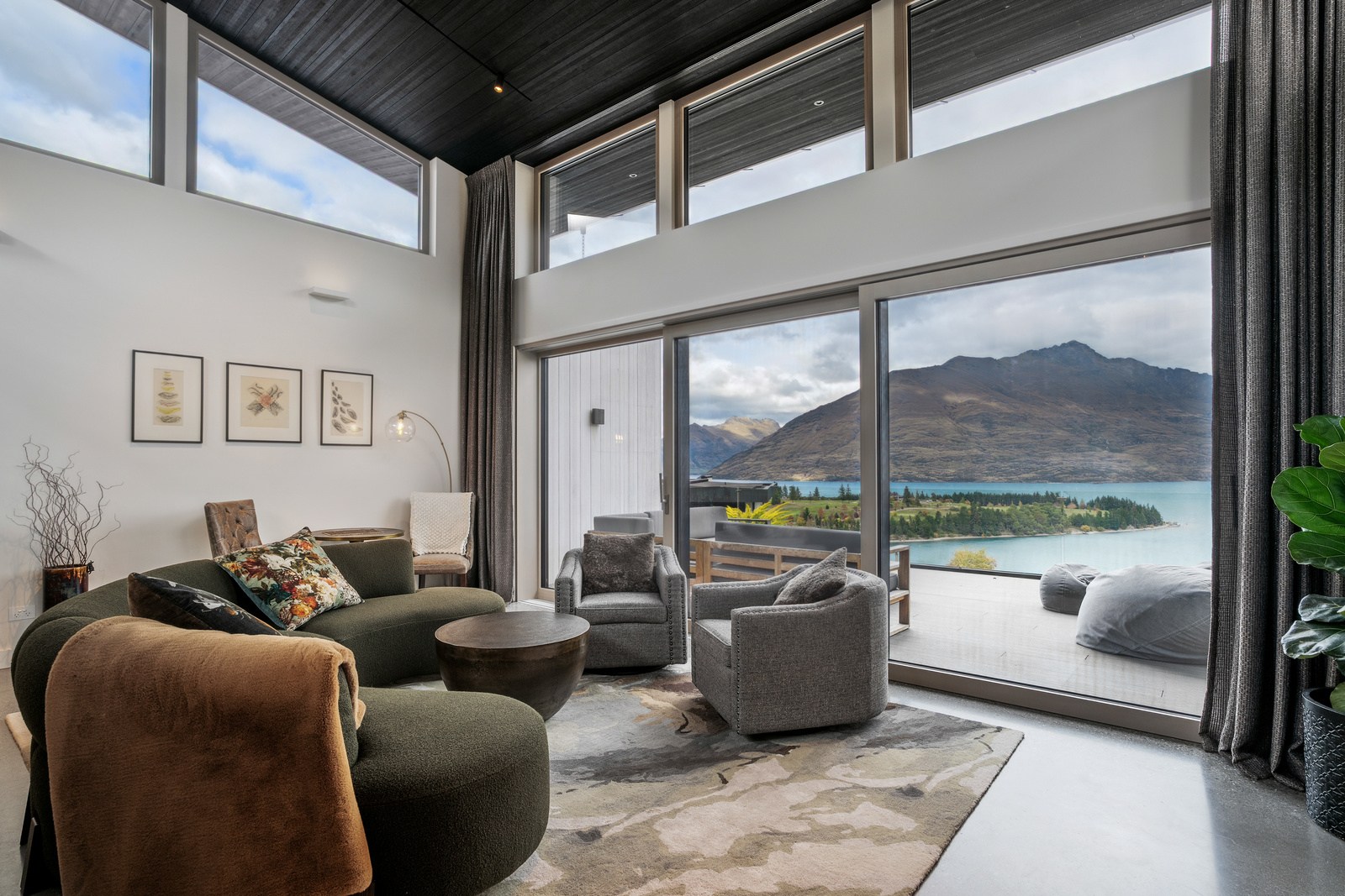 Views and performance were paramount to the success of this home, and it shows. The spectacular lake and alpine vistas have been expertly captured in this four-bedroom sanctuary. The 385sqm split-level house is pivoted on the site, and has subtle cantilevers and bespoke windows to maximise the 270-degree outlook. From the street, the house appears settled into its section, yet twists the architectural language of the neighbourhood. The black ceiling, which matches the sloping external soffit, draws the eye out to the views. The entry below leads to a foyer with a steel-battened screen beside the steel, oak and glass stairs, which open into a nearly six-metre high ceiling.