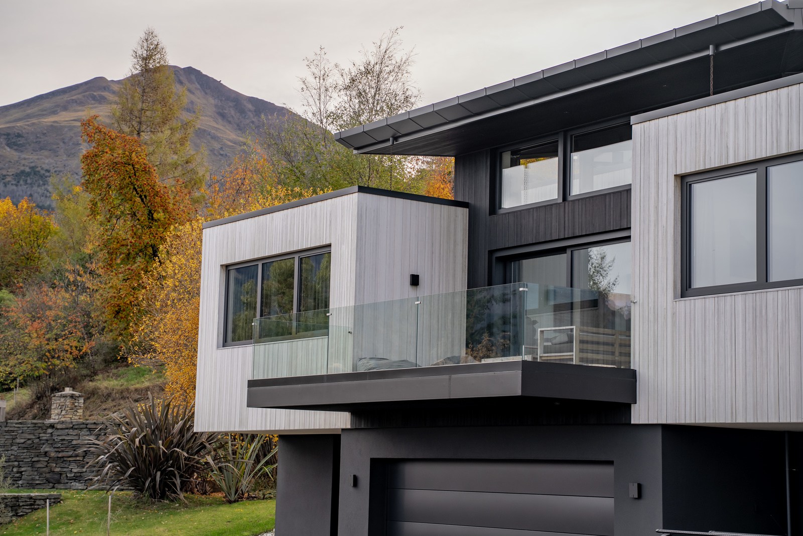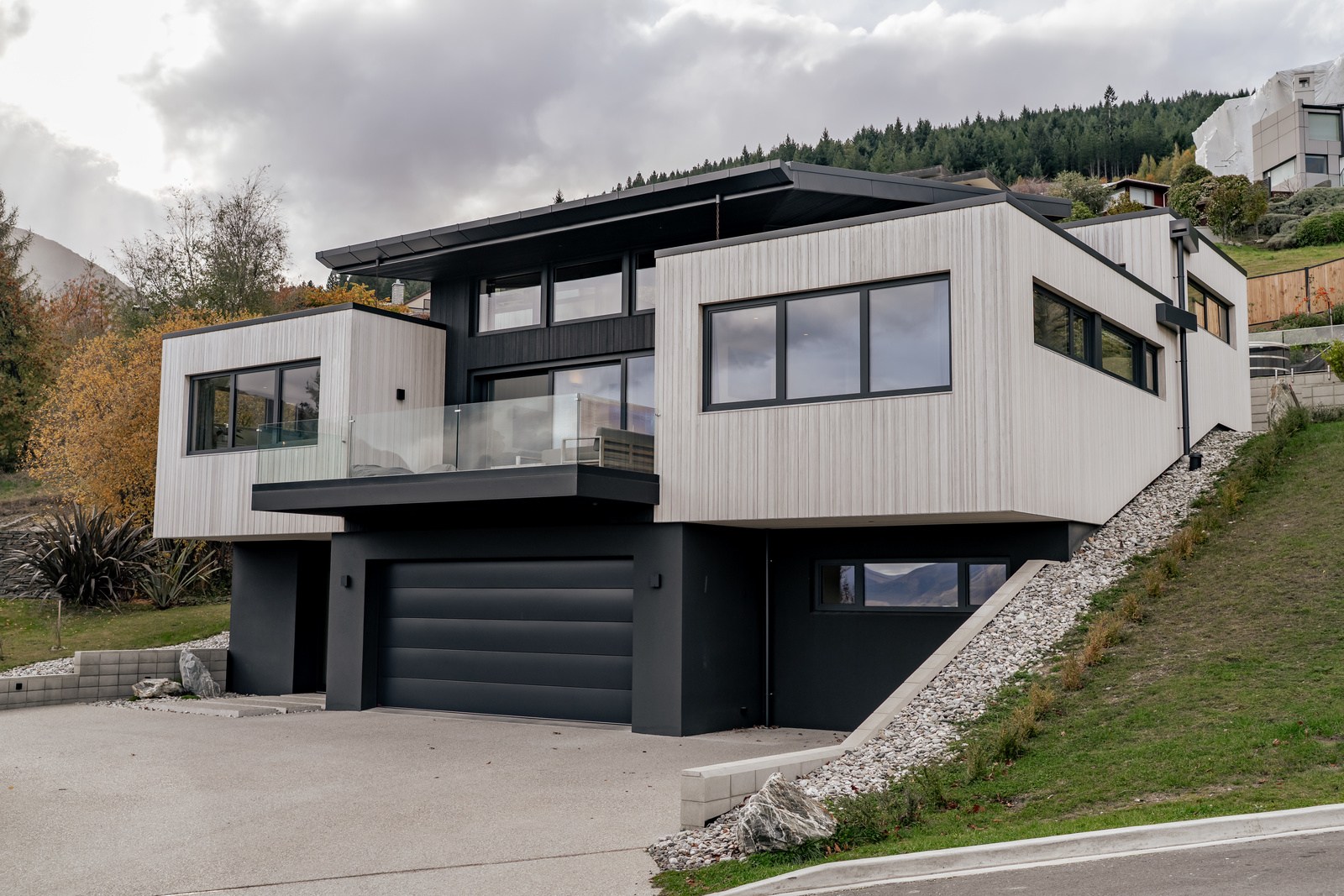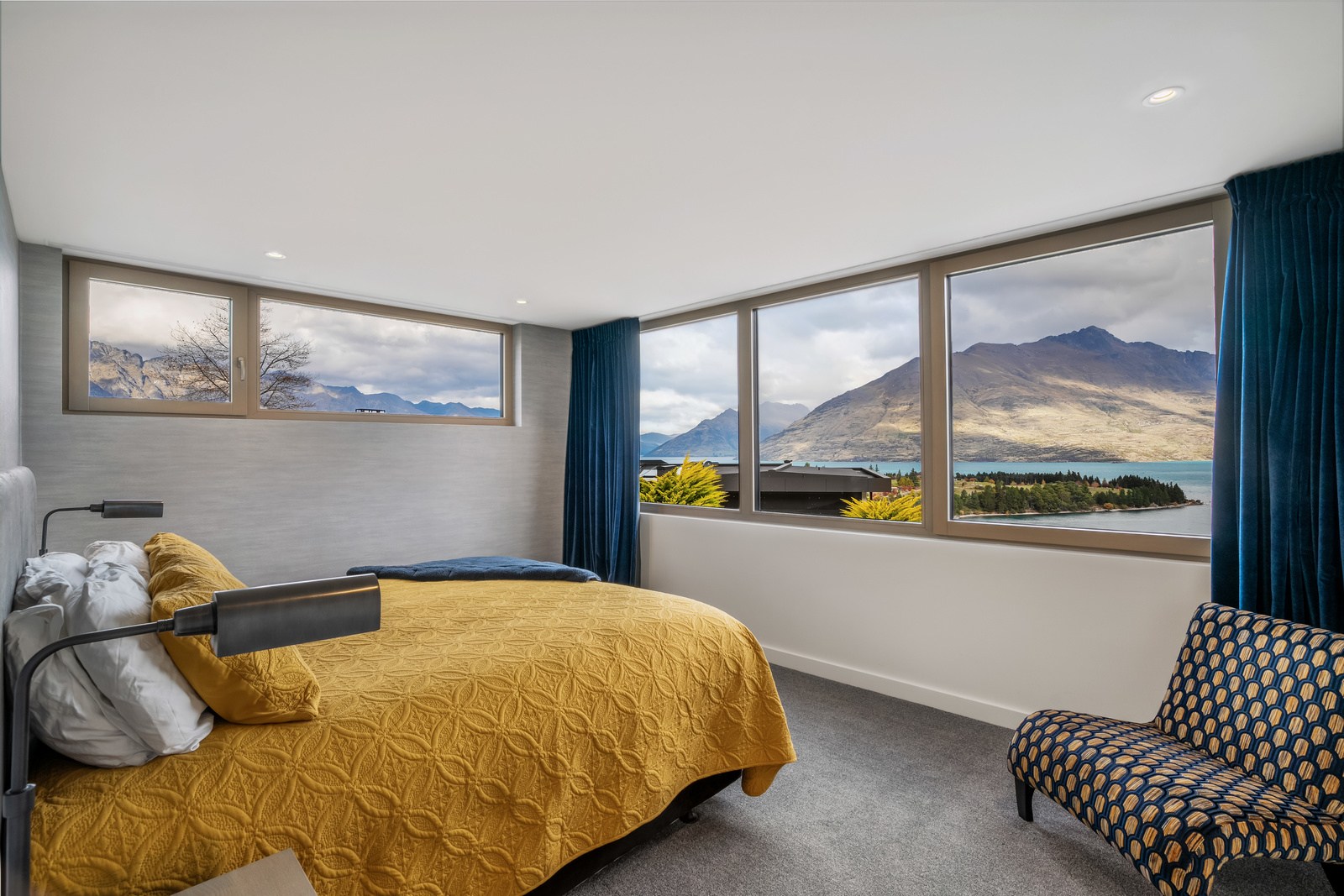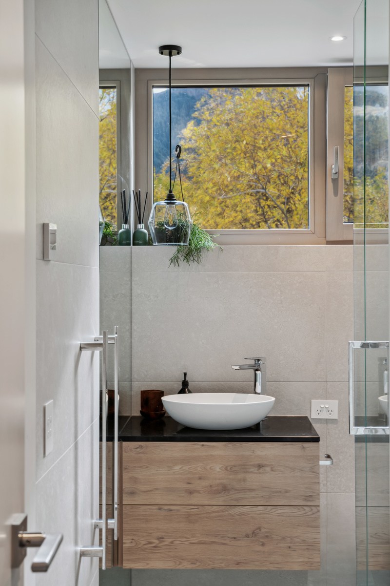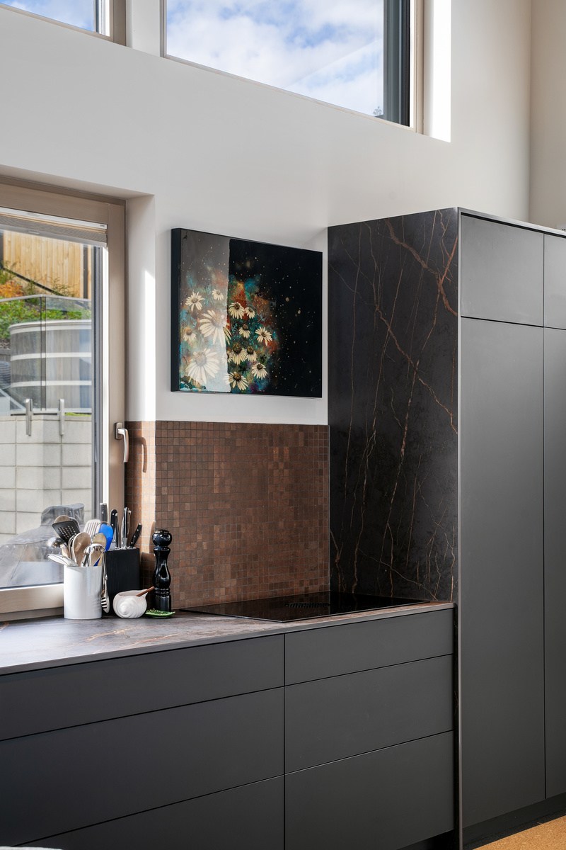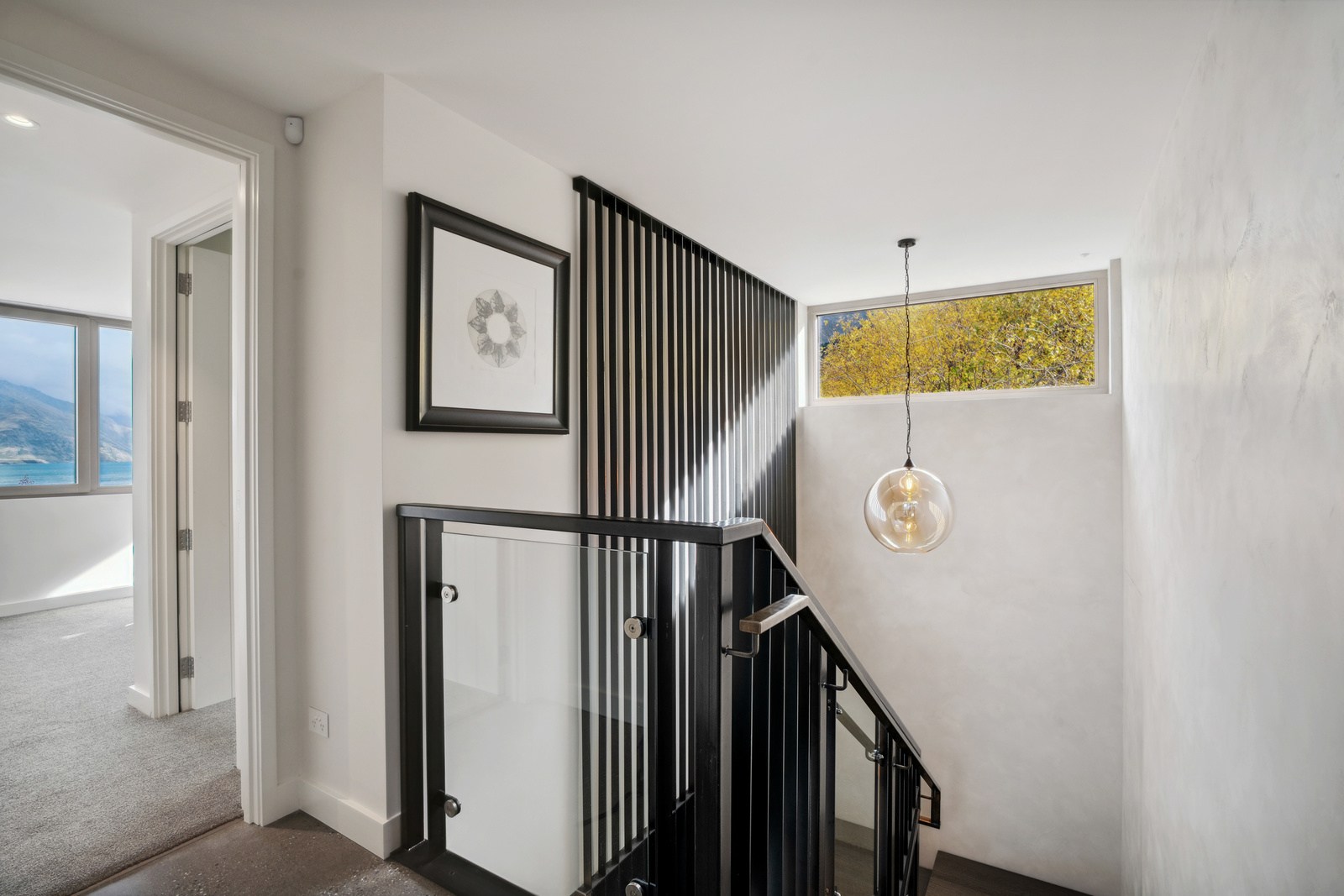Views and performance were paramount to the success of this home, and it shows. The spectacular lake and alpine vistas have been expertly captured in this four-bedroom sanctuary. The 385sqm split-level house is pivoted on the site, and has subtle cantilevers and bespoke windows to maximise the 270-degree outlook. From the street, the house appears settled into its section, yet twists the architectural language of the neighbourhood. The black ceiling, which matches the sloping external soffit, draws the eye out to the views. The entry below leads to a foyer with a steel-battened screen beside the steel, oak and glass stairs, which open into a nearly six-metre high ceiling.