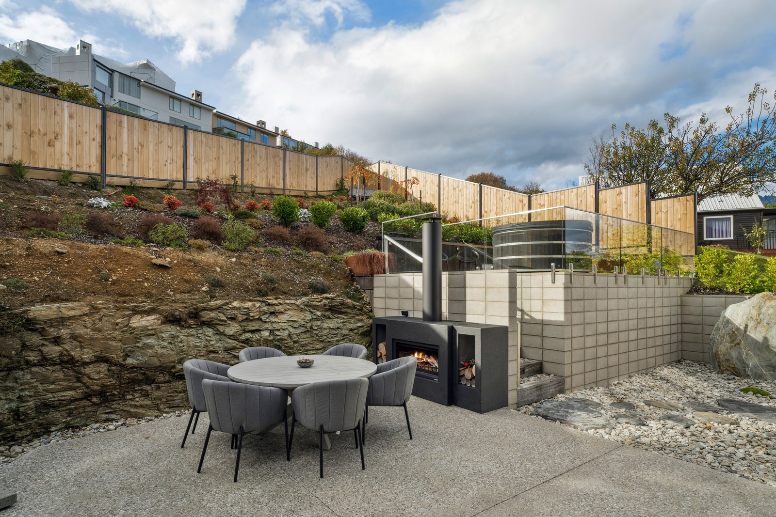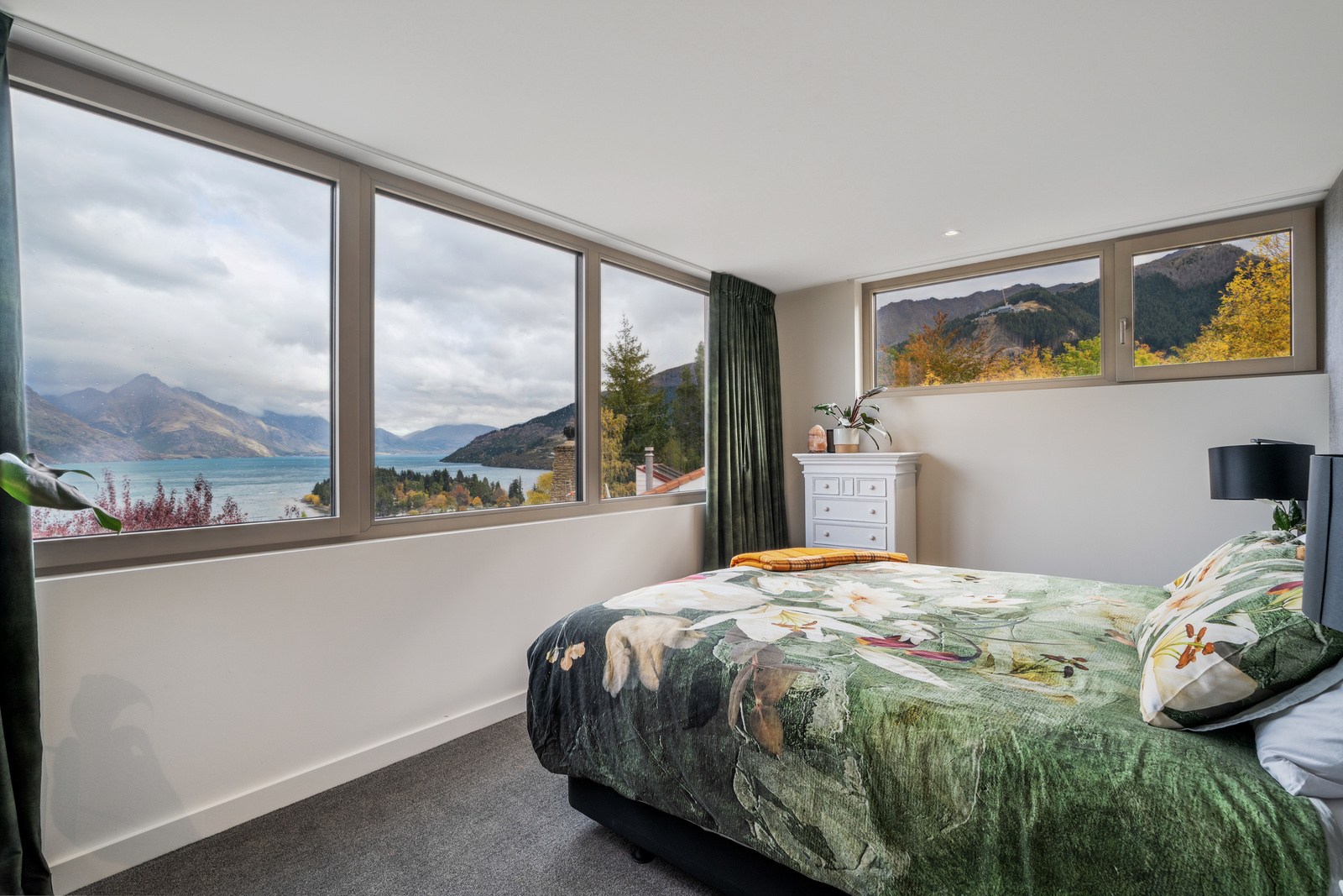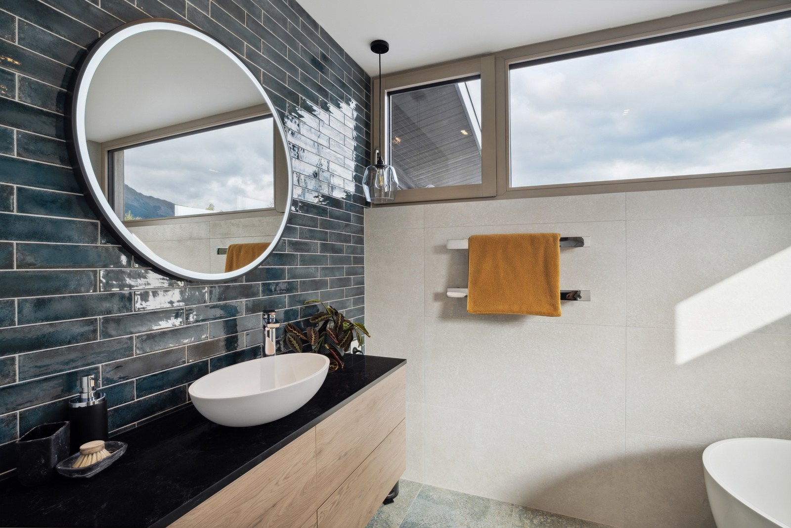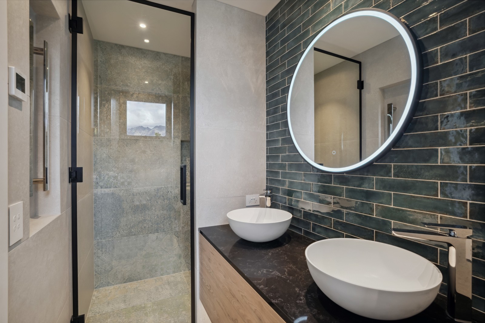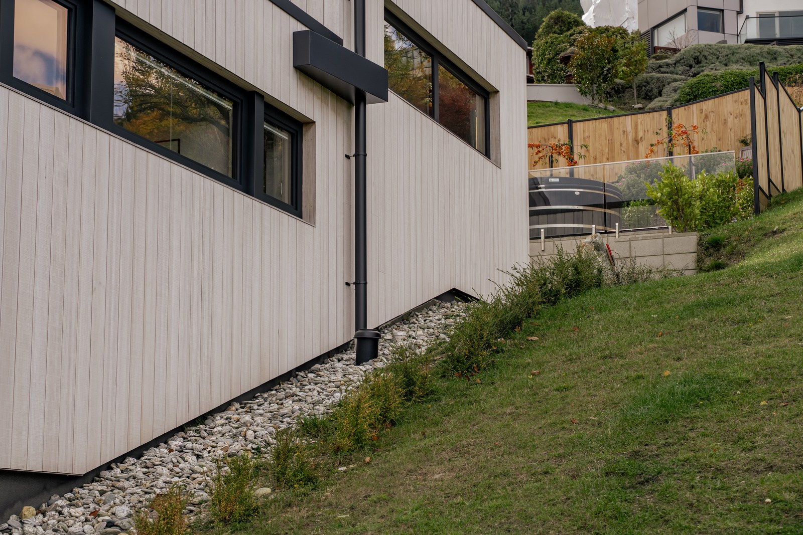 Views and performance were paramount to the success of this home, and it shows. The spectacular lake and alpine vistas have been expertly captured in this four-bedroom sanctuary. The 385sqm split-level house is pivoted on the site, and has subtle cantilevers and bespoke windows to maximise the 270-degree outlook. From the street, the house appears settled into its section, yet twists the architectural language of the neighbourhood. The black ceiling, which matches the sloping external soffit, draws the eye out to the views. The entry below leads to a foyer with a steel-battened screen beside the steel, oak and glass stairs, which open into a nearly six-metre high ceiling.