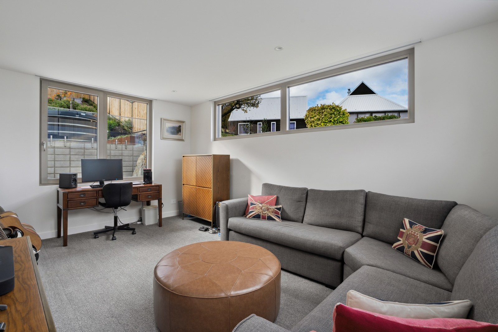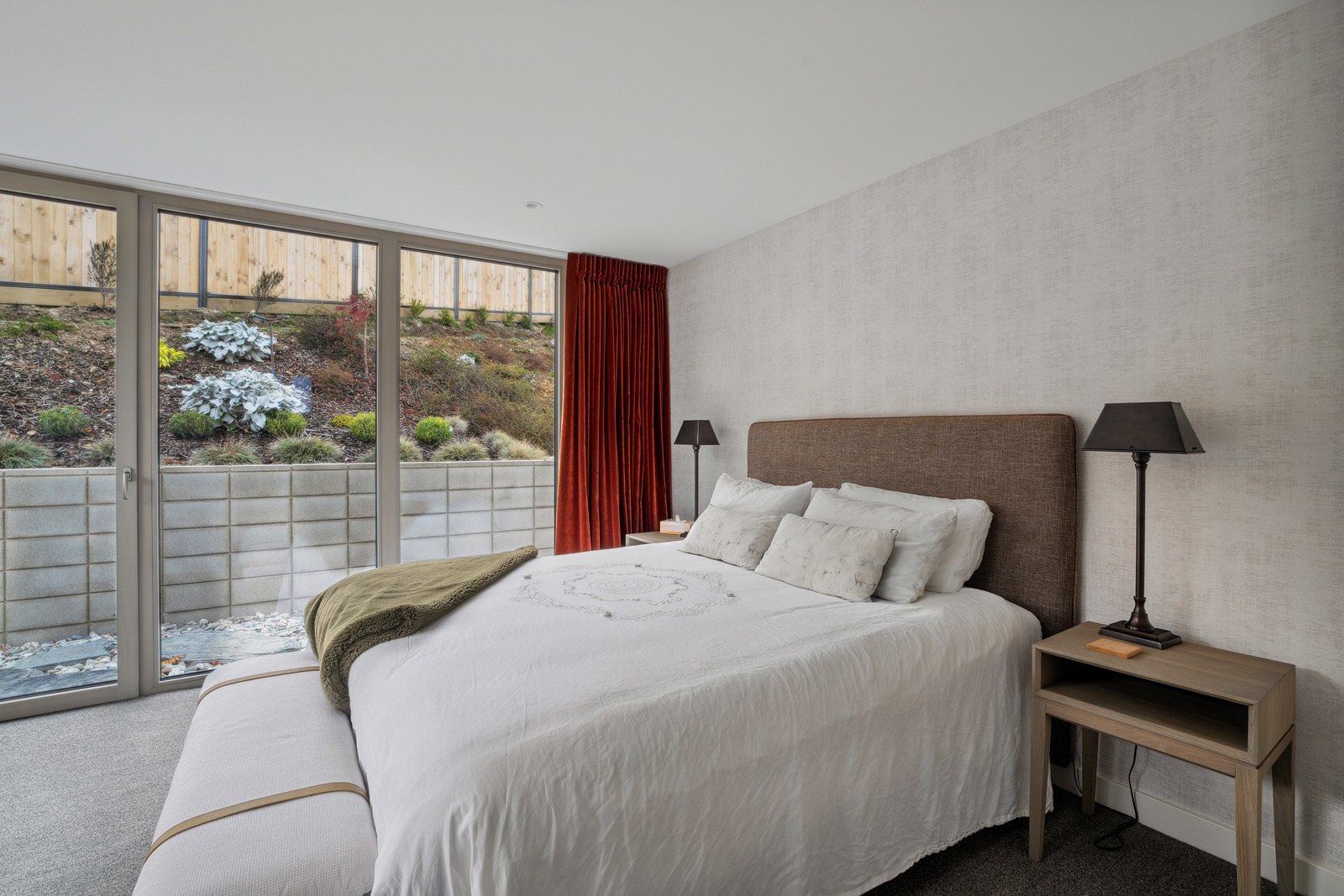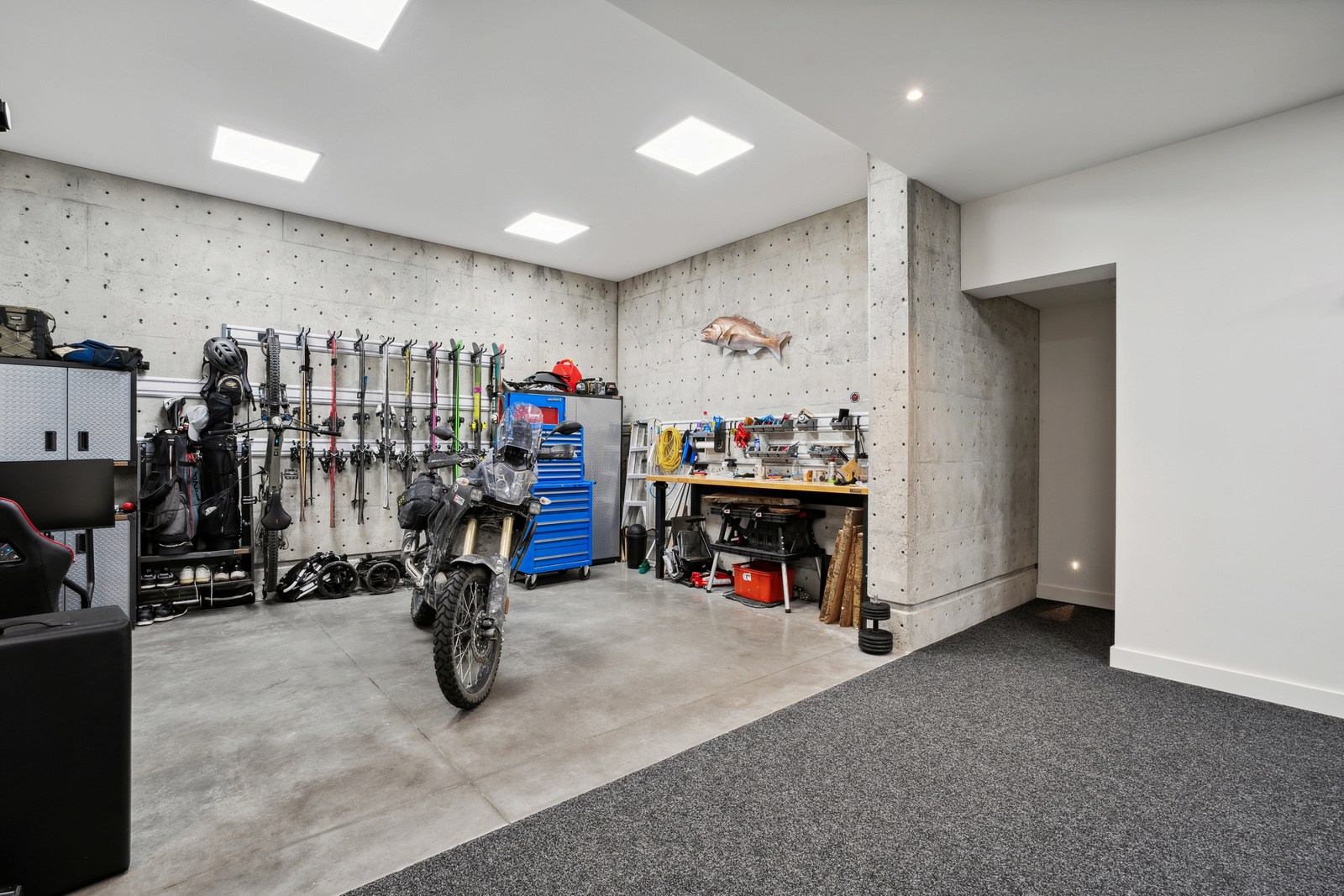 You’ll also find a double garage, a concrete-walled workshop and sound-proofed rumpus room/ fourth bedroom on this level. At the mid-floor stair landing is the laundry, concealed behind a Venetian plaster door. Continue up and you’re in the split-level space named the ‘Great Room’. As a result of the high ceiling, the room is filled with light and invites enjoyment of the view from almost every window and a lakeside balcony. A recessed north deck provides privacy and afternoon shelter. The home is quiet thanks to more than double code insulation, an airtight layer, triple-glazed windows and extensive sound insulation, along with 13mm plasterboard walls. Considered design and craftsmanship adds up to this enviable home.