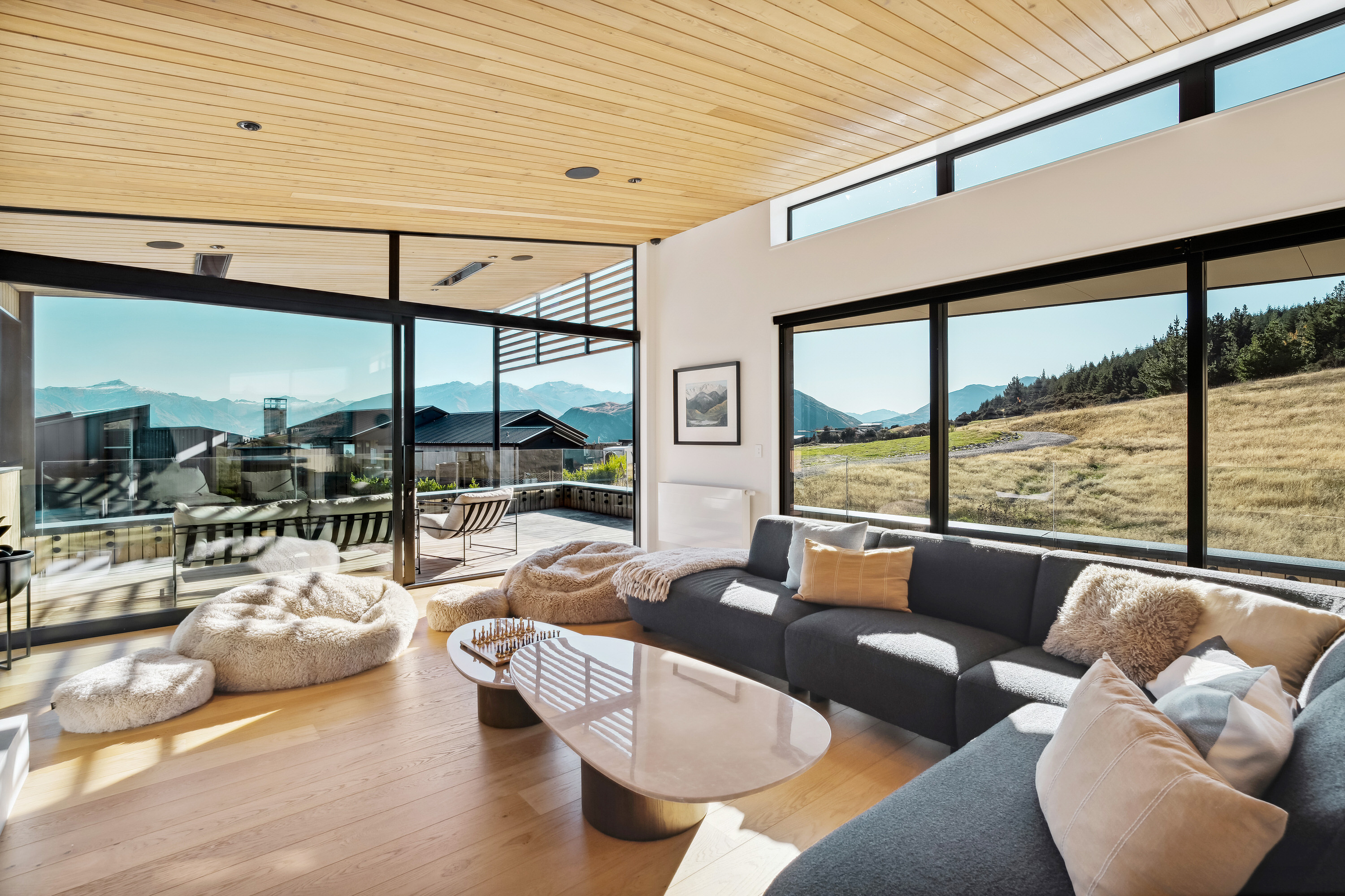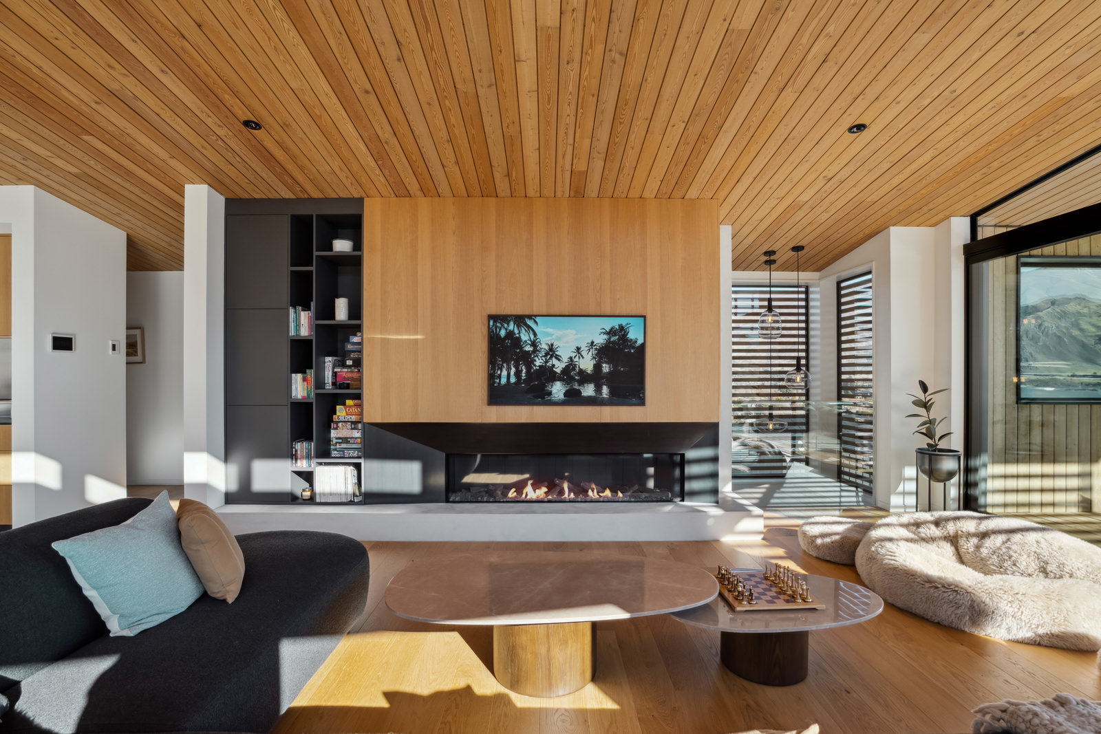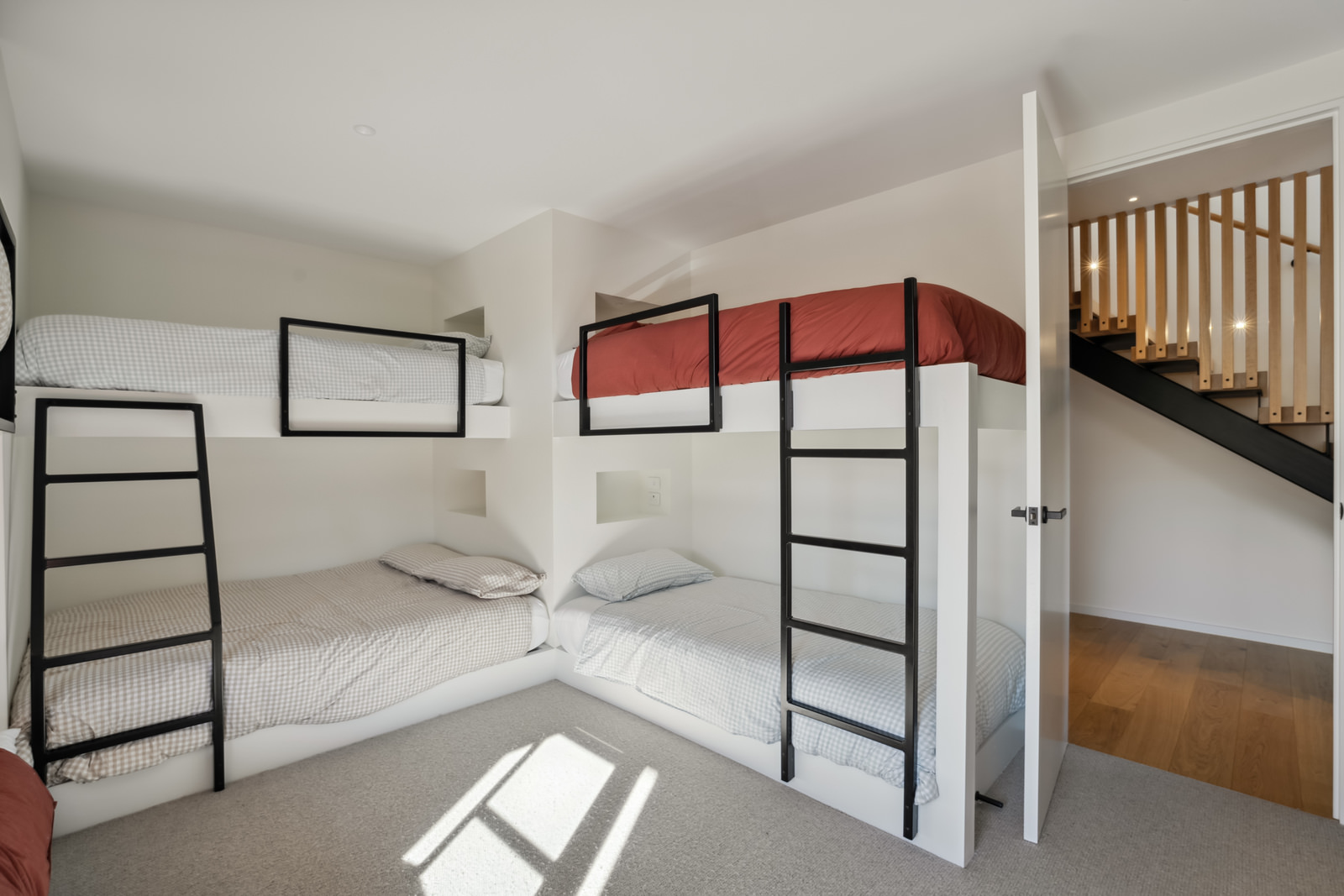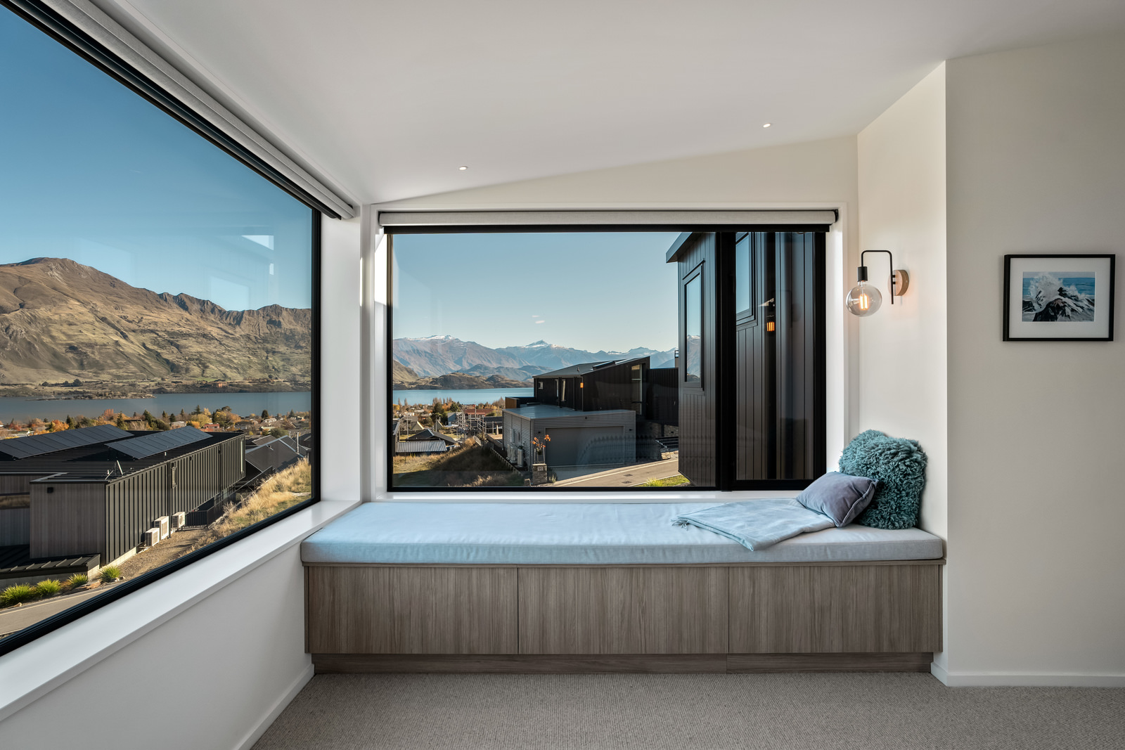 There are quiet corners too, perfect for reading, relaxing or simply soaking up the view. Timber-lined walls and ceilings give the interior a natural, cabin-like feel, softening the striking angles and lending a grounded, enduring quality. Carefully placed glazing ensures every room captures spectacular views over Wānaka and the surrounding landscape. Purpose-built for family holidays, the home features a bunk room, window seats and informal lounge zones. Underfloor heating and heat-pump radiators keep things cosy in winter, while smart automation allows the owners to manage heating and security remotely. Designed for ease of use but rich in detail, this is a retreat made for gathering and creating lasting memories.