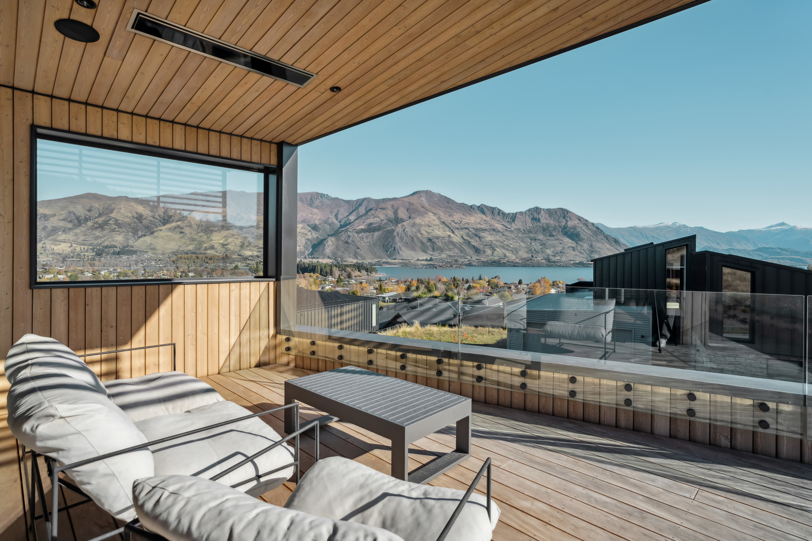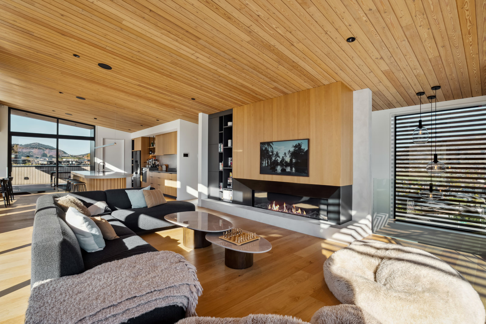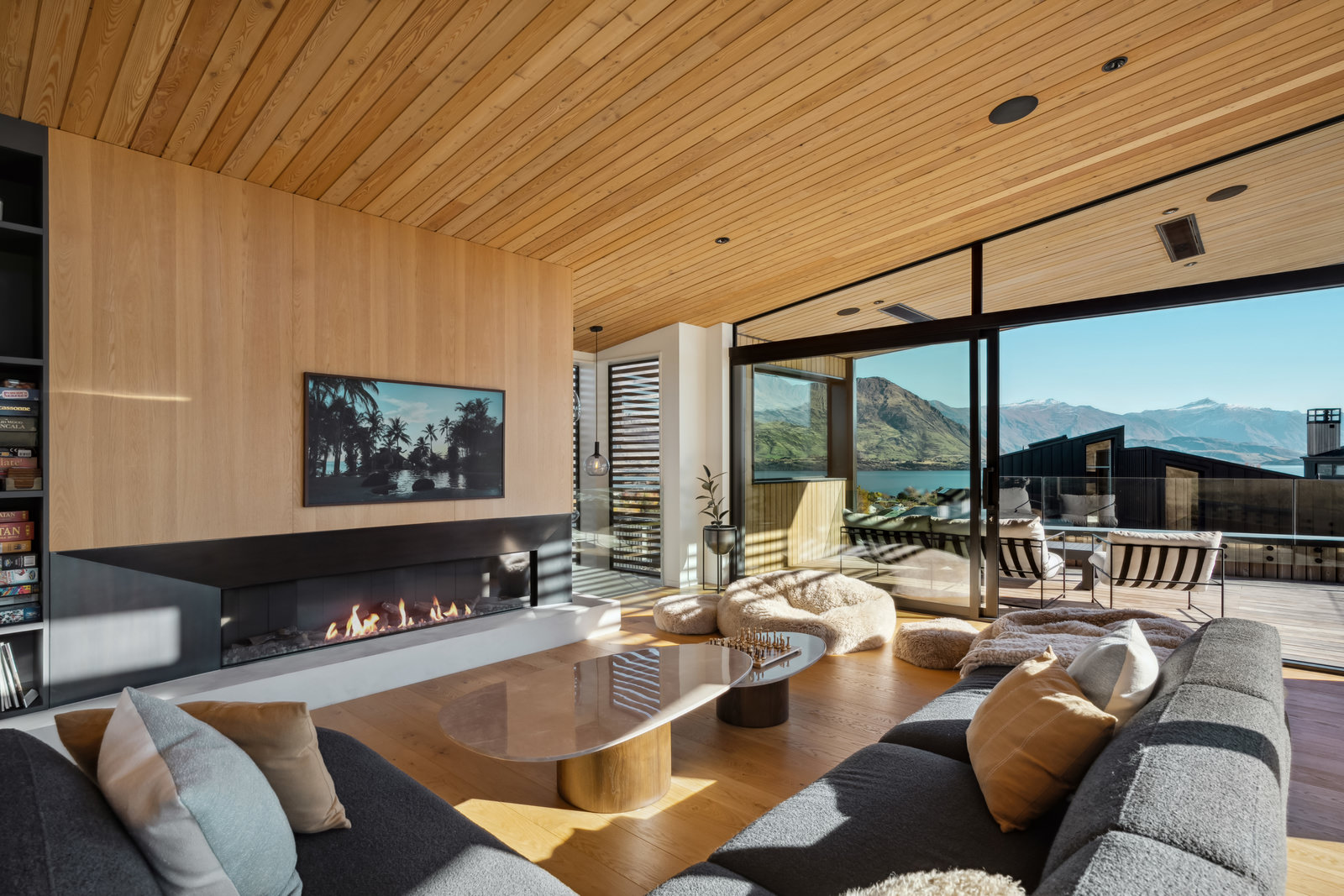 There are quiet corners too, perfect for reading, relaxing or simply soaking up the view. Timber-lined walls and ceilings give the interior a natural, cabin-like feel, softening the striking angles and lending a grounded, enduring quality. Carefully placed glazing ensures every room captures spectacular views over Wānaka and the surrounding landscape. Purpose-built for family holidays, the home features a bunk room, window seats and informal lounge zones. Underfloor heating and heat-pump radiators keep things cosy in winter, while smart automation allows the owners to manage heating and security remotely. Designed for ease of use but rich in detail, this is a retreat made for gathering and creating lasting memories.
