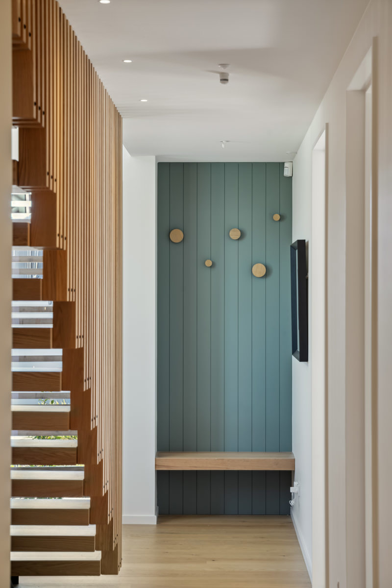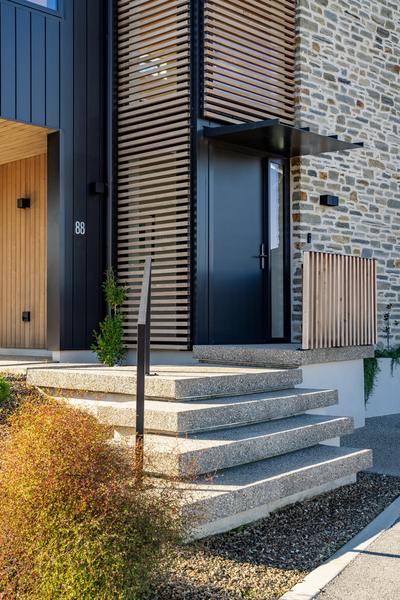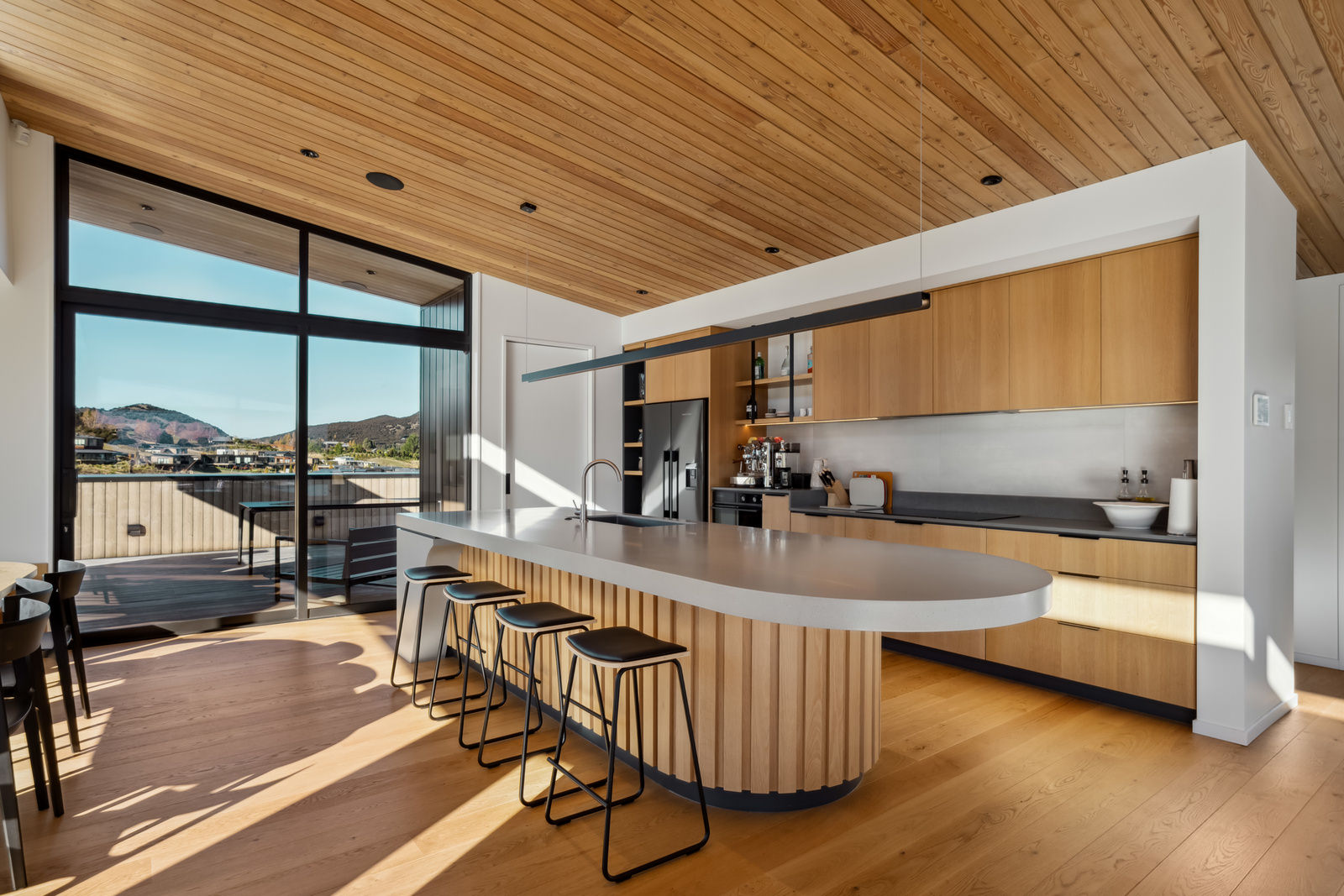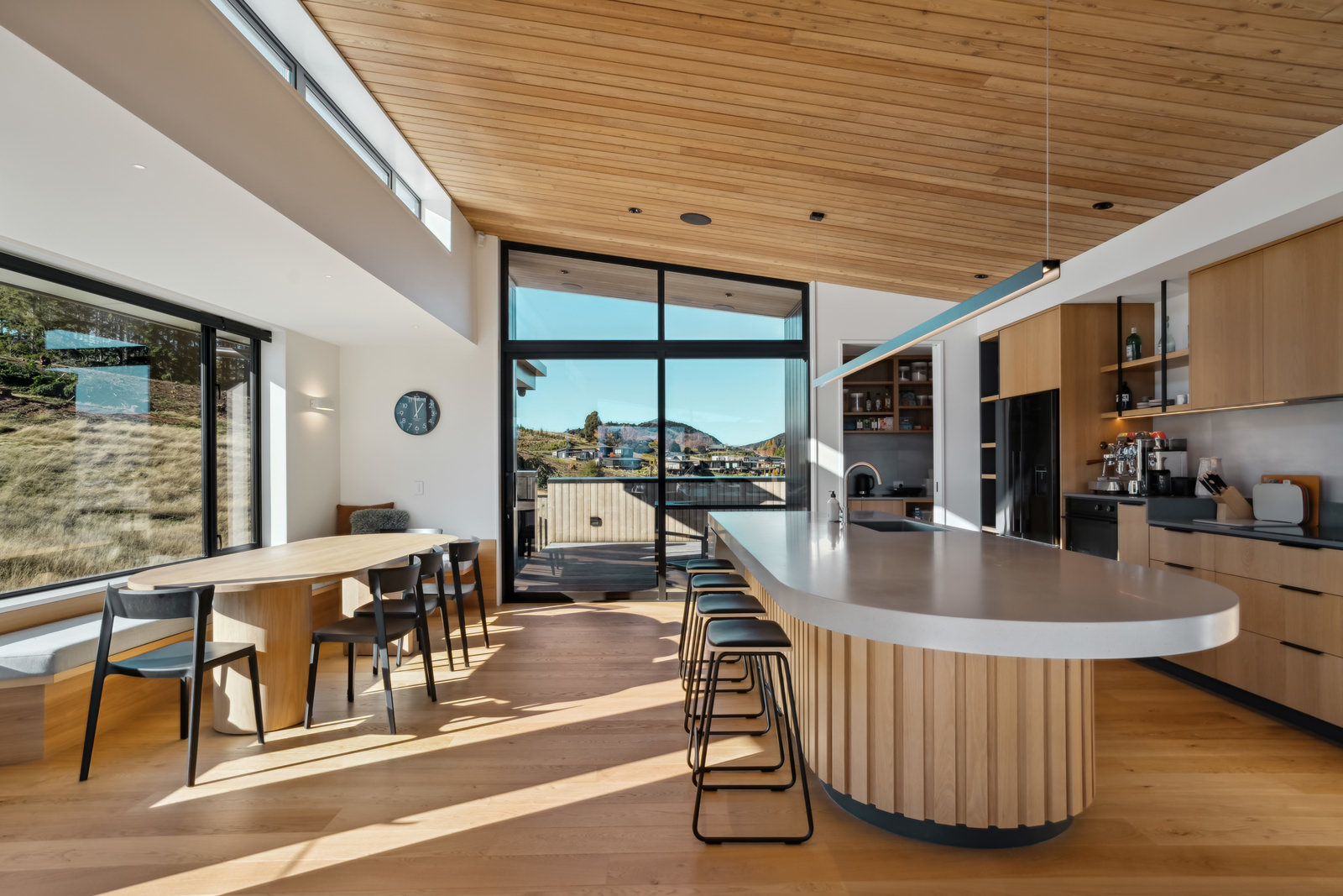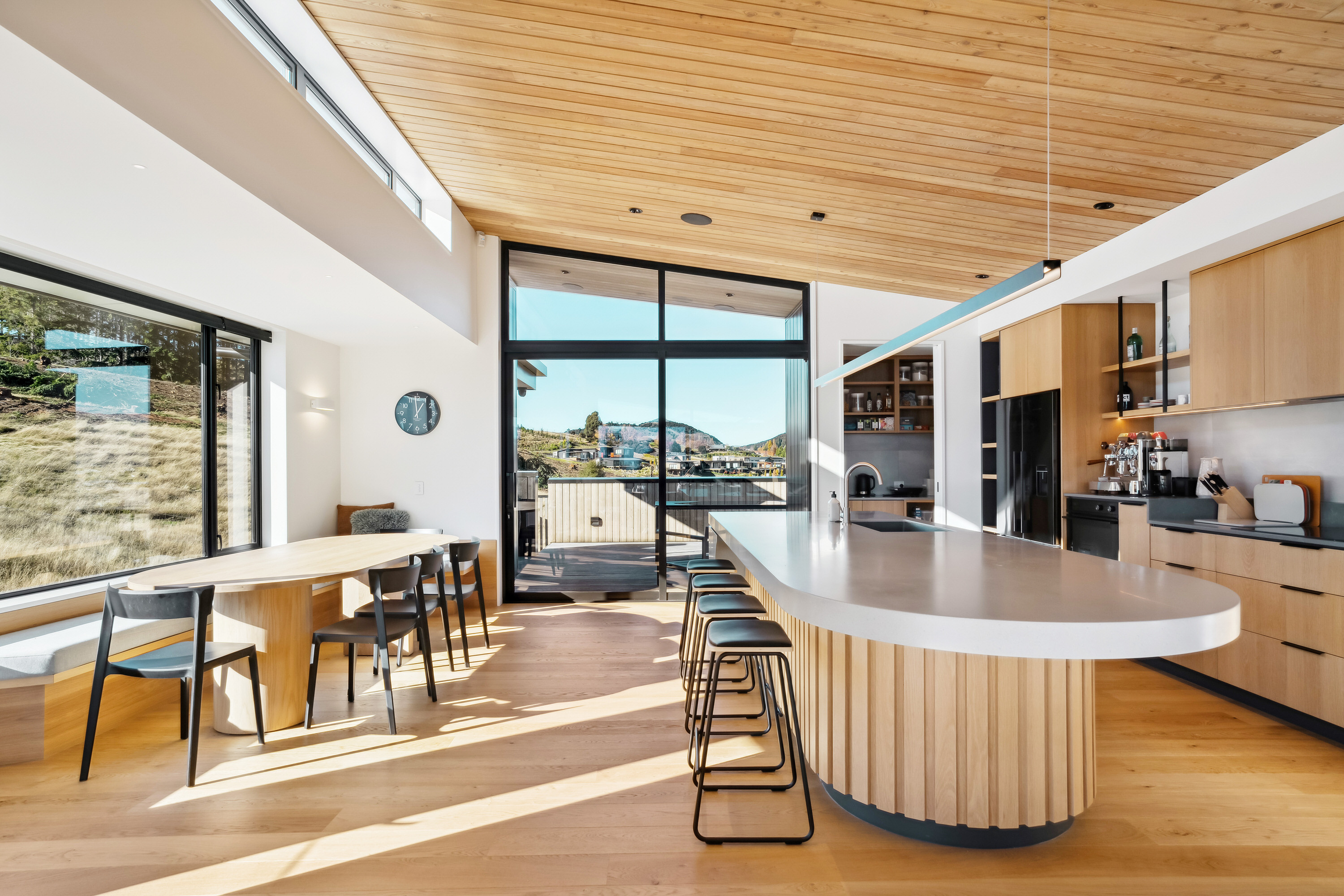 Angles, overhangs and unexpected moments define this two-storey holiday home designed as a year-round escape for an extended family. Clad in warm-toned larch, both inside and out, alongside schist features, the 214sqm house blends effortlessly into its alpine environment, while making a confident architectural statement. From the street, the home’s bold geometry sets the tone — its shifting forms and deep reveals offer shelter, privacy and visual rhythm. Step inside and the layout unfolds in a series of inviting spaces: three generously sized bedrooms, three bathrooms and a flowing open-plan living area that encourages connection and easy entertaining.