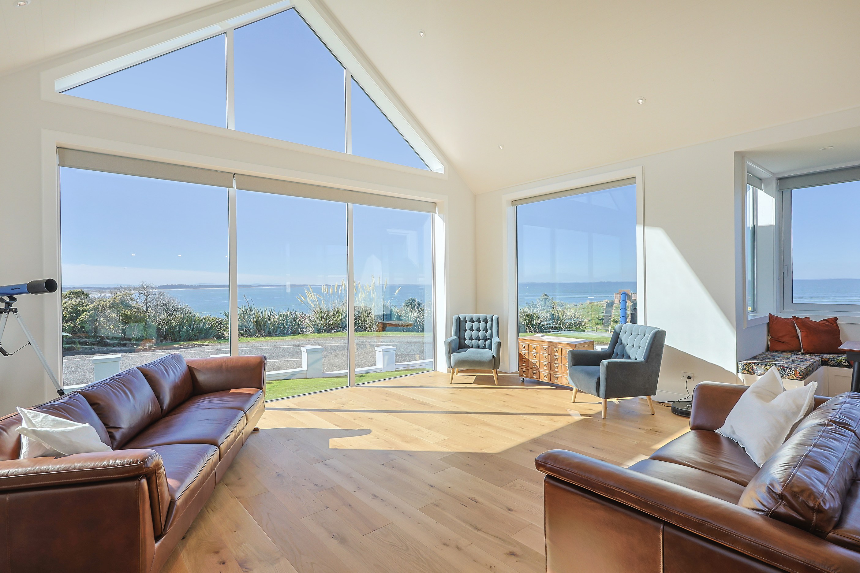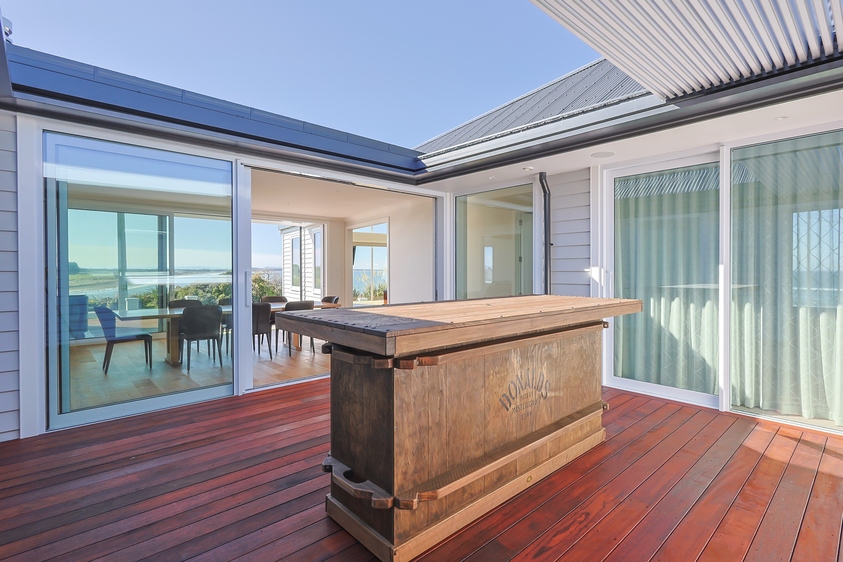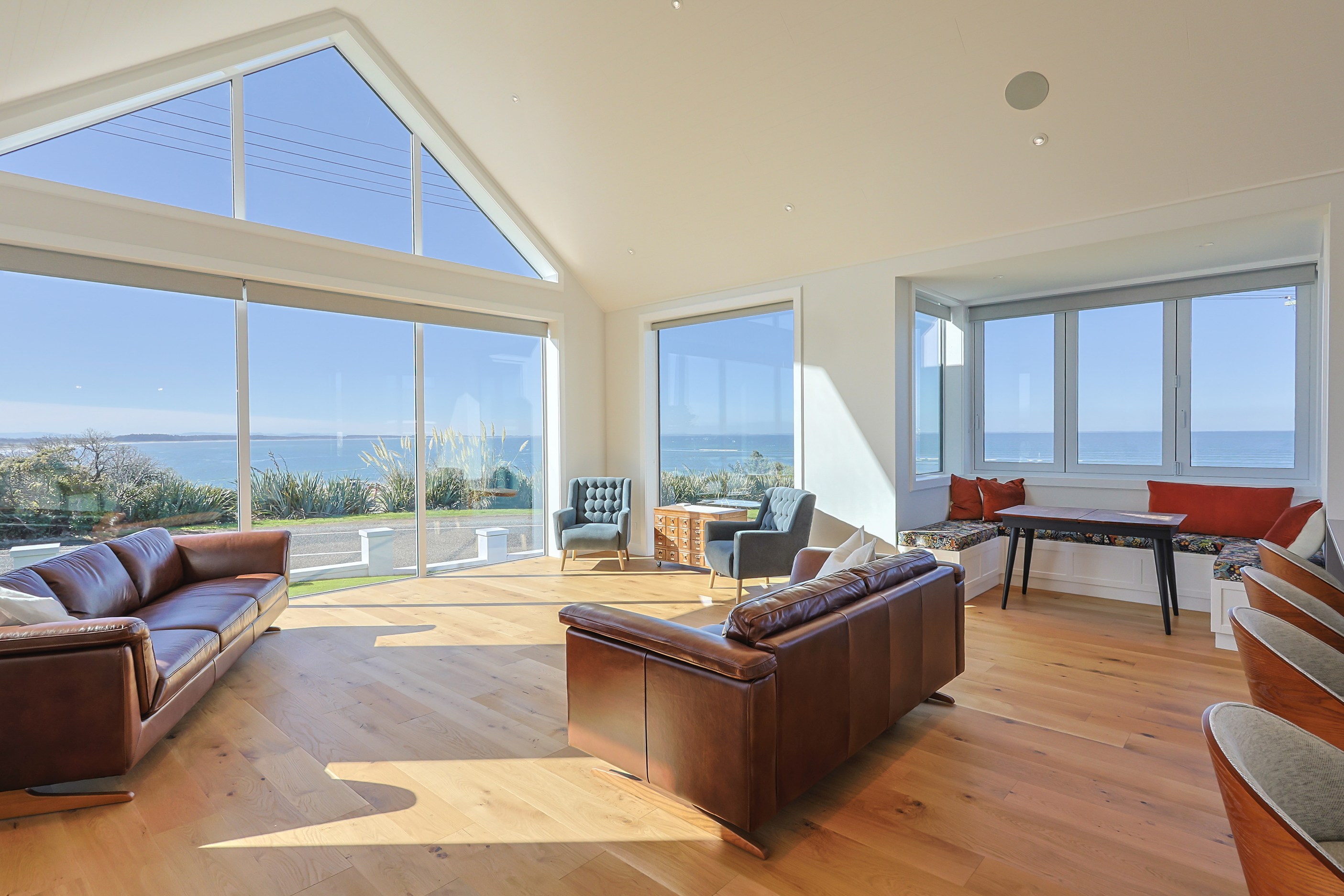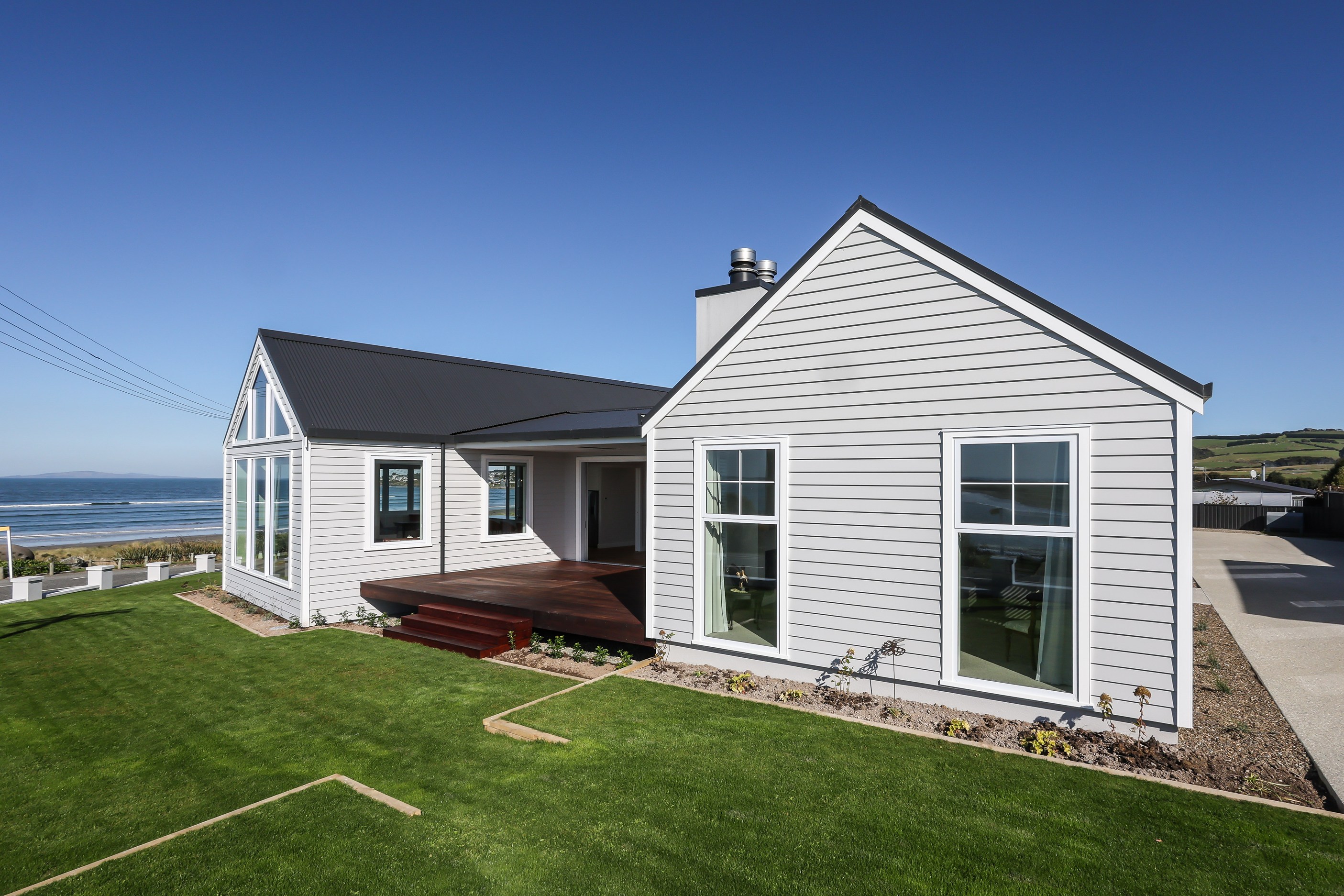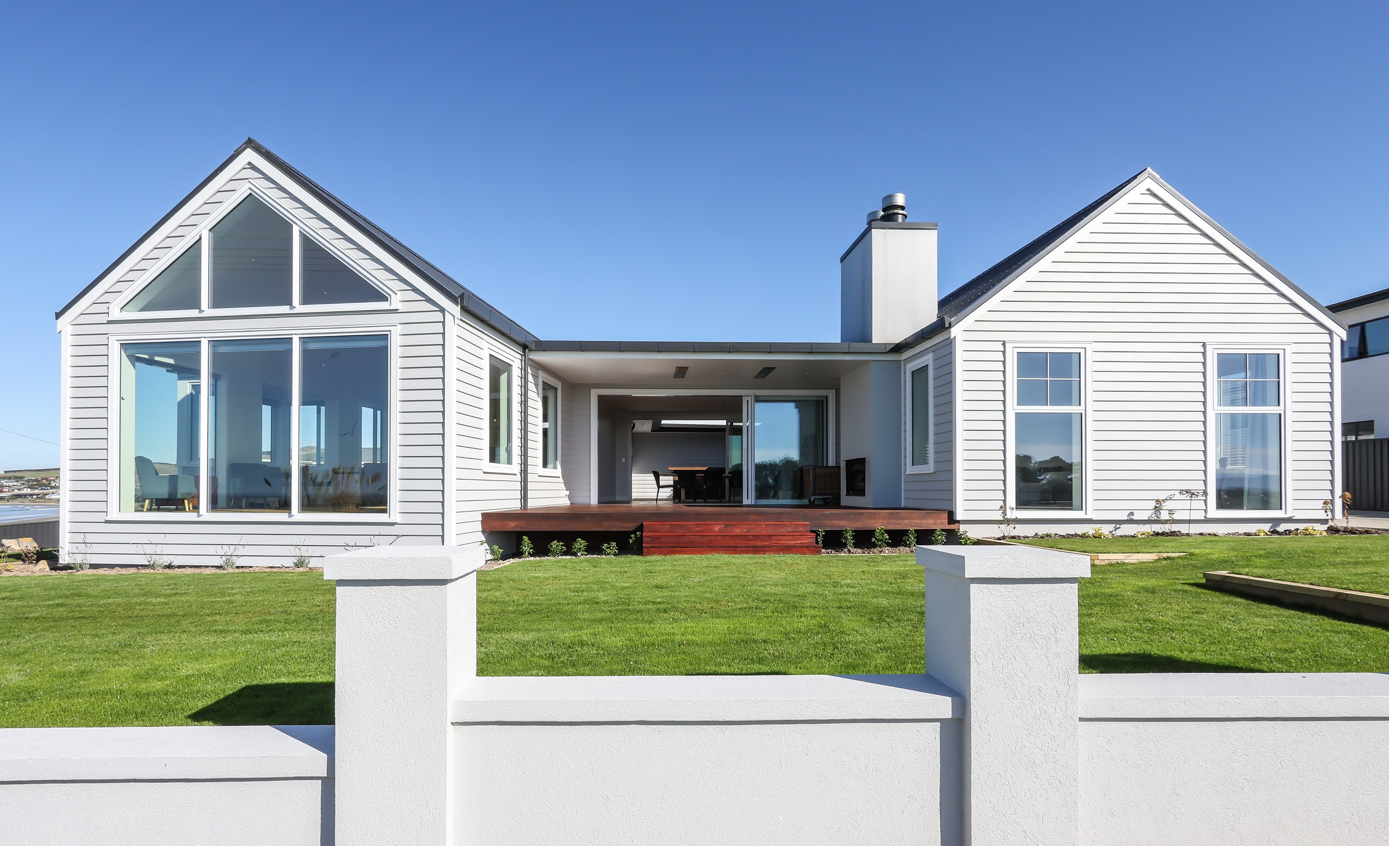 How do you do justice to a wedge-shaped site with 180-degree sea views? Exactly what the owners of this house did — with the help of trusted local builders. This 366sqm weatherboard home comprises two linked pavilions that open fan-like to views of Taramea Bay and the Aparima Estuary. Thoughtful, clever architecture, including use of coast-hardy materials, provides beautiful outdoor places in which to drink in the views. Out front a sheltered deck with an outdoor fire invites year-round relaxation, but there are plenty of other tucked-away nooks. One is a spa deck out the back; another is a central courtyard with louvre roof – an oasis at the heart of the home.